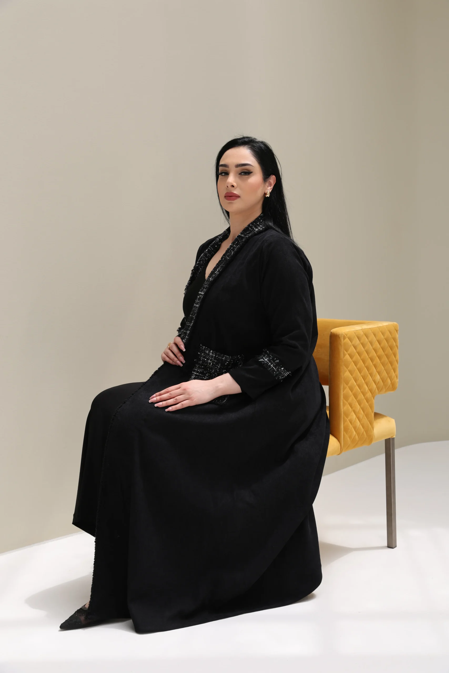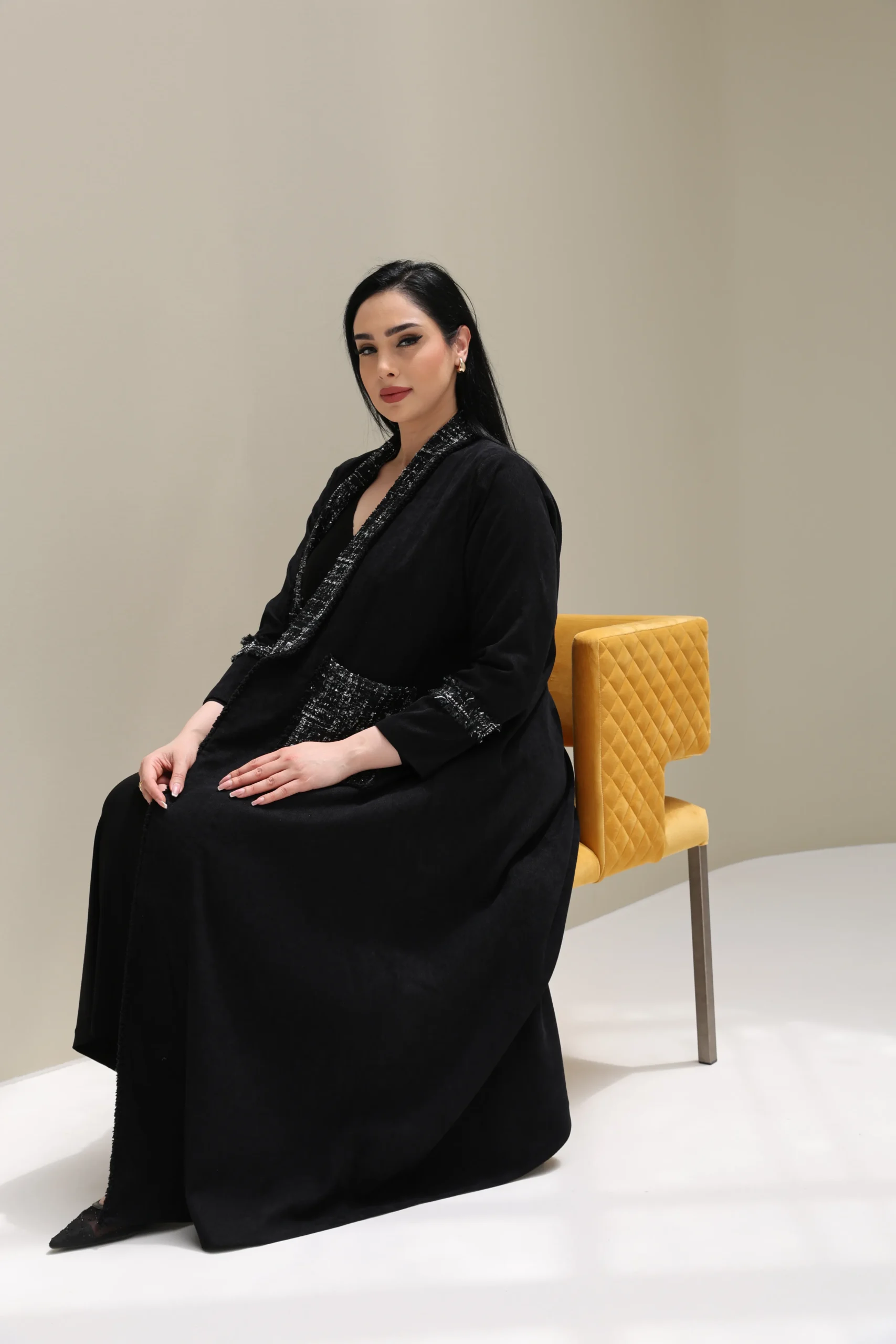 Redefining classic elegance, our Black Abaya with Tweed Detailing – Luxe Edition pairs timeless modesty with sophisticated texture. Crafted from premium matte crepe, this abaya features a relaxed, flowing silhouette that drapes effortlessly while maintaining structure.
