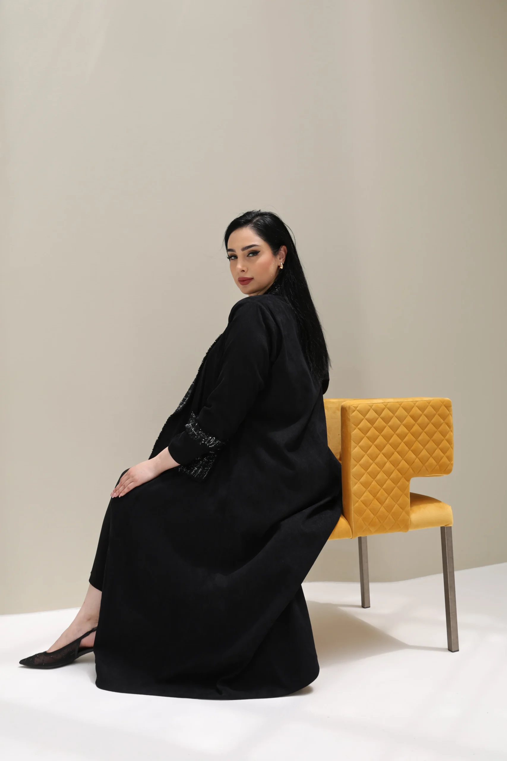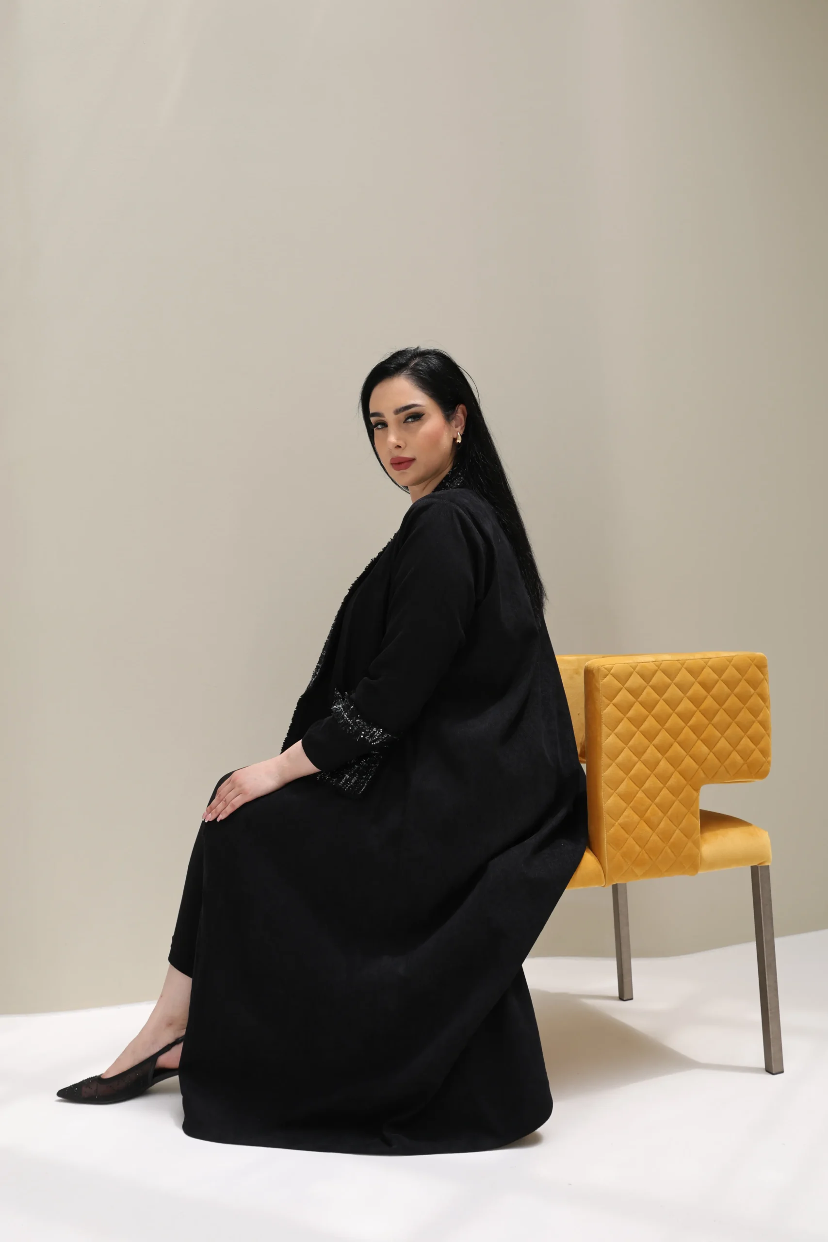 A perfect blend of minimalism and statement detailing, this abaya is for the woman who appreciates quiet luxury with a modern twist. Pair with a silk scarf and gold accessories for a refined finish.