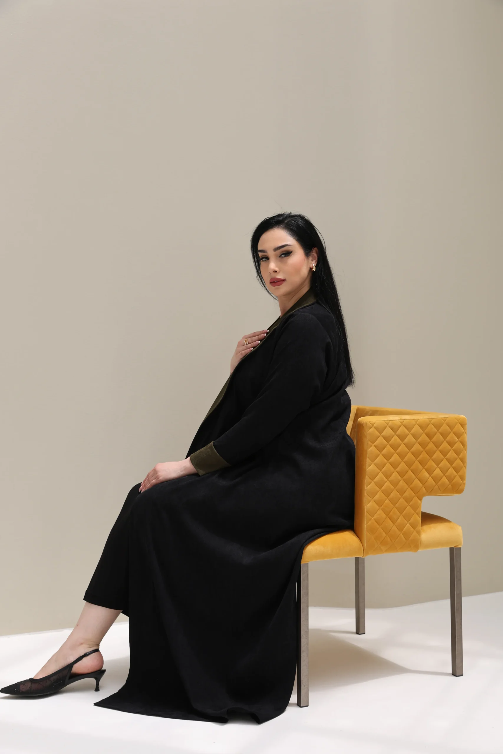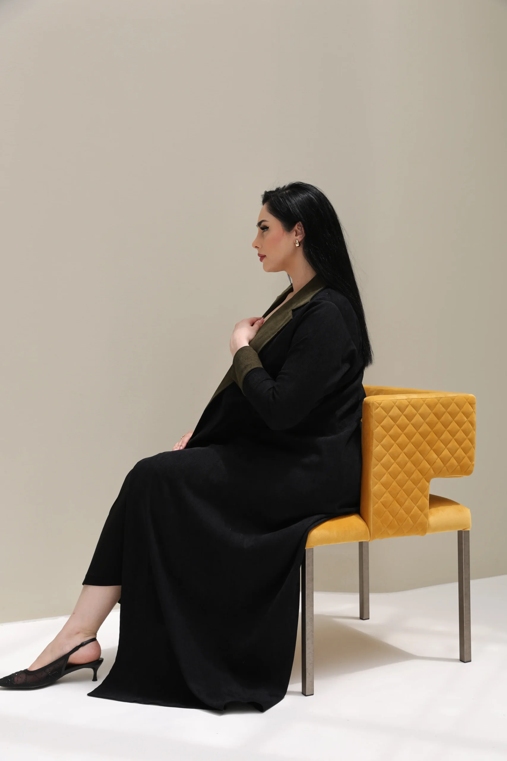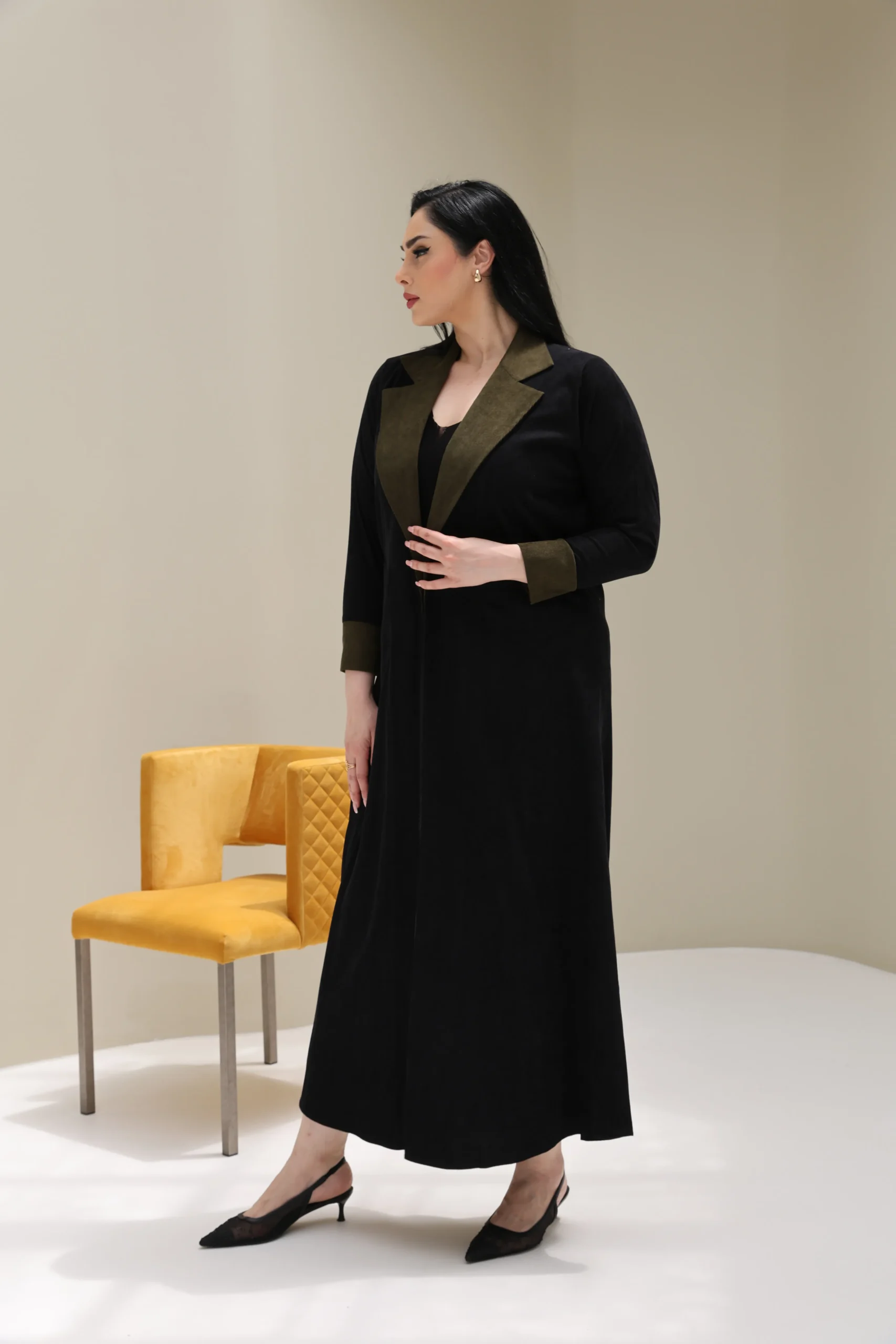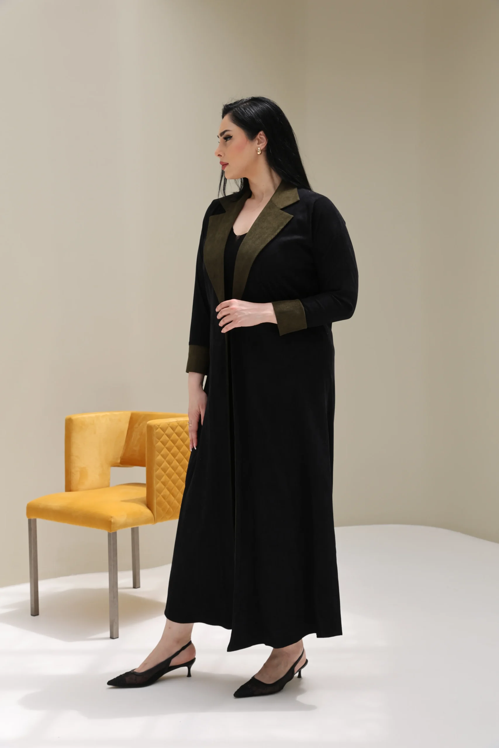 The structured lapel collar and matching cuff accents bring tailored precision to the flowing silhouette, while the long, clean lines elongate the figure for a poised and graceful presence. Perfect for evening gatherings, formal occasions, or elevated daywear, this abaya is a statement of quiet luxury.