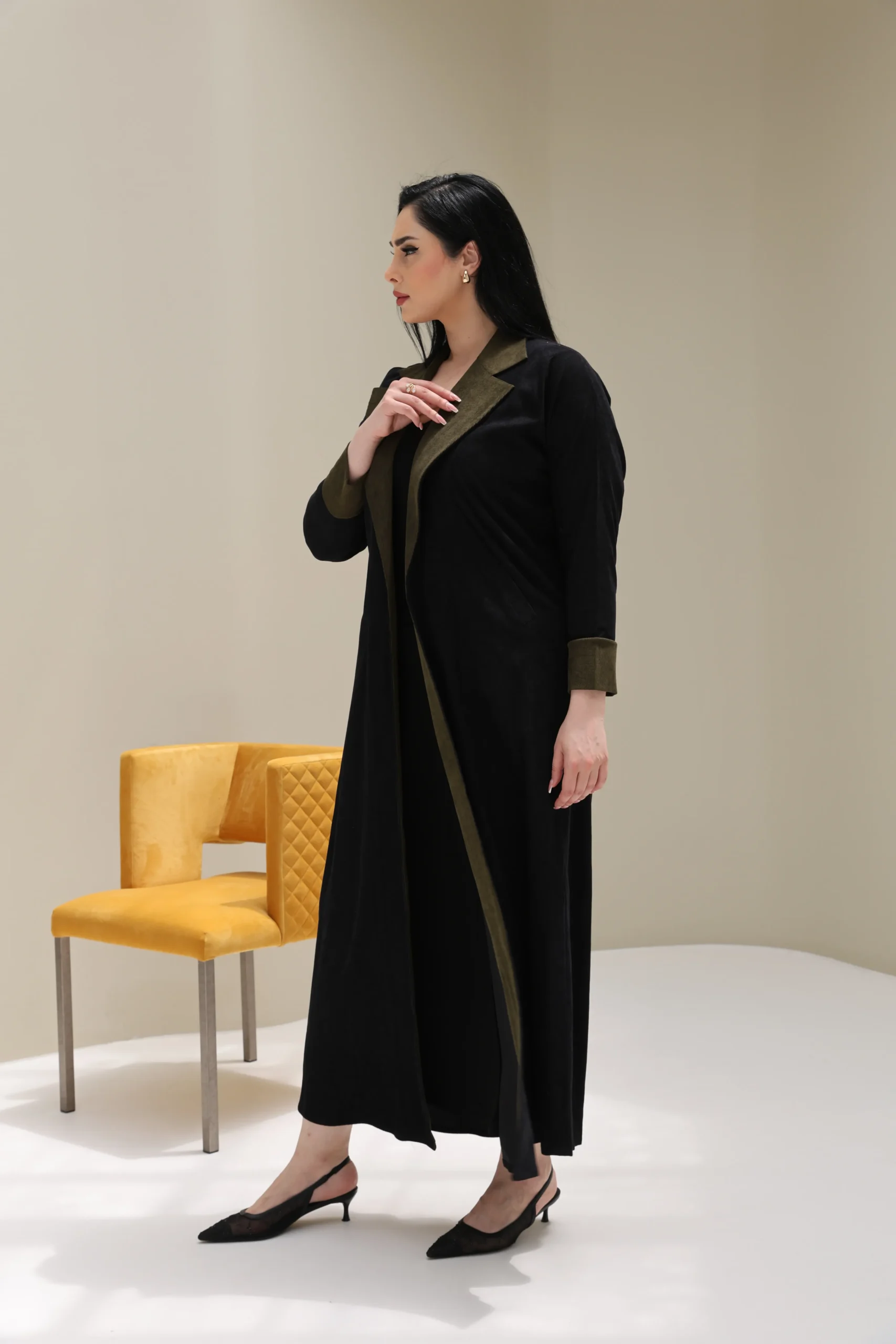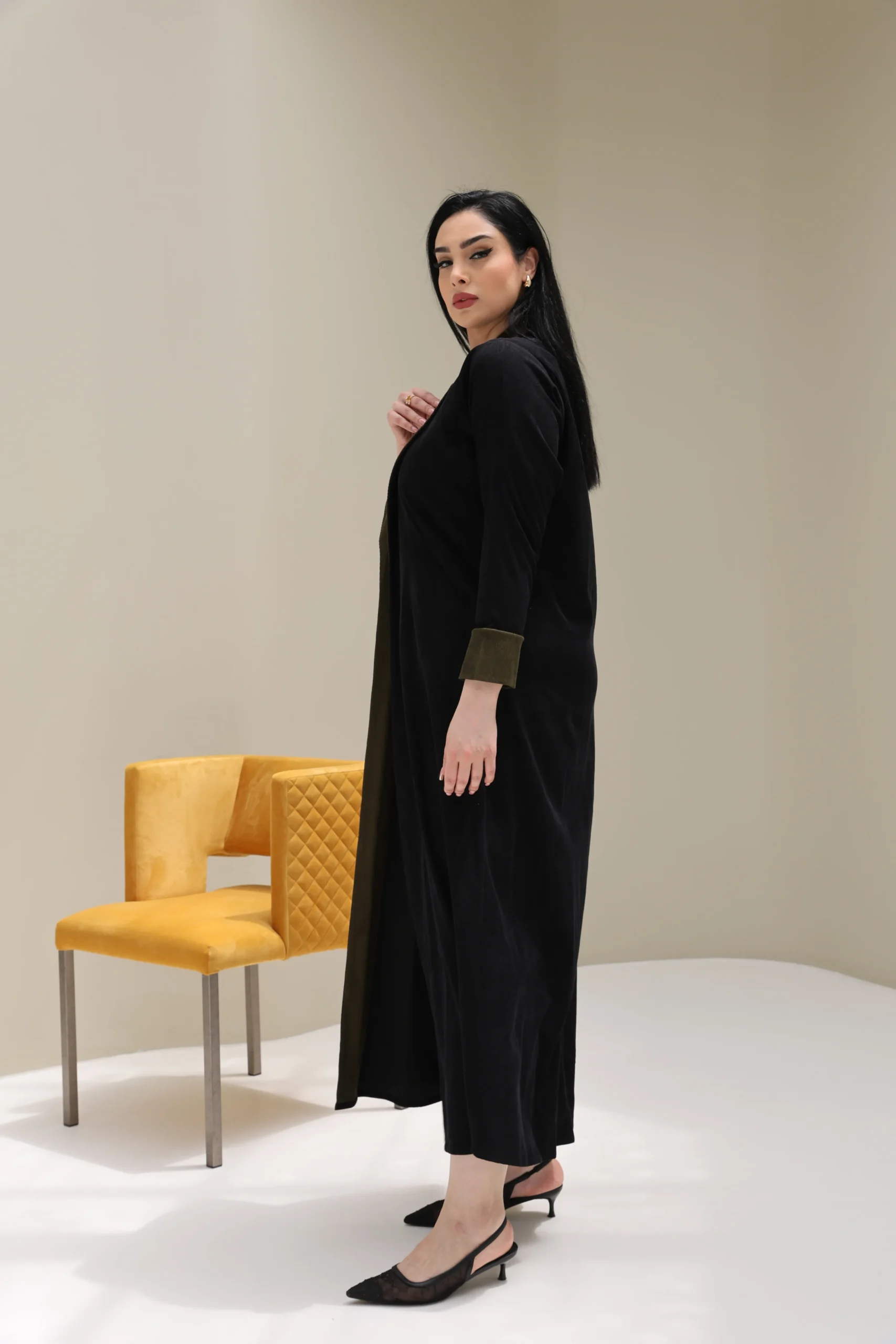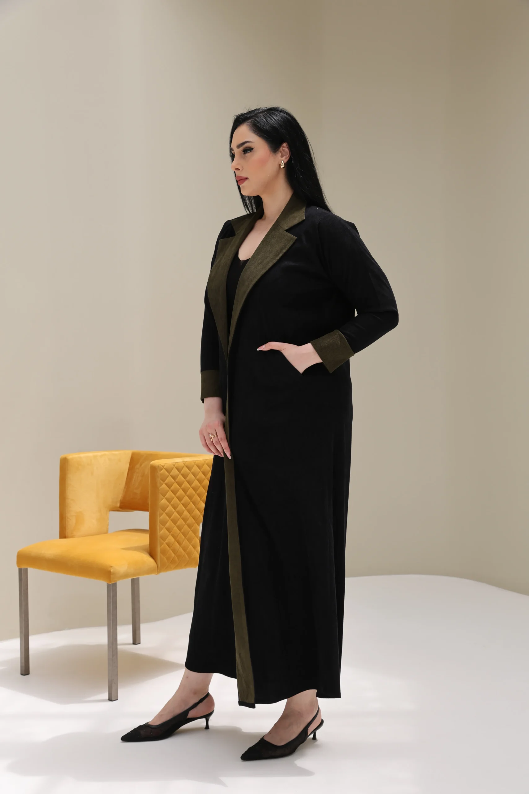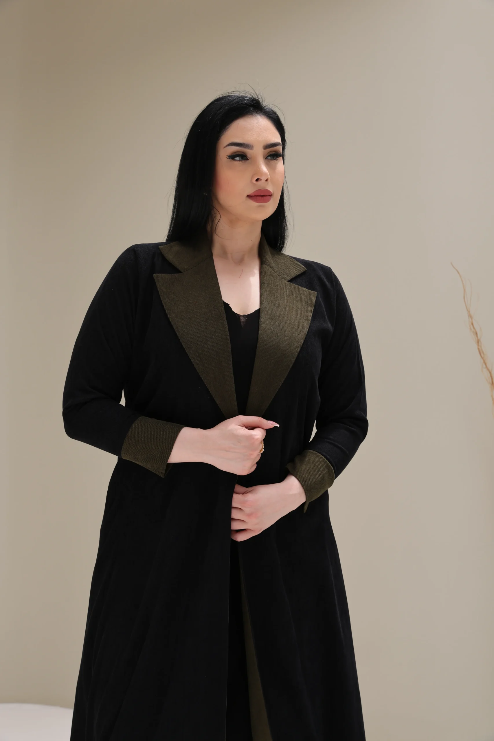 The structured lapel collar and matching cuff accents bring tailored precision to the flowing silhouette, while the long, clean lines elongate the figure for a poised and graceful presence. Perfect for evening gatherings, formal occasions, or elevated daywear, this abaya is a statement of quiet luxury.