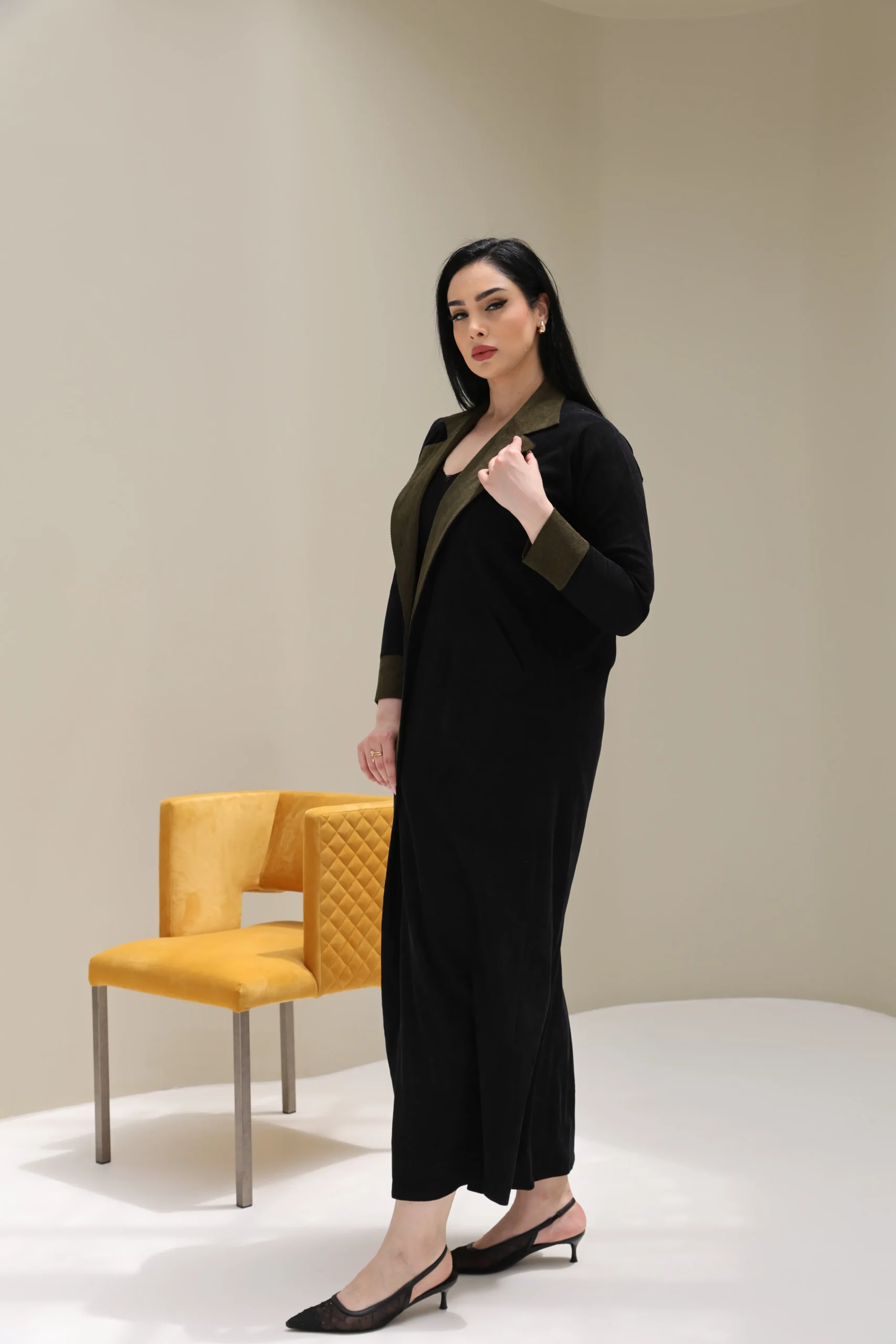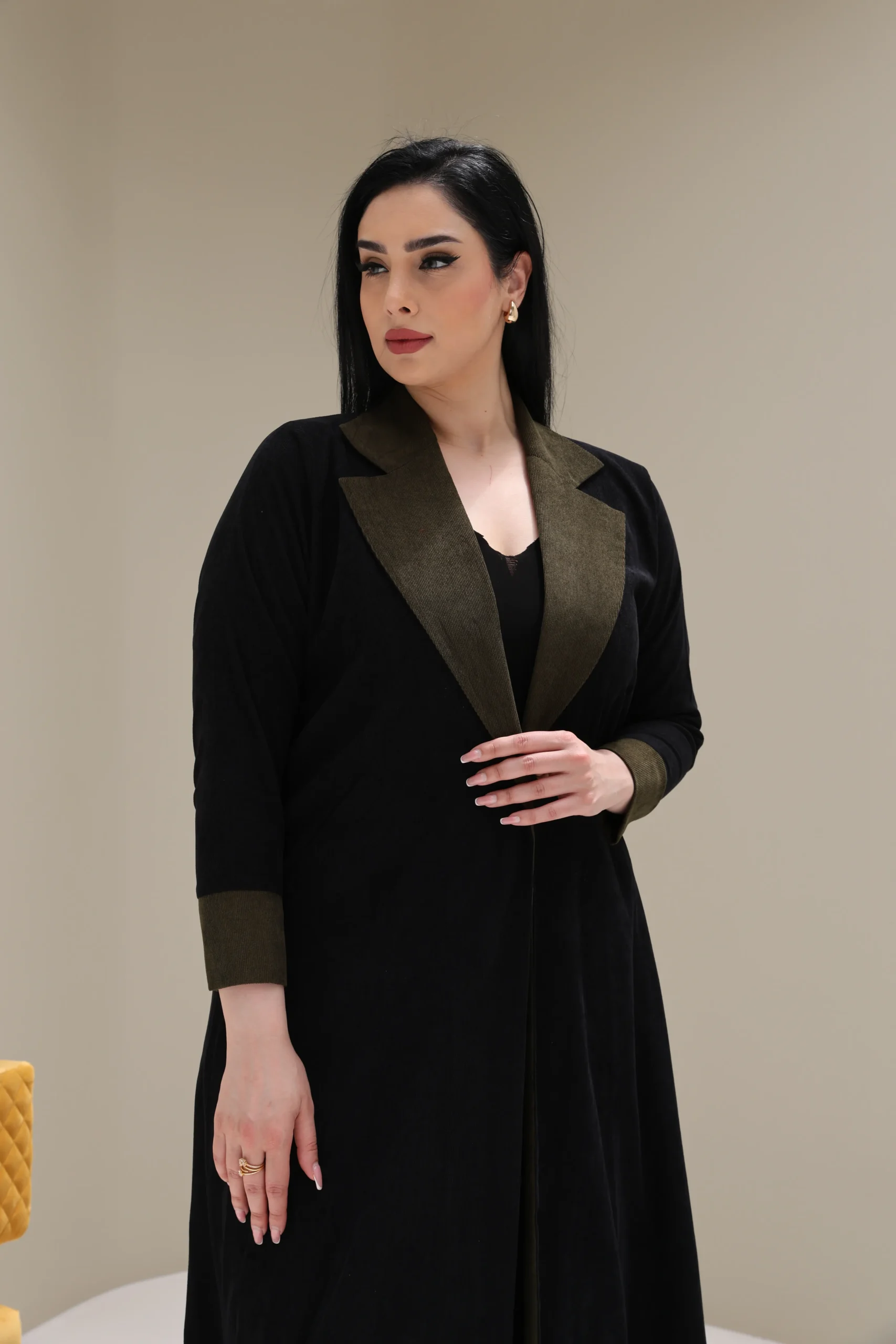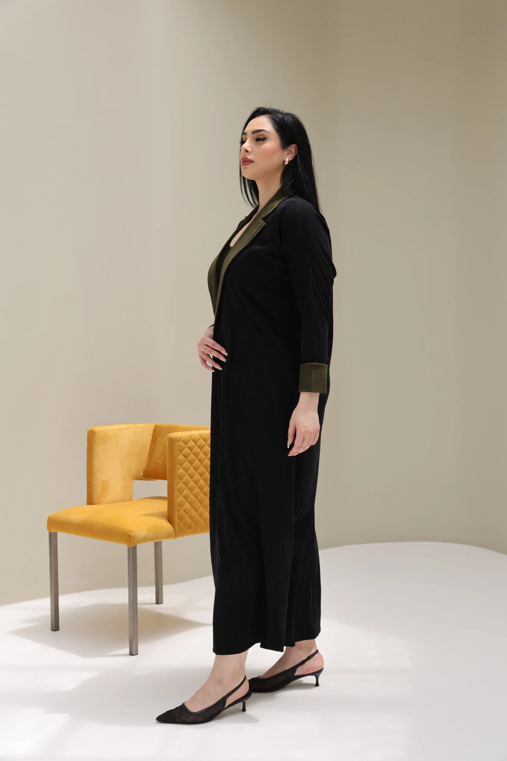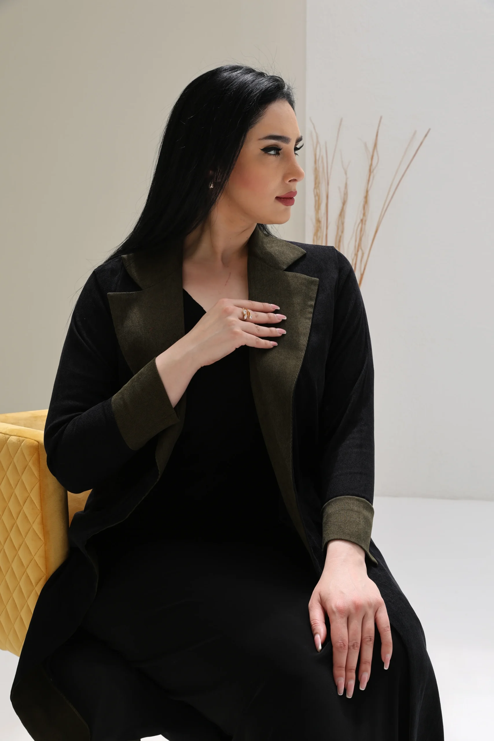 The structured lapel collar and matching cuff accents bring tailored precision to the flowing silhouette, while the long, clean lines elongate the figure for a poised and graceful presence. Perfect for evening gatherings, formal occasions, or elevated daywear, this abaya is a statement of quiet luxury.