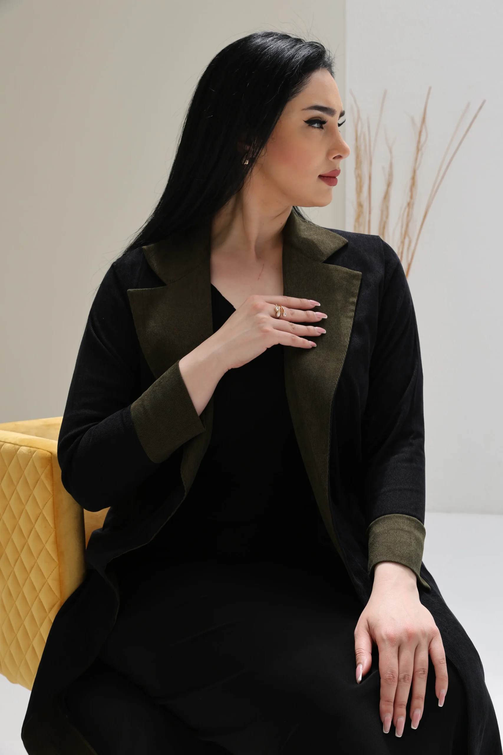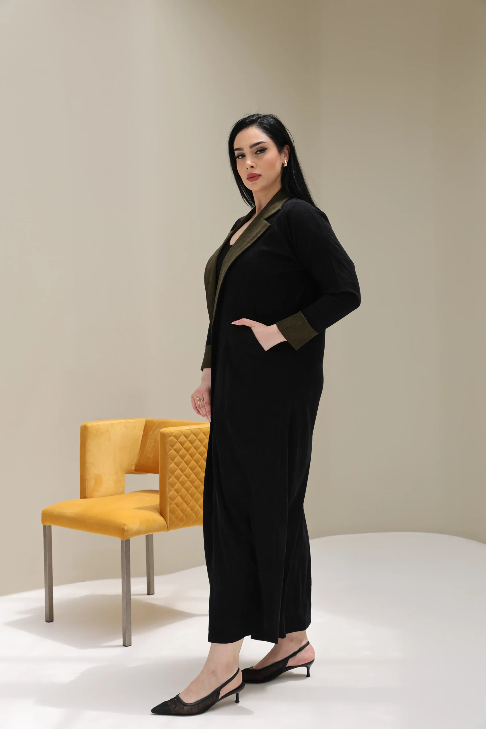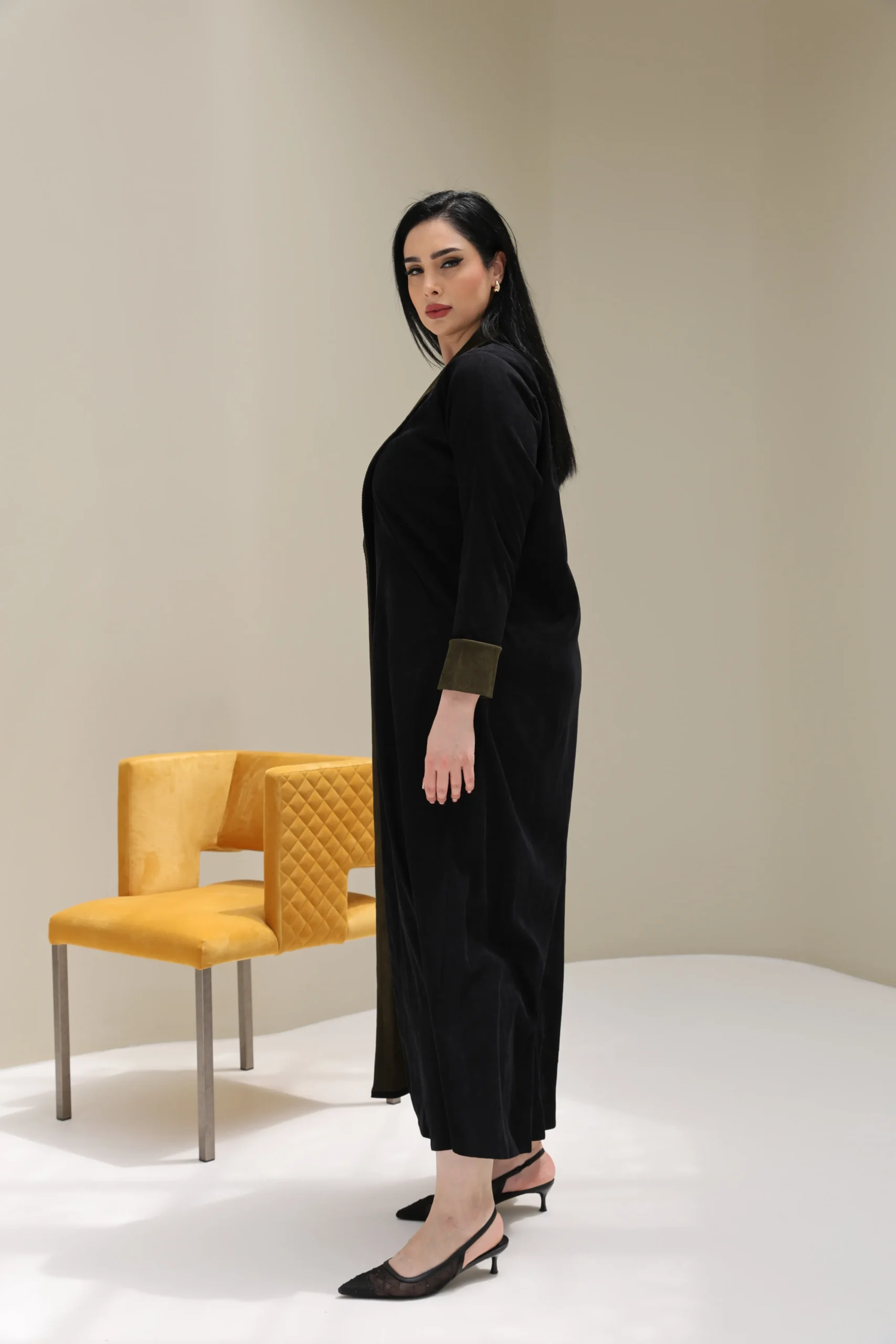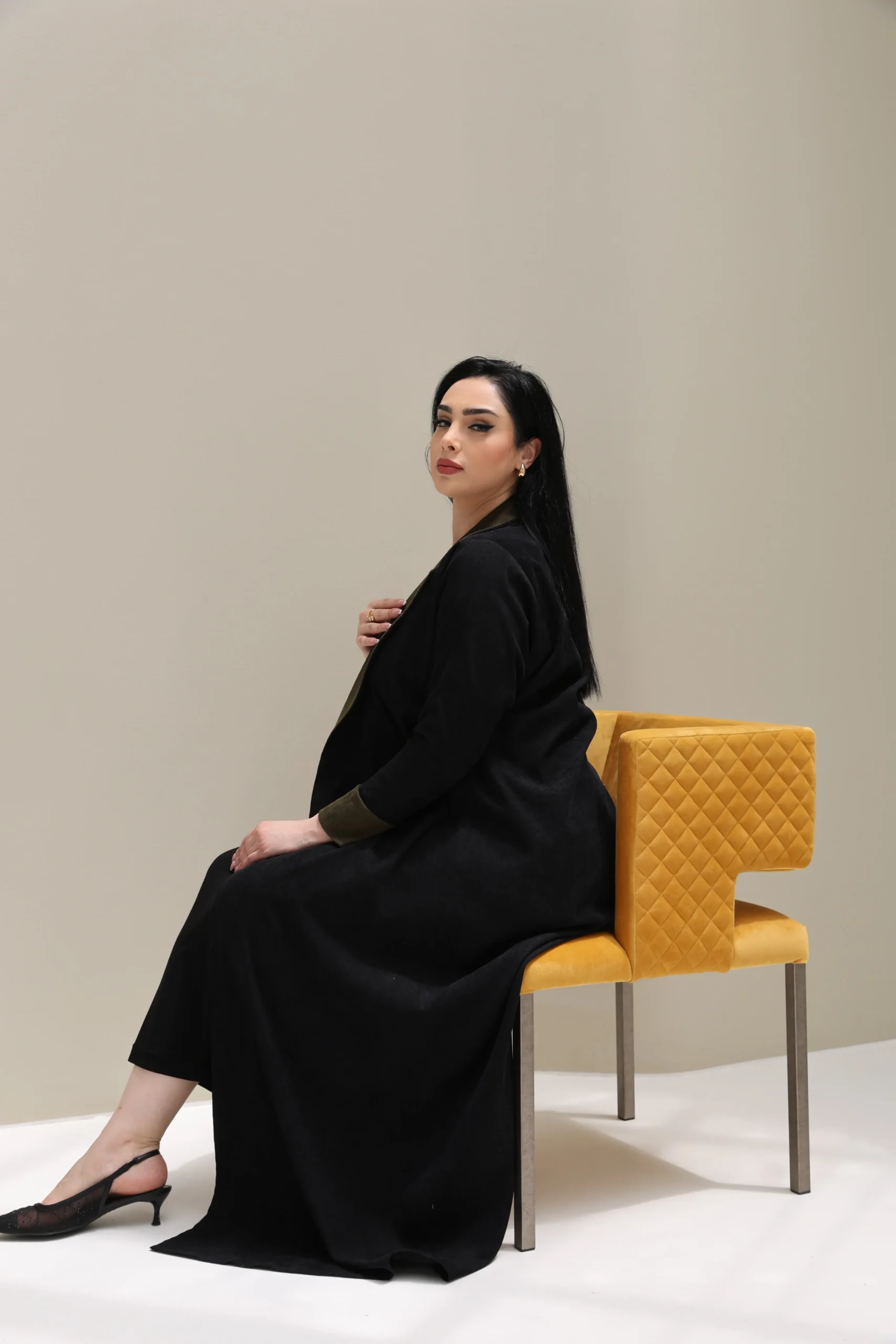 The structured lapel collar and matching cuff accents bring tailored precision to the flowing silhouette, while the long, clean lines elongate the figure for a poised and graceful presence. Perfect for evening gatherings, formal occasions, or elevated daywear, this abaya is a statement of quiet luxury.