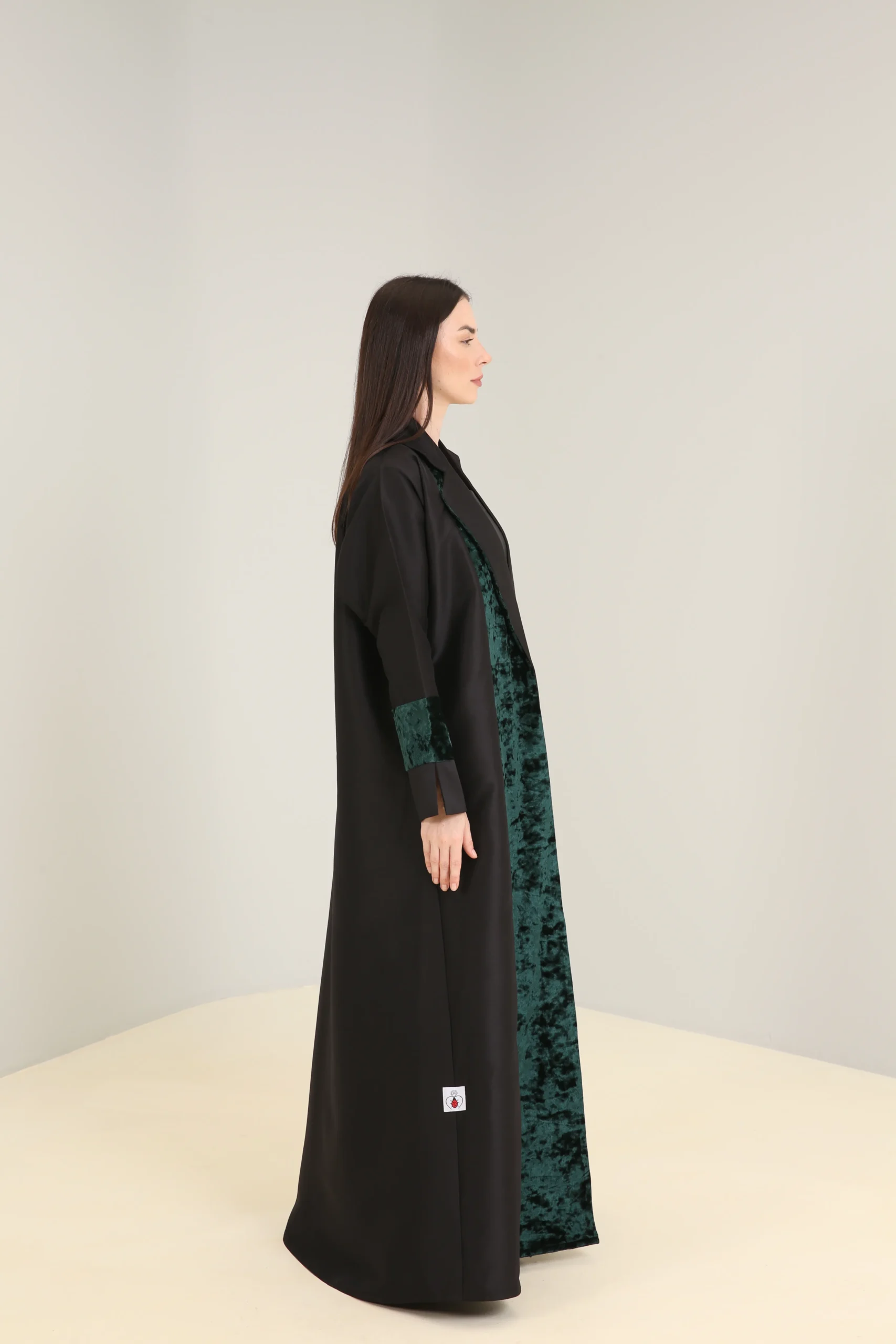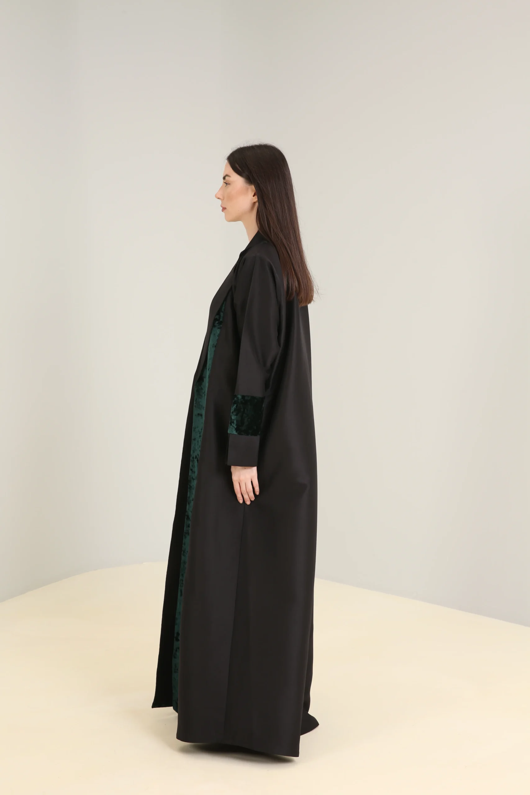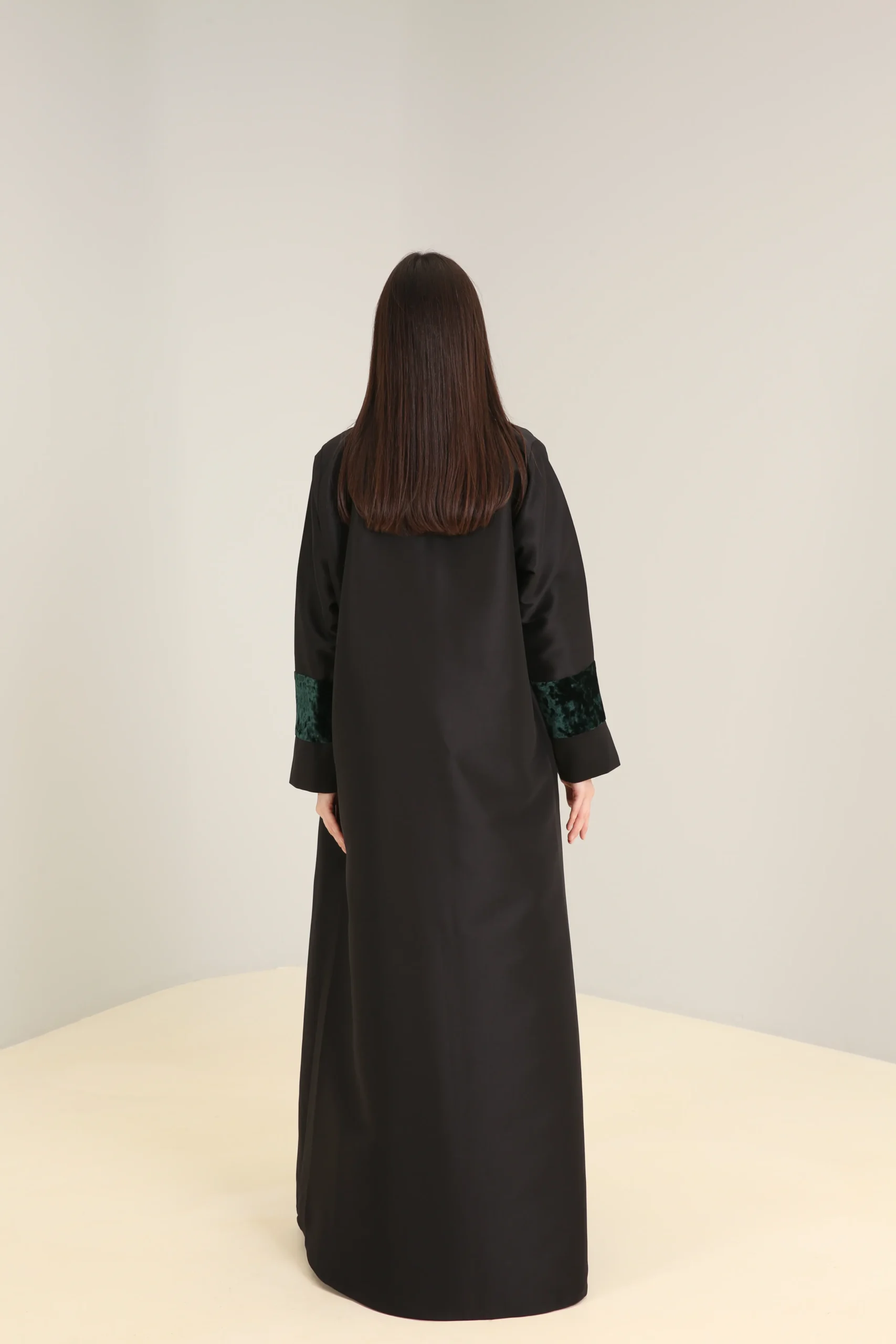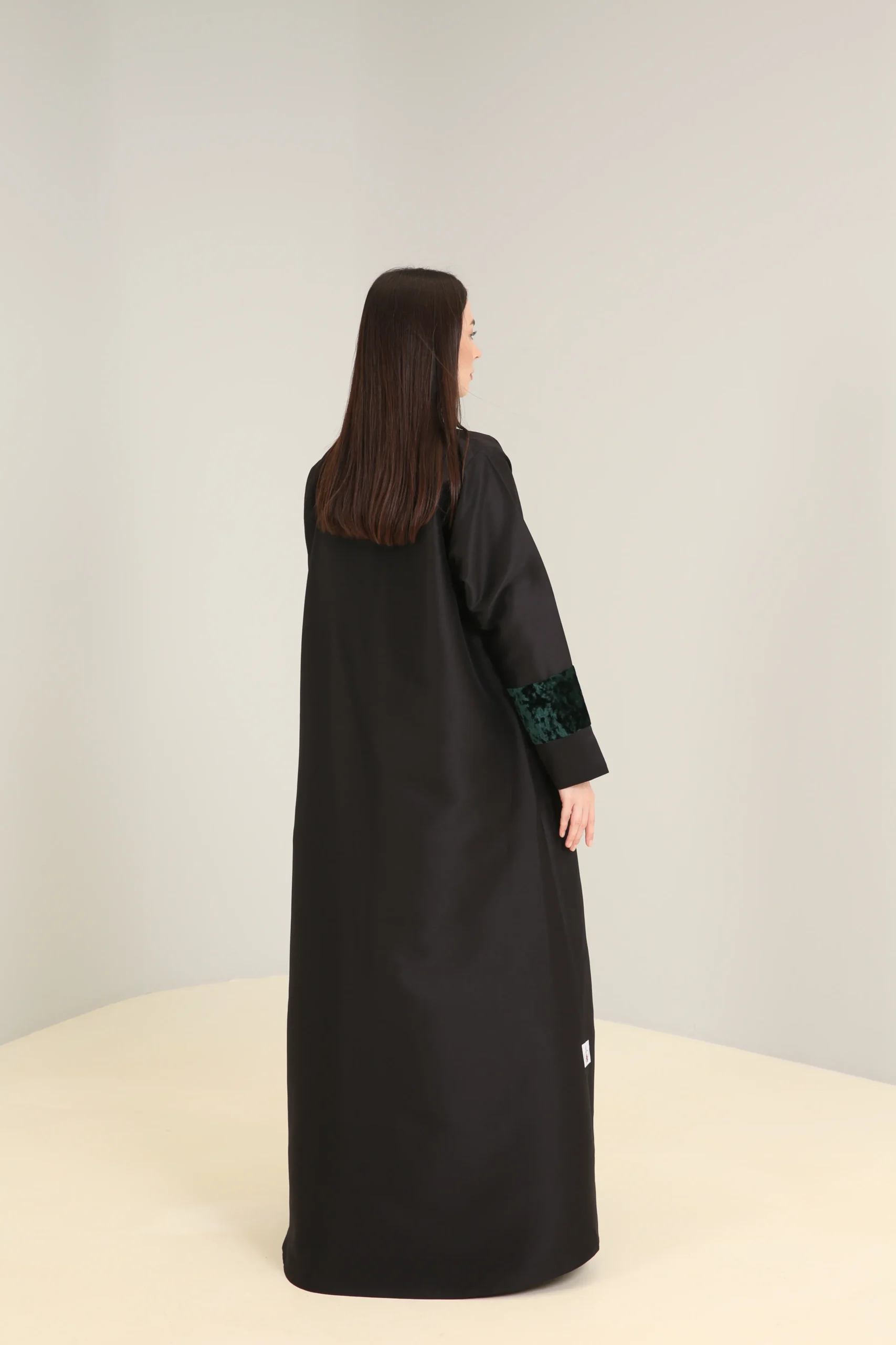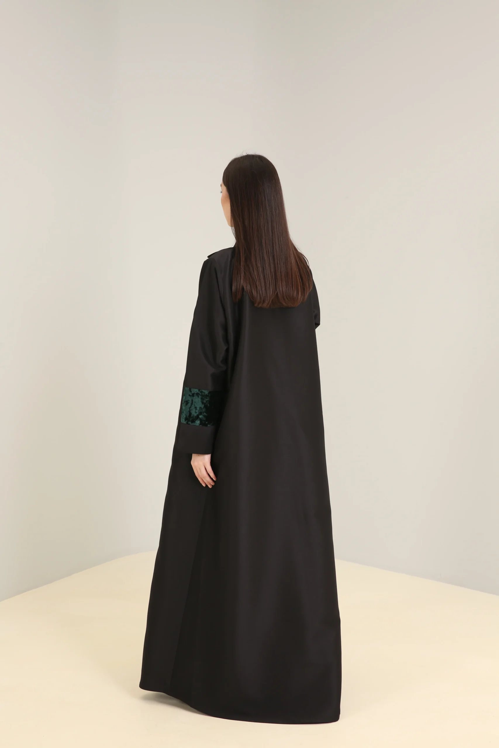This abaya blends the softness of fine cashmere with the sophistication of tactile floral artistry, making it a modern heirloom for the woman who dresses with intent and grace. Pair with gold or emerald accessories for a truly regal finish.