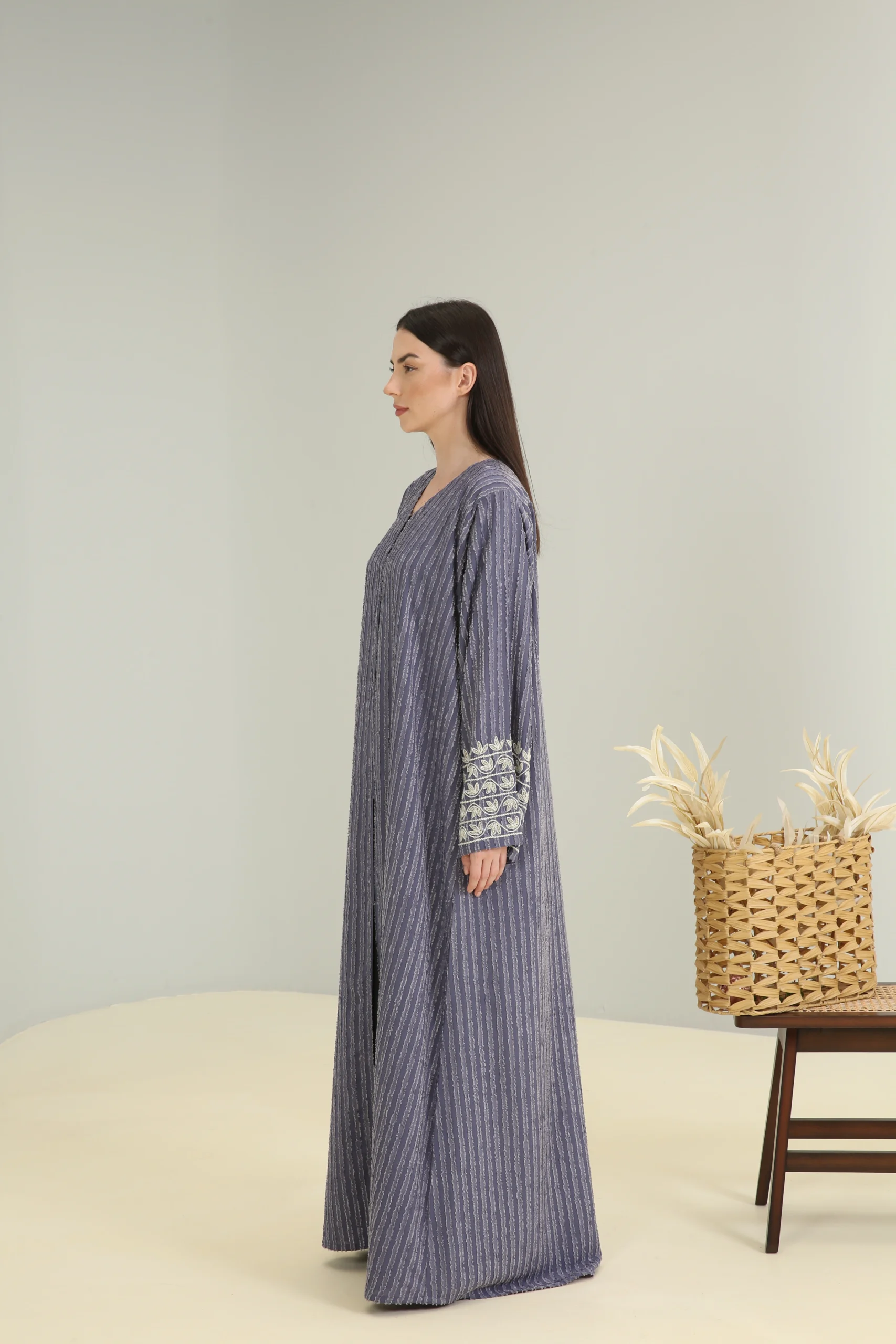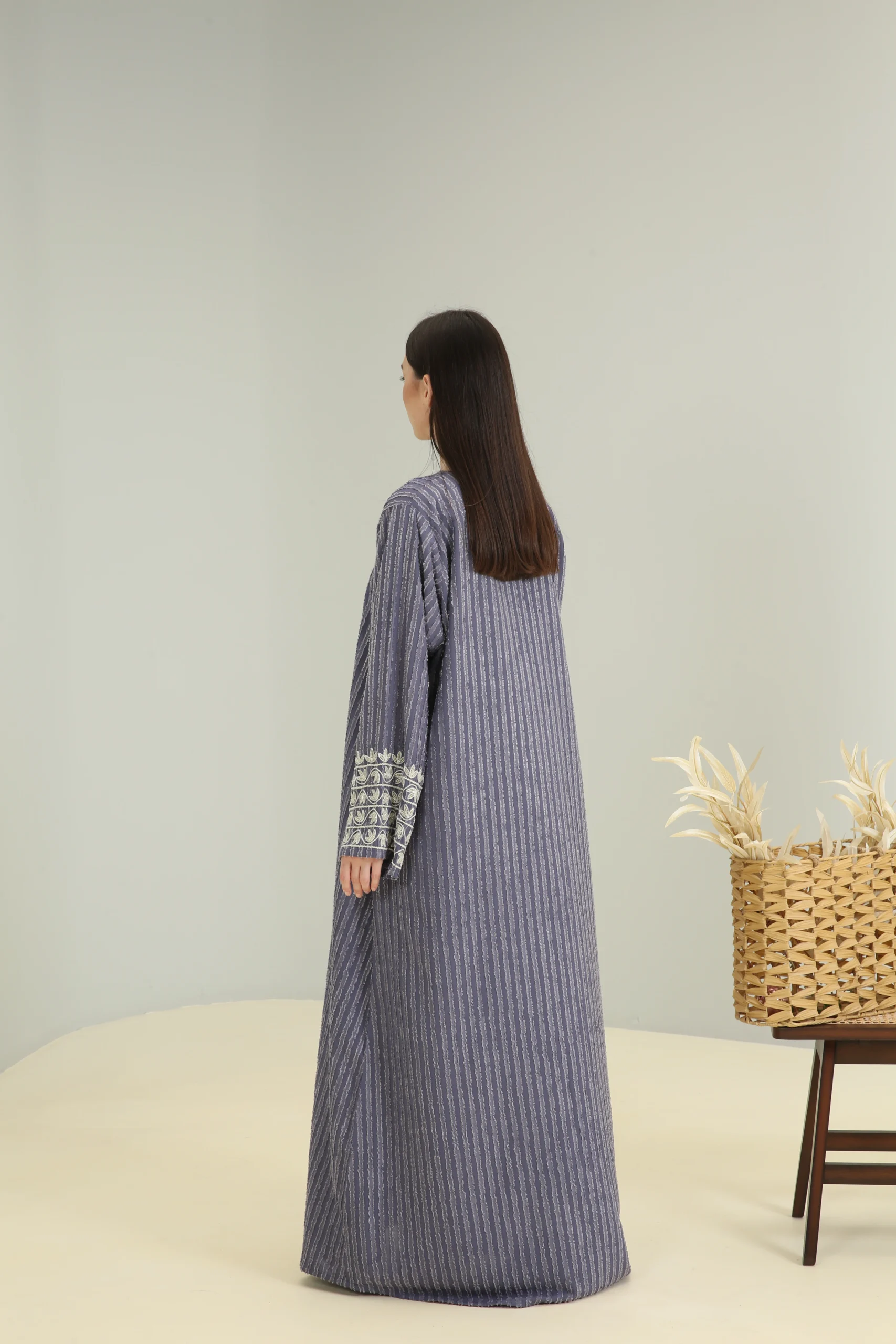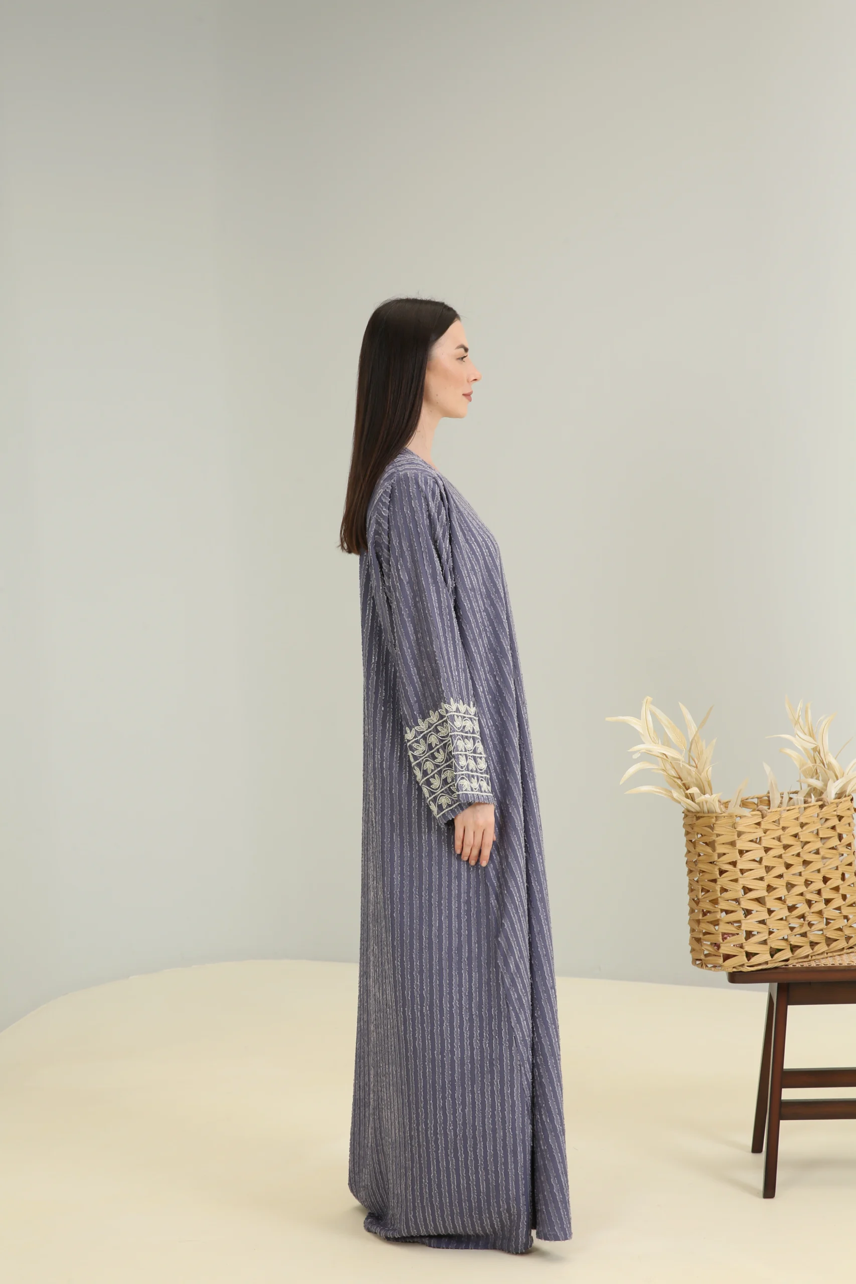 The Celestial Dusk Jalabiya is a truly unique piece that marries rich texture with stunning detail. Its deep, muted blue-gray fabric features a subtle shimmer within its delicate vertical pleating, creating a look that is both sophisticated and enchanting. The sleeves are a beautiful focal point, adorned with intricate, sparkling embroidery in a detailed floral pattern, reminiscent of stars against a twilight sky.