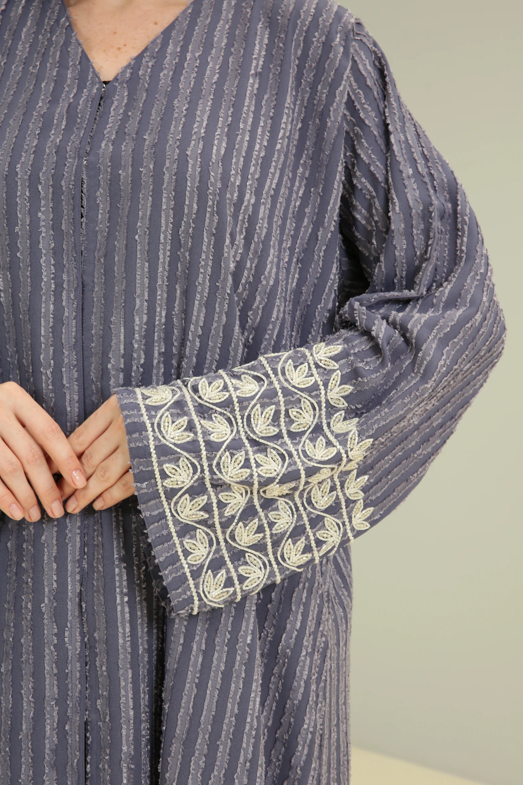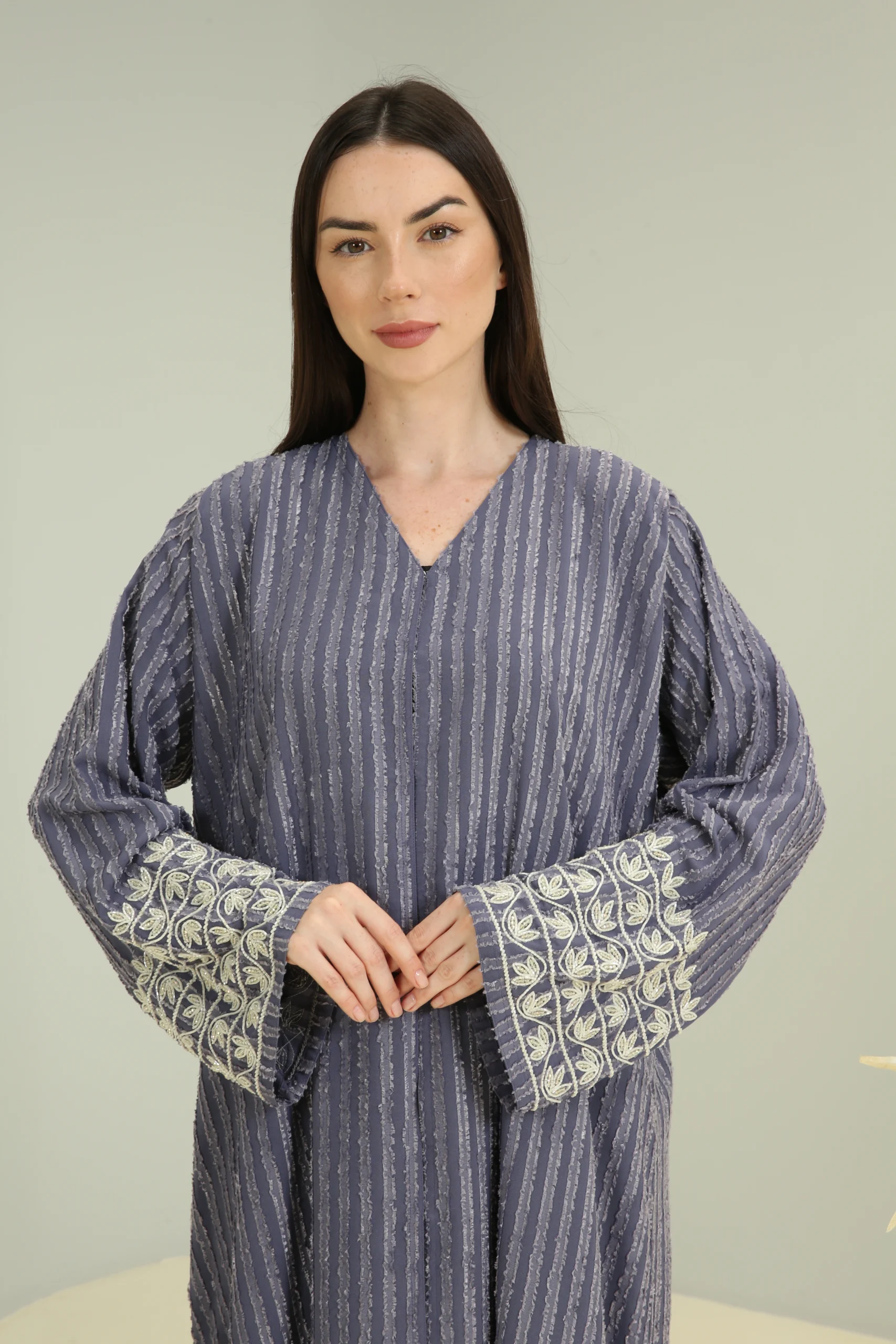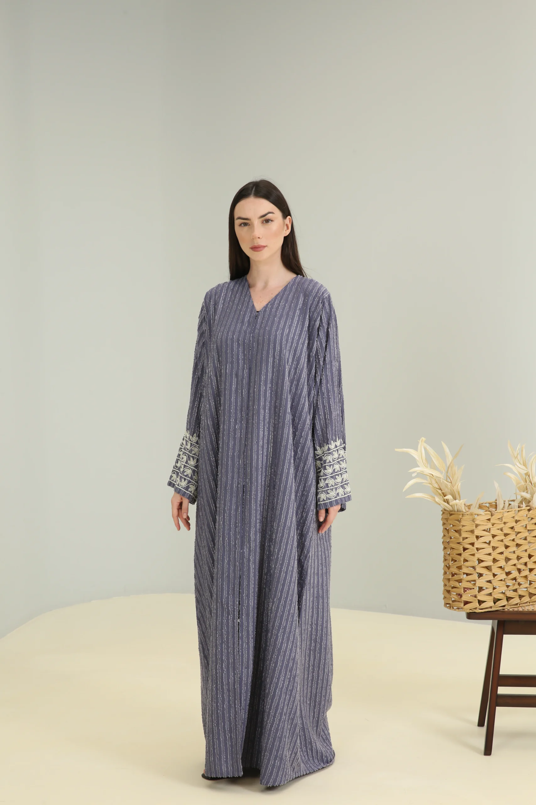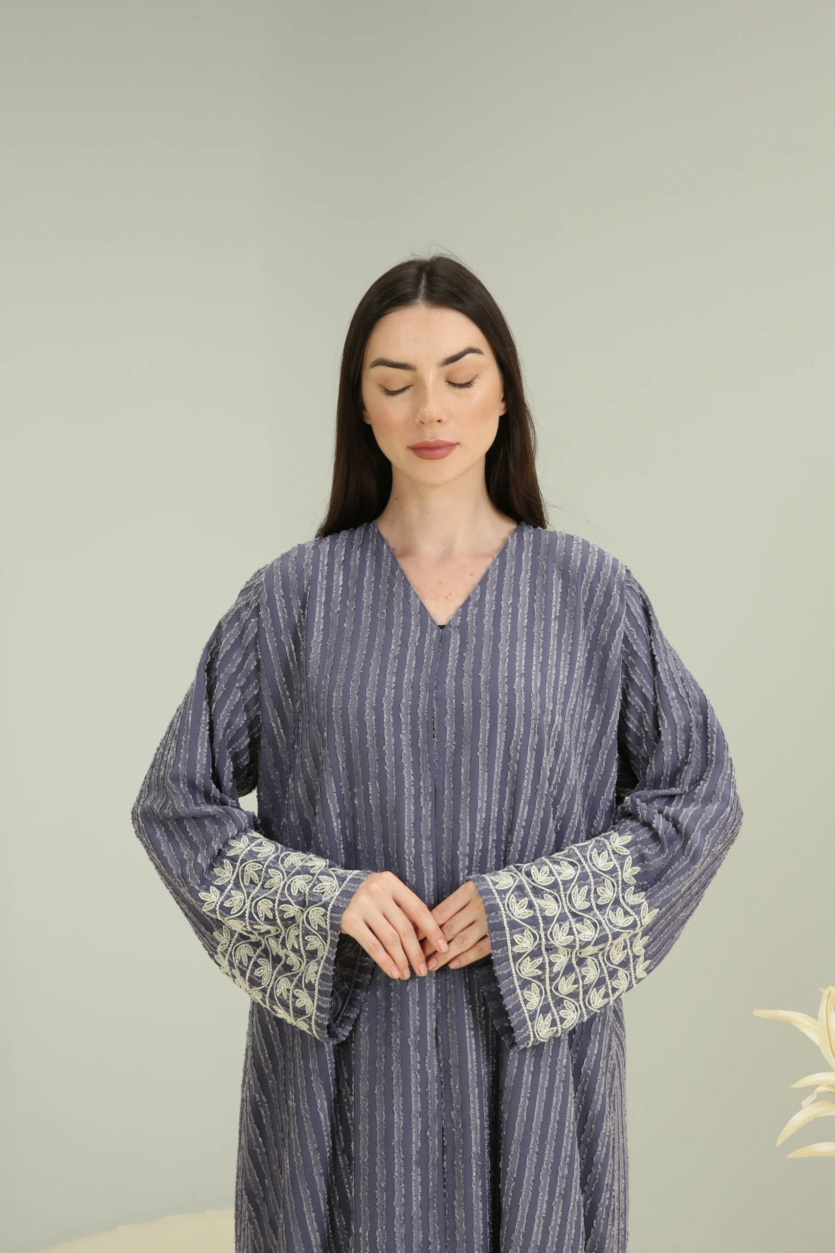 The Celestial Dusk Jalabiya is a truly unique piece that marries rich texture with stunning detail. Its deep, muted blue-gray fabric features a subtle shimmer within its delicate vertical pleating, creating a look that is both sophisticated and enchanting. The sleeves are a beautiful focal point, adorned with intricate, sparkling embroidery in a detailed floral pattern, reminiscent of stars against a twilight sky.
