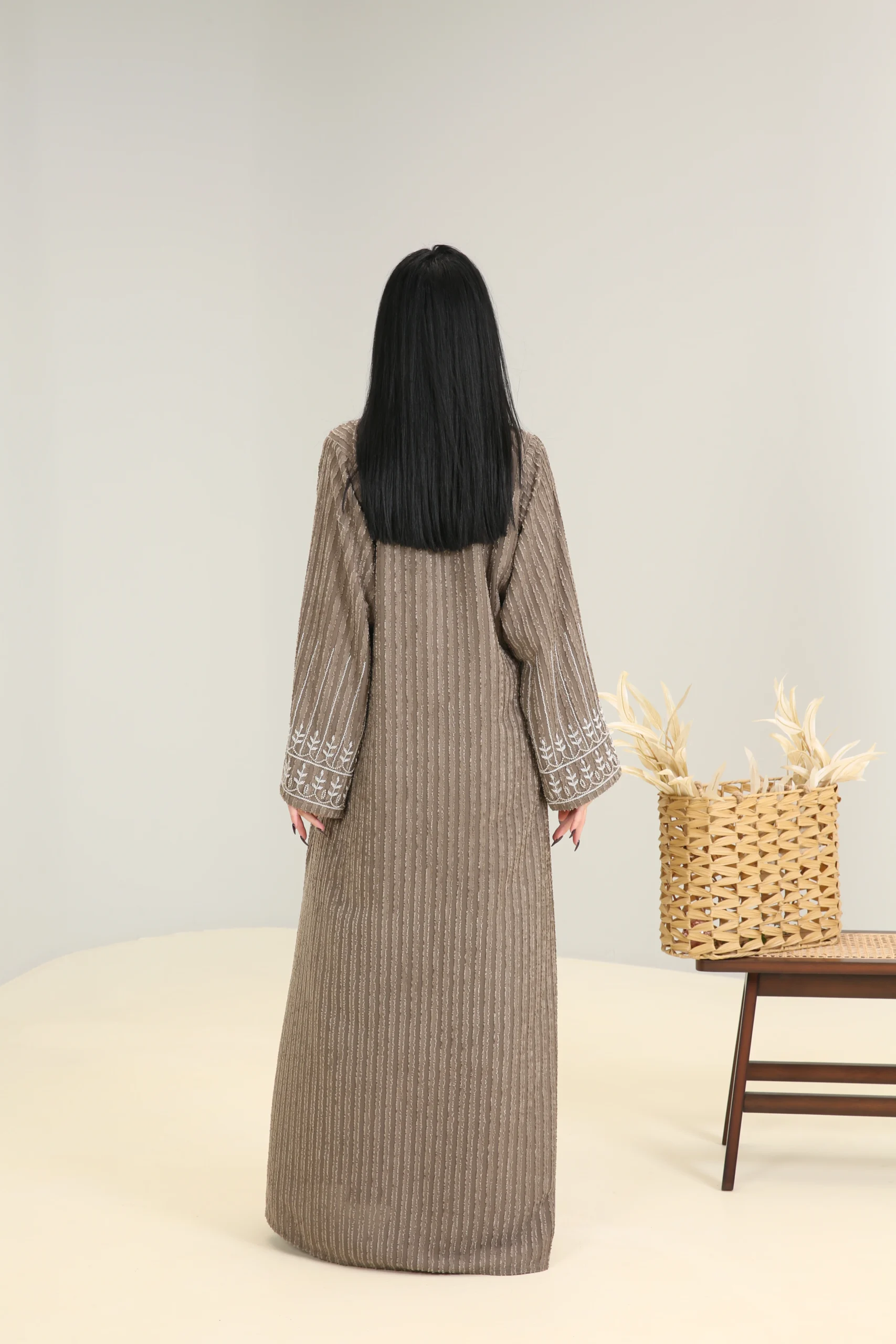 Designed with a long, flowing silhouette, this abaya is meant to be a show-stopping outer layer for any special occasion. The open-front style drapes beautifully, offering both a comfortable fit and a captivating presence. The combination of rich texture and exquisite detail makes this a truly unique garment, perfect for the woman who desires a blend of classic elegance and modern artistry.