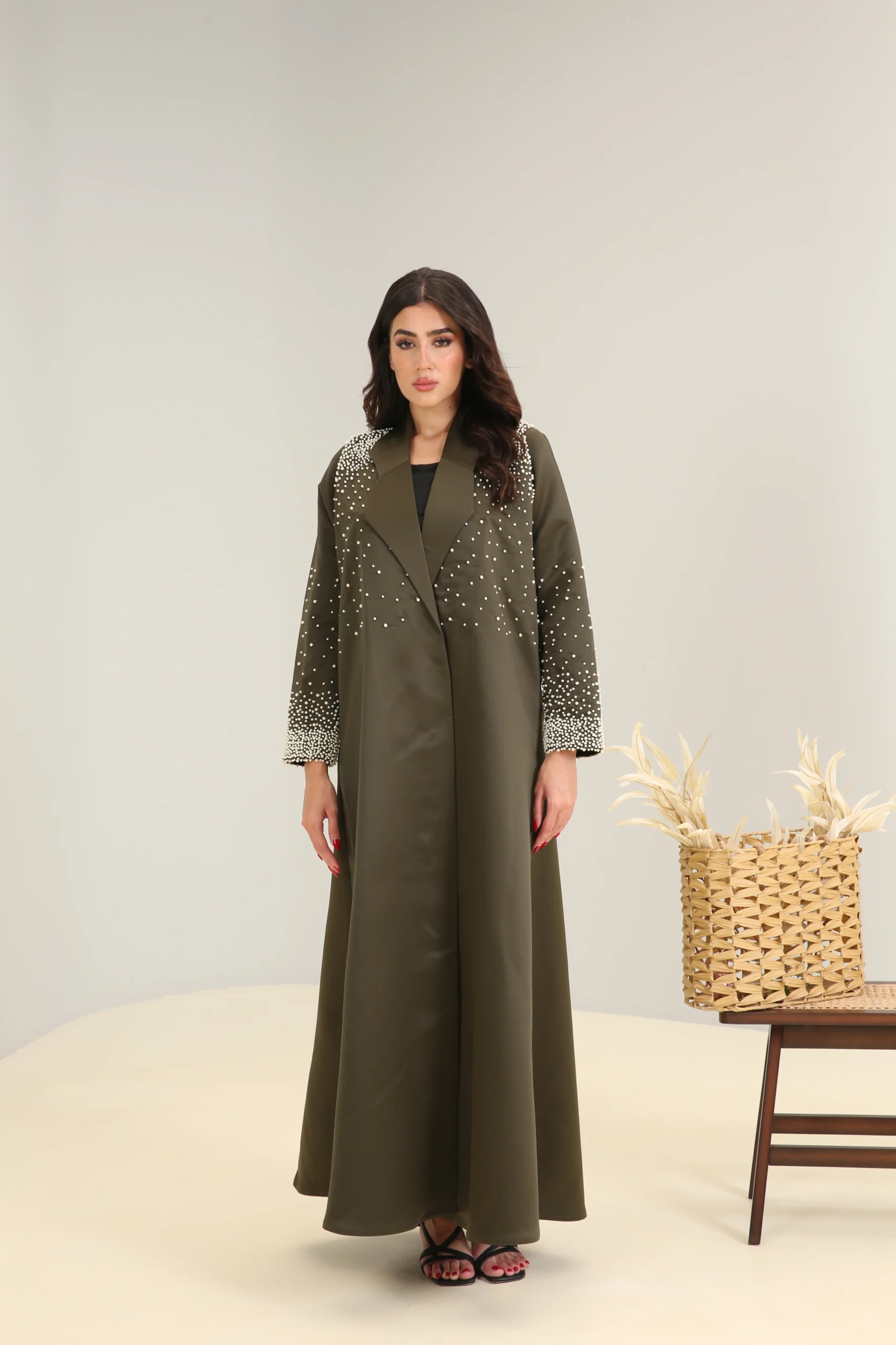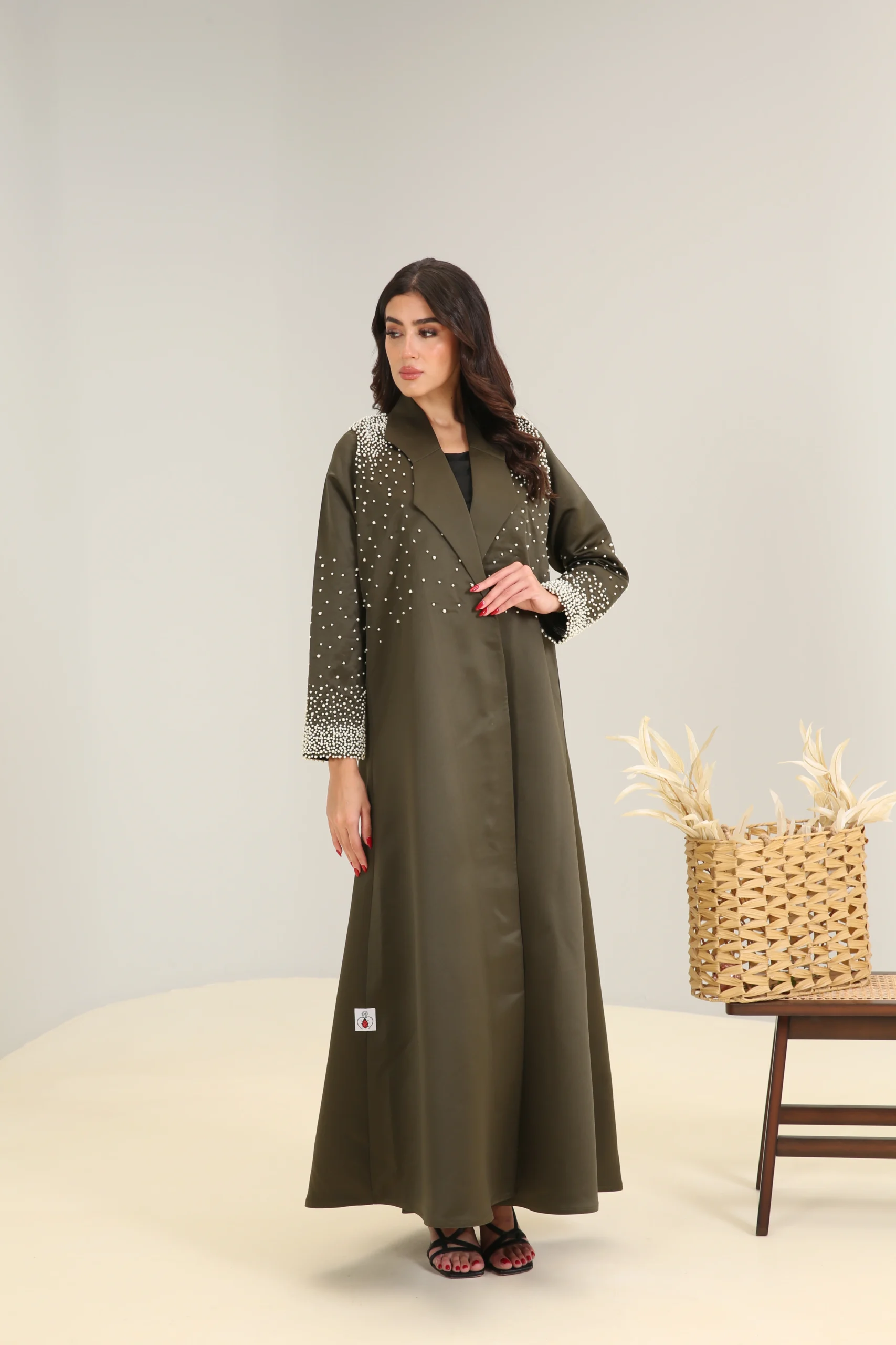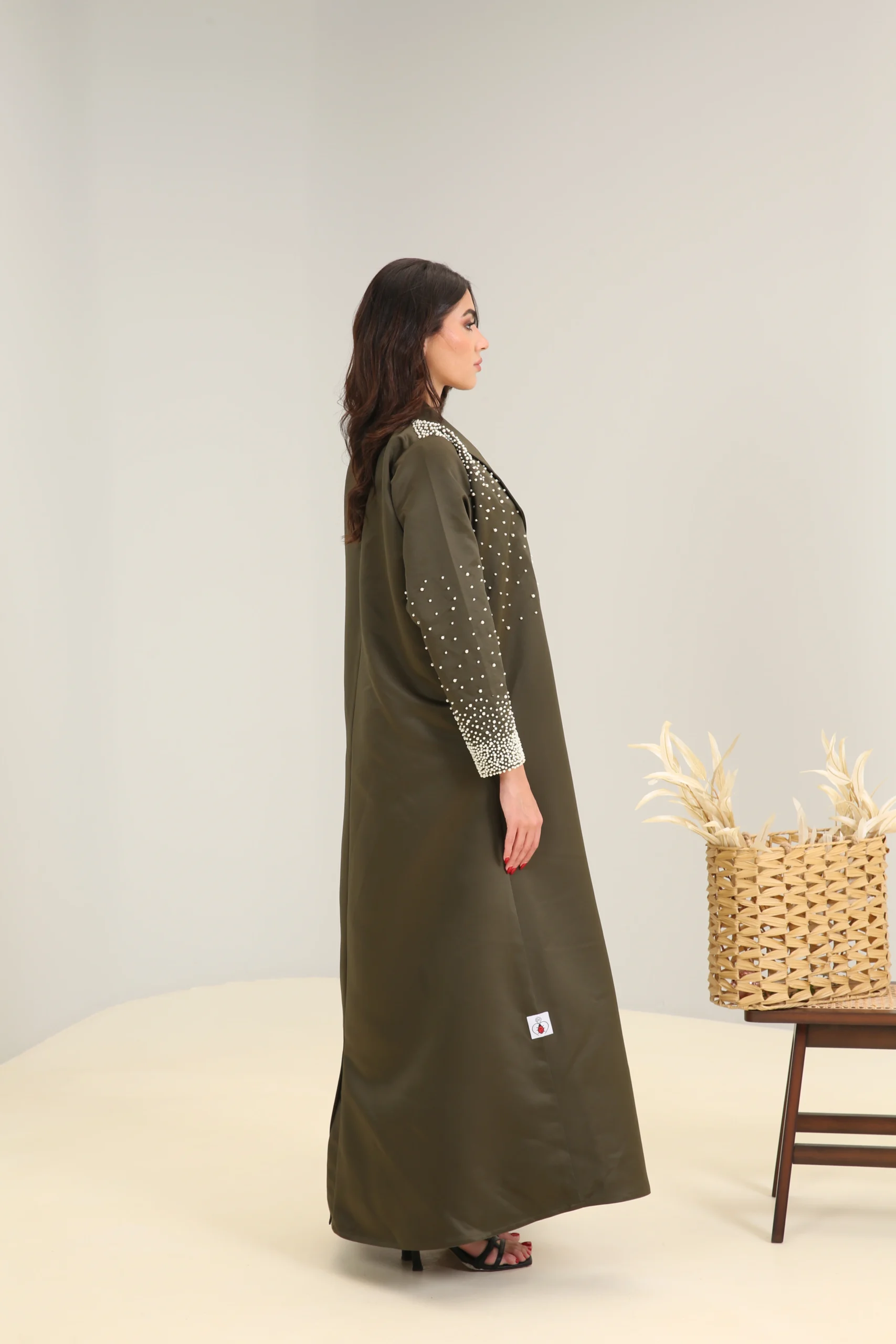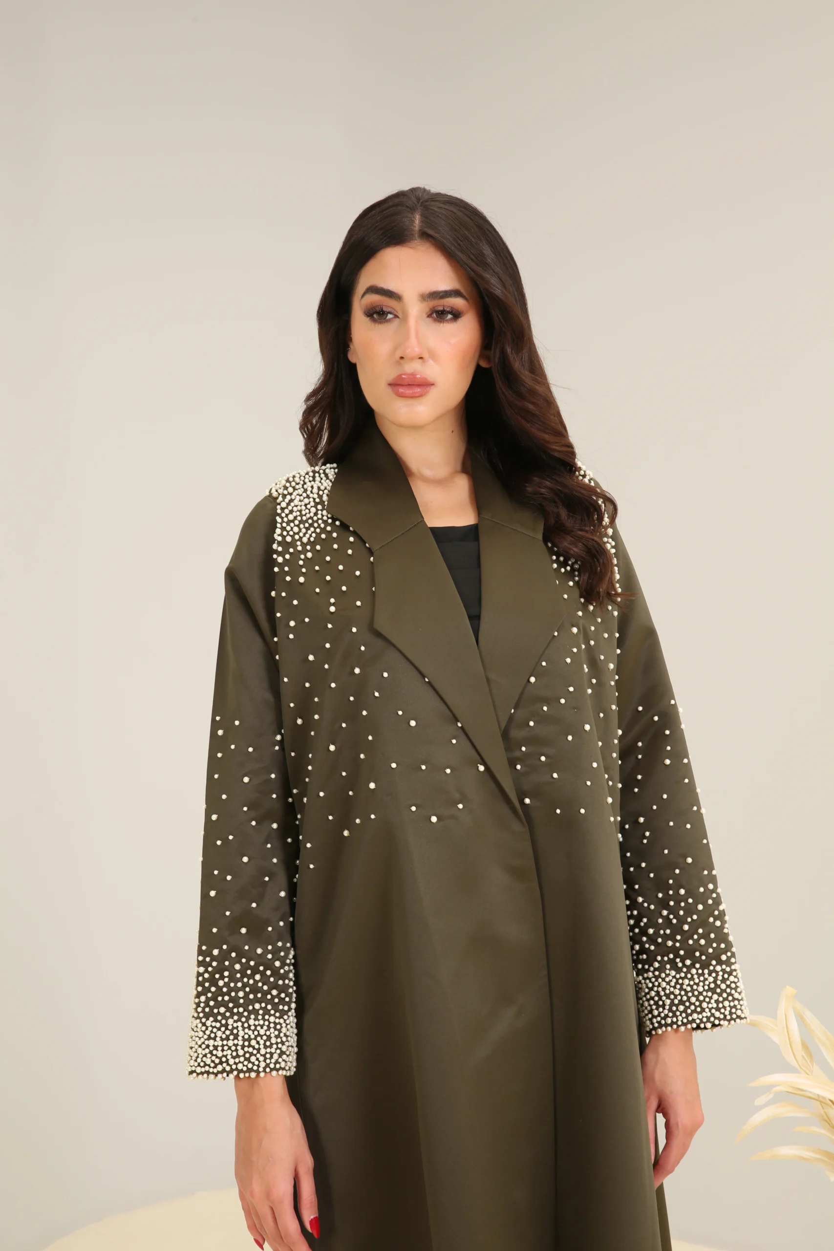 The Olive Starfall Abaya is a luxurious piece that radiates modern glamour. Crafted in a rich olive-green fabric with a subtle sheen, it combines classic style with captivating detail. The shoulders and sleeves are adorned with a magnificent pattern of scattered beading and sequins that gently fall down the garment like a cascade of stars. This luminous detail adds a touch of opulent sparkle to the rich, earthy tone.