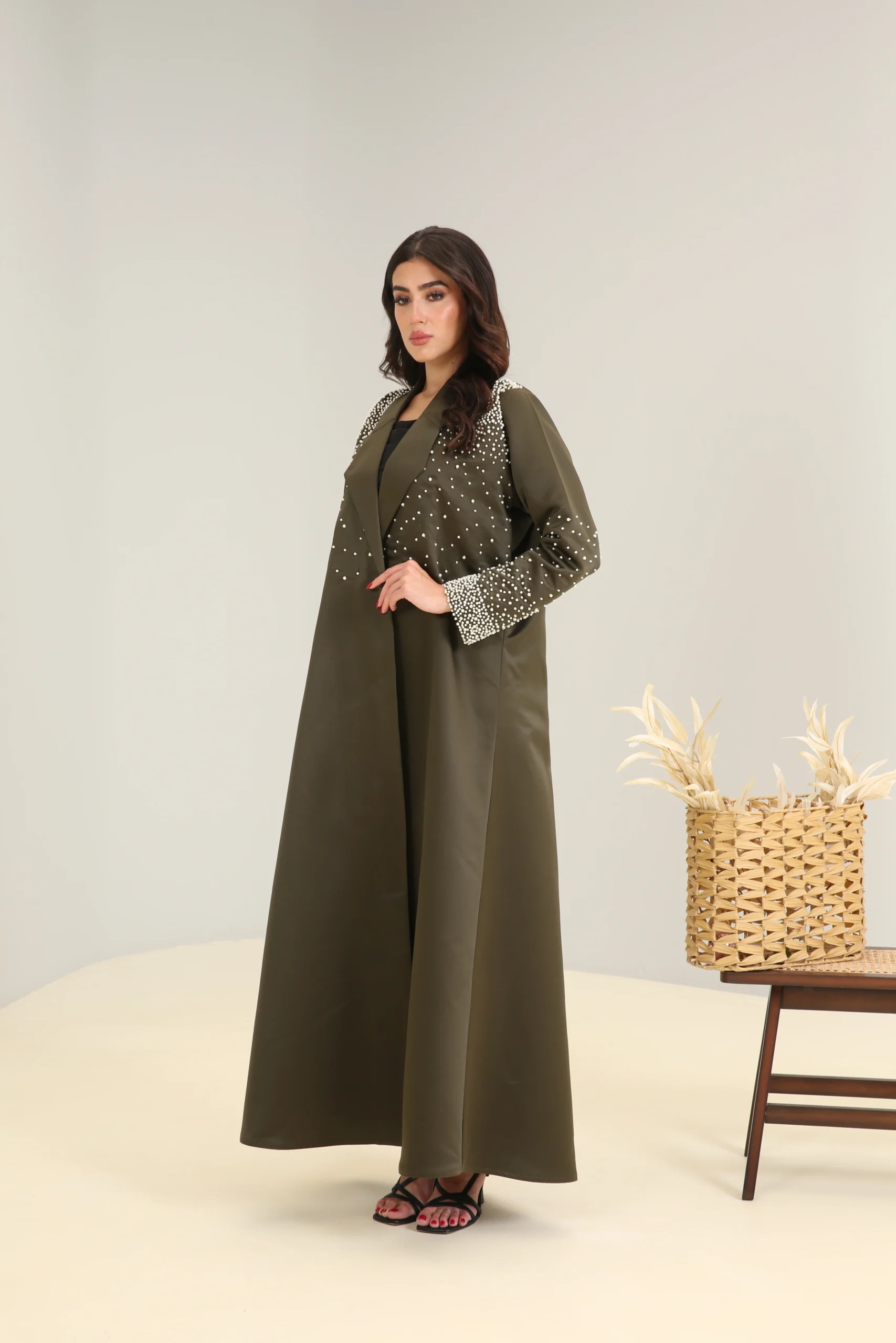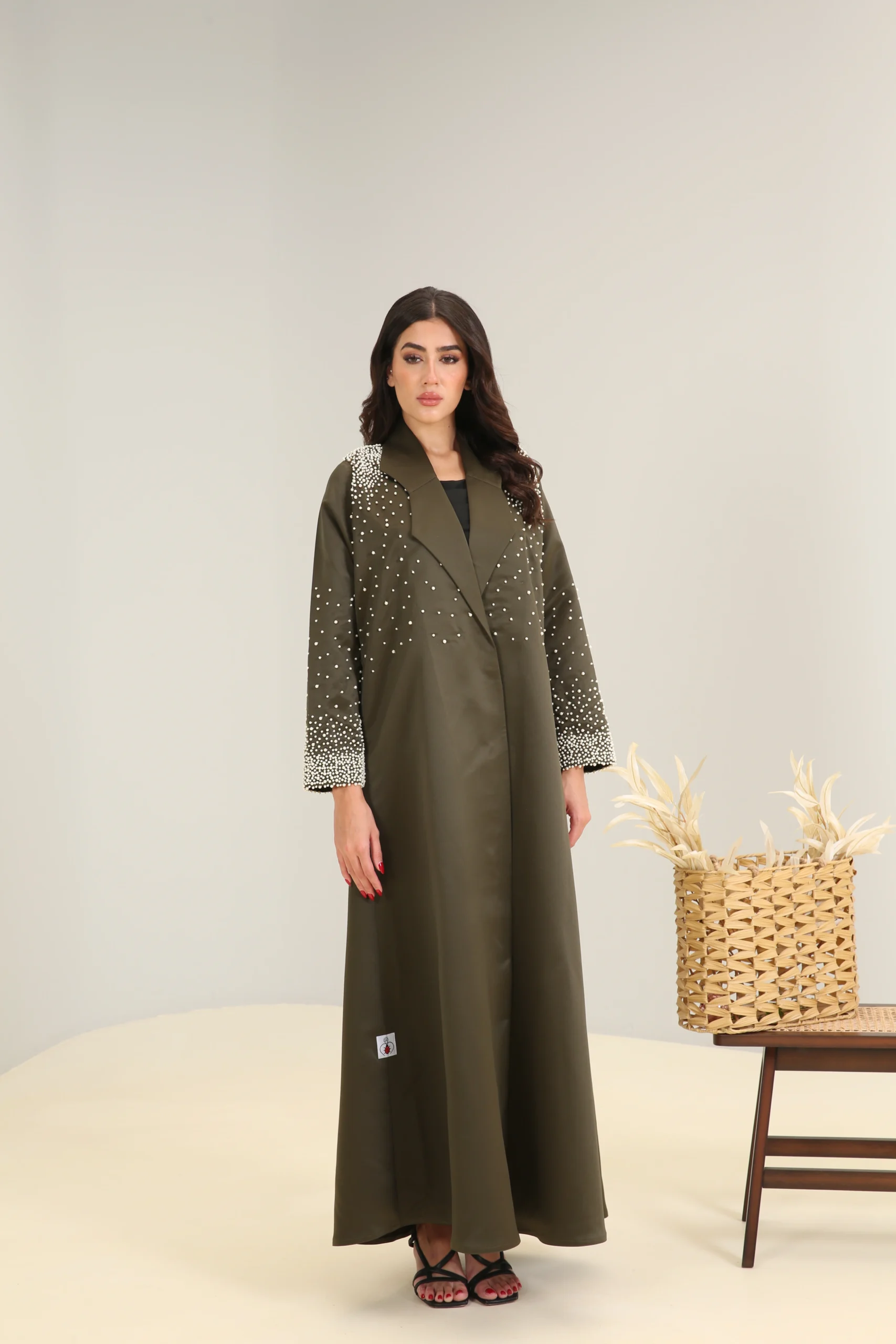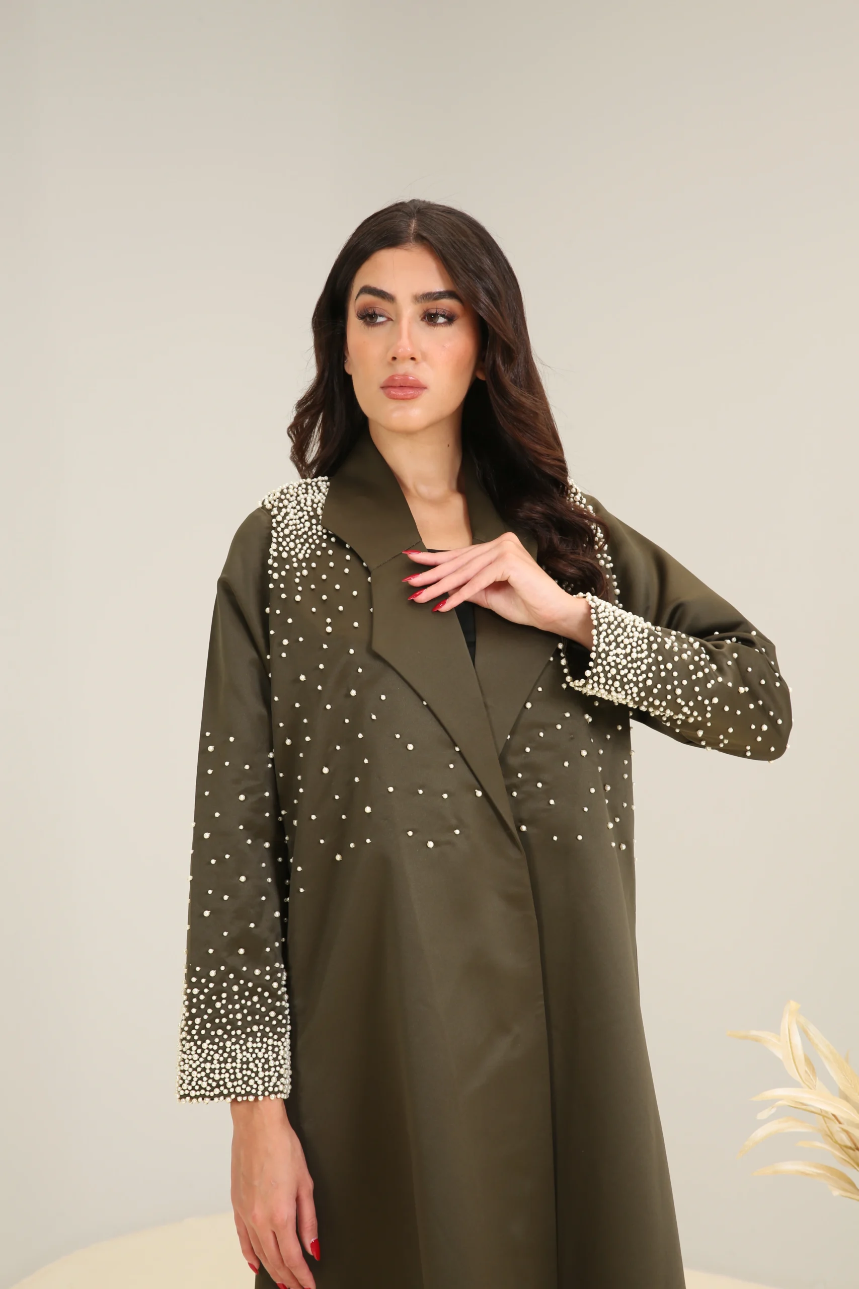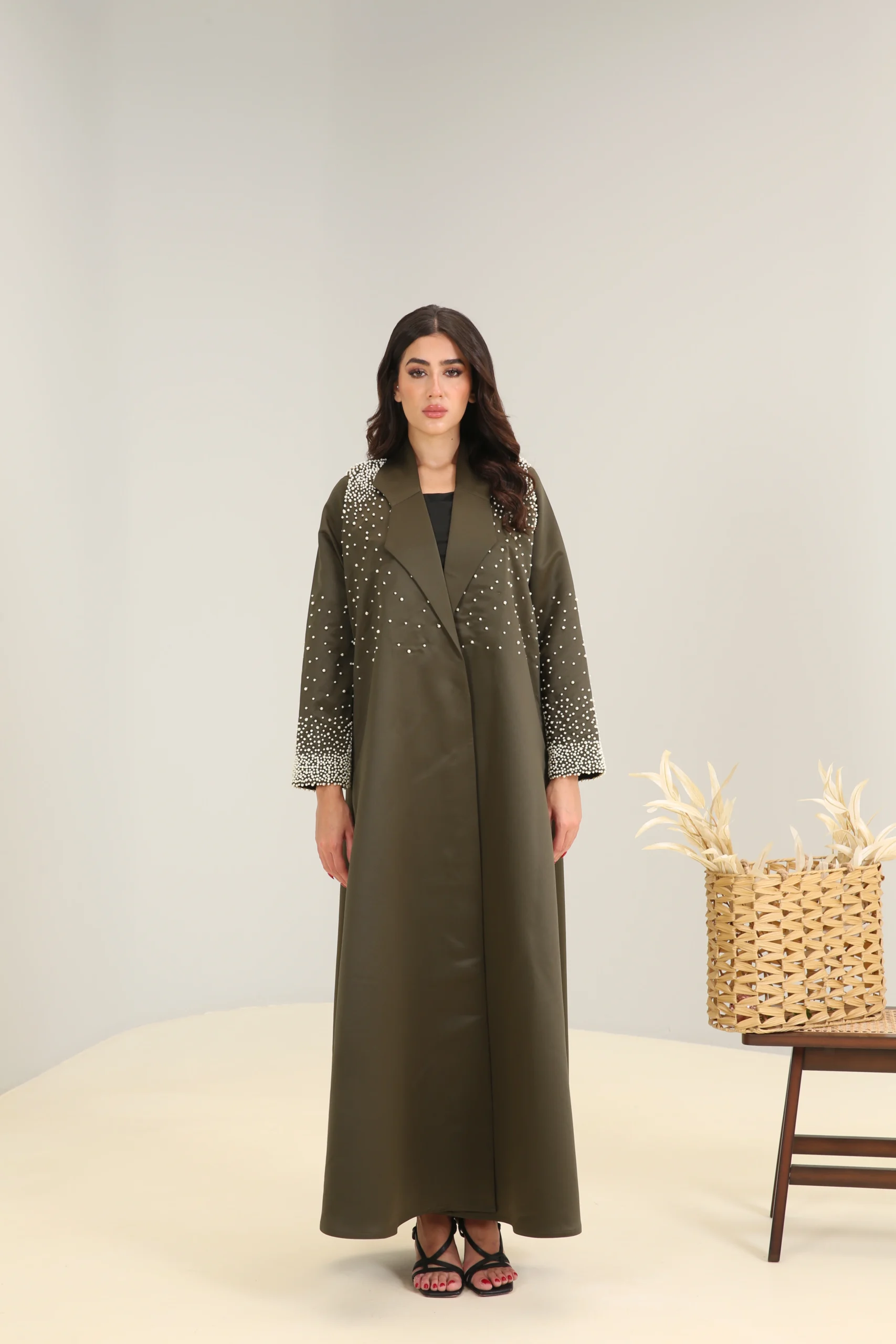 The Olive Starfall Abaya is a luxurious piece that radiates modern glamour. Crafted in a rich olive-green fabric with a subtle sheen, it combines classic style with captivating detail. The shoulders and sleeves are adorned with a magnificent pattern of scattered beading and sequins that gently fall down the garment like a cascade of stars. This luminous detail adds a touch of opulent sparkle to the rich, earthy tone.
