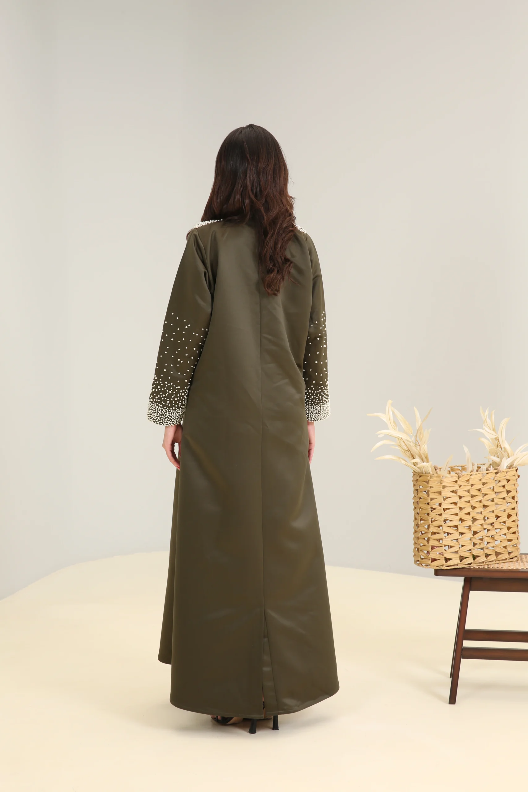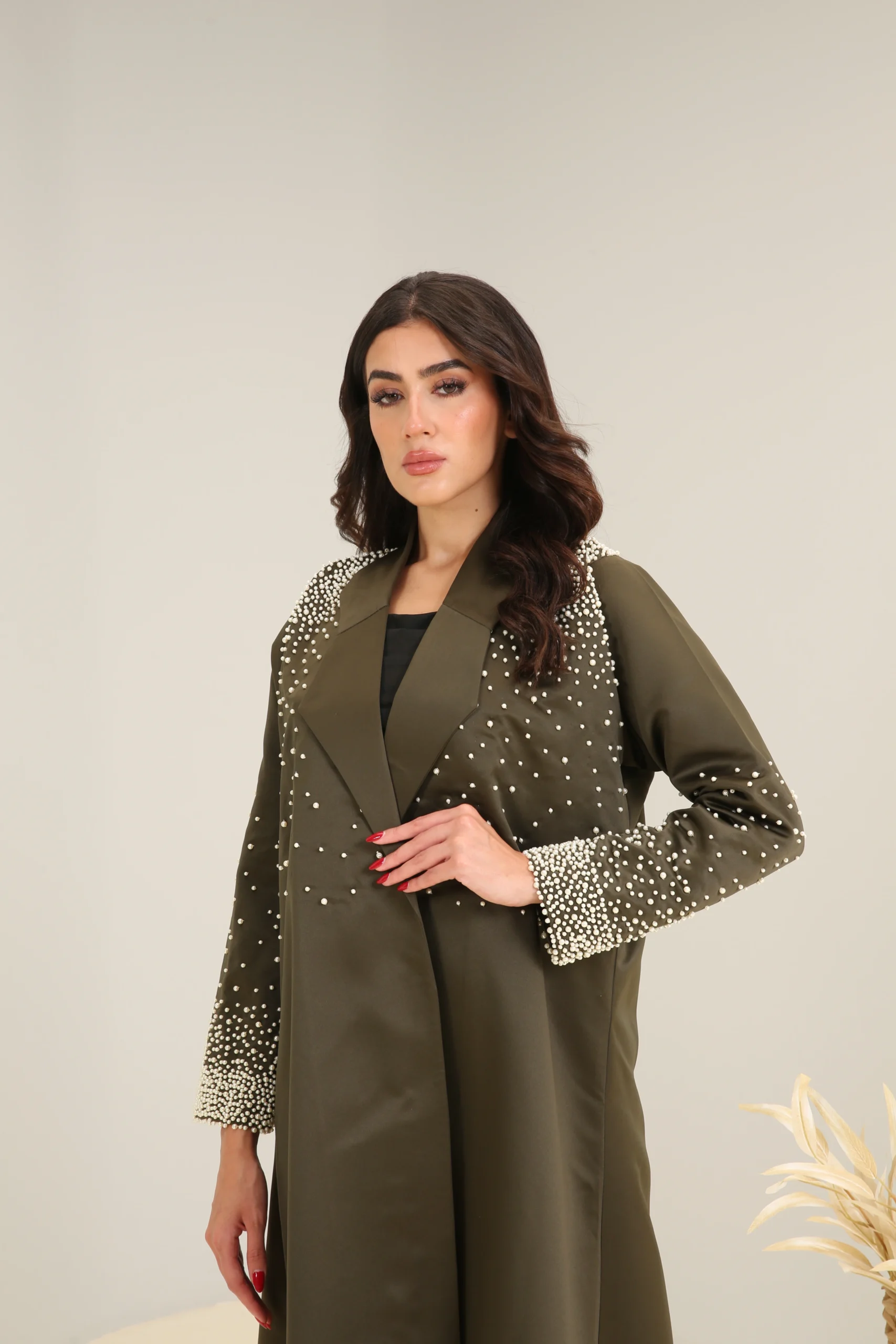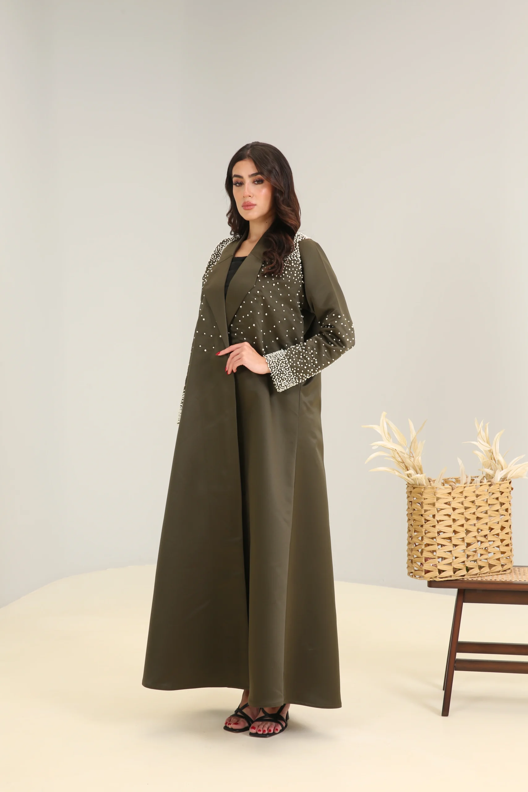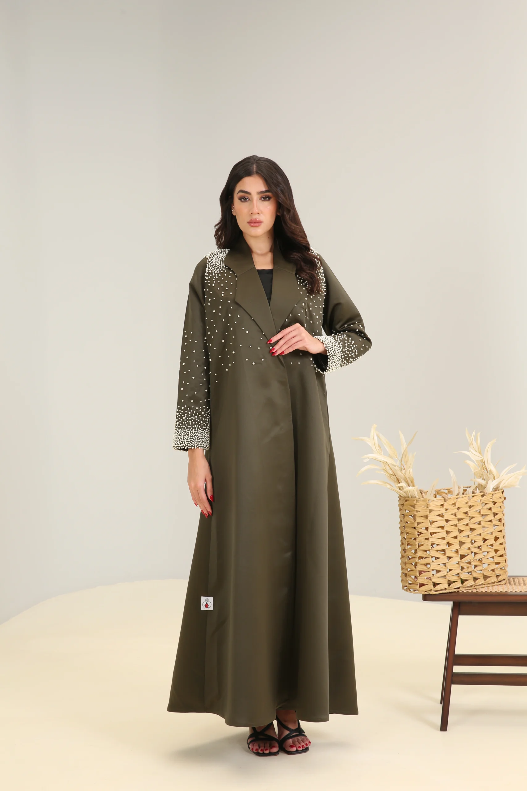The Olive Starfall Abaya is a luxurious piece that radiates modern glamour. Crafted in a rich olive-green fabric with a subtle sheen, it combines classic style with captivating detail. The shoulders and sleeves are adorned with a magnificent pattern of scattered beading and sequins that gently fall down the garment like a cascade of stars. This luminous detail adds a touch of opulent sparkle to the rich, earthy tone.