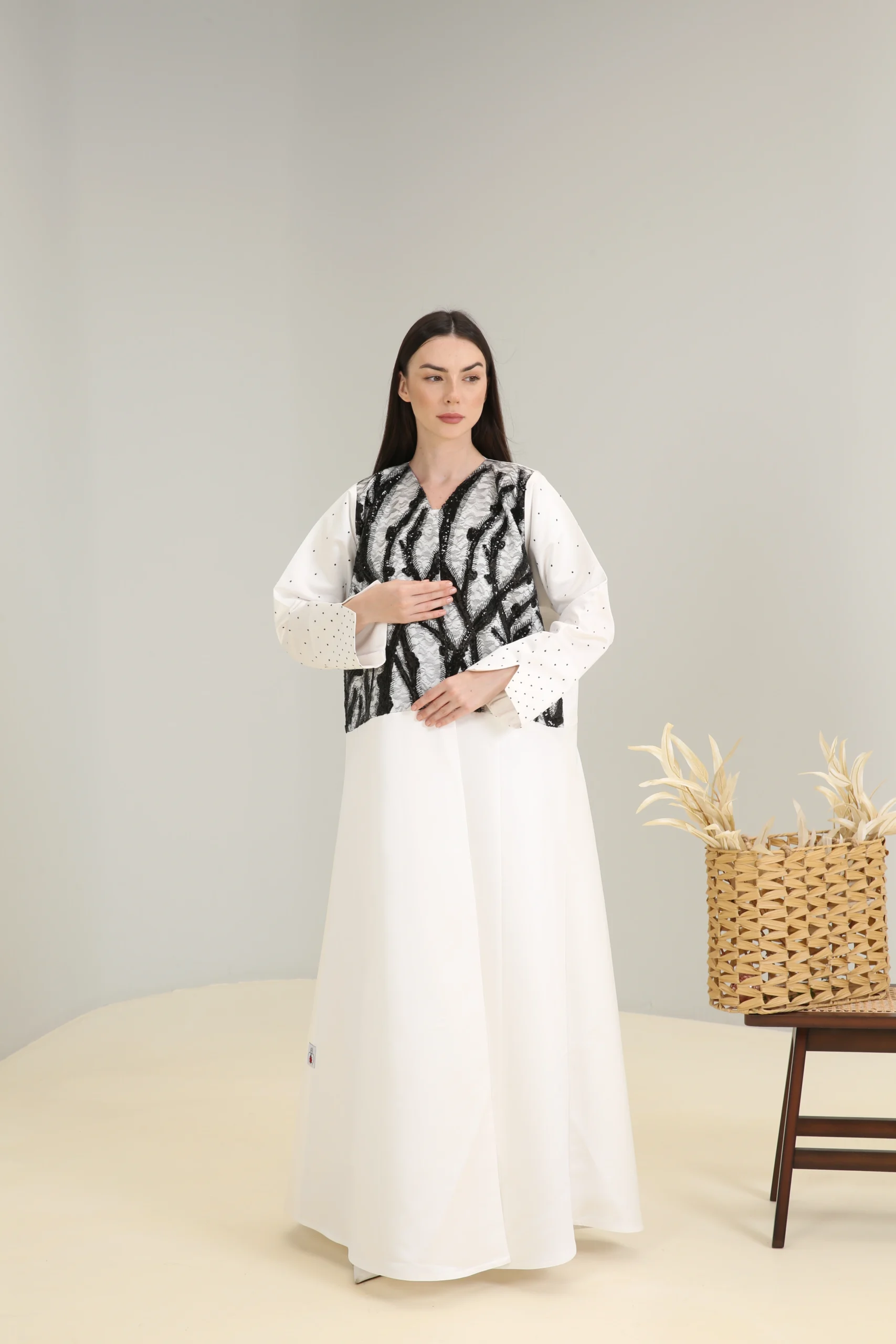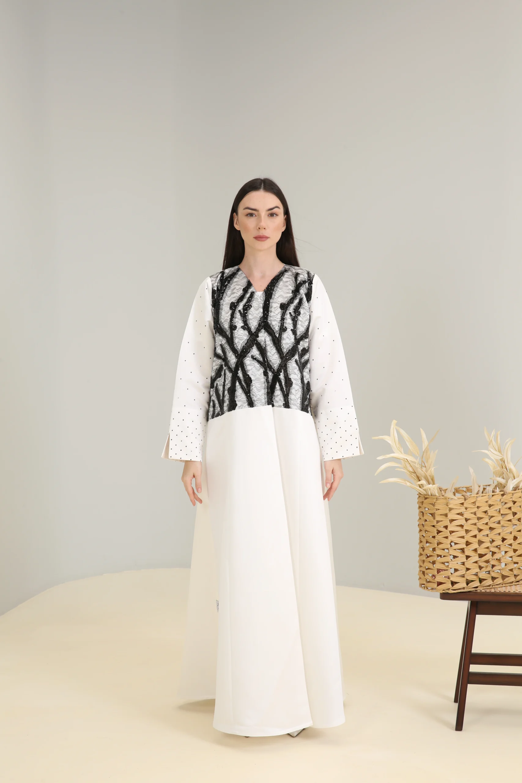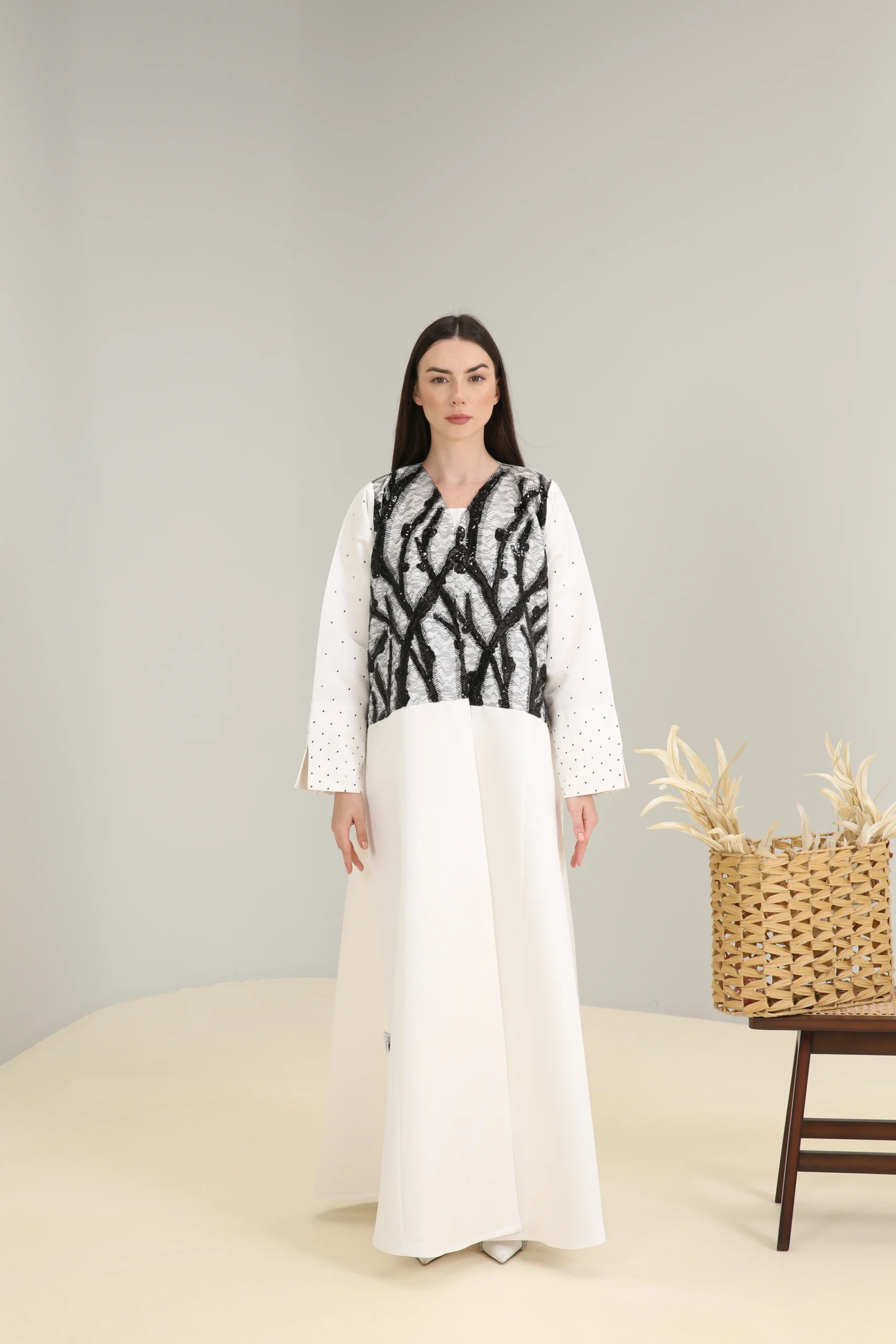 An abaya that reflects an appreciation for modern design and bold contrasts, perfect for the woman who chooses to make a statement with her unique style.