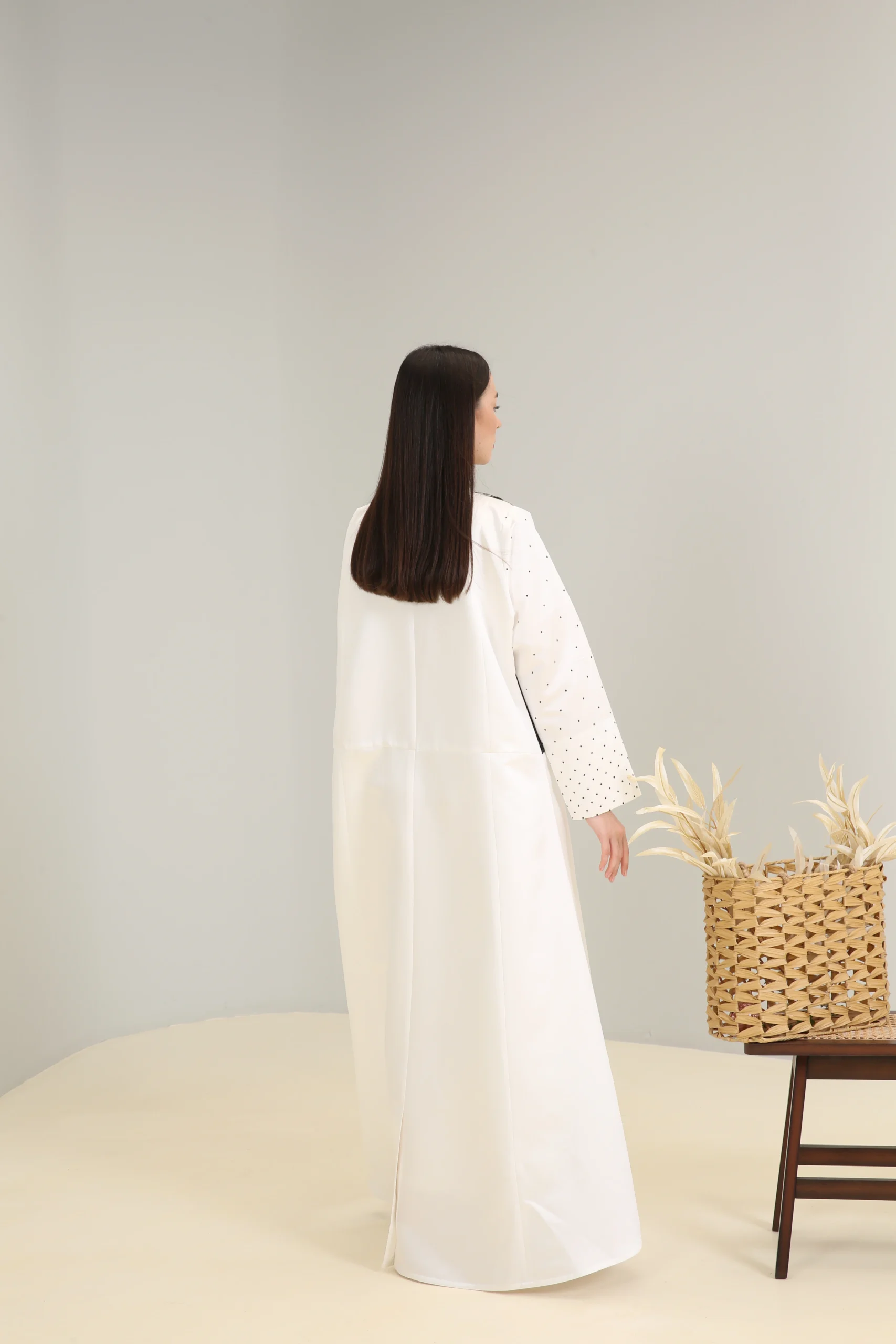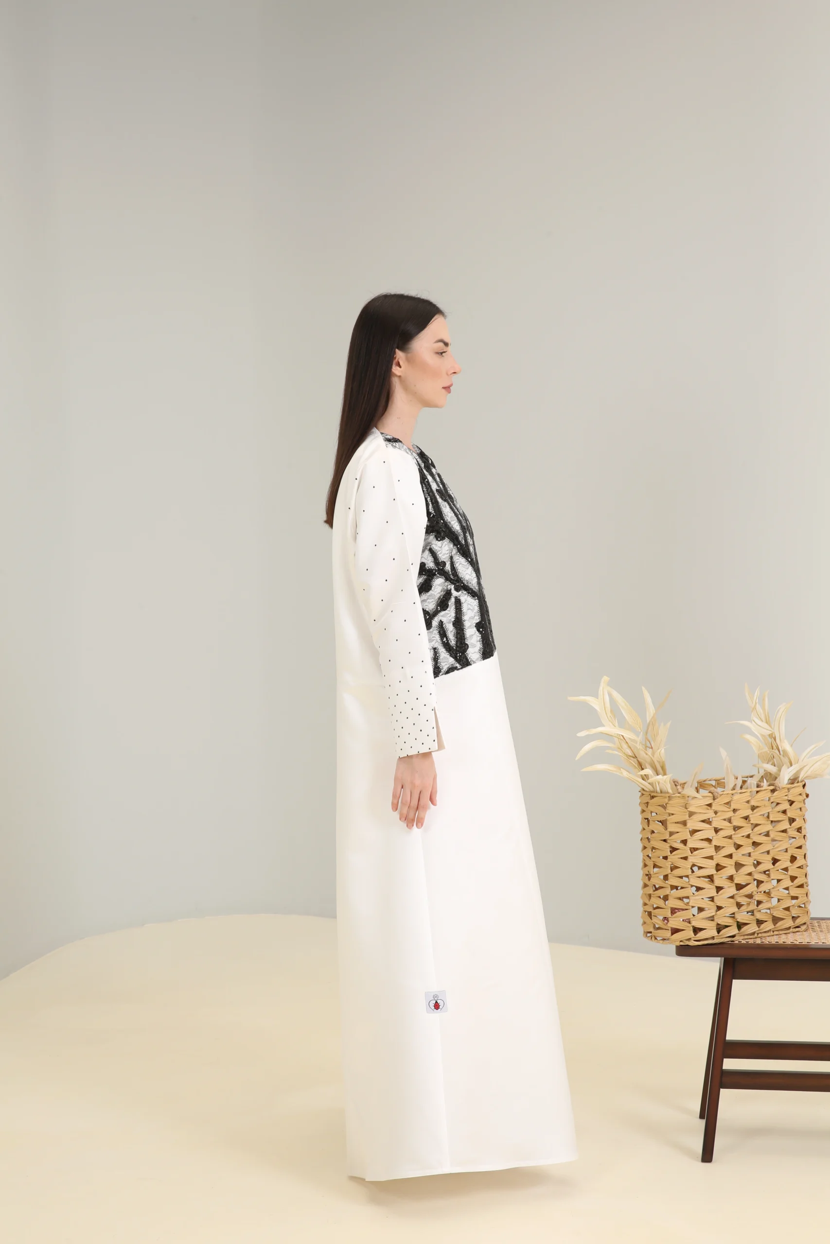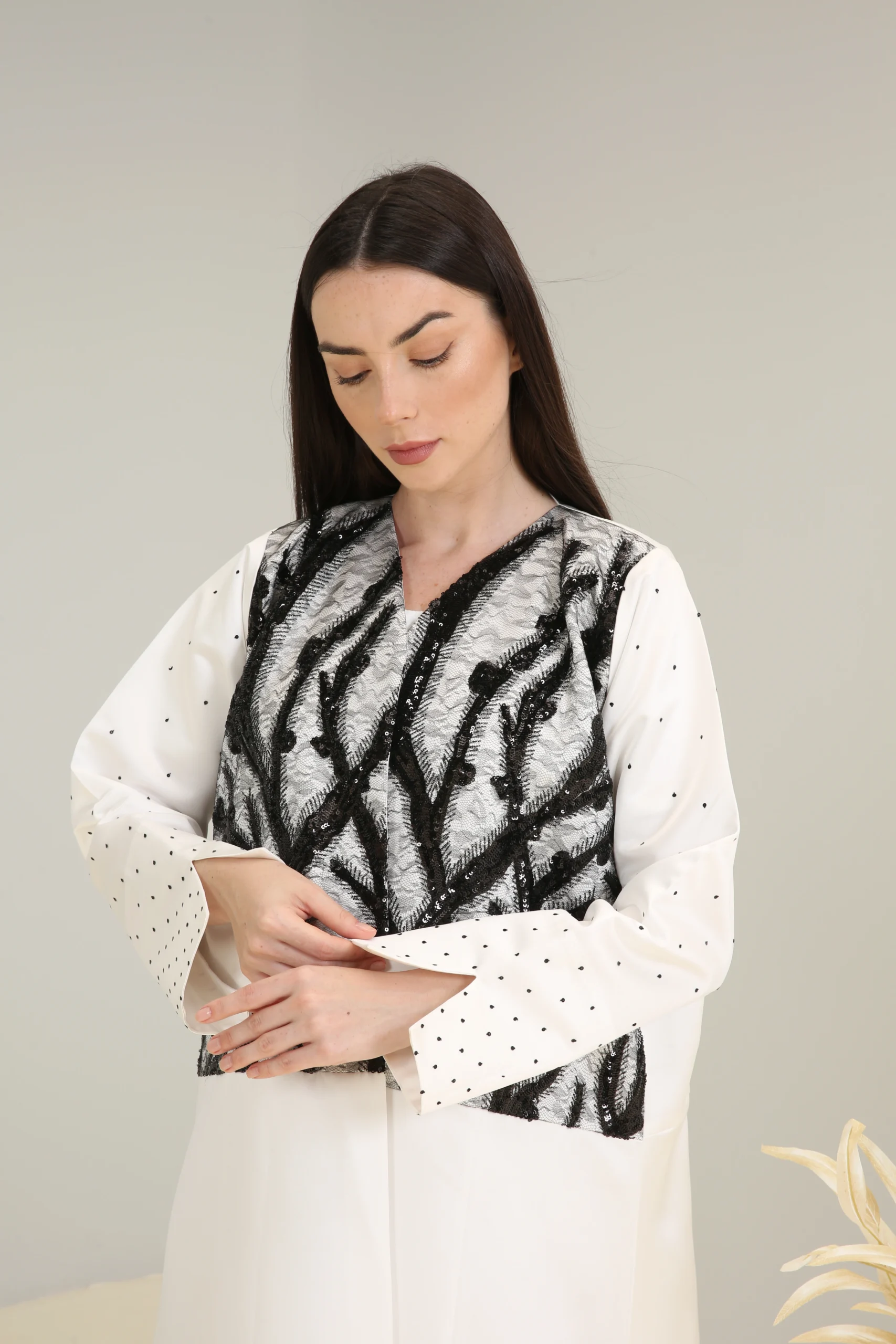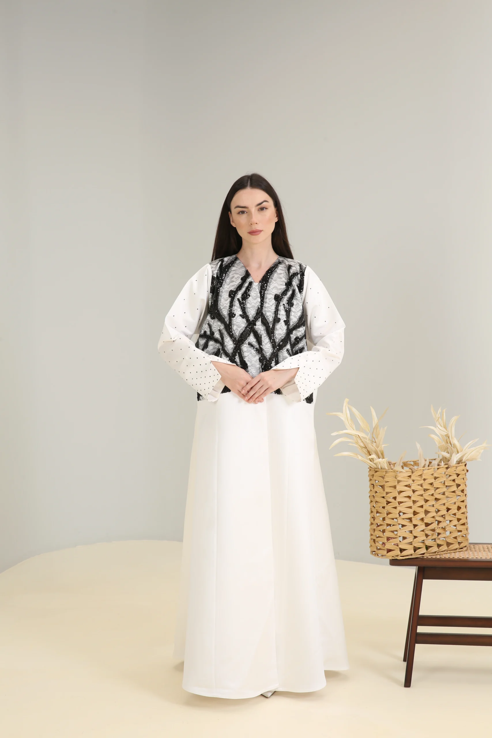An abaya that reflects an appreciation for modern design and bold contrasts, perfect for the woman who chooses to make a statement with her unique style.
