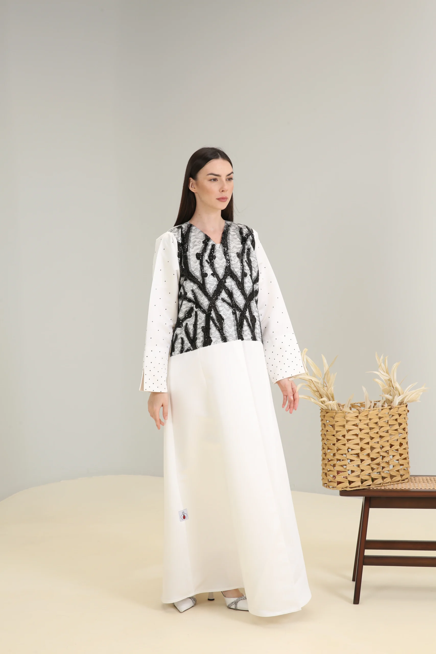 The Monochrome Elegance Abaya is a striking piece that combines classic grace with bold, modern design. The pristine white body creates a clean, sophisticated canvas for the dramatic upper panel. This panel is adorned with intricate, abstract embroidery in a rich black, accented with shimmering silver details that add a touch of glamour and texture. The stark contrast of black on white gives this abaya a powerful, artistic feel.
