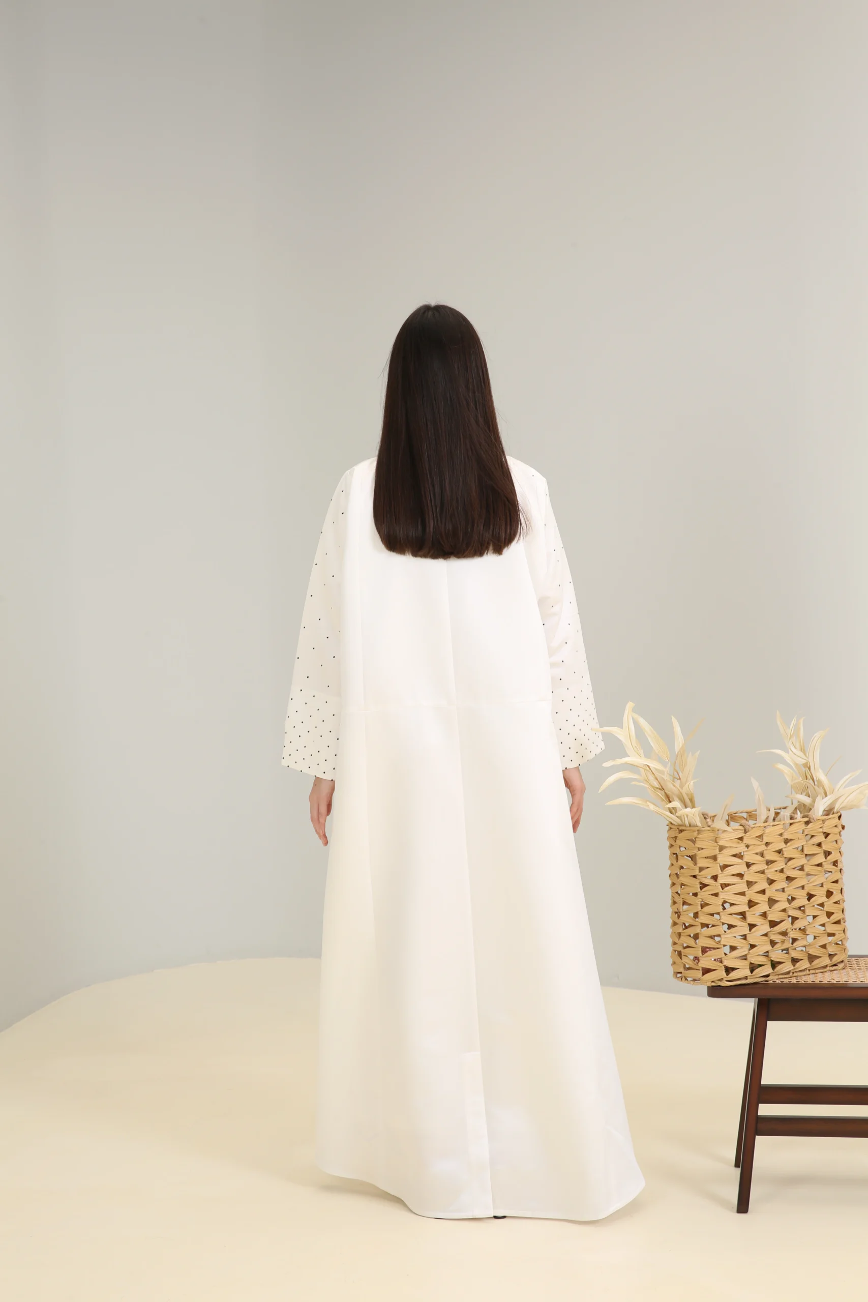 Designed with a flowing silhouette, this abaya drapes beautifully, providing both comfort and a captivating presence. The wide sleeves are finished with a subtle, dotted detail that mirrors the sparkling embroidery on the chest. This is a perfect garment for the woman who desires a contemporary look with a touch of timeless elegance, making a statement without saying a word.