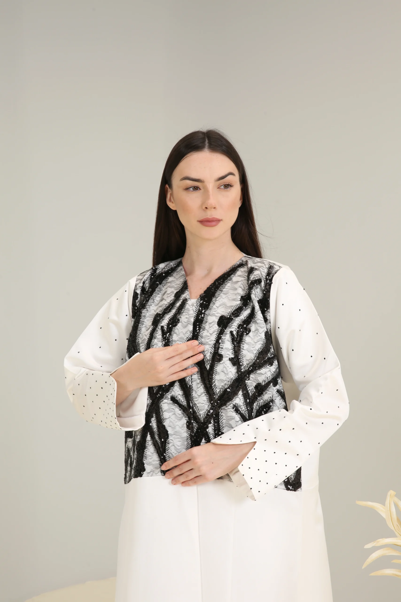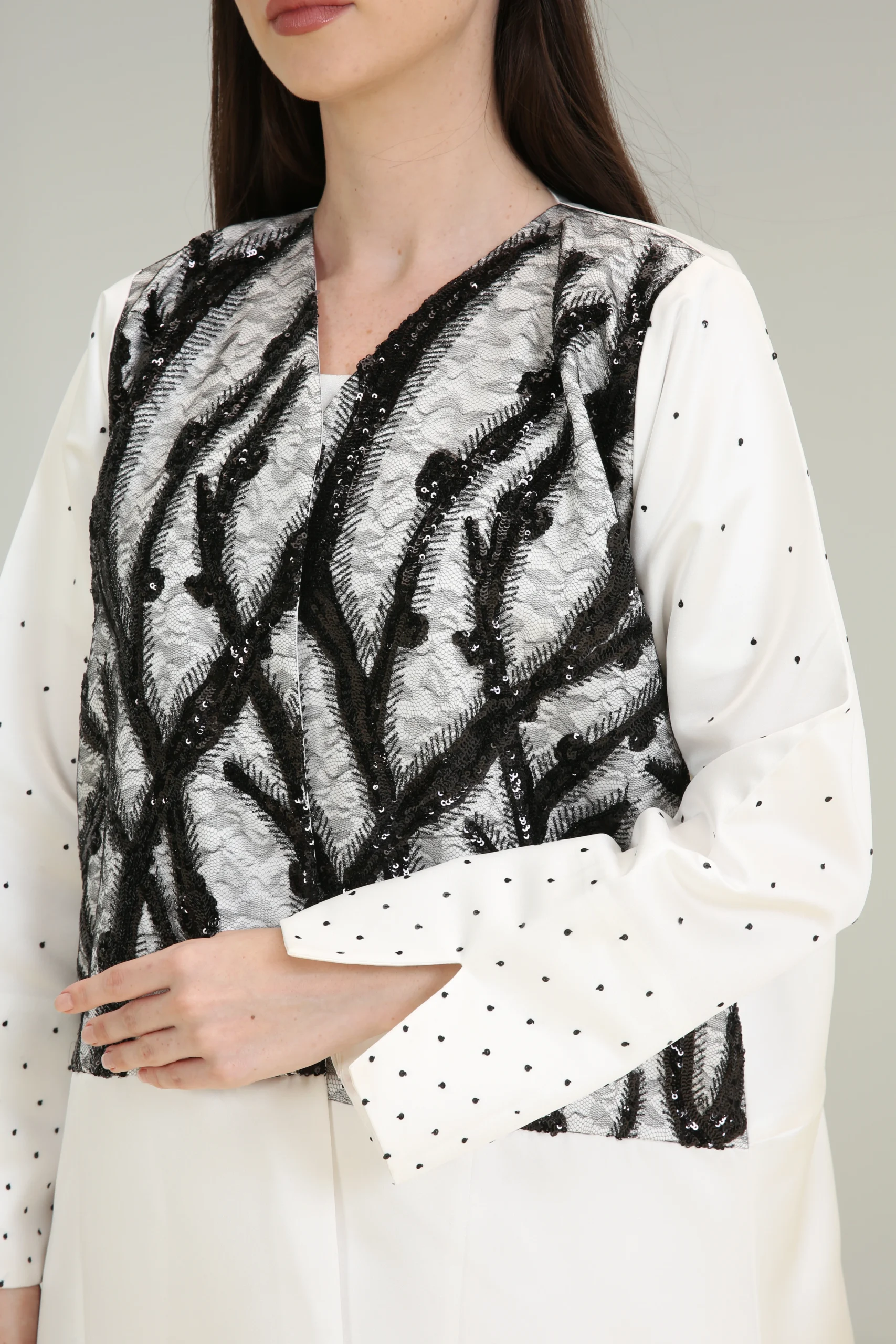 - Details: Intricate black and silver embroidery on the chest; subtle dotted pattern on the sleeves