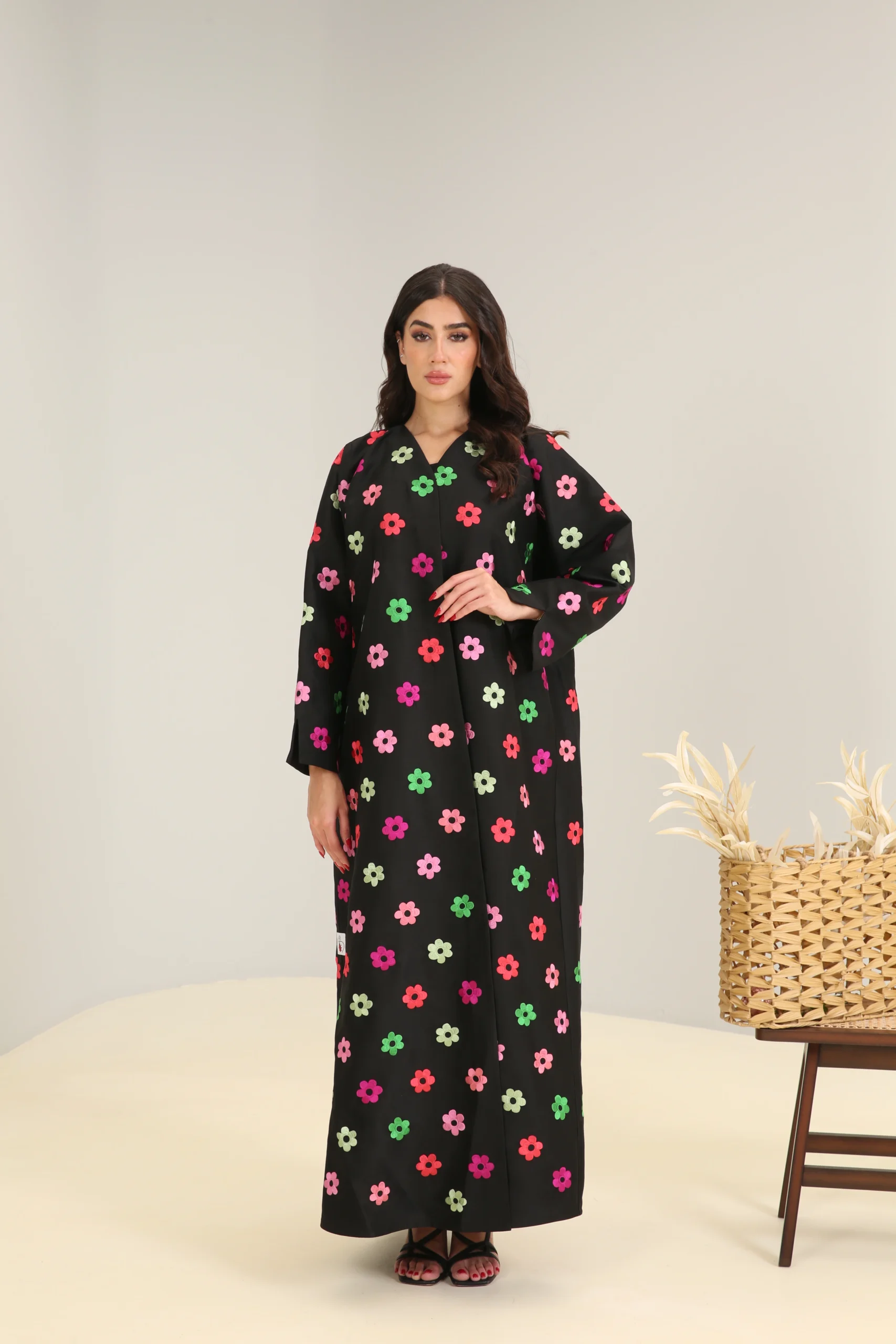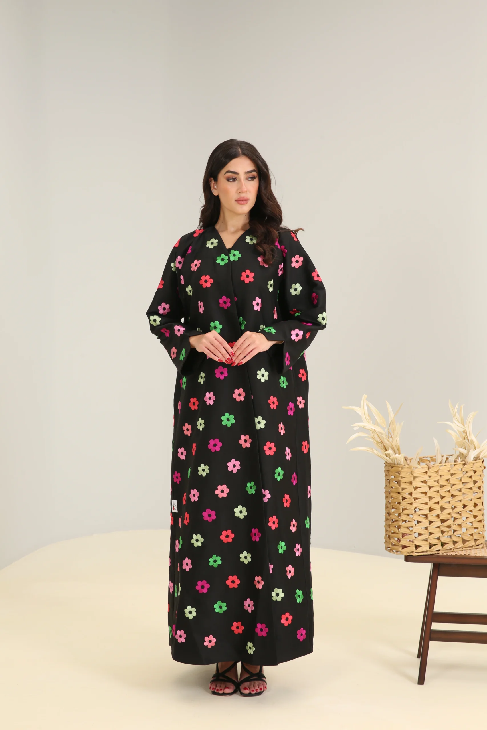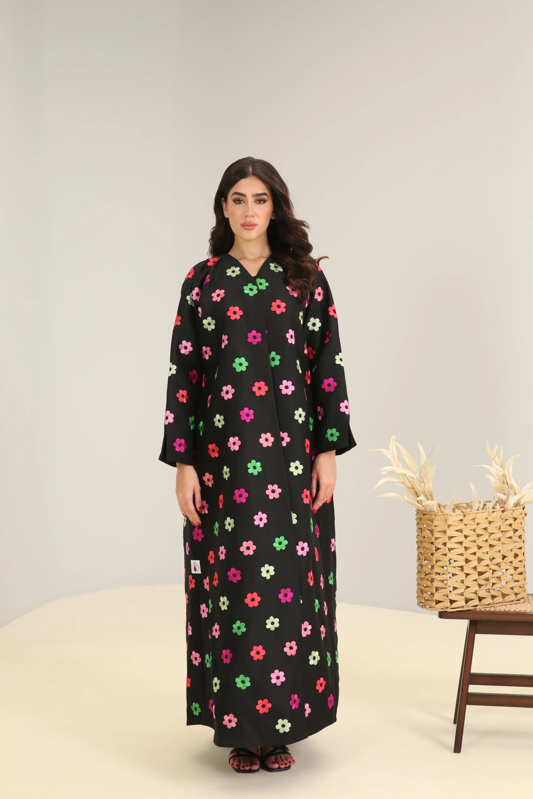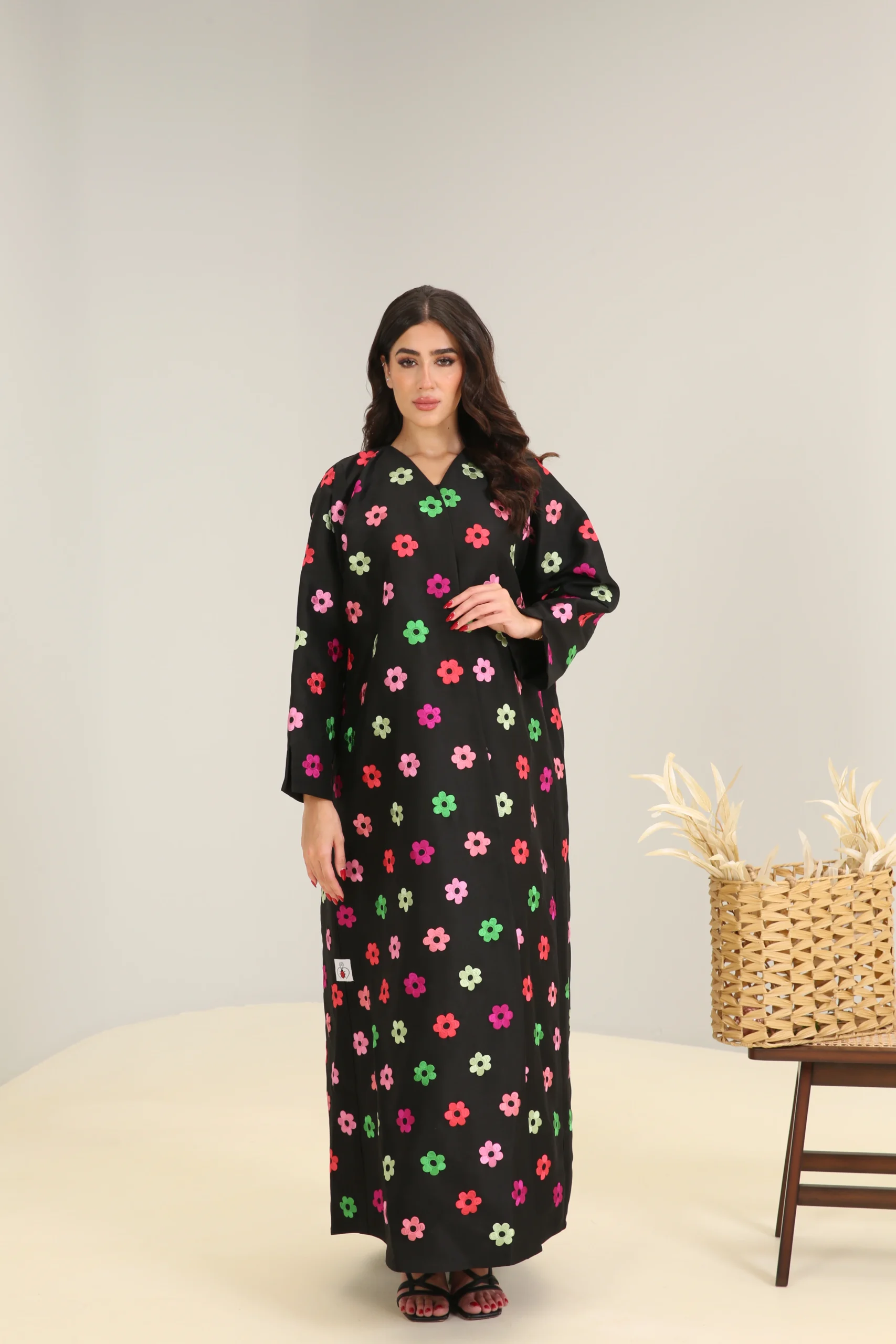 This jalabiya features a relaxed, flowing cut that drapes gracefully for a comfortable and effortless fit. The simple V-neckline and long, wide sleeves ensure a timeless silhouette, while the fun floral pattern makes it a perfect choice for those who love to add a pop of color and personality to their style. This is a garment that beautifully balances classic comfort with a cheerful and modern aesthetic.