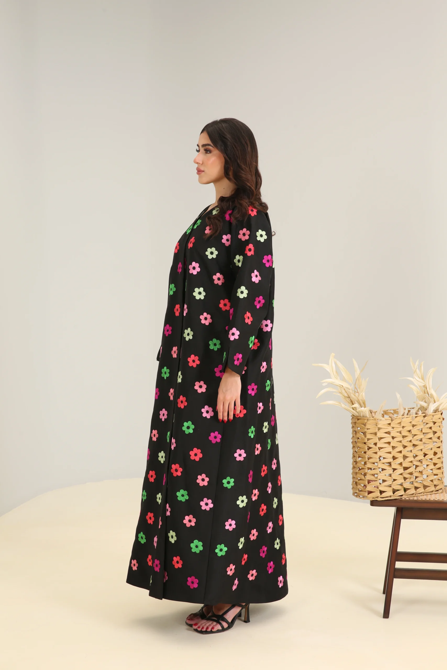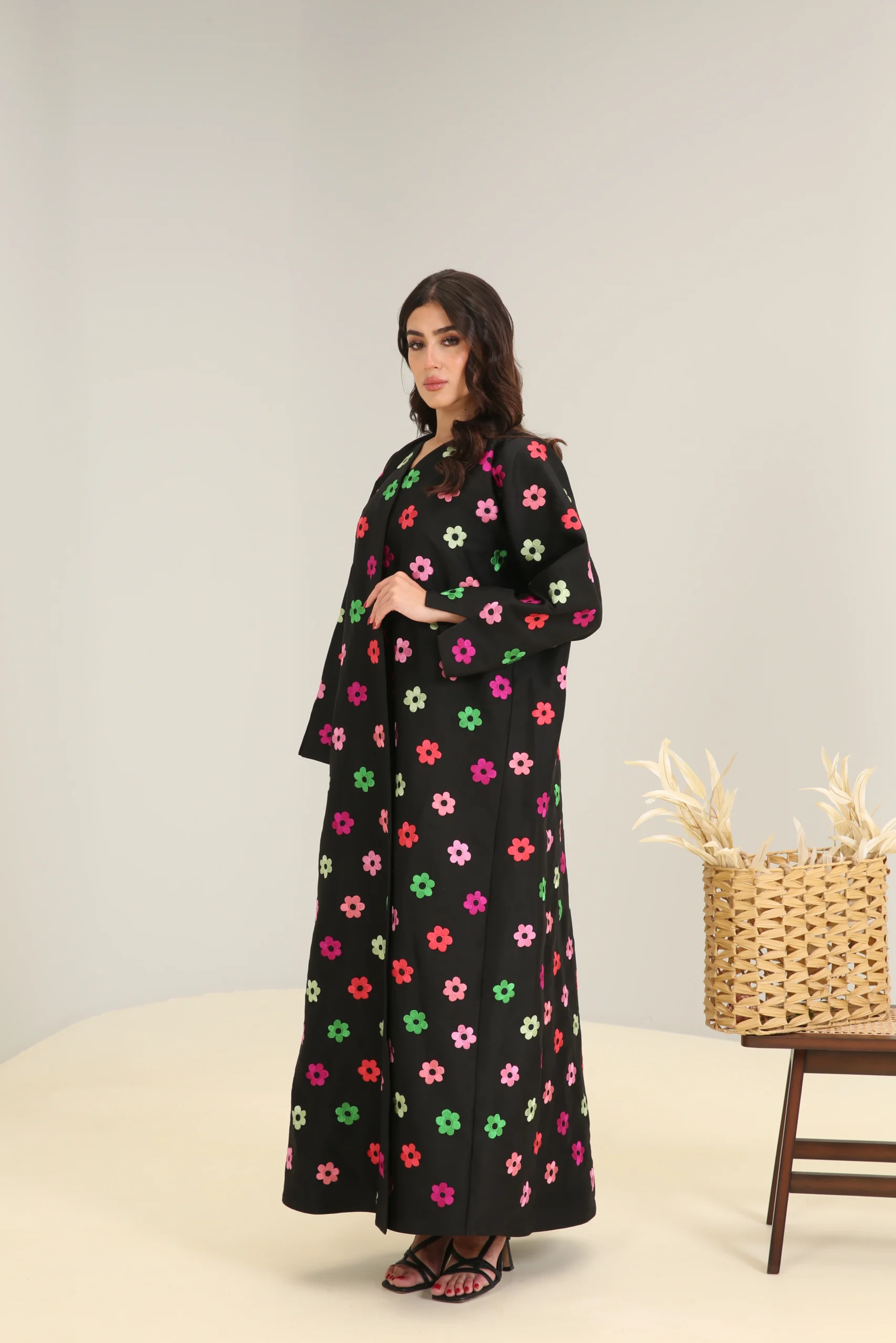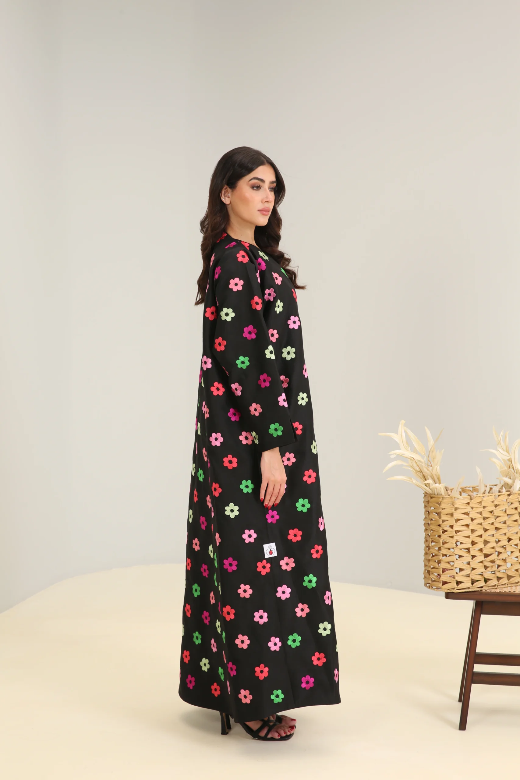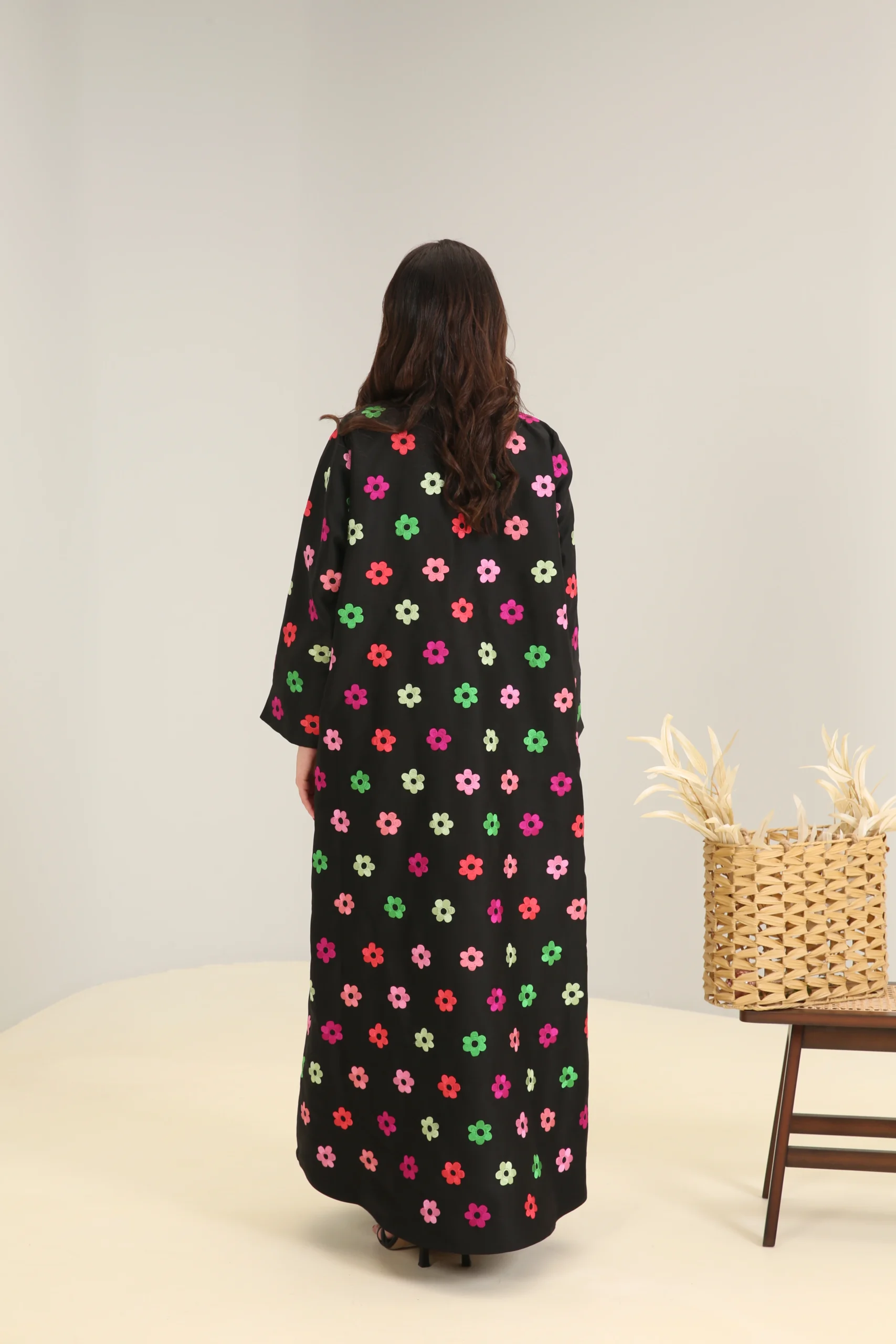 This jalabiya features a relaxed, flowing cut that drapes gracefully for a comfortable and effortless fit. The simple V-neckline and long, wide sleeves ensure a timeless silhouette, while the fun floral pattern makes it a perfect choice for those who love to add a pop of color and personality to their style. This is a garment that beautifully balances classic comfort with a cheerful and modern aesthetic.