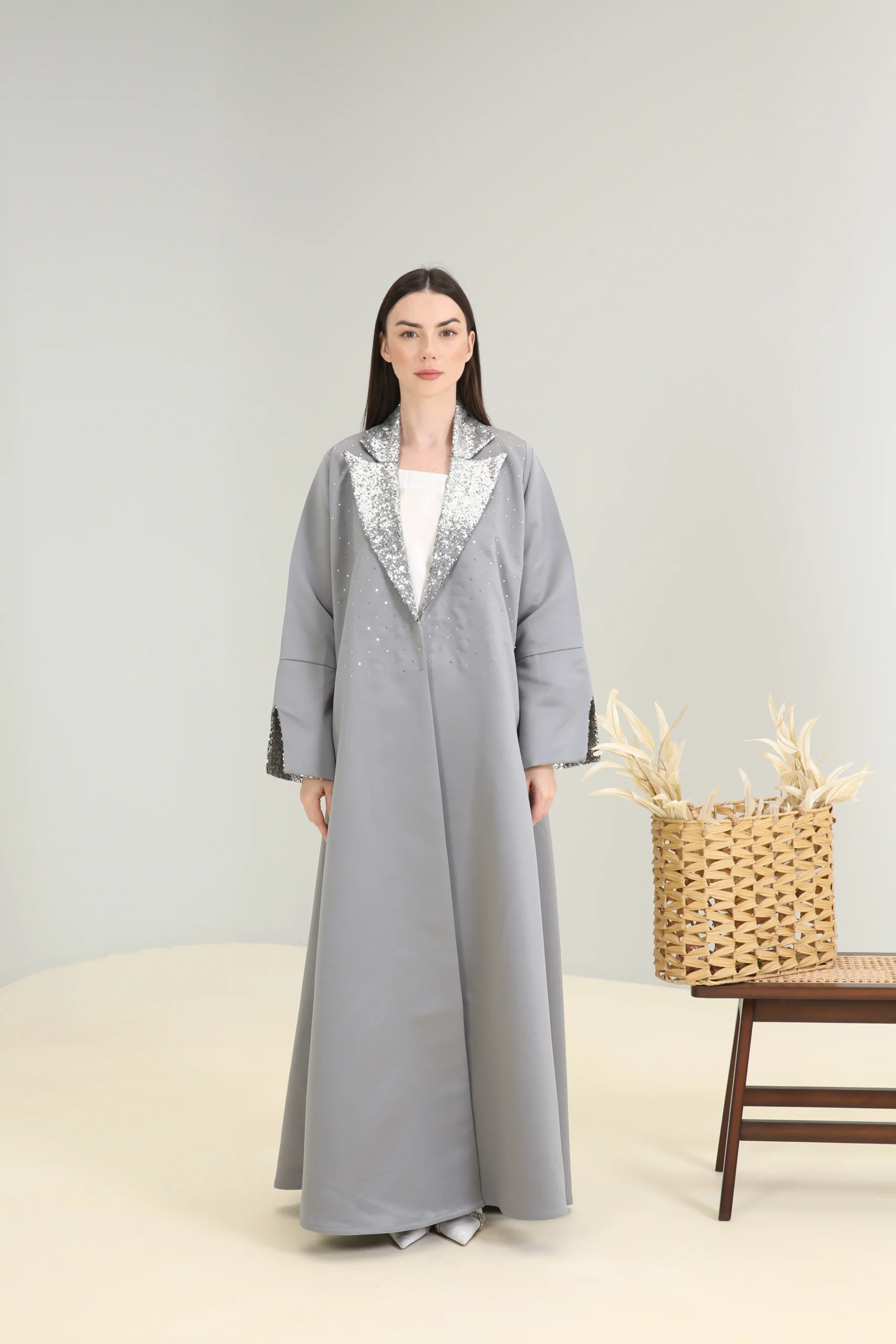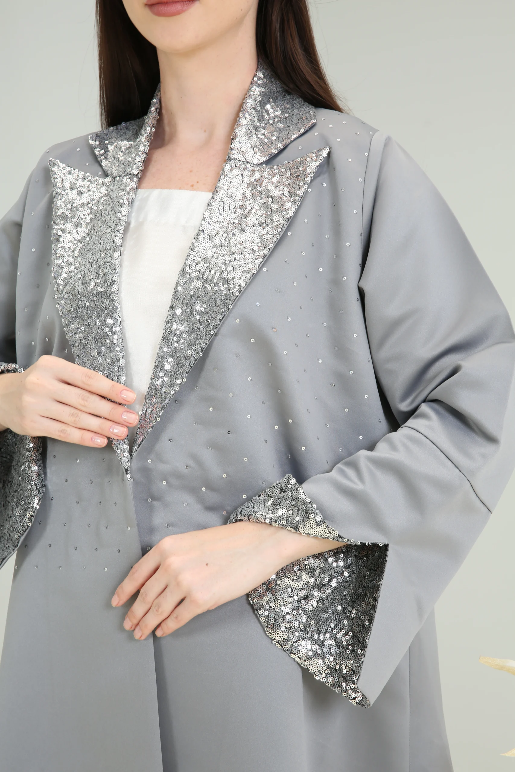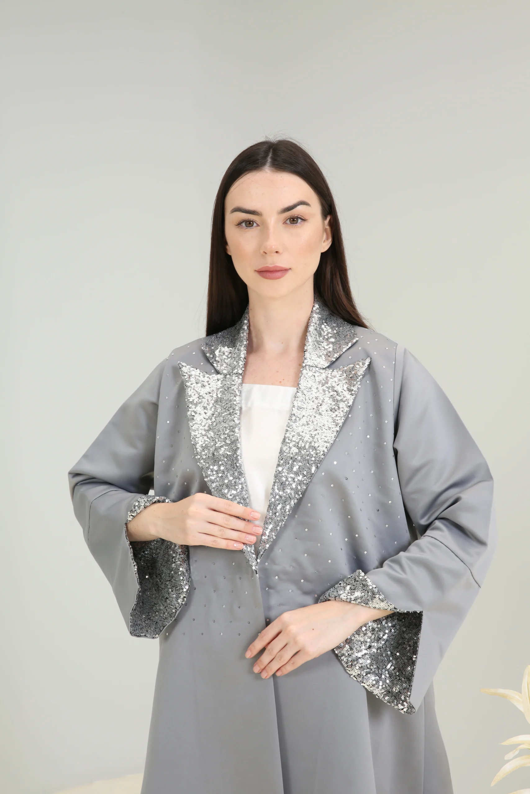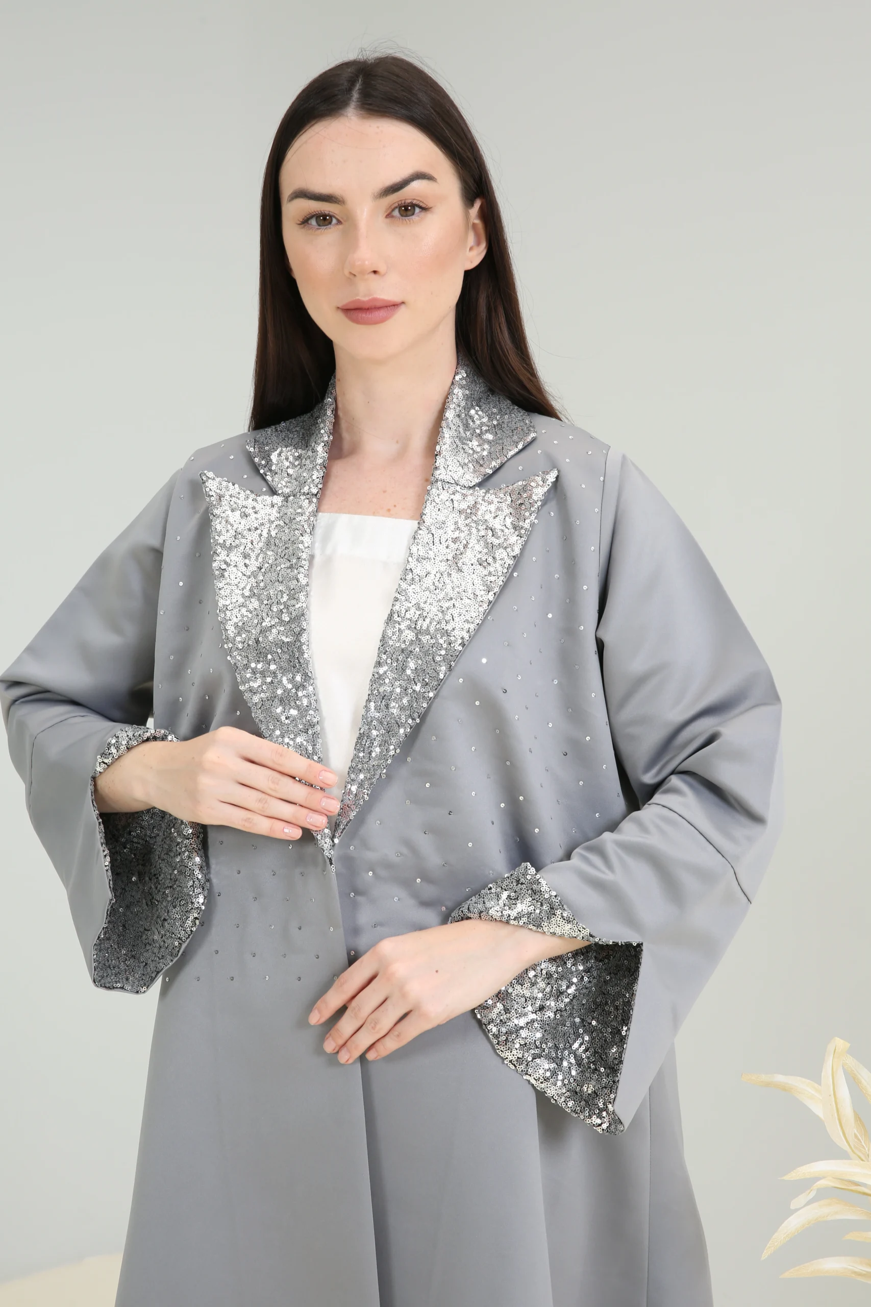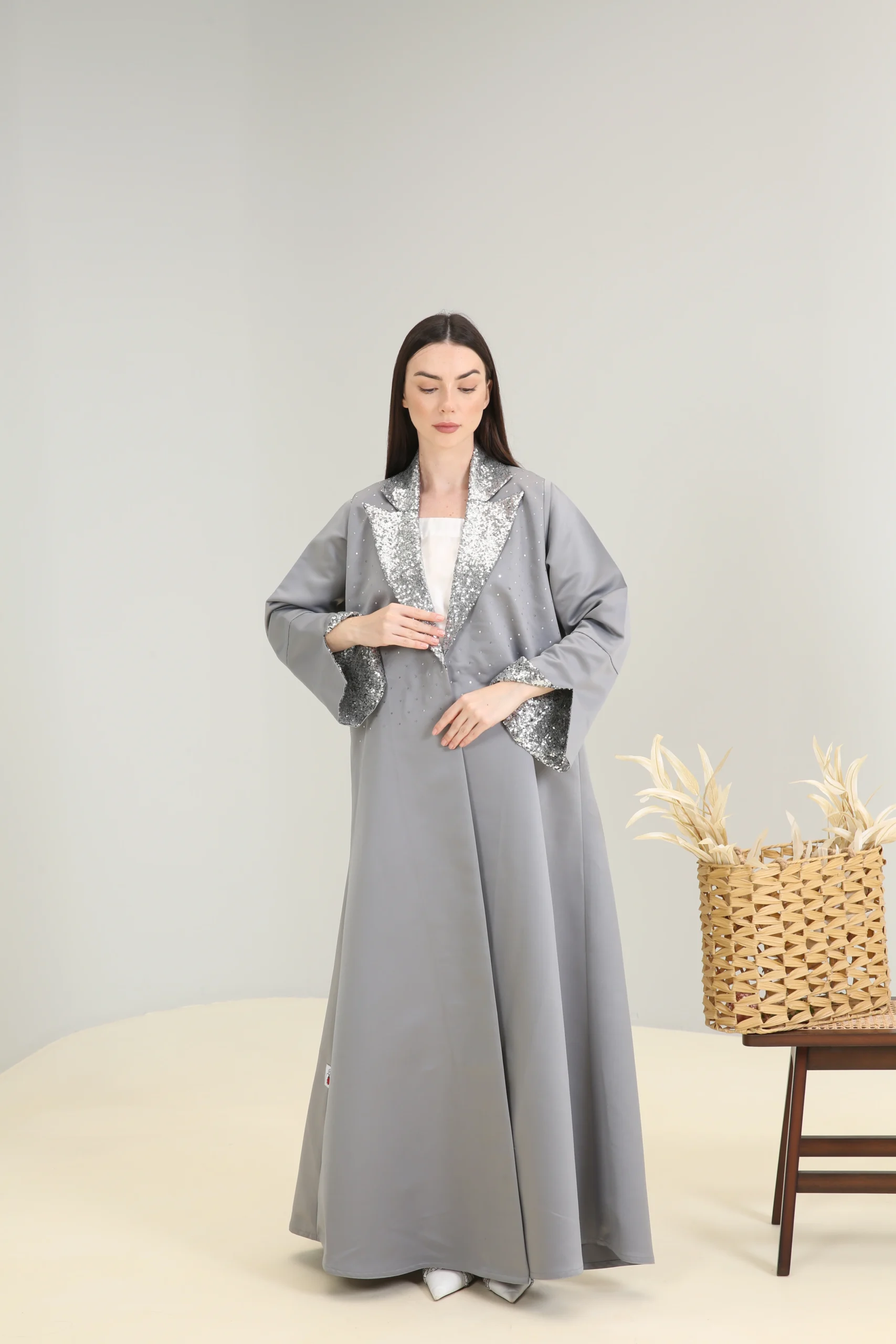 The Sterling Shimmer Abaya is a vision of contemporary elegance, crafted in a chic, mid-tone gray fabric with a smooth, luxurious finish. This sophisticated piece features a striking, wide lapel collar and cuffs adorned with a cascade of shimmering silver sequins and beads, creating a magnificent sparkle that perfectly contrasts the muted gray. It’s designed for the woman who appreciates a blend of classic tailoring and modern, dazzling details.