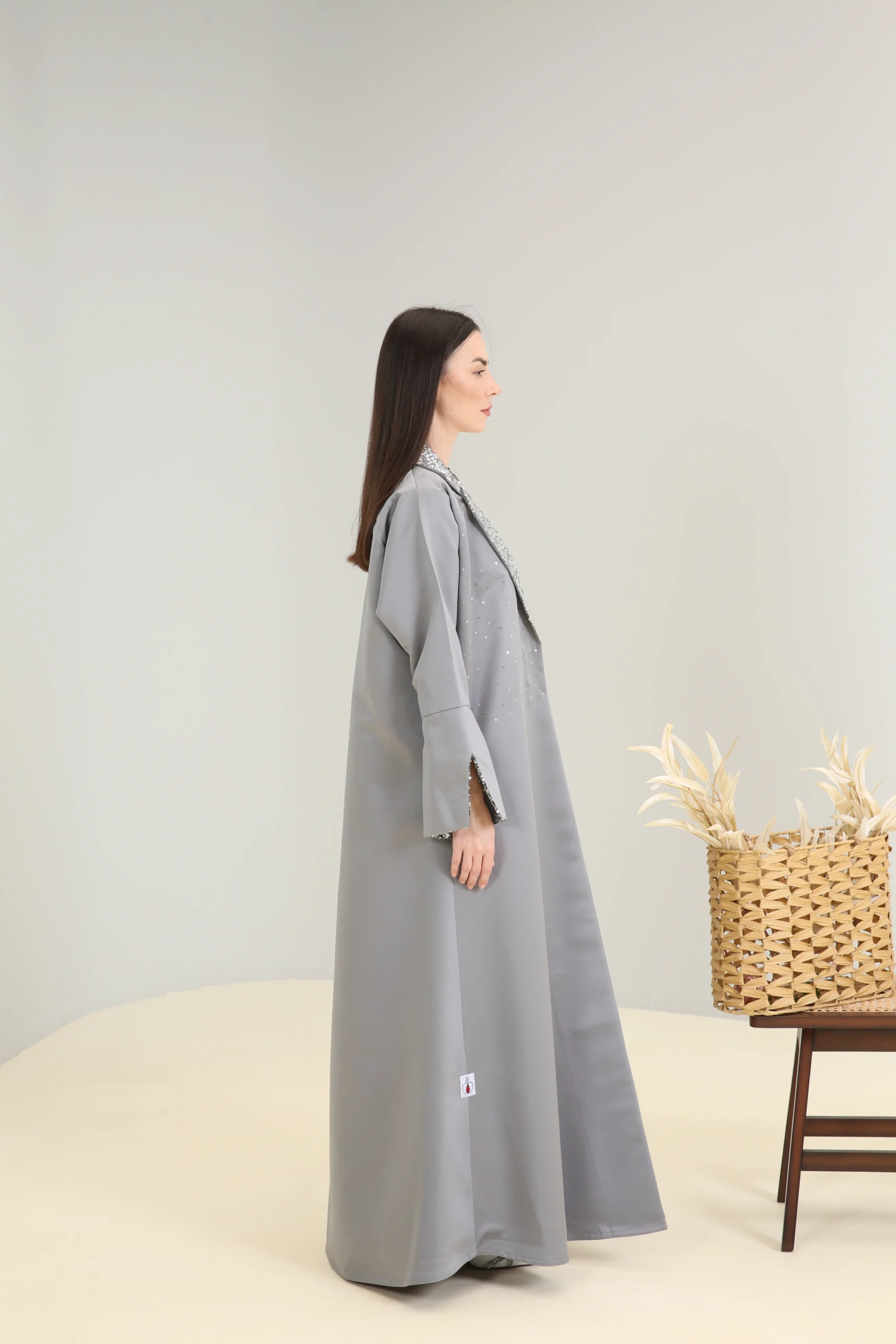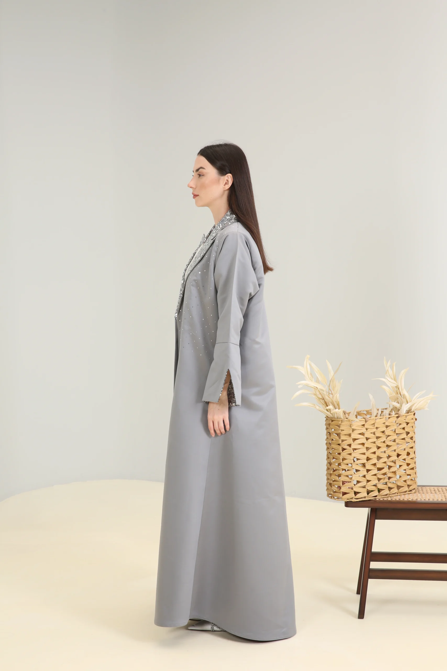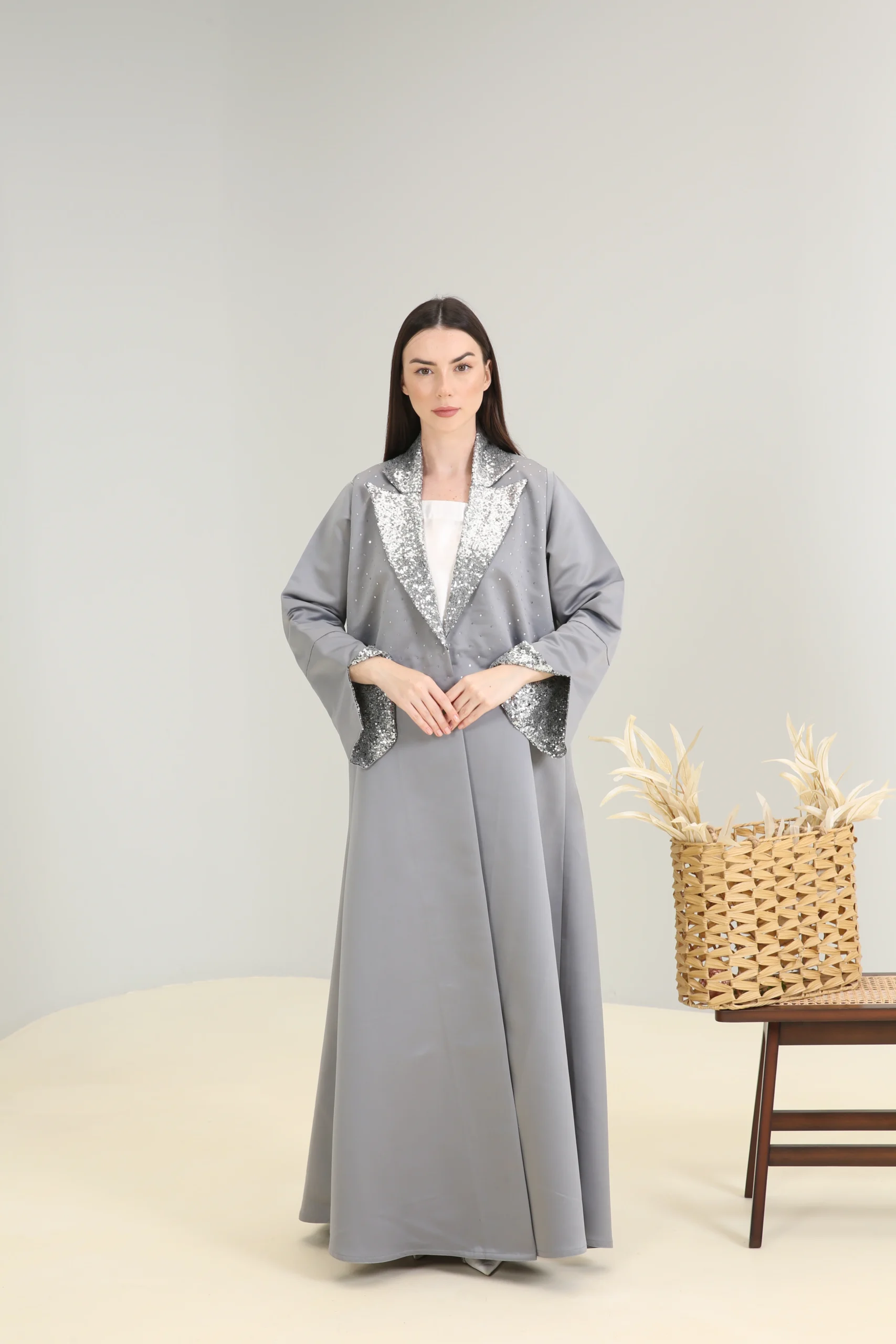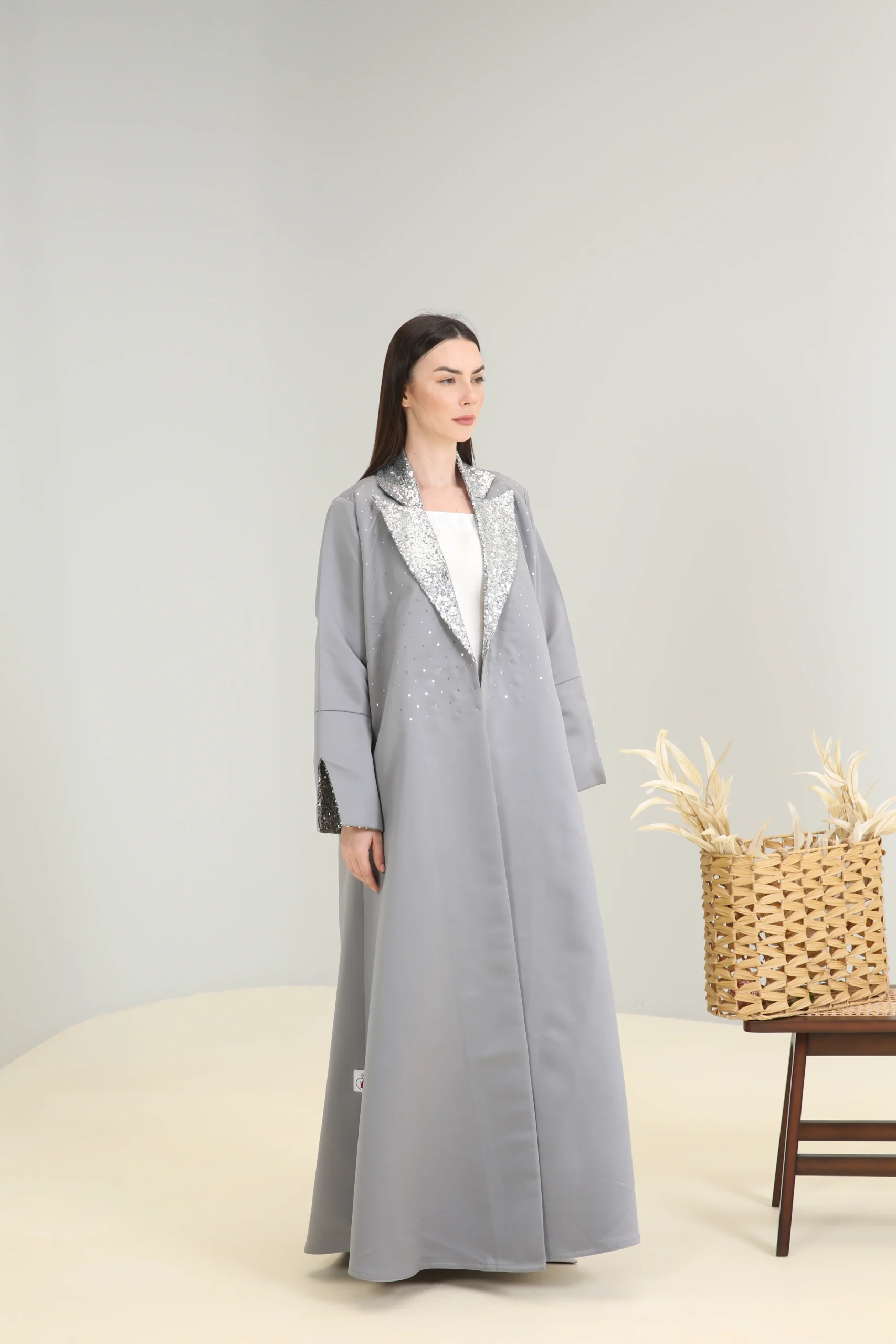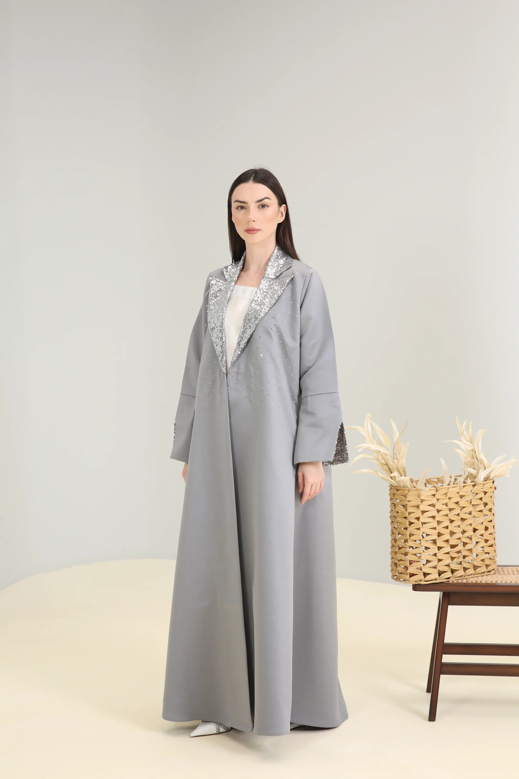 The Sterling Shimmer Abaya is a vision of contemporary elegance, crafted in a chic, mid-tone gray fabric with a smooth, luxurious finish. This sophisticated piece features a striking, wide lapel collar and cuffs adorned with a cascade of shimmering silver sequins and beads, creating a magnificent sparkle that perfectly contrasts the muted gray. It’s designed for the woman who appreciates a blend of classic tailoring and modern, dazzling details.