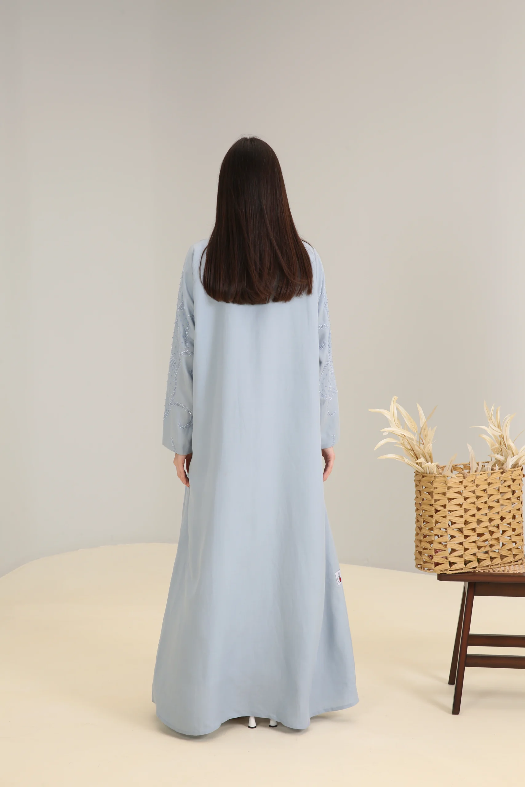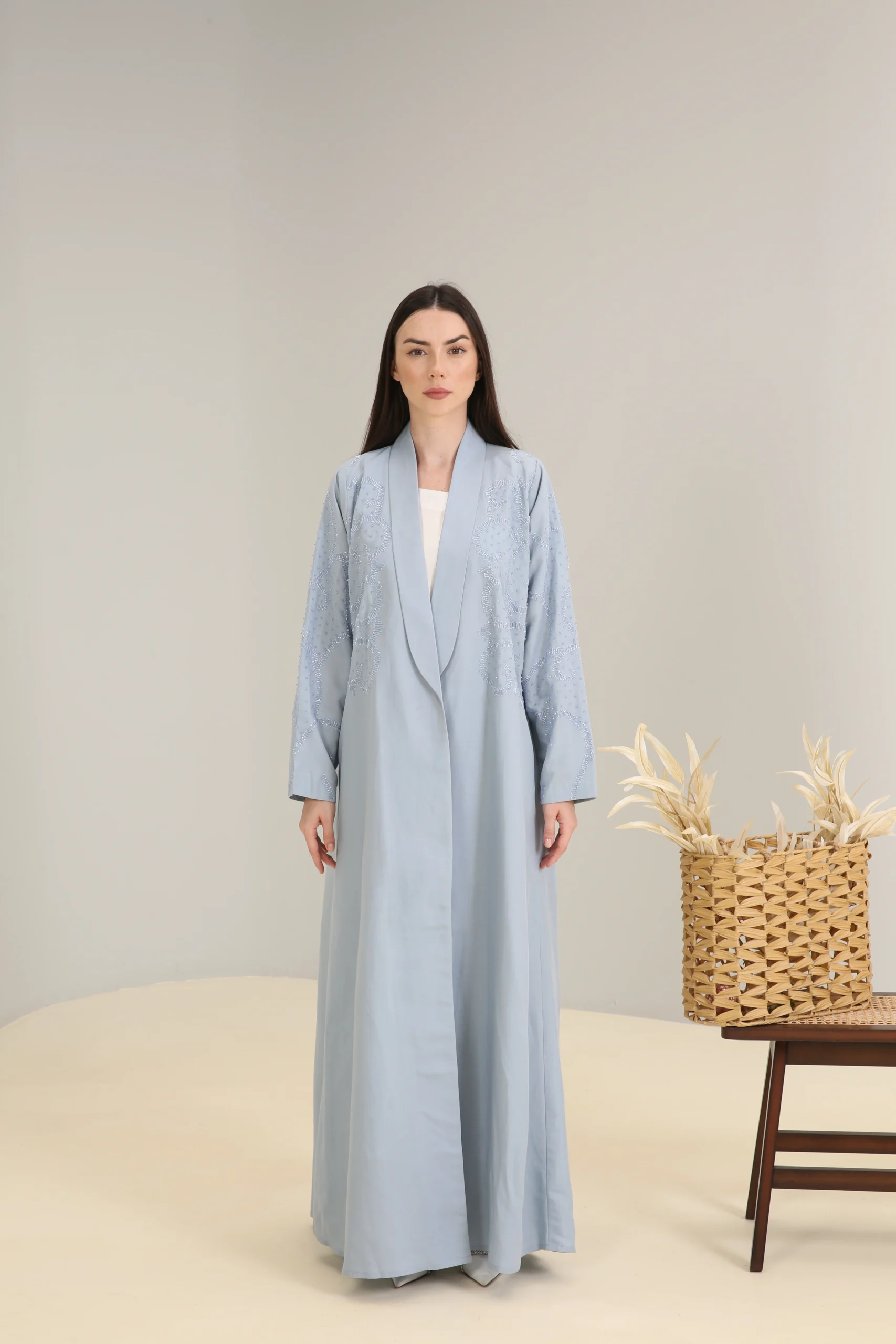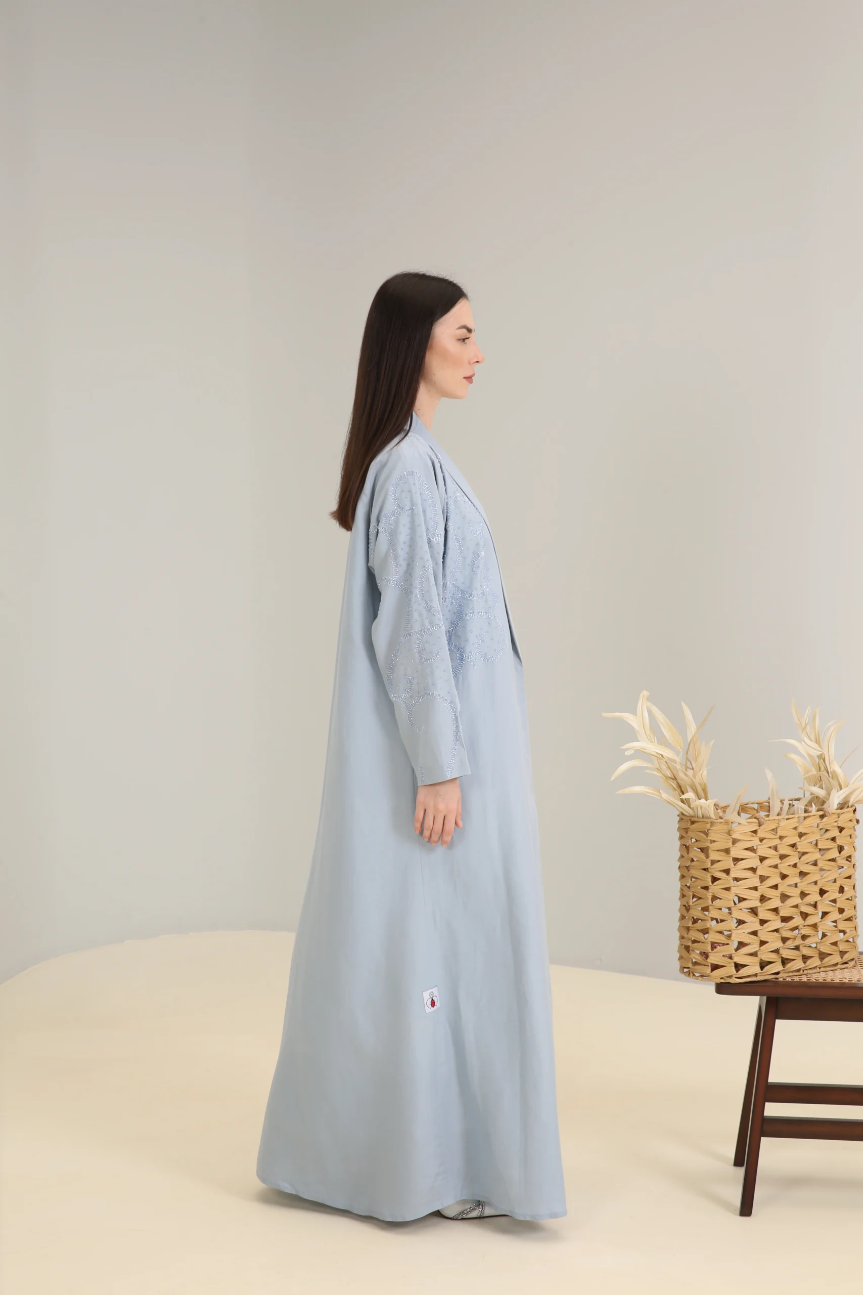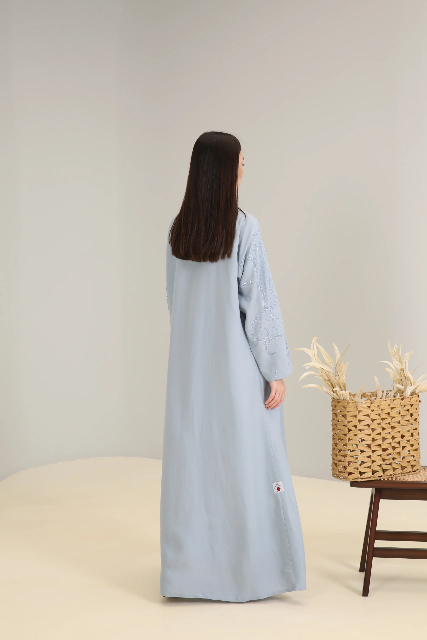 The Sky Mist Abaya is a garment of serene beauty, crafted from a smooth, lightweight fabric in a delicate, dusty blue. Its minimalist design is elevated by a stunning pattern of subtle beading and shimmering sequins that cascade down the shoulders and sleeves, creating a soft, luminous effect. The gentle sparkle adds a touch of refined glamour to the calming shade of blue.