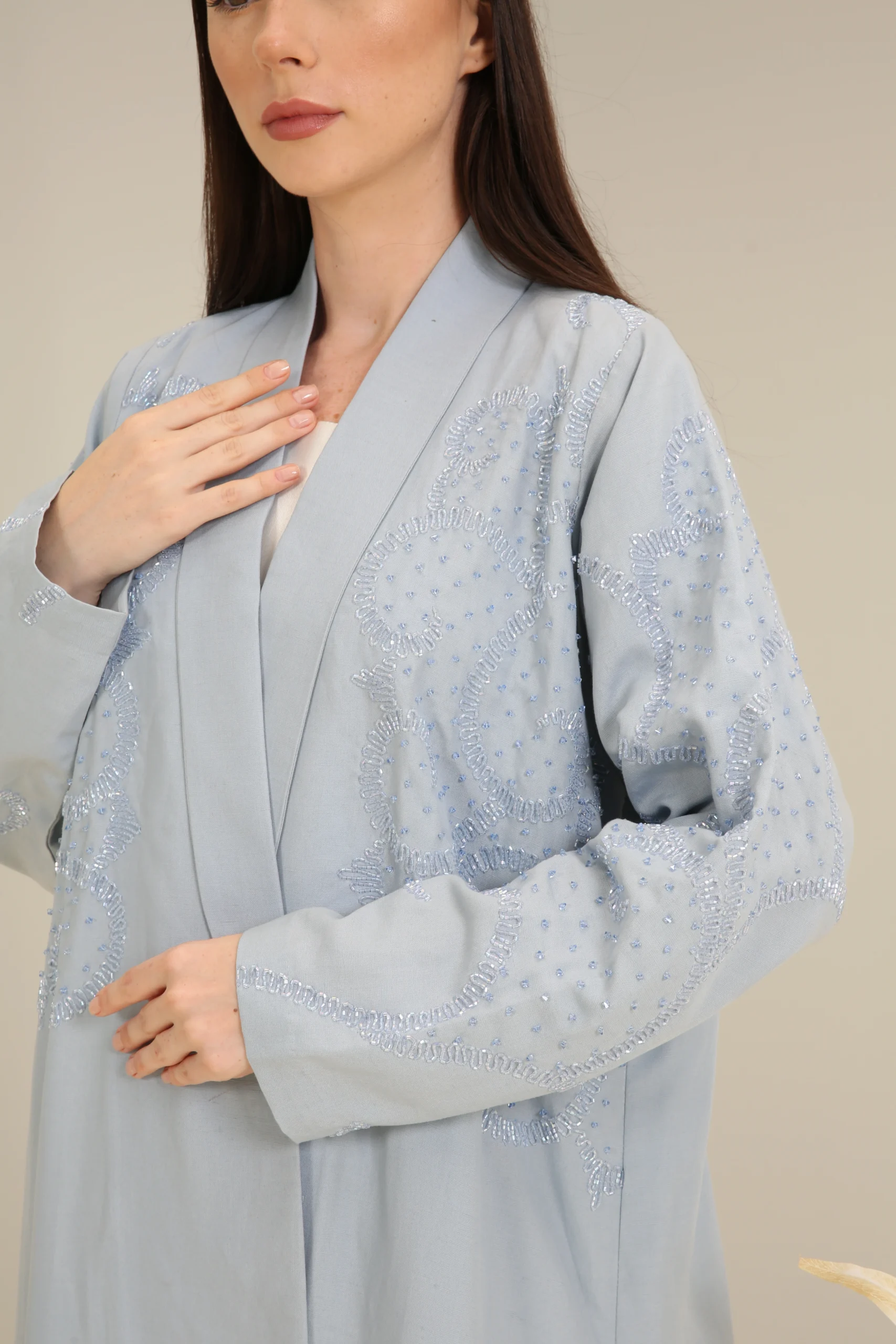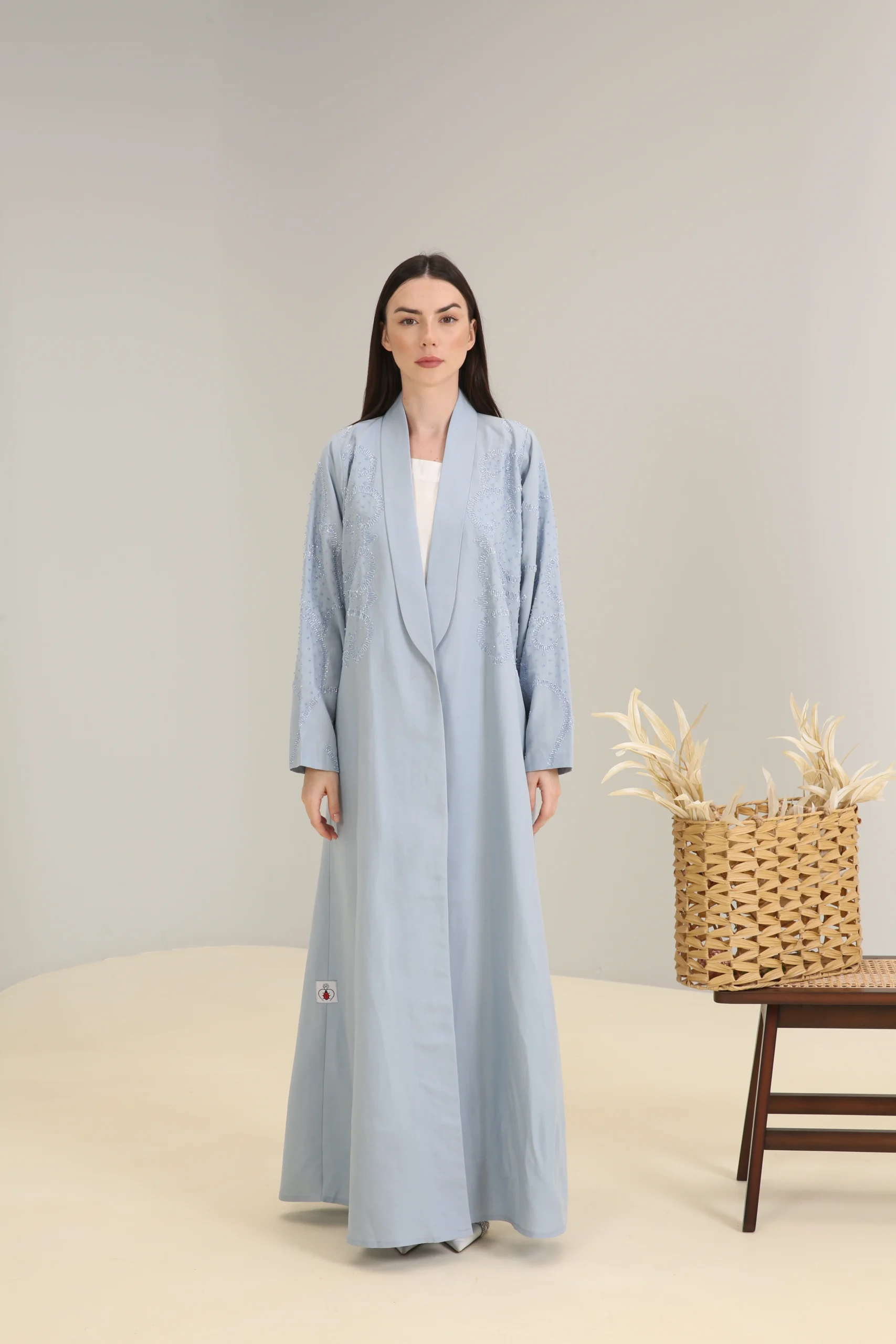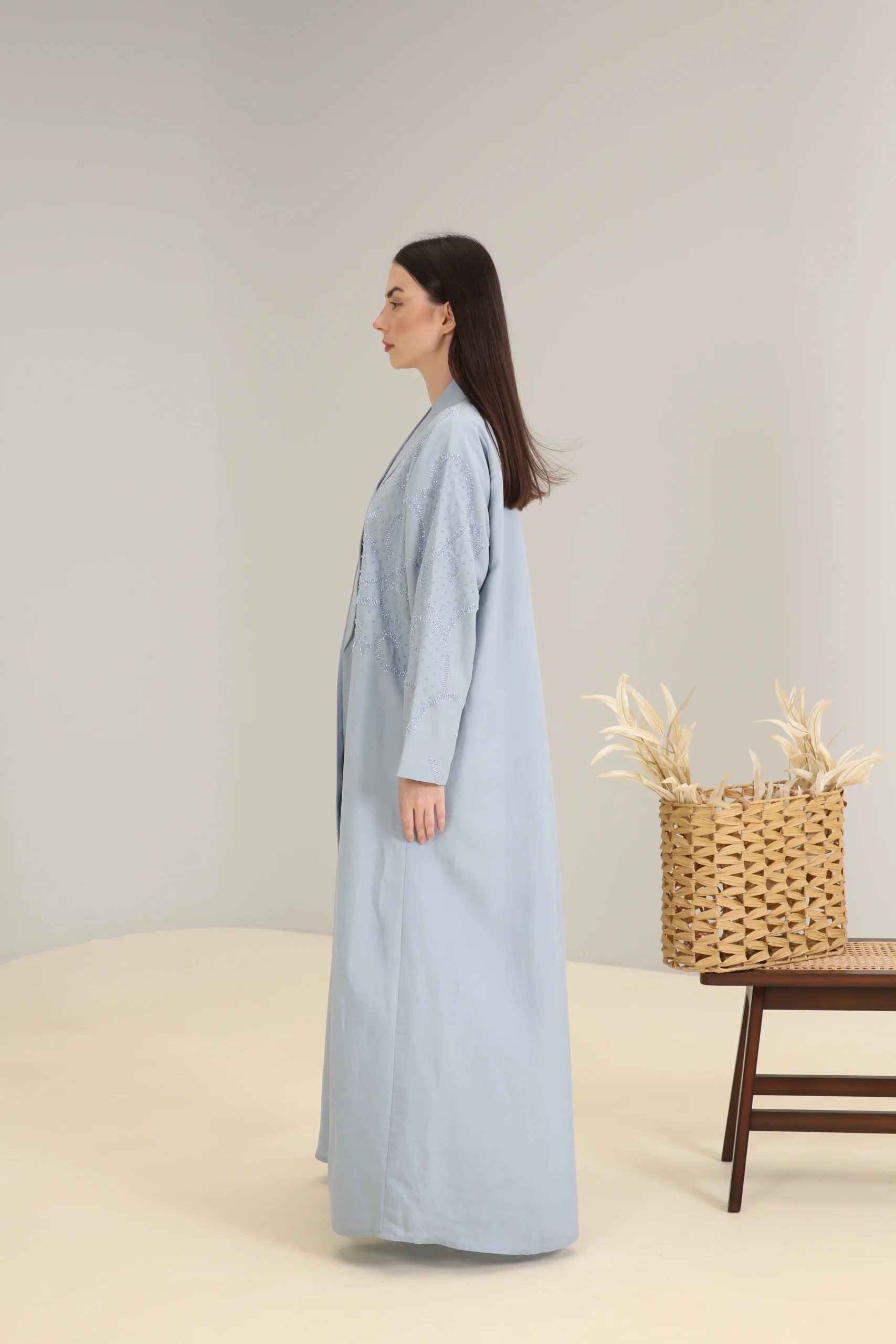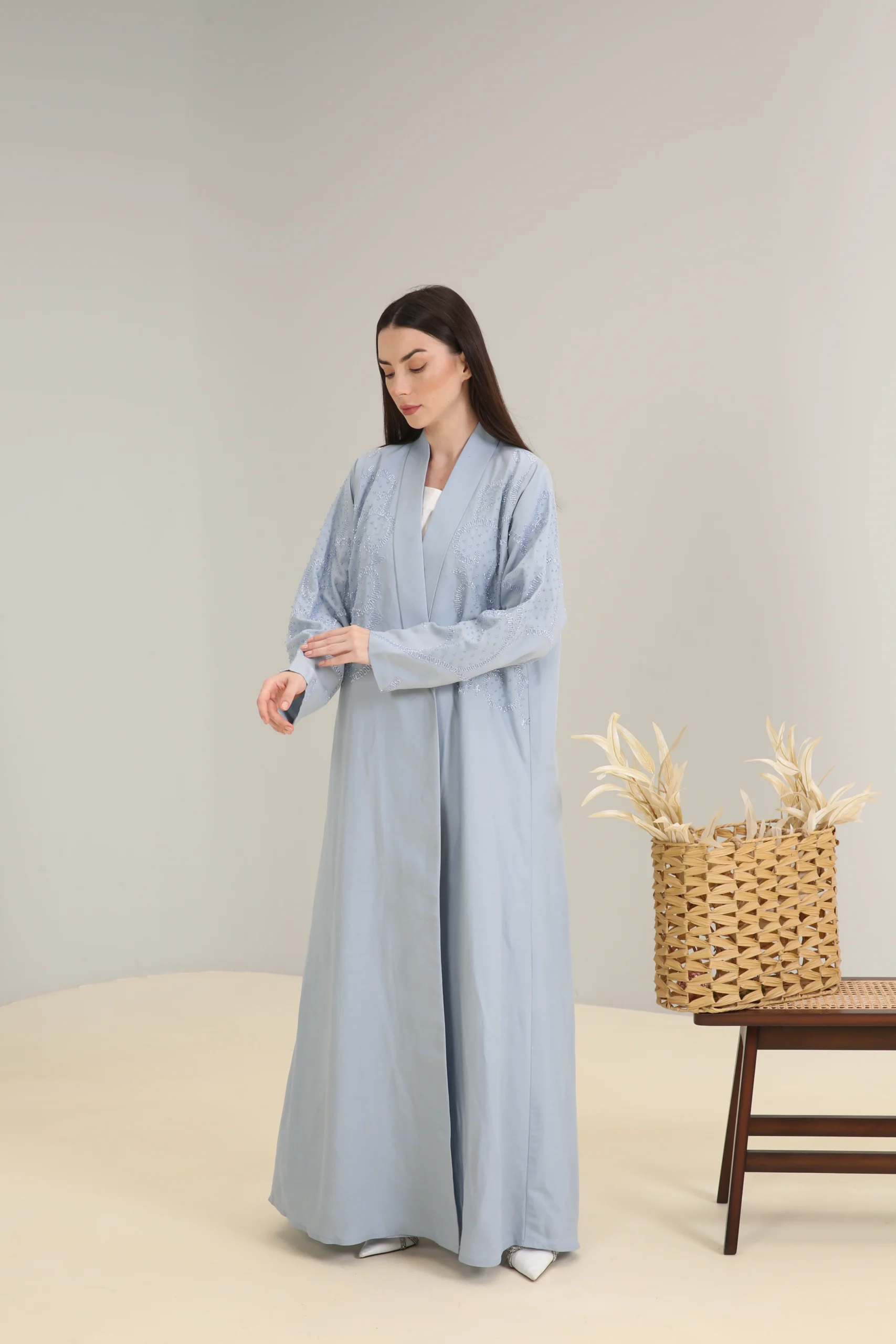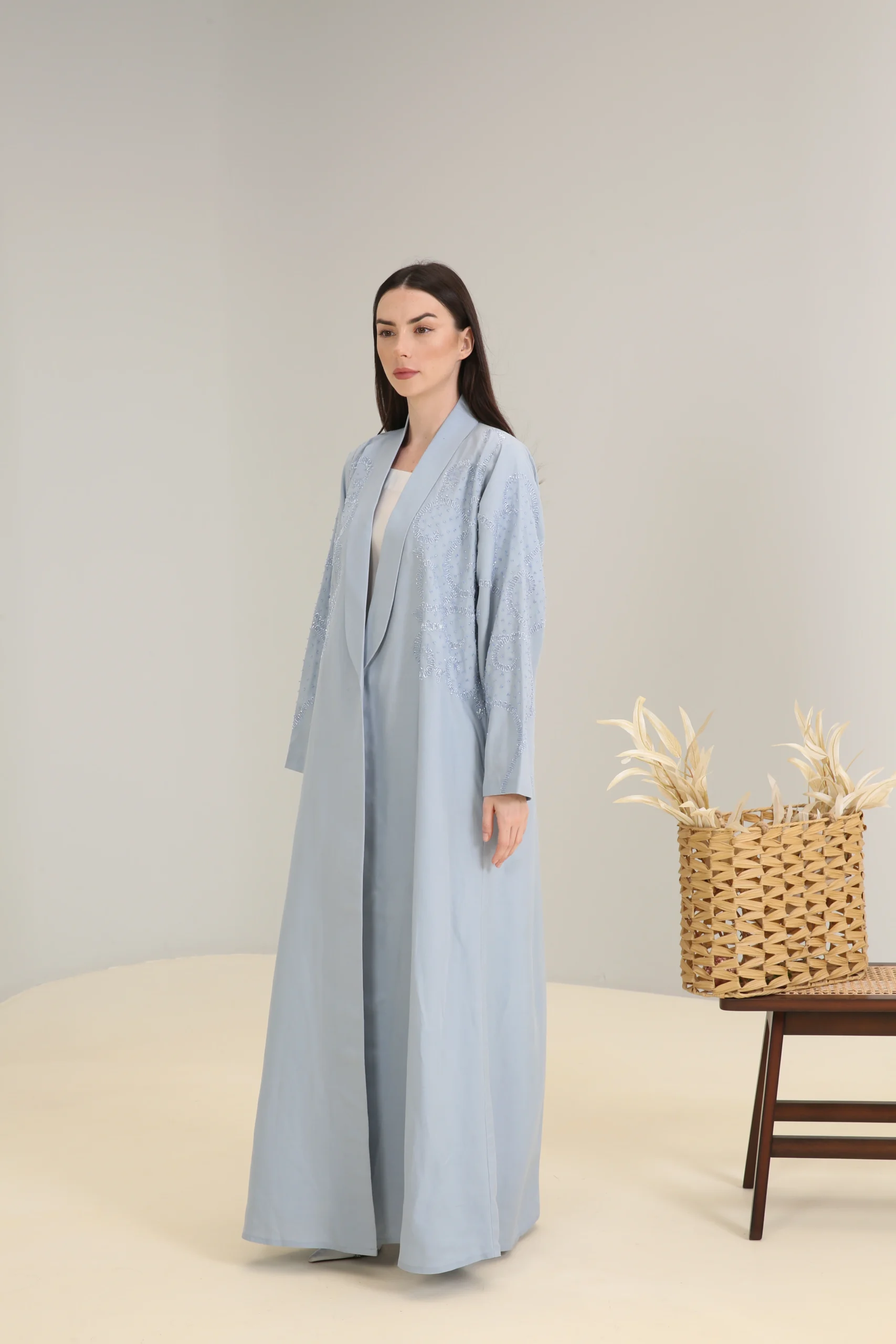 The Sky Mist Abaya is a garment of serene beauty, crafted from a smooth, lightweight fabric in a delicate, dusty blue. Its minimalist design is elevated by a stunning pattern of subtle beading and shimmering sequins that cascade down the shoulders and sleeves, creating a soft, luminous effect. The gentle sparkle adds a touch of refined glamour to the calming shade of blue.
