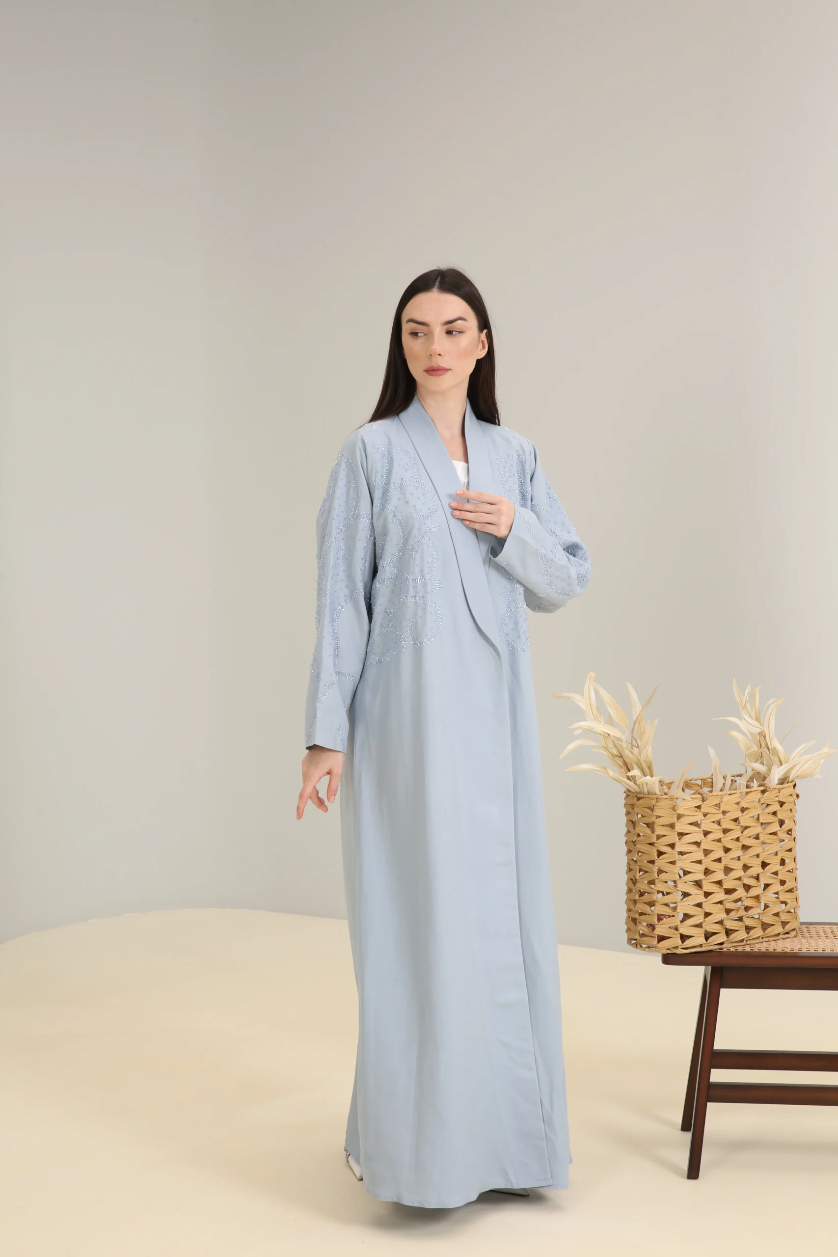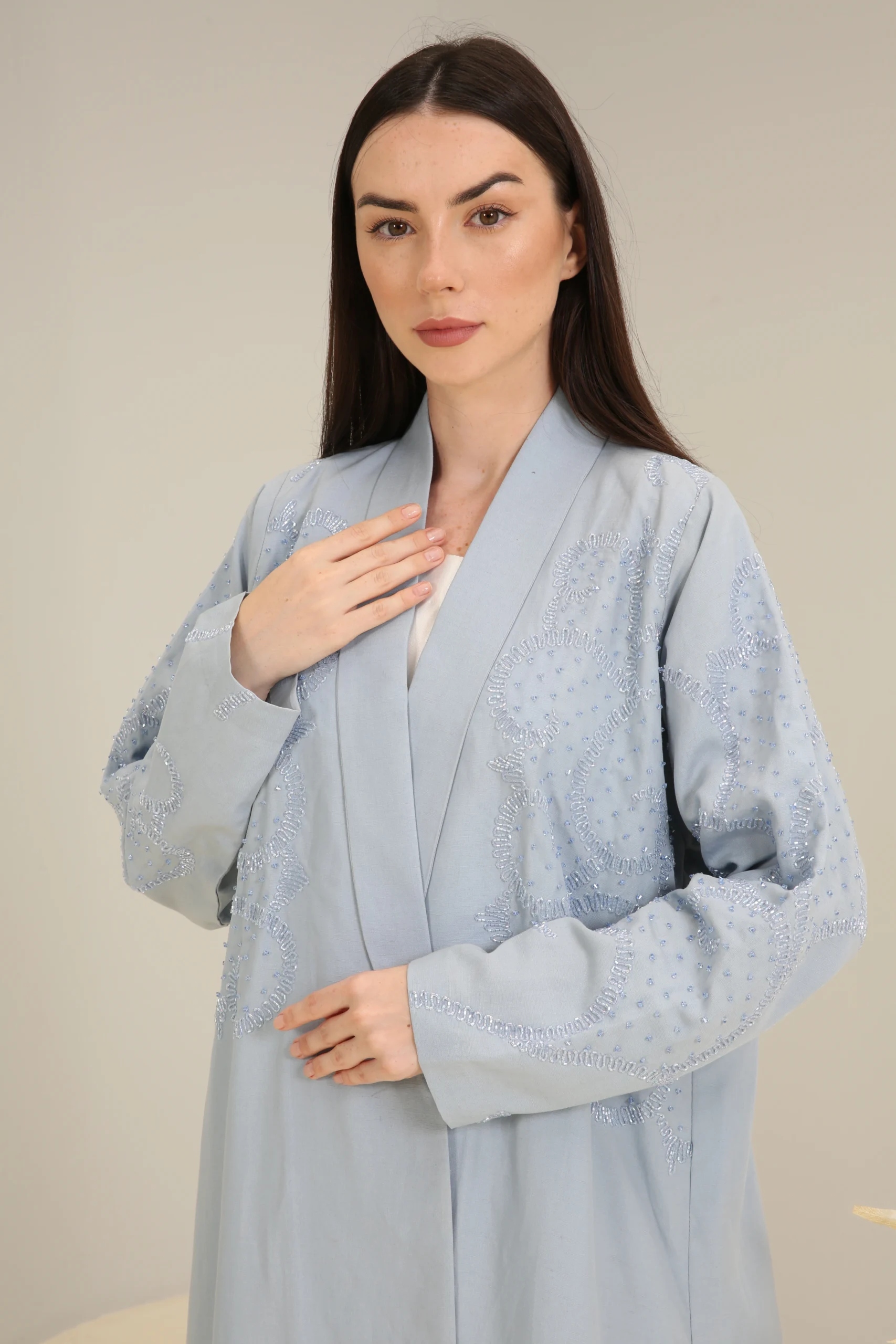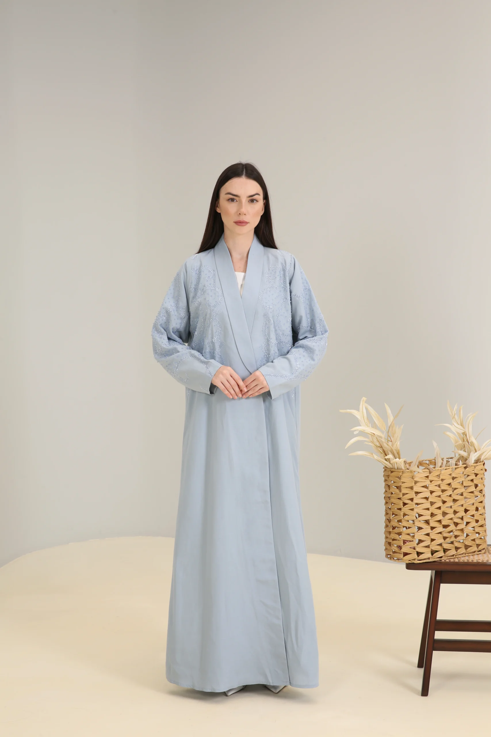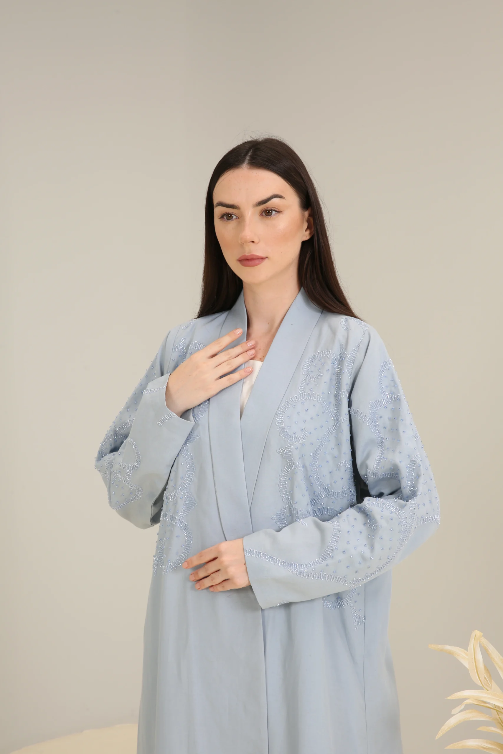 The Sky Mist Abaya is a garment of serene beauty, crafted from a smooth, lightweight fabric in a delicate, dusty blue. Its minimalist design is elevated by a stunning pattern of subtle beading and shimmering sequins that cascade down the shoulders and sleeves, creating a soft, luminous effect. The gentle sparkle adds a touch of refined glamour to the calming shade of blue.