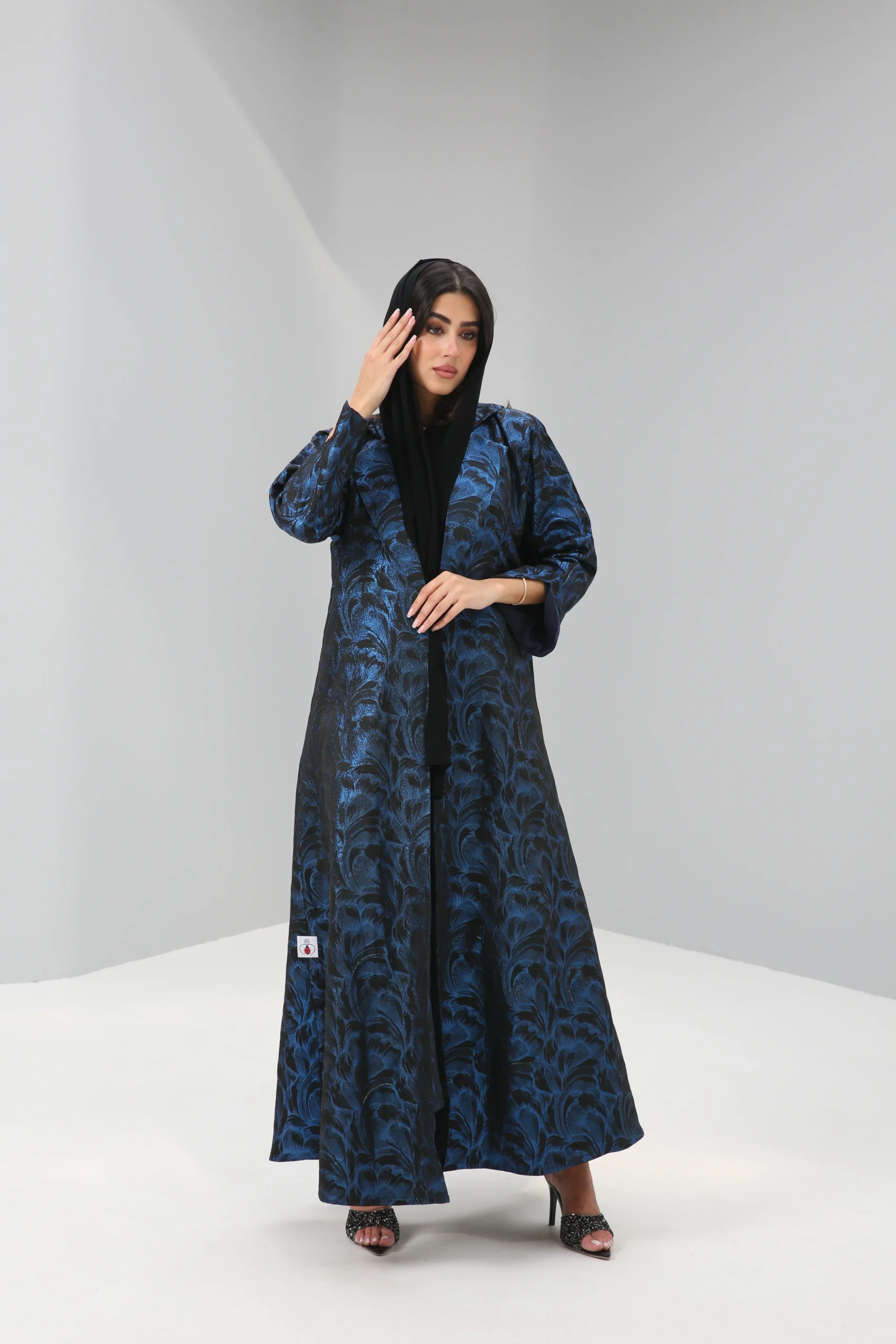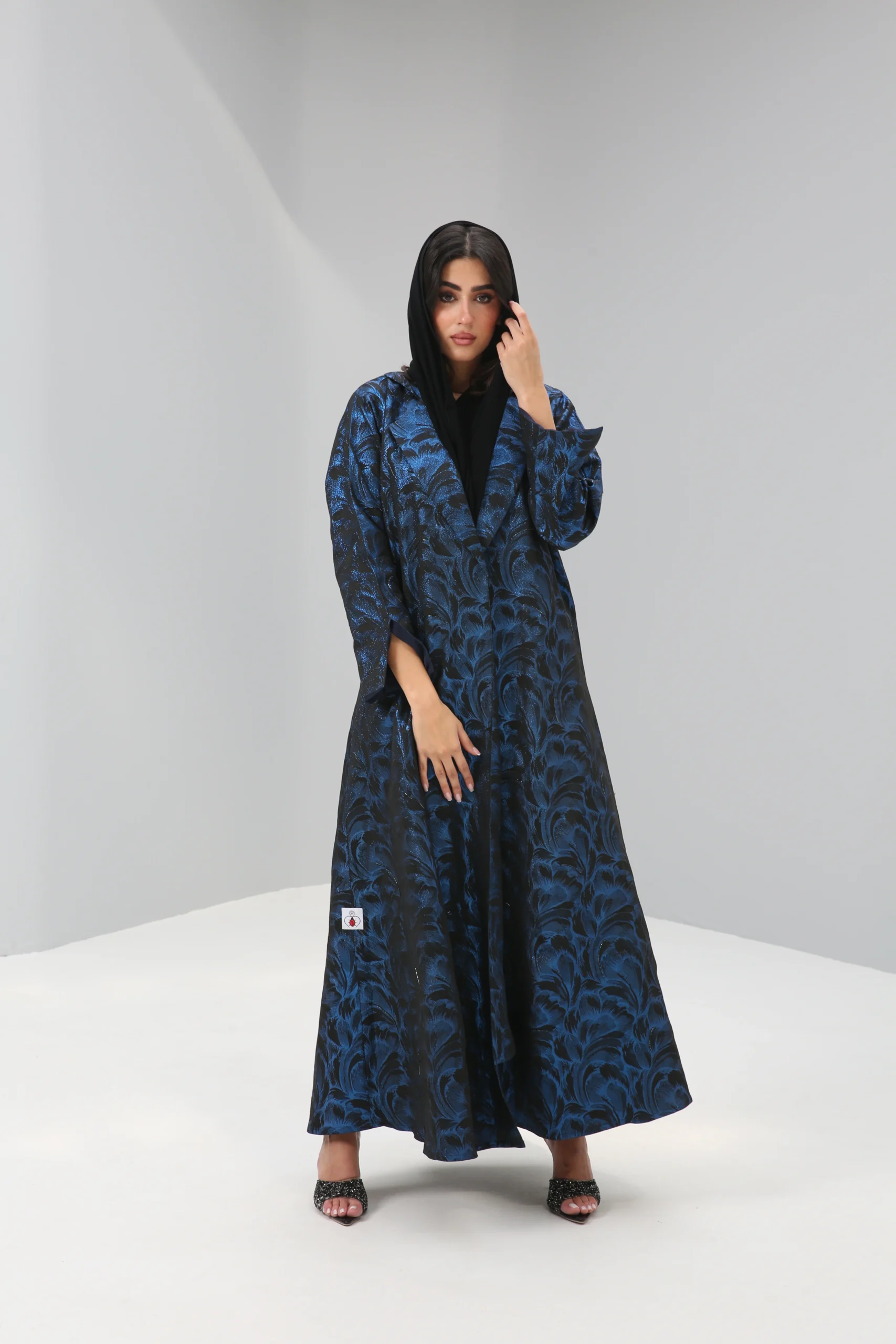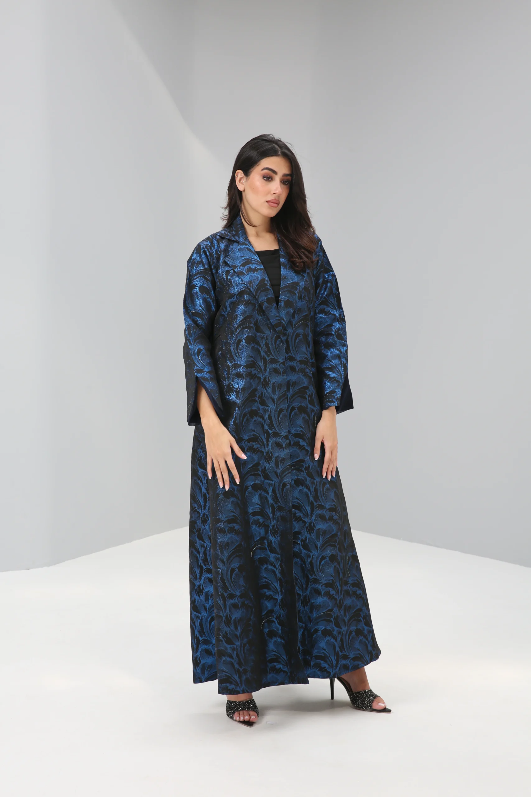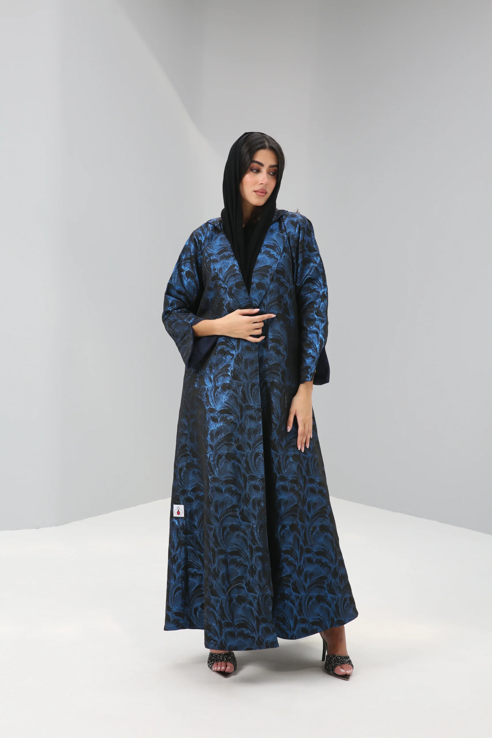 The Sapphire Brocade Abaya is a breathtaking statement piece that combines a timeless silhouette with luxurious, modern texture. Crafted in a smooth, rich black fabric, its elegant drape is elevated by a magnificent textured pattern in a vibrant, iridescent blue. This luminous brocade creates a captivating, all-over pattern that shimmers with every movement, reminiscent of deep ocean waves or a starlit night sky.