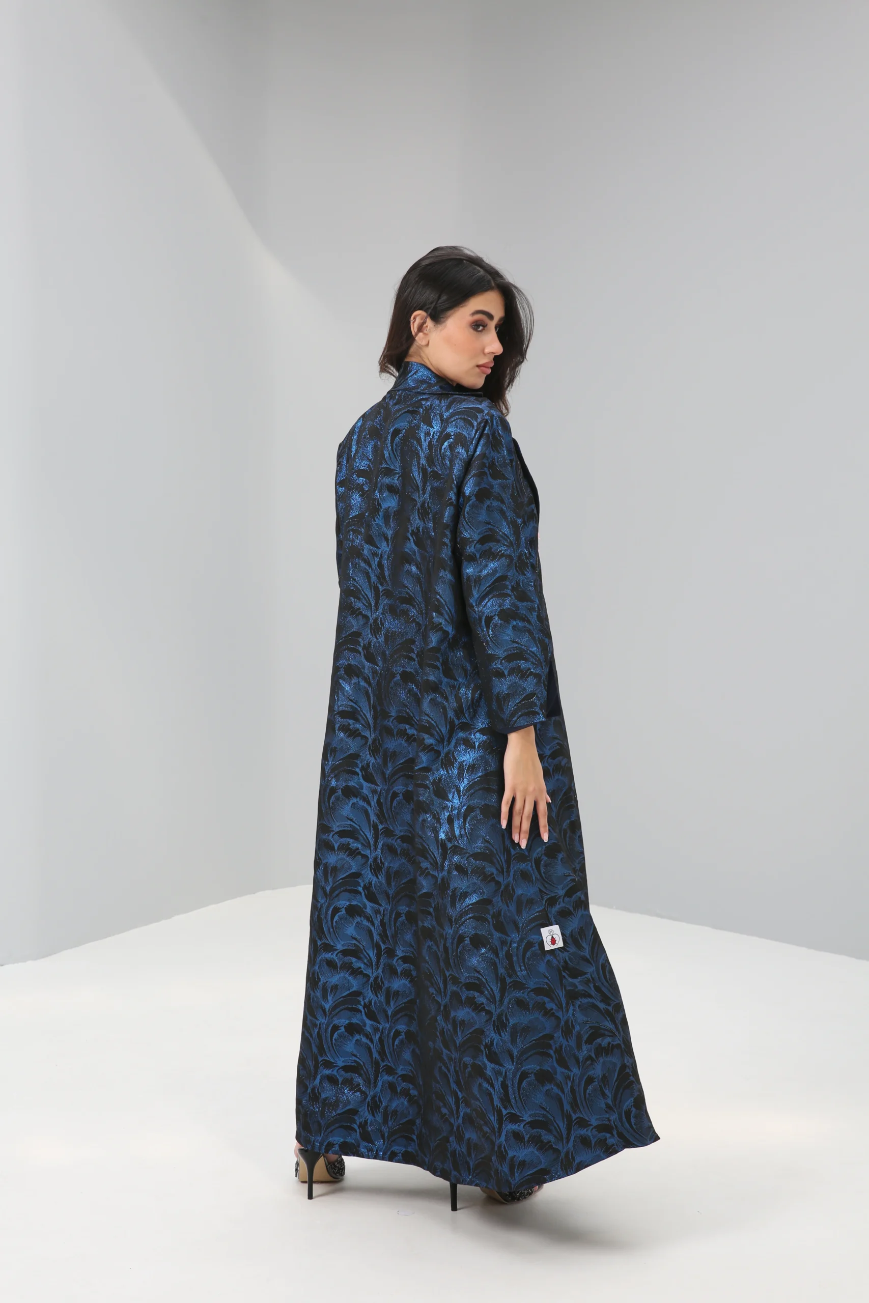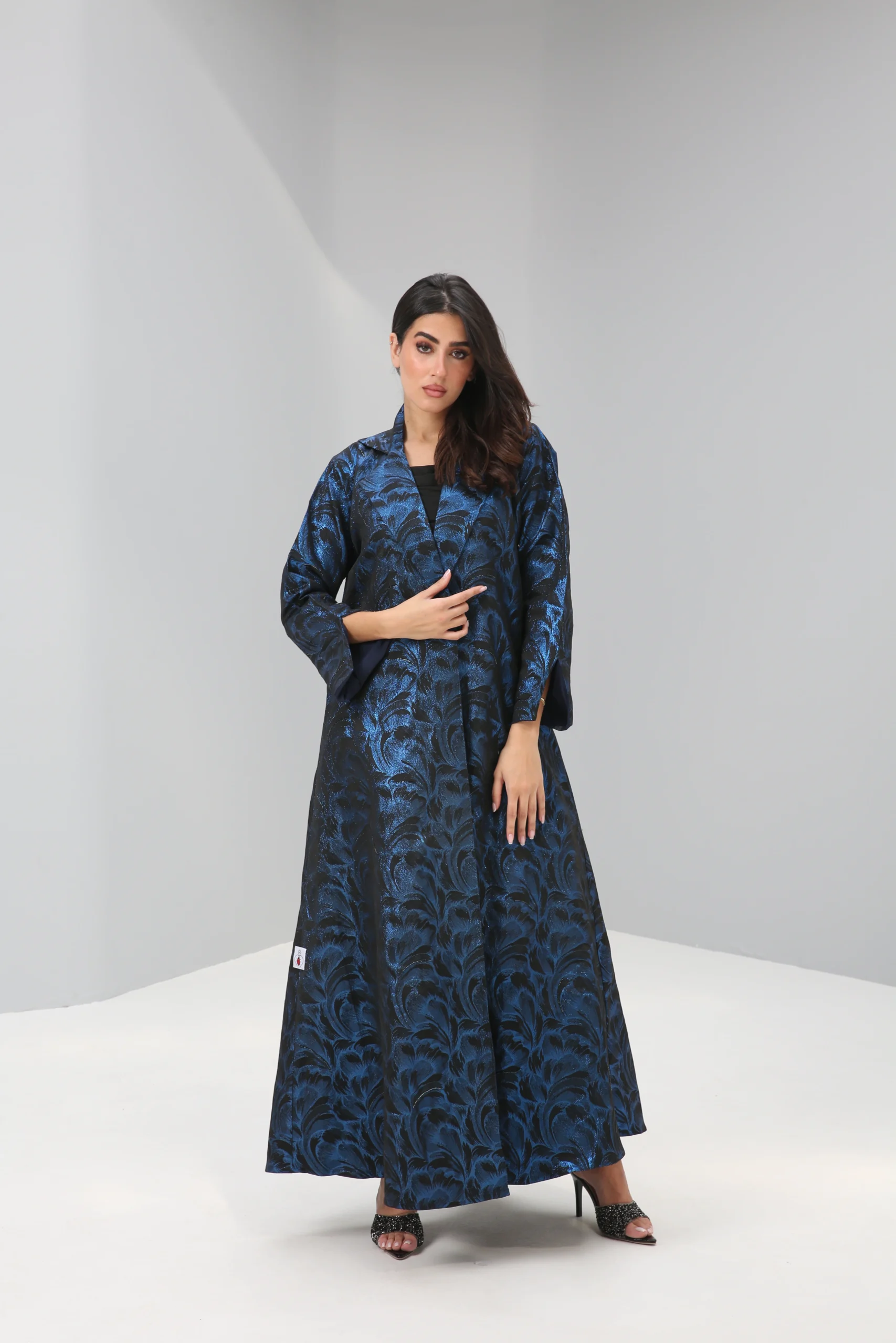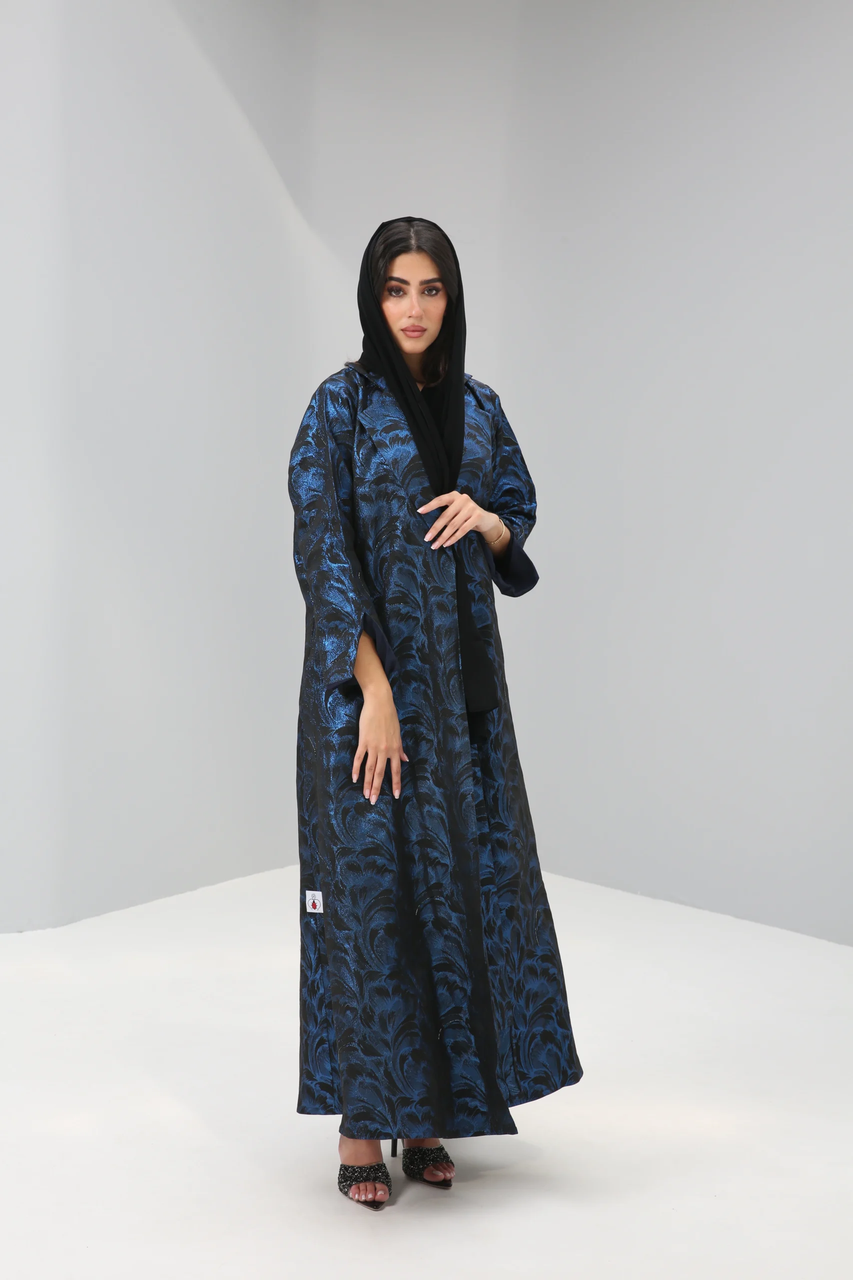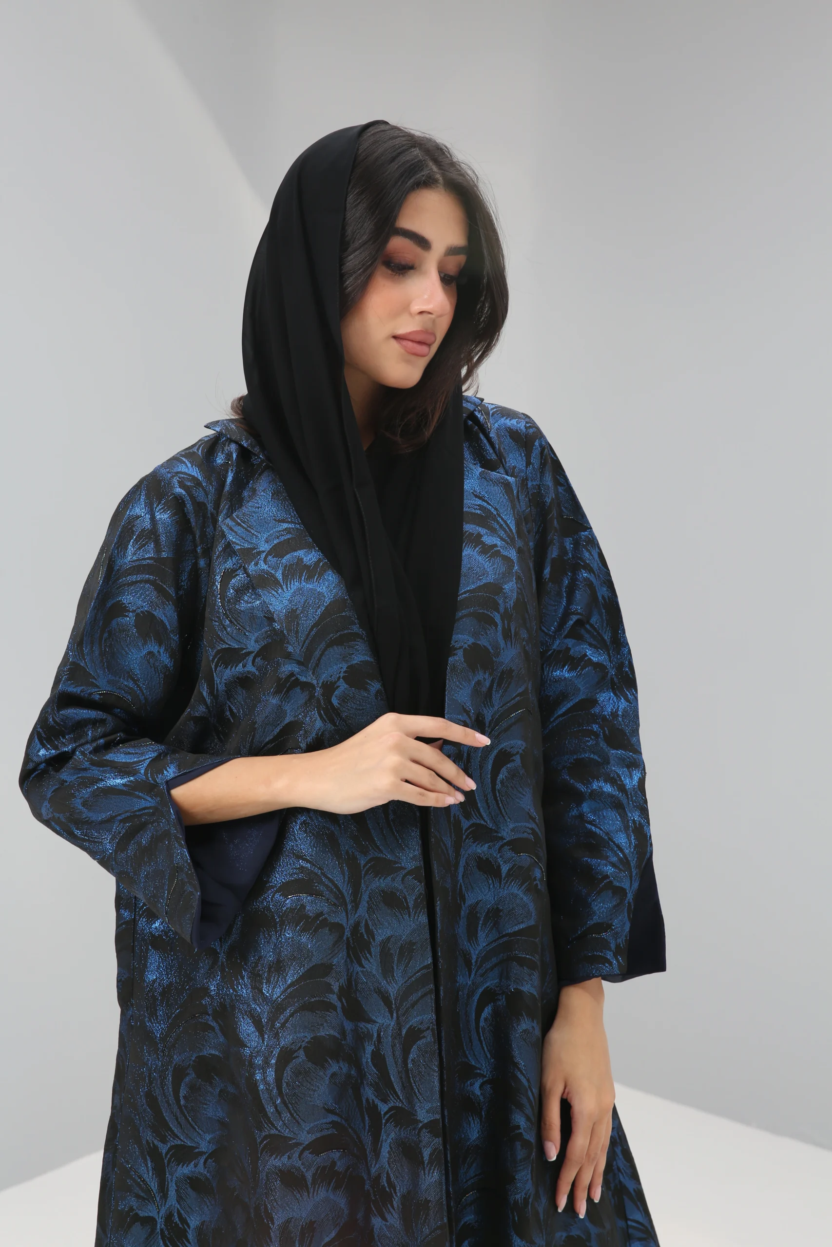 The Sapphire Brocade Abaya is a breathtaking statement piece that combines a timeless silhouette with luxurious, modern texture. Crafted in a smooth, rich black fabric, its elegant drape is elevated by a magnificent textured pattern in a vibrant, iridescent blue. This luminous brocade creates a captivating, all-over pattern that shimmers with every movement, reminiscent of deep ocean waves or a starlit night sky.
