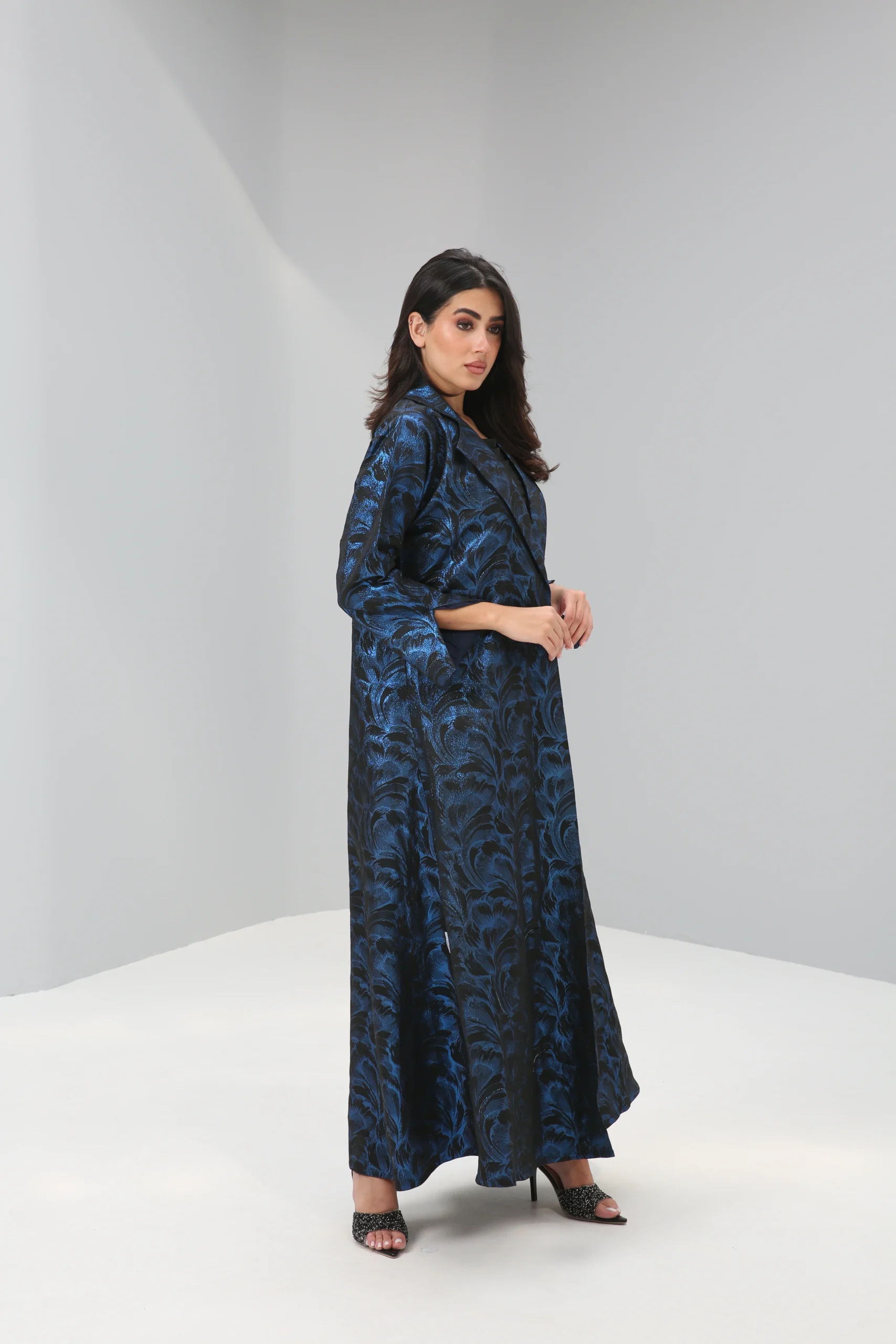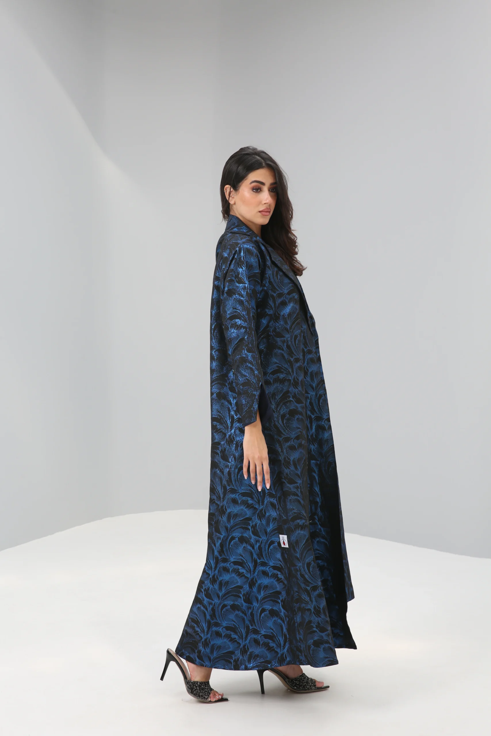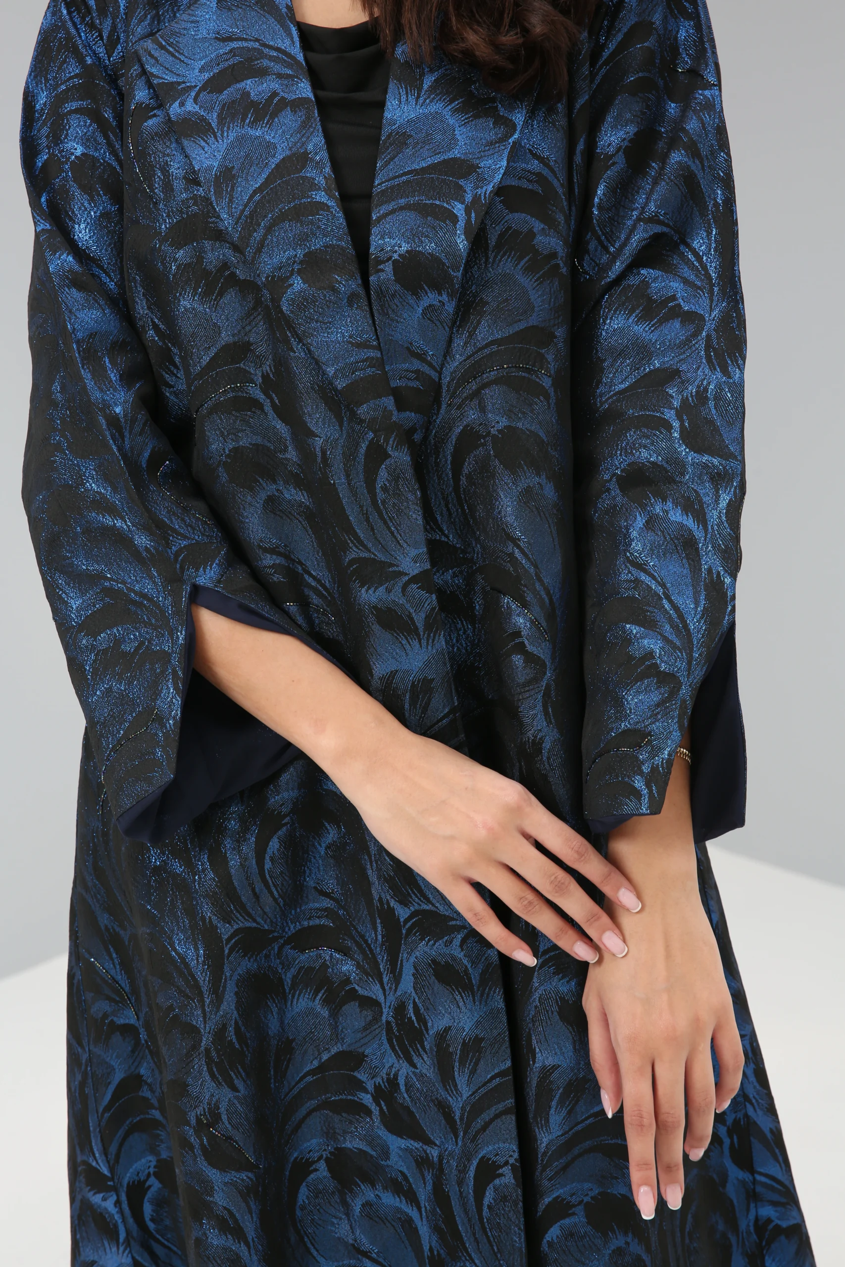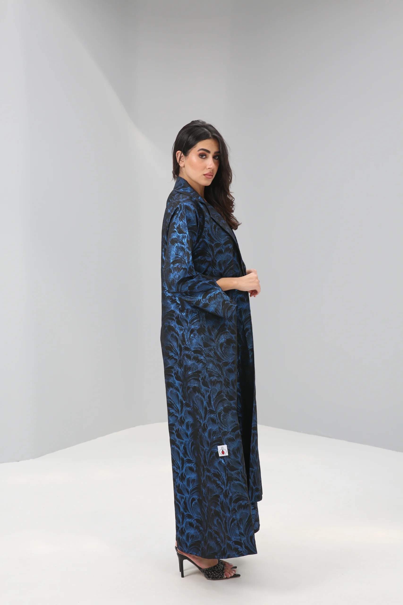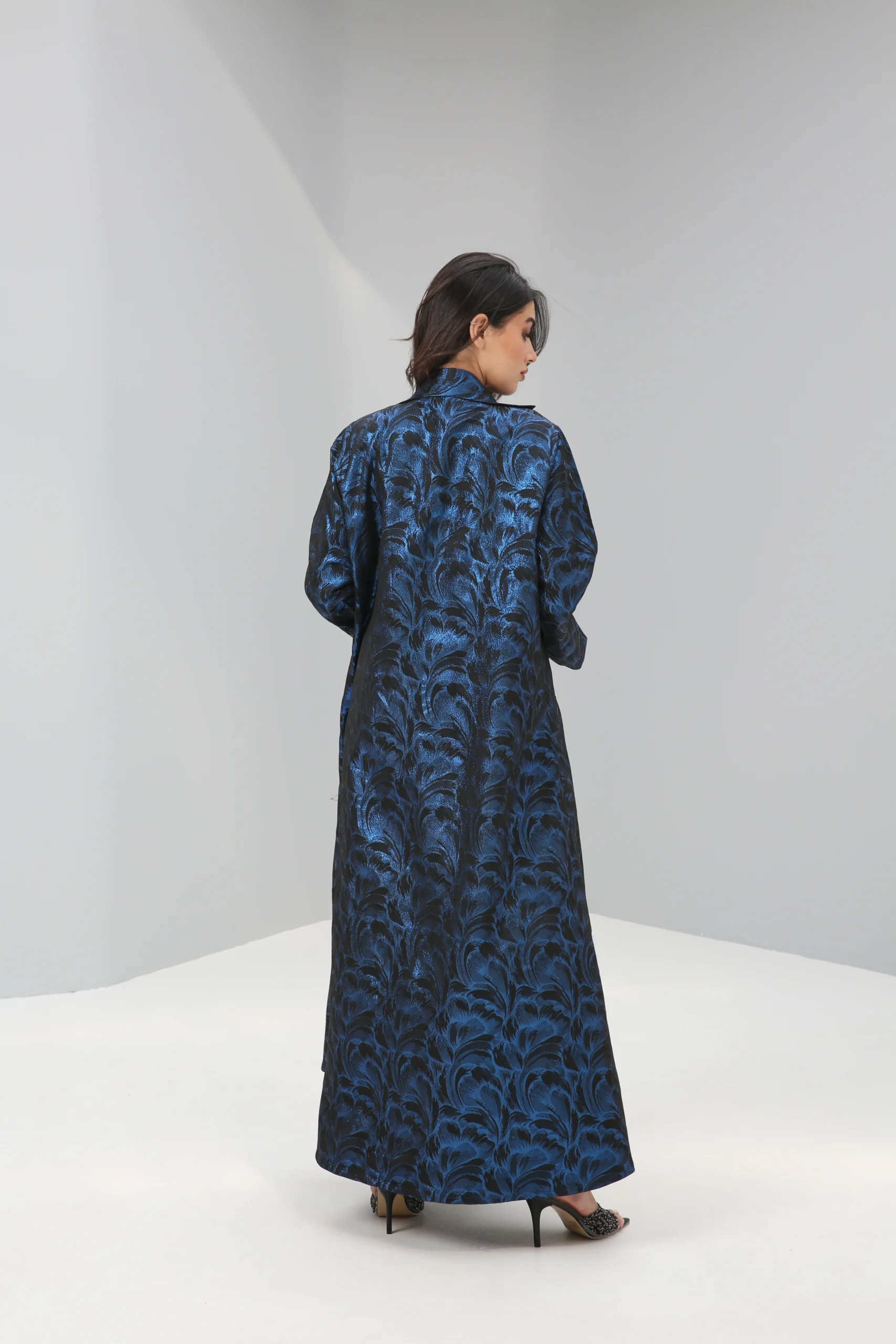 The Sapphire Brocade Abaya is a breathtaking statement piece that combines a timeless silhouette with luxurious, modern texture. Crafted in a smooth, rich black fabric, its elegant drape is elevated by a magnificent textured pattern in a vibrant, iridescent blue. This luminous brocade creates a captivating, all-over pattern that shimmers with every movement, reminiscent of deep ocean waves or a starlit night sky.
