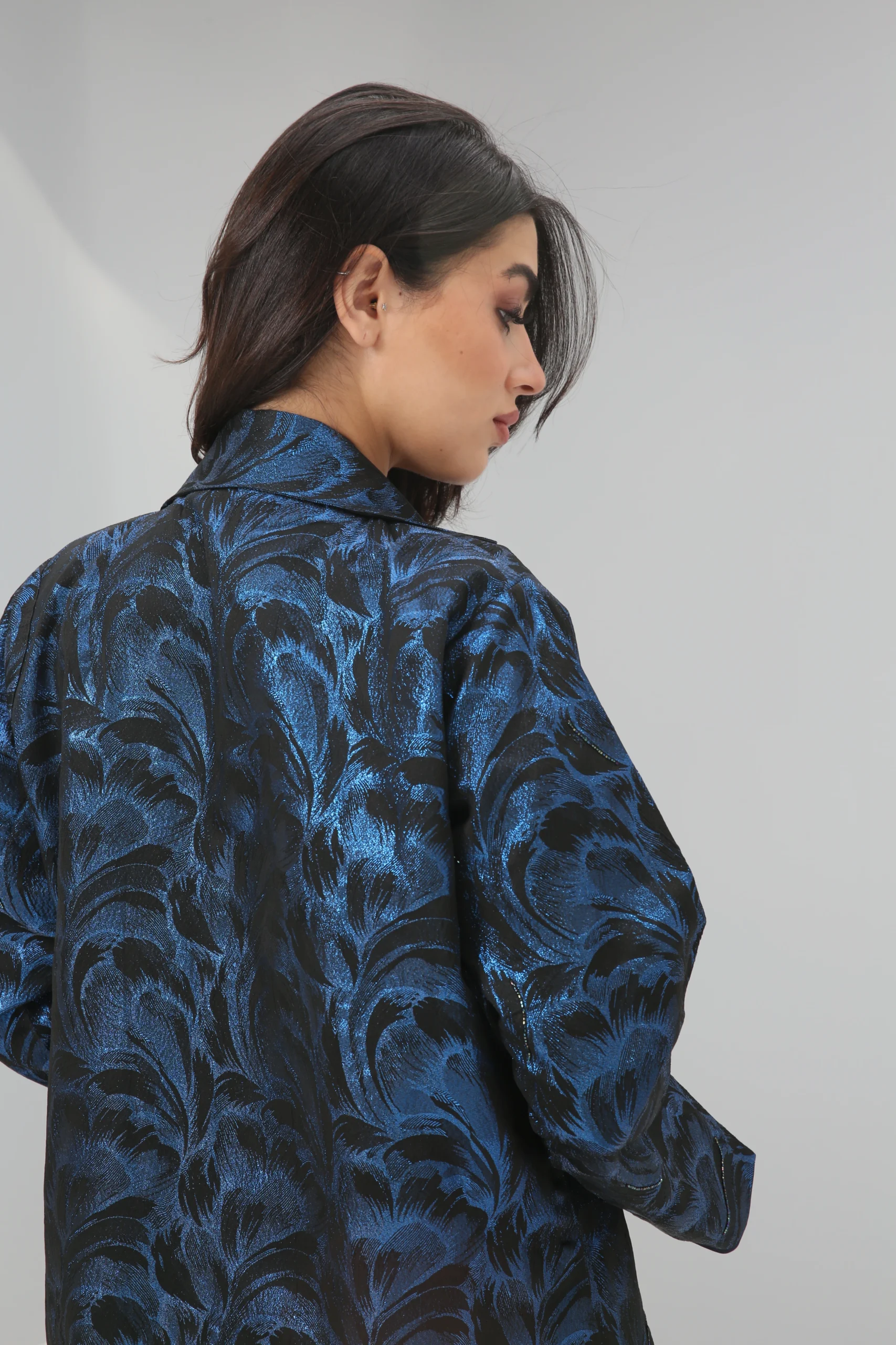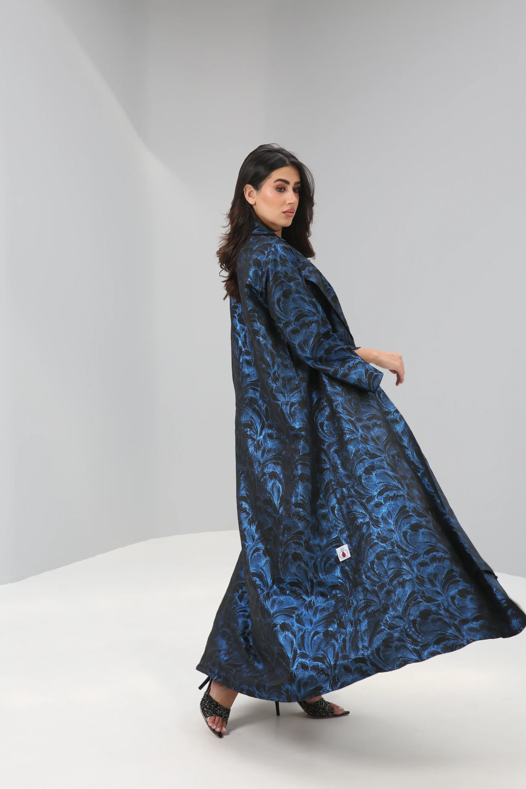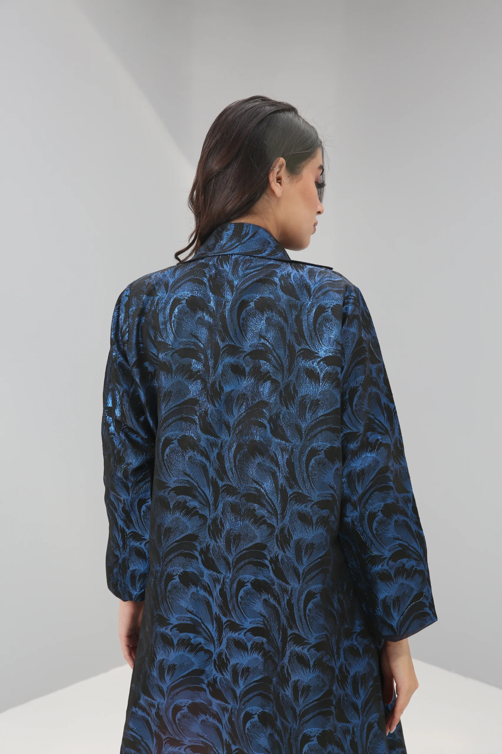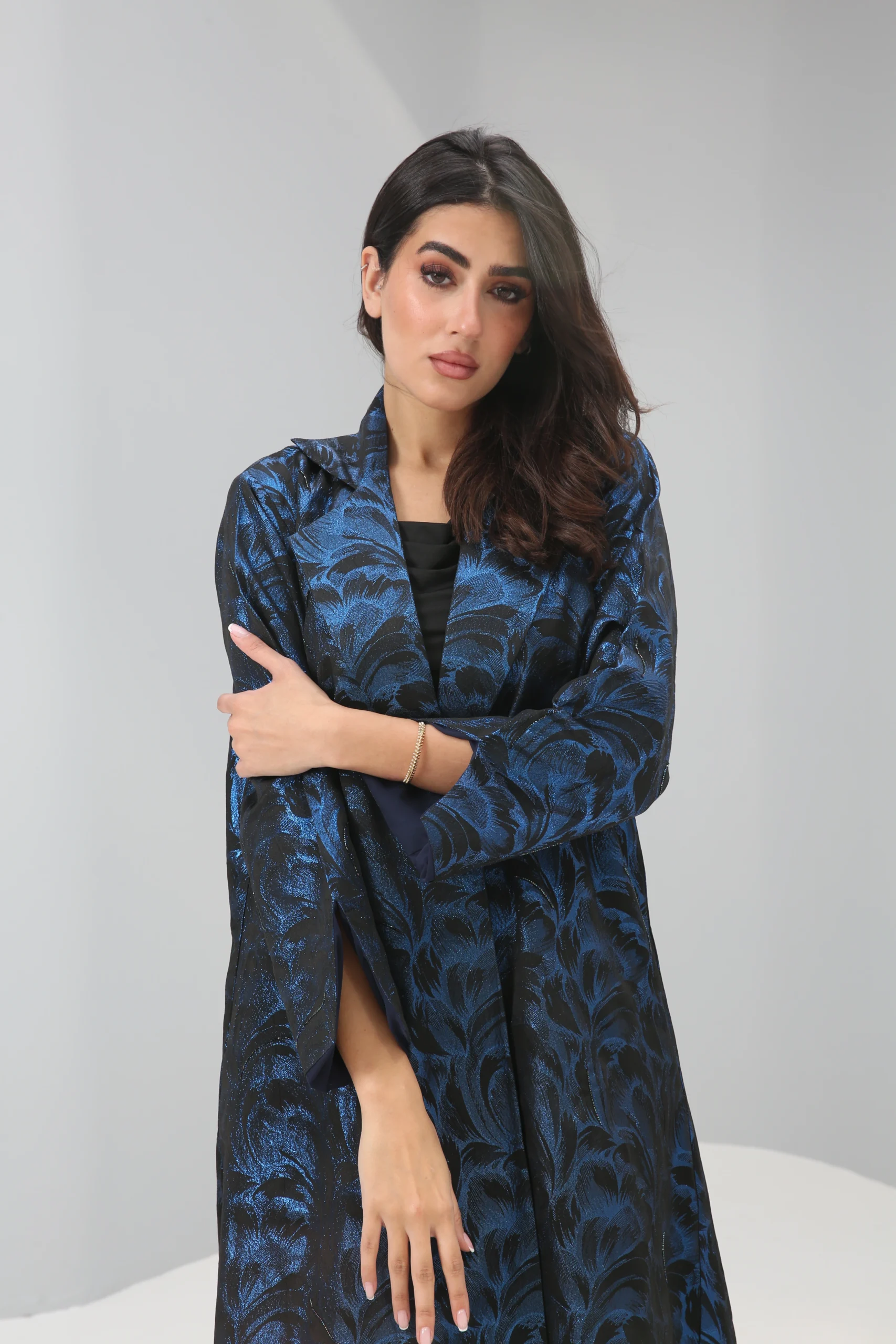 The Sapphire Brocade Abaya is a breathtaking statement piece that combines a timeless silhouette with luxurious, modern texture. Crafted in a smooth, rich black fabric, its elegant drape is elevated by a magnificent textured pattern in a vibrant, iridescent blue. This luminous brocade creates a captivating, all-over pattern that shimmers with every movement, reminiscent of deep ocean waves or a starlit night sky.