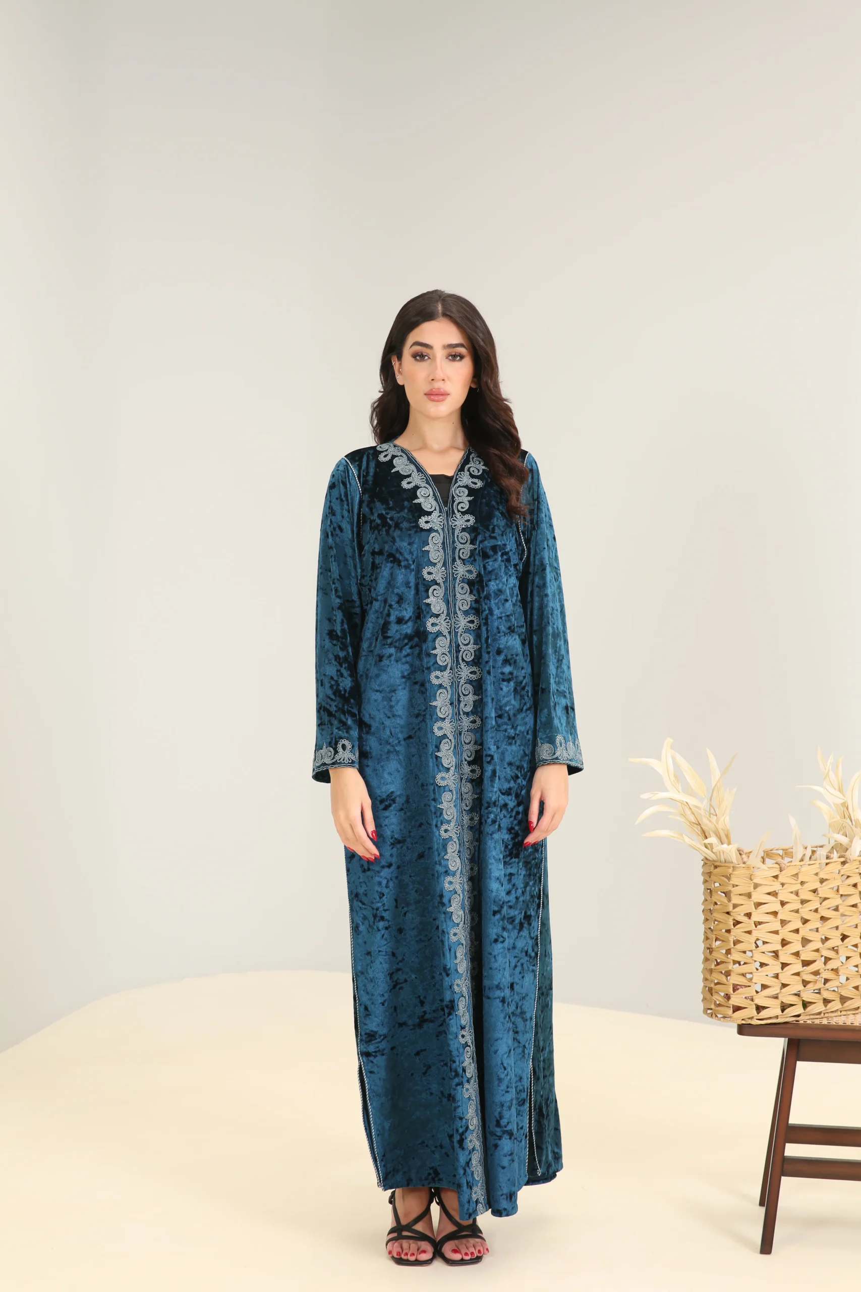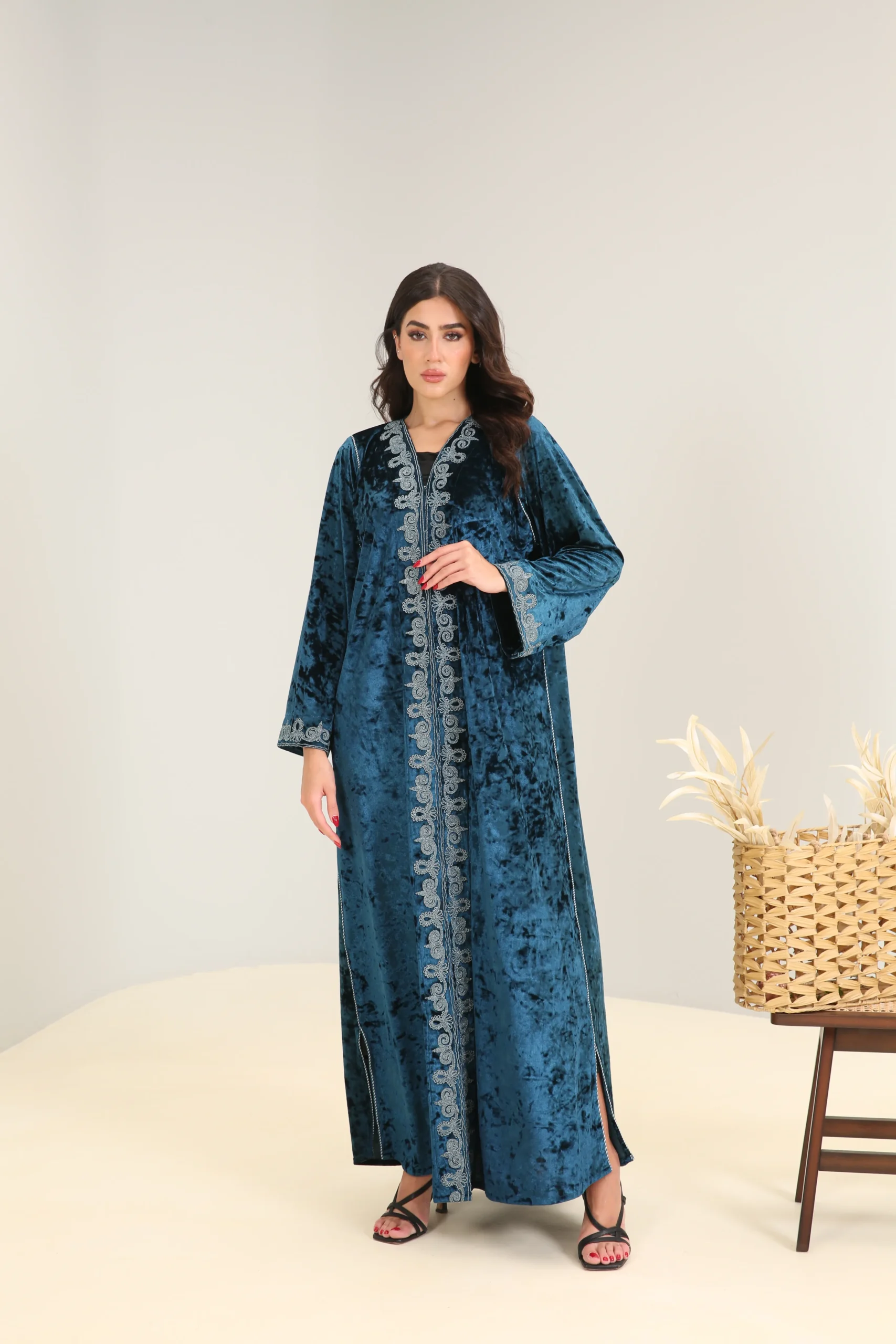Make a statement in rich, jewel-toned elegance with our Deep Turquoise Abaya – Luxe Edition. Crafted from premium silk-touch crepe, this abaya flows effortlessly while catching the light with a subtle sheen, making it a showstopper for both day and evening wear.