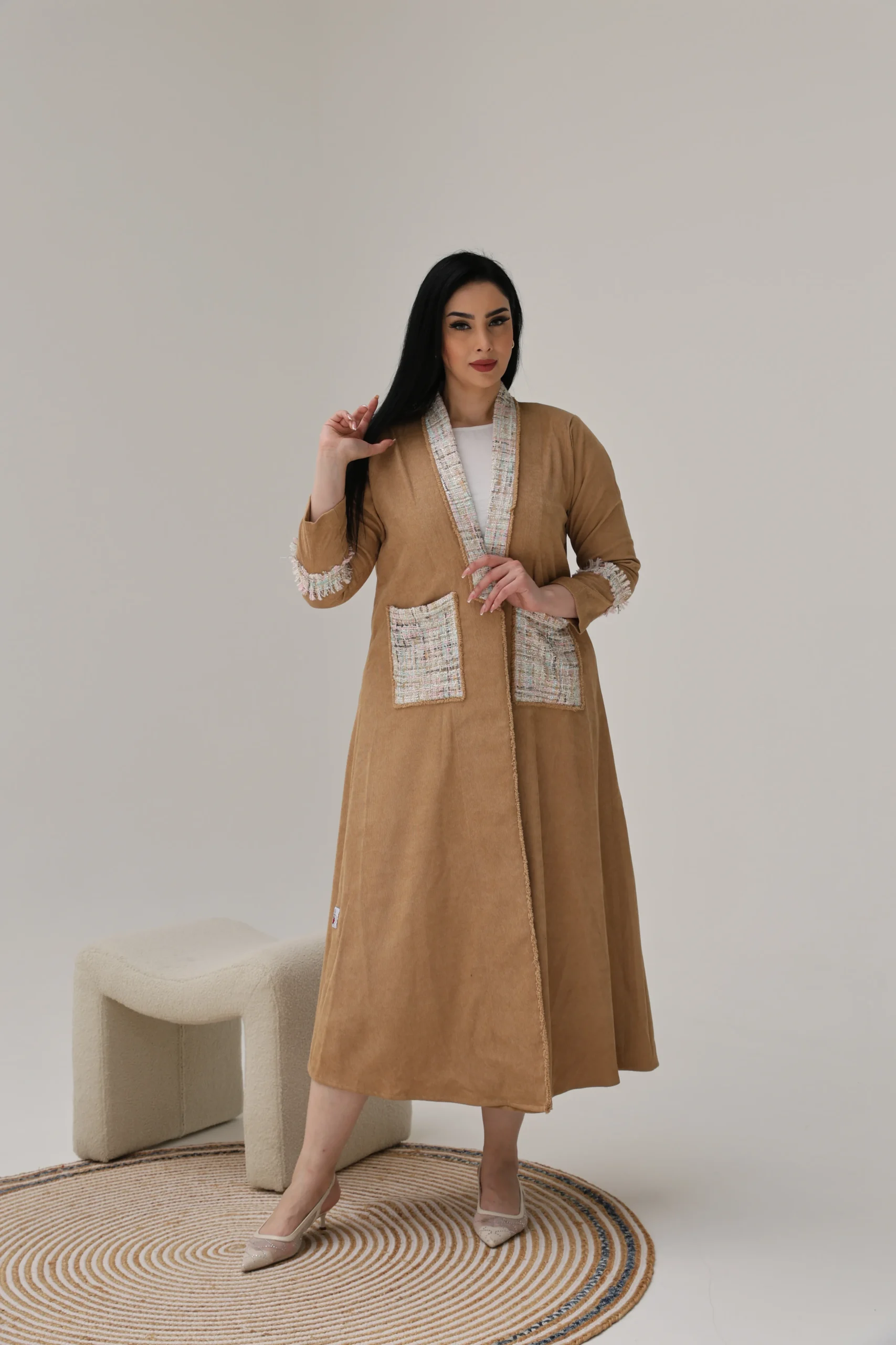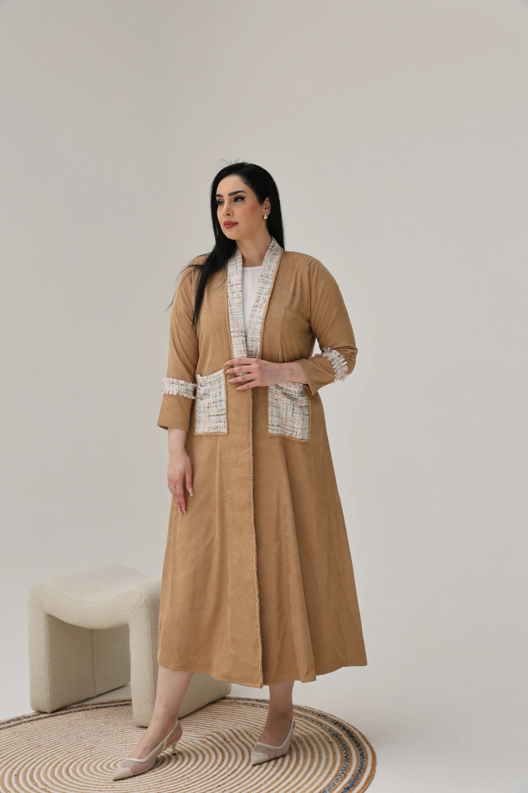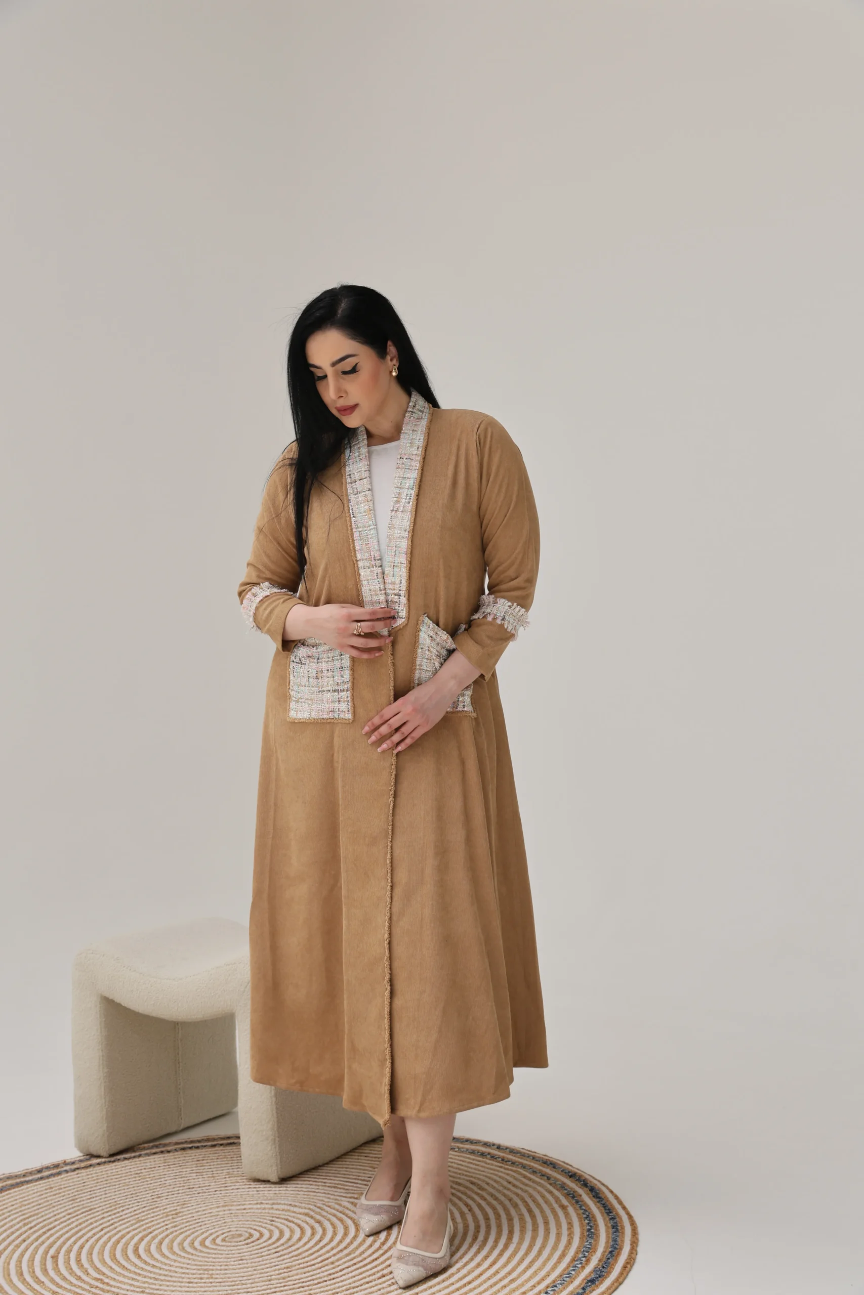 Light Brown Abaya with Tweed Detailing – Luxe Edition