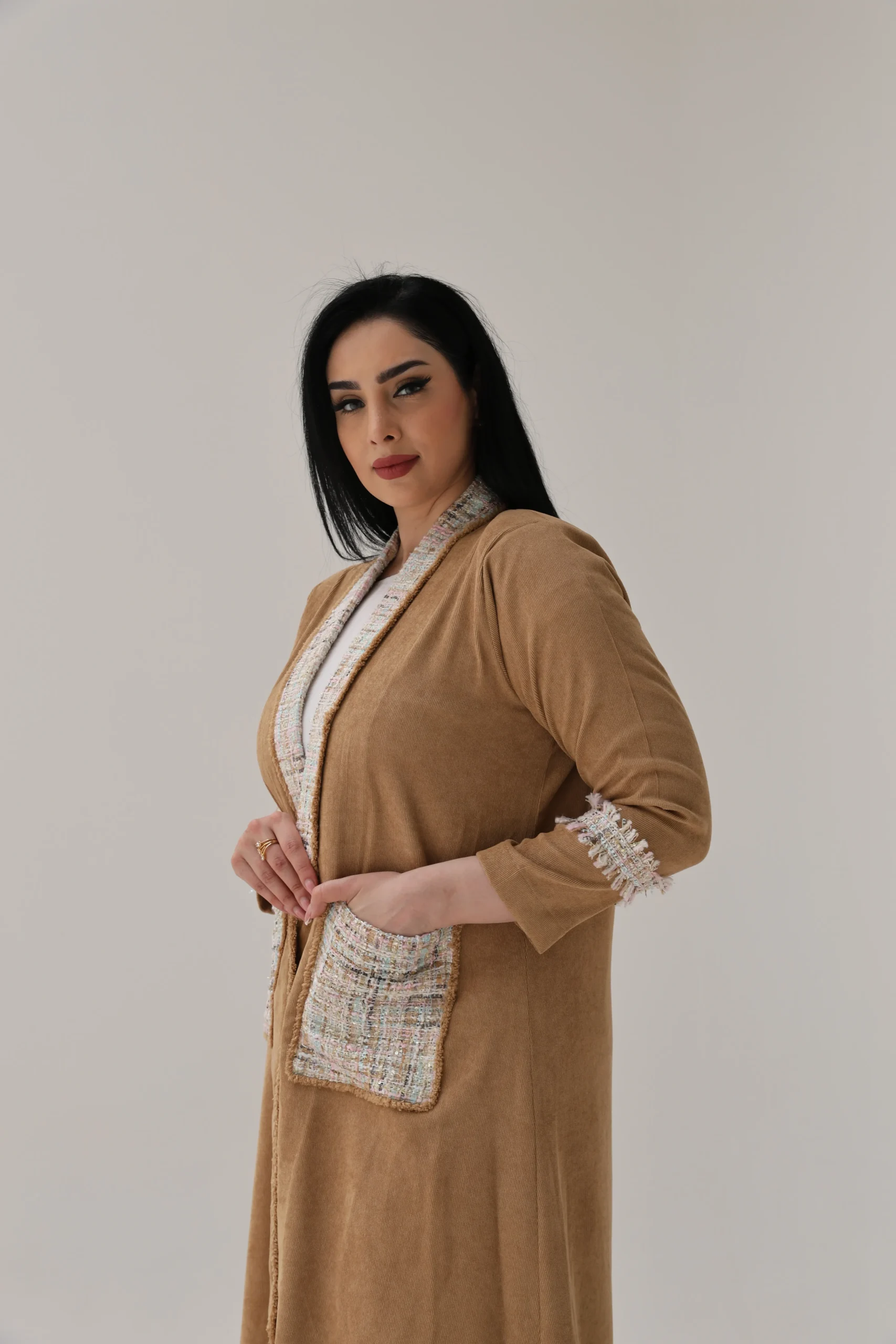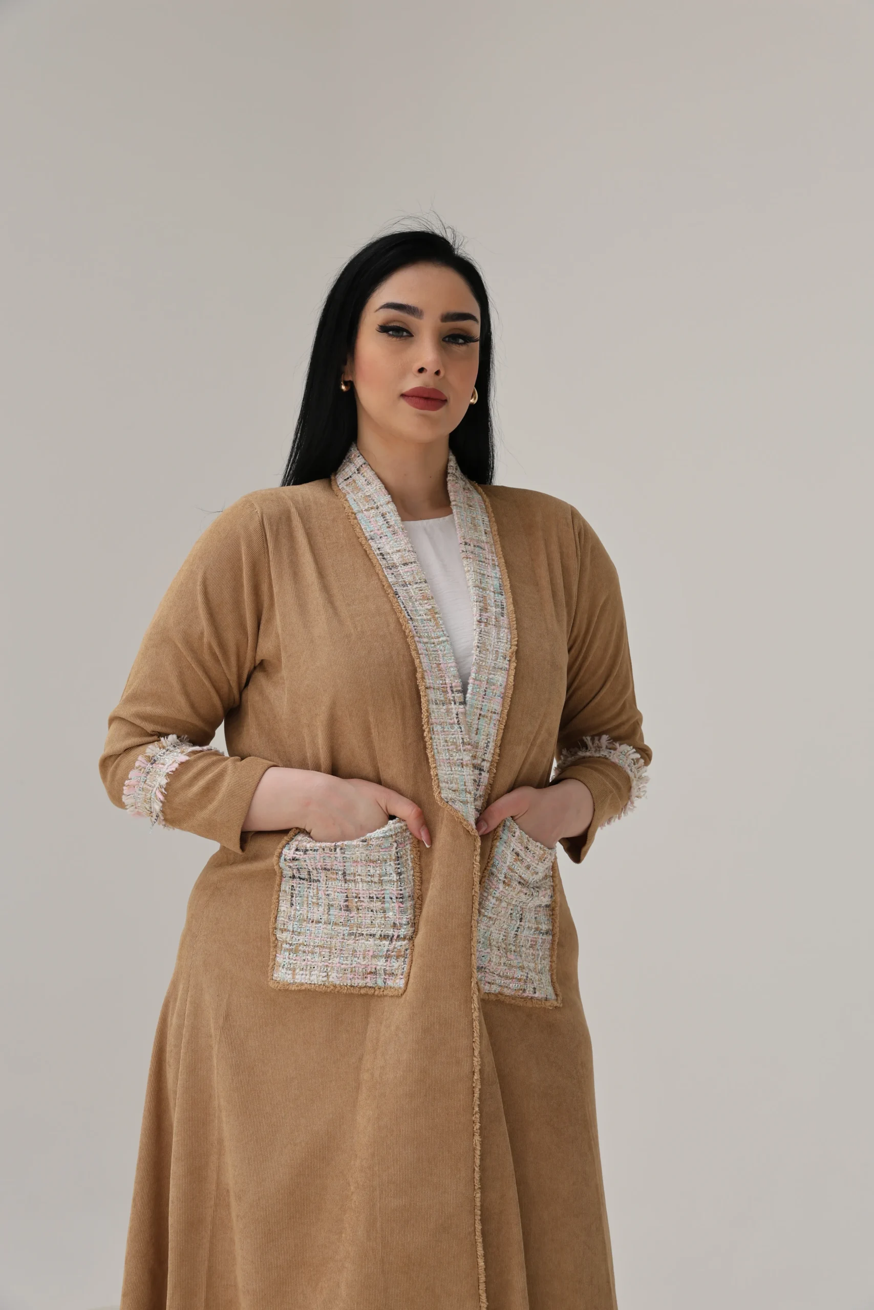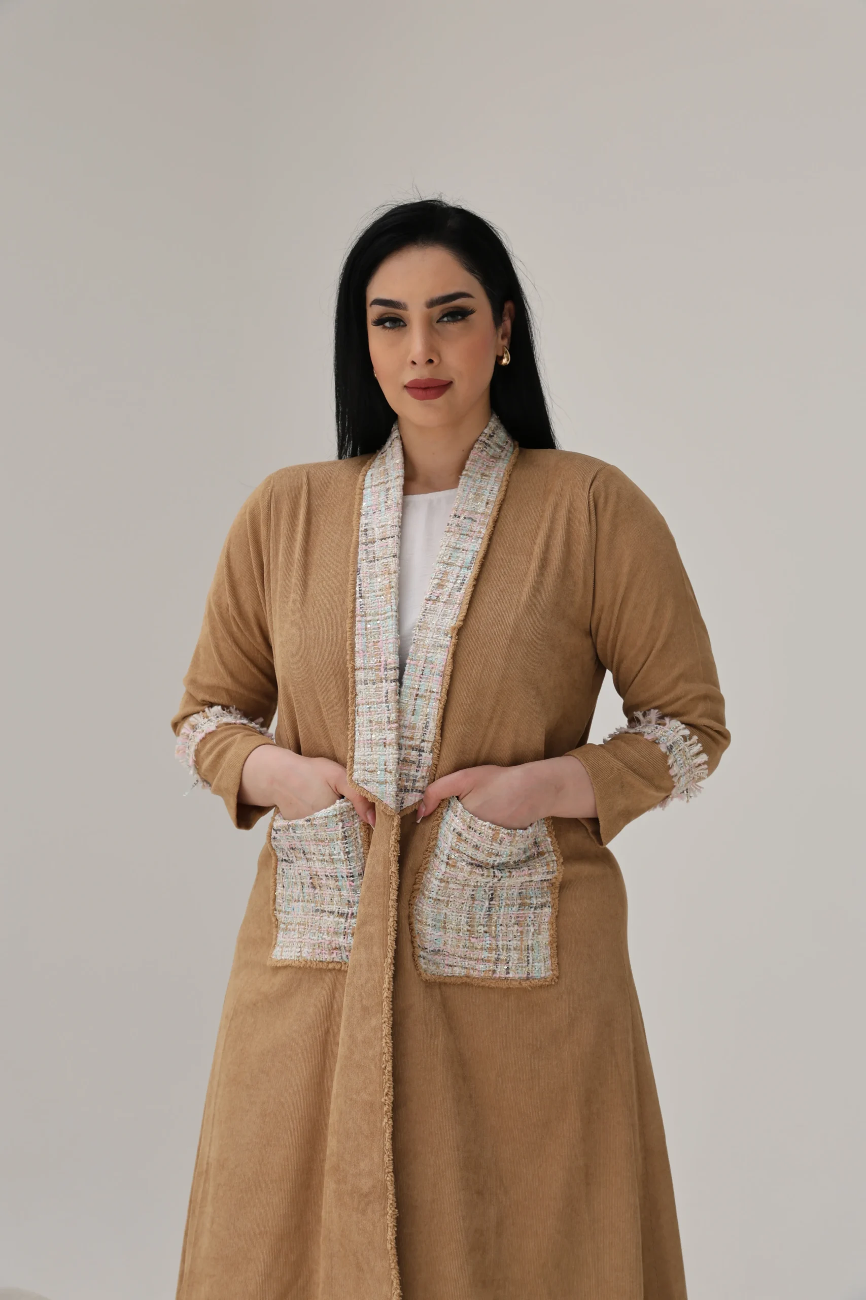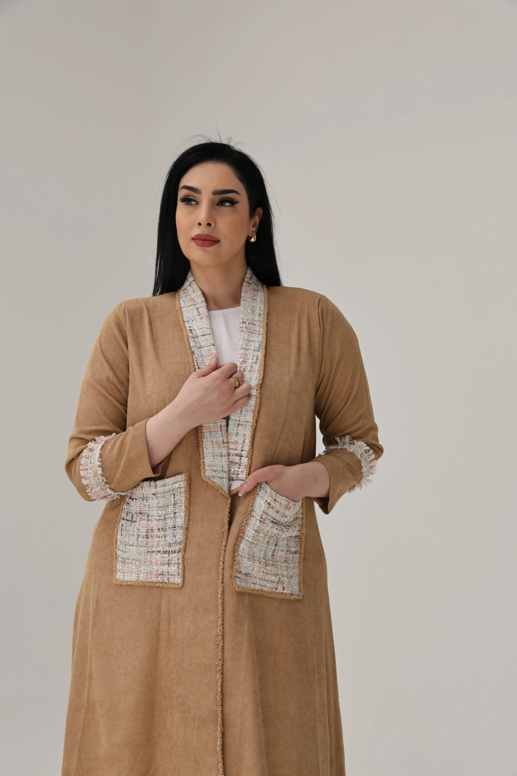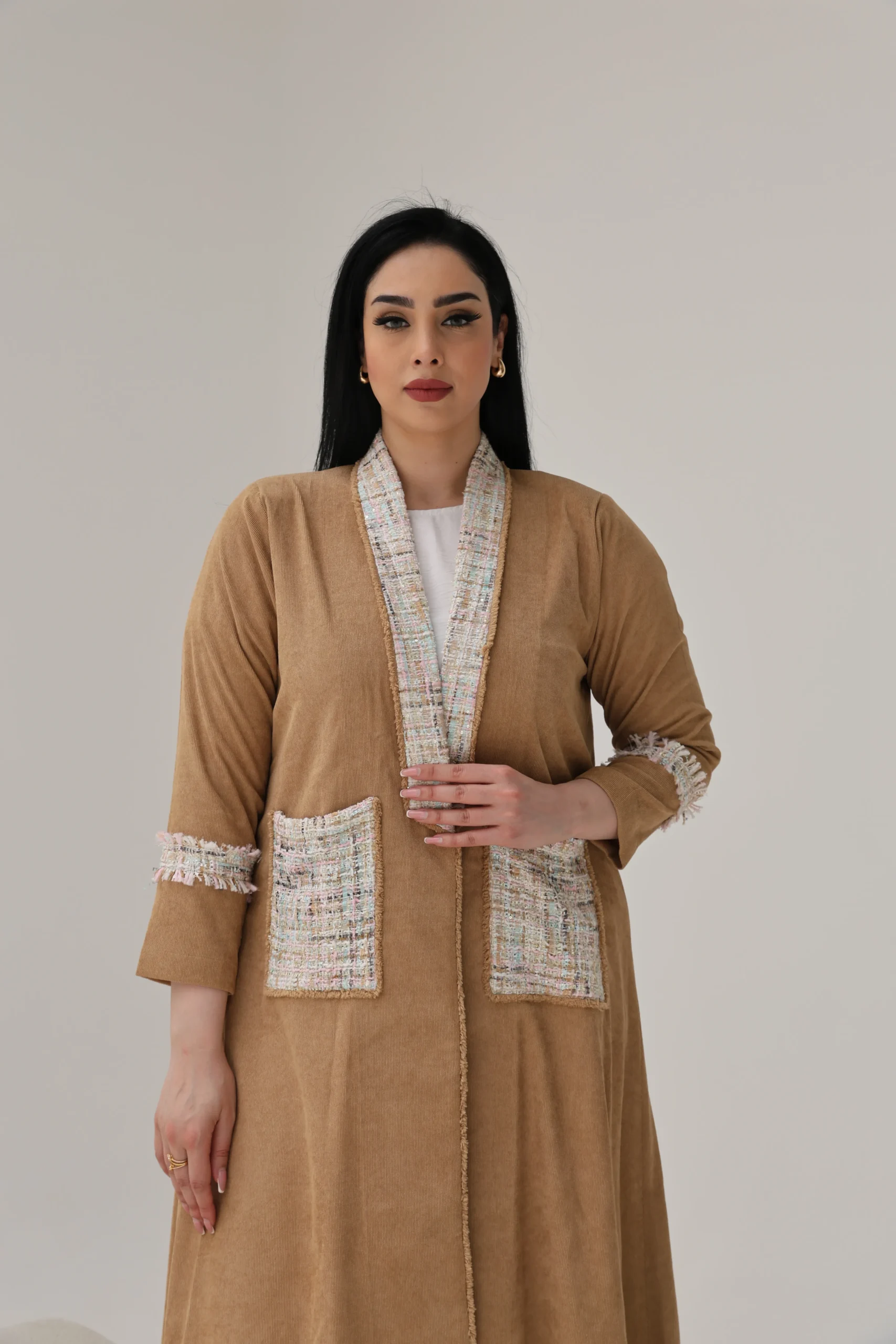 The highlight is the rich tweed accents—tracing the collar seamlessly down to the pockets, framing the front with refined texture. Matching tweed panels halfway down each sleeve add balance and visual interest, giving this abaya a polished yet contemporary feel.