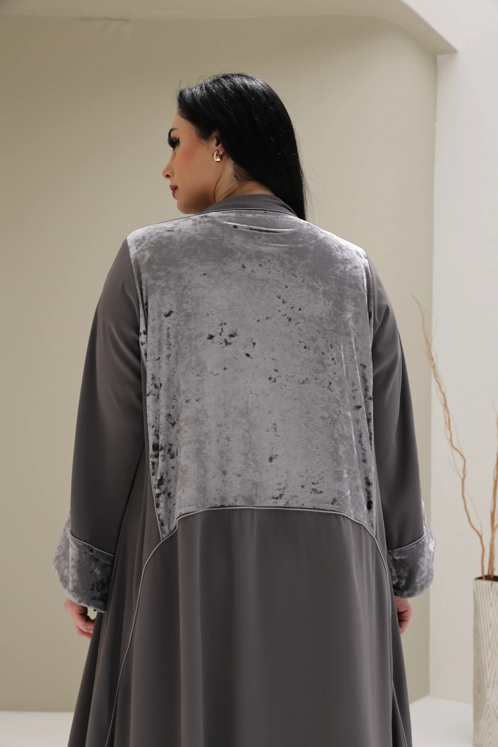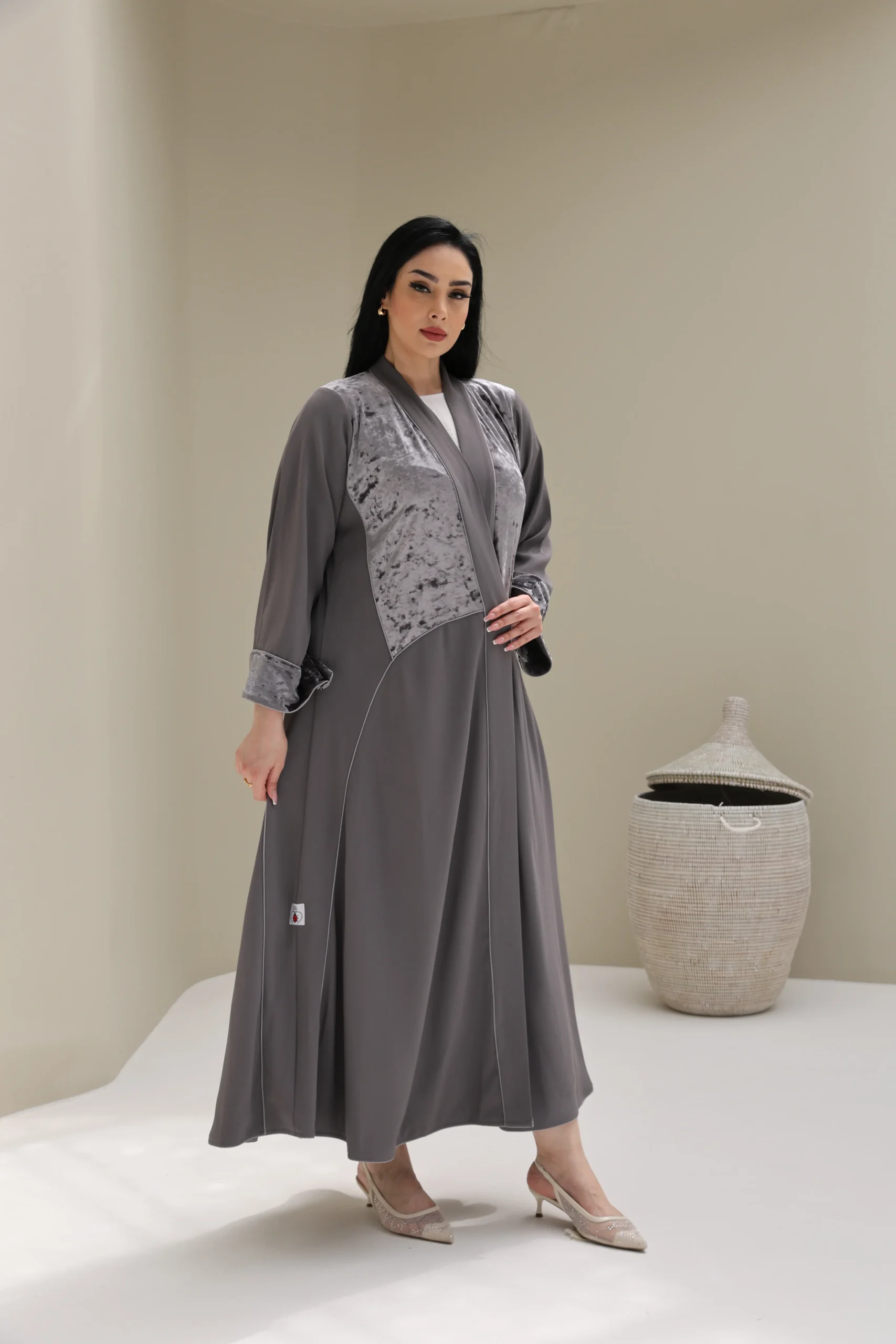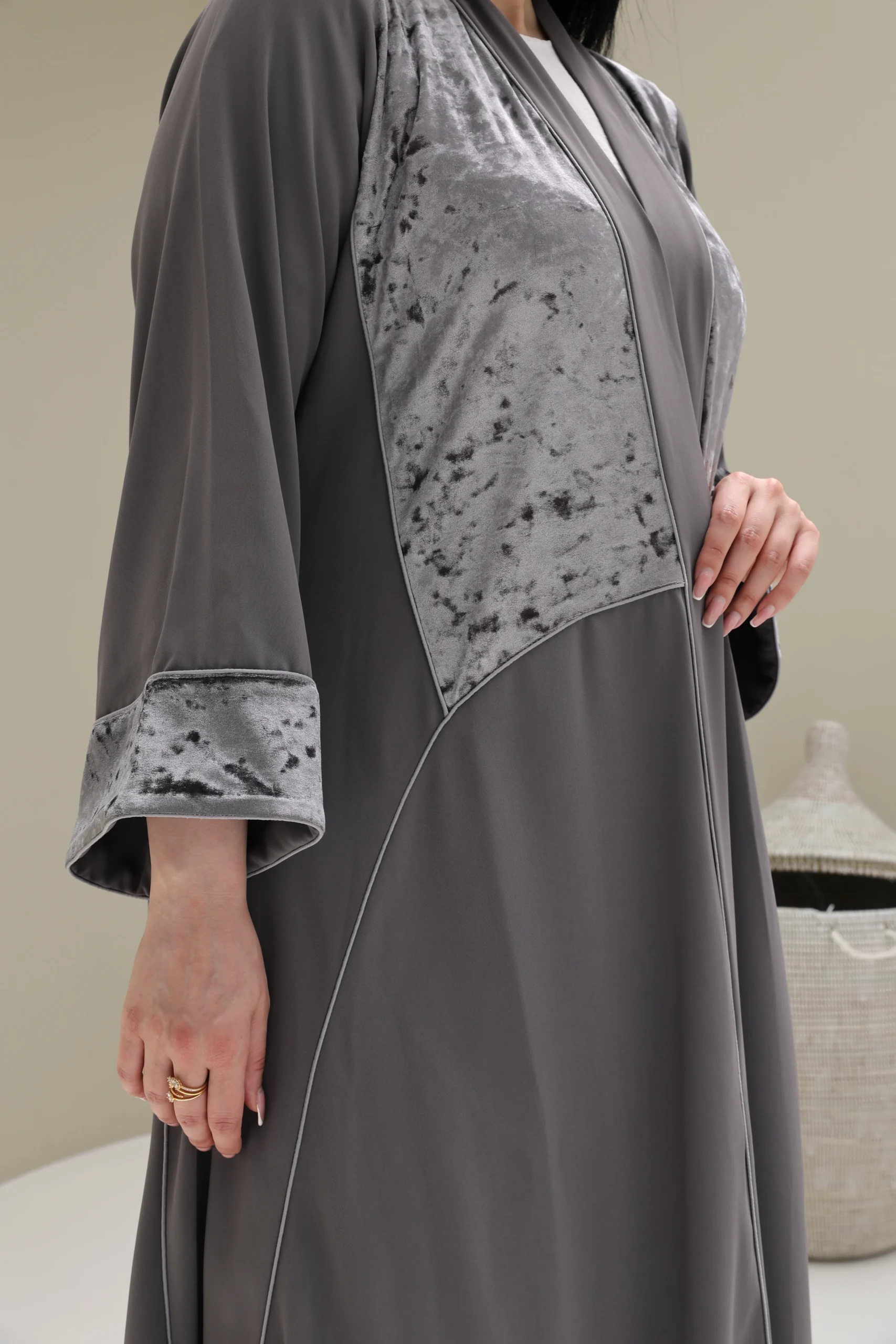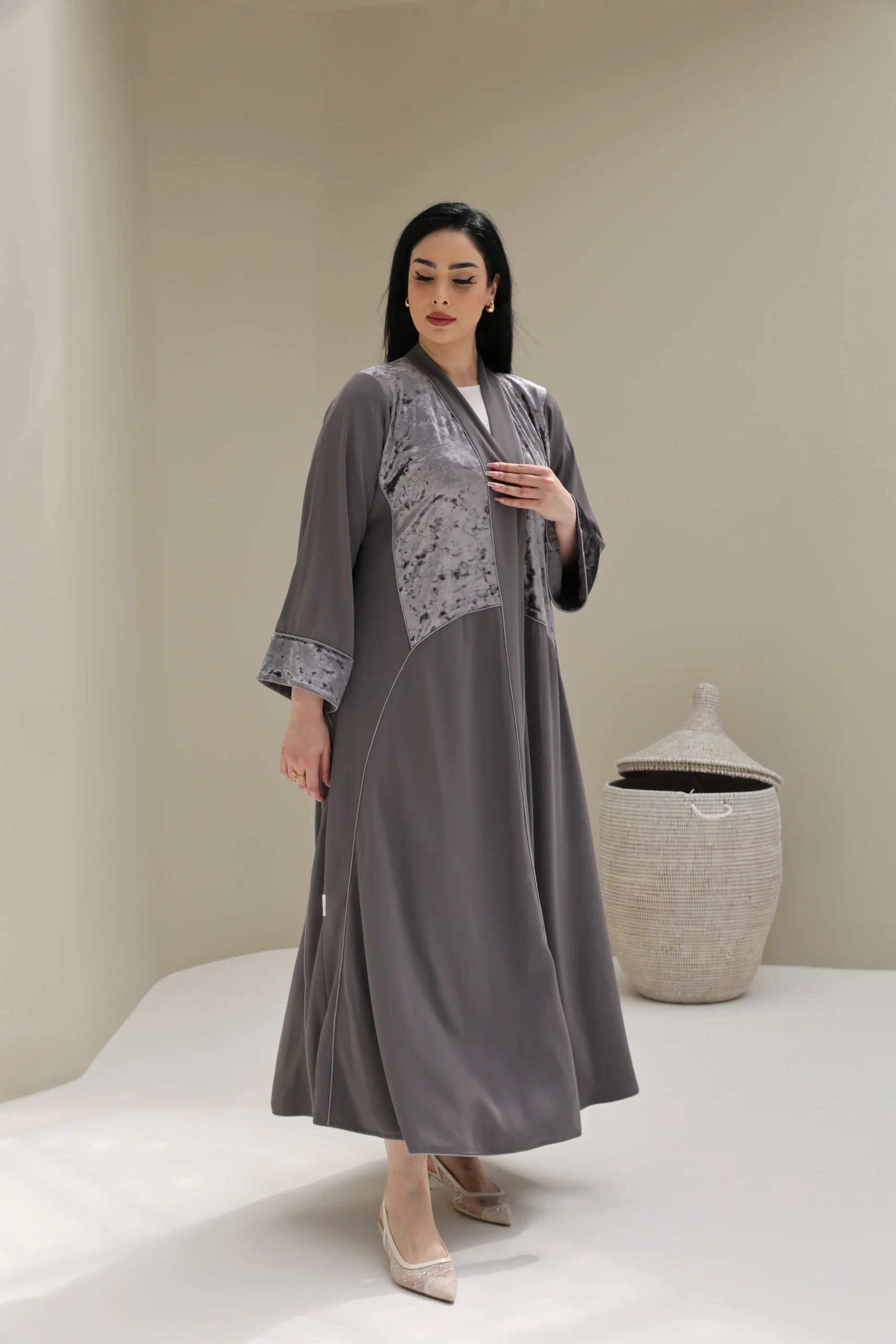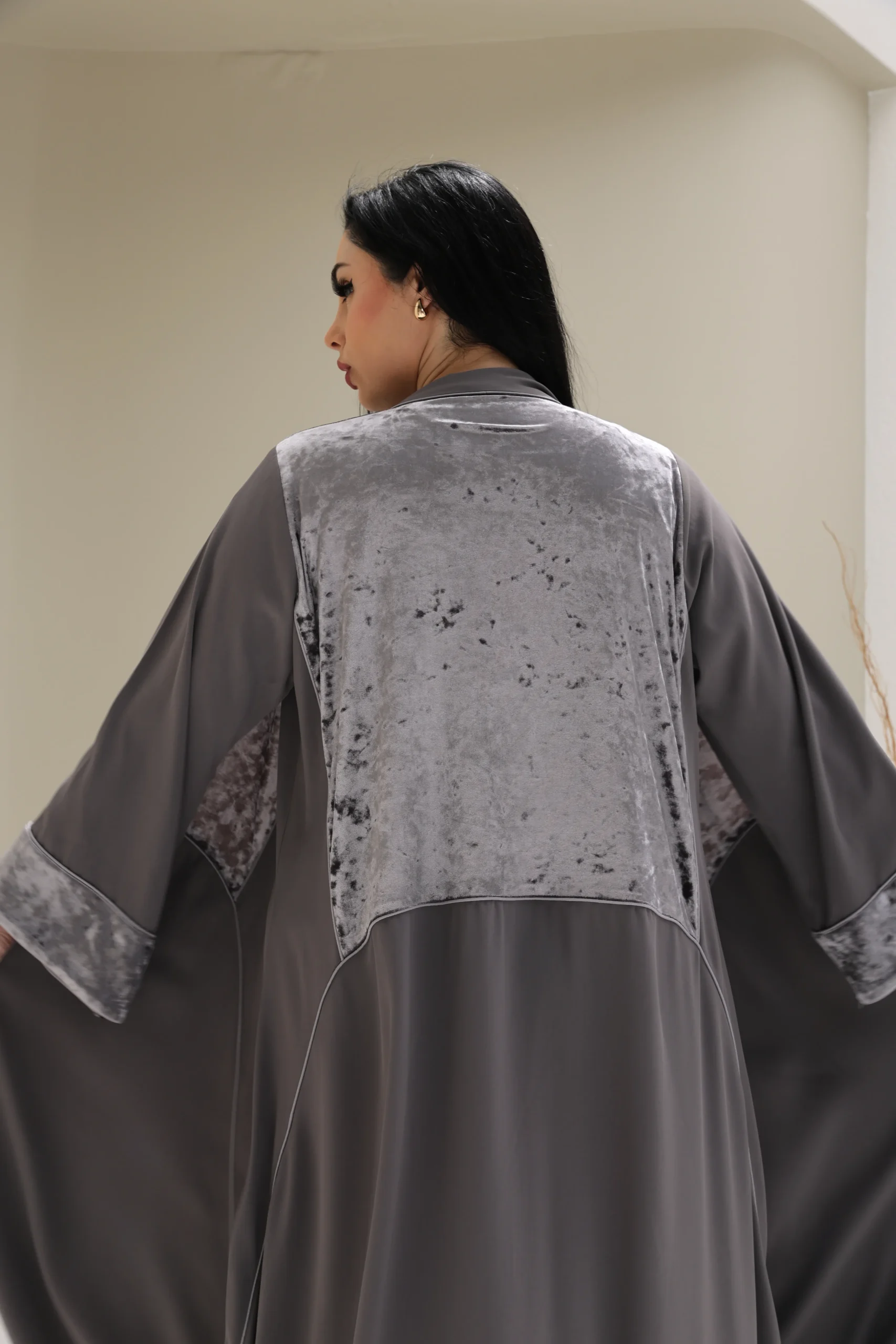 Grey & Beige Cashmere Abaya with Triangular Breastplate Panel – Luxe Edition