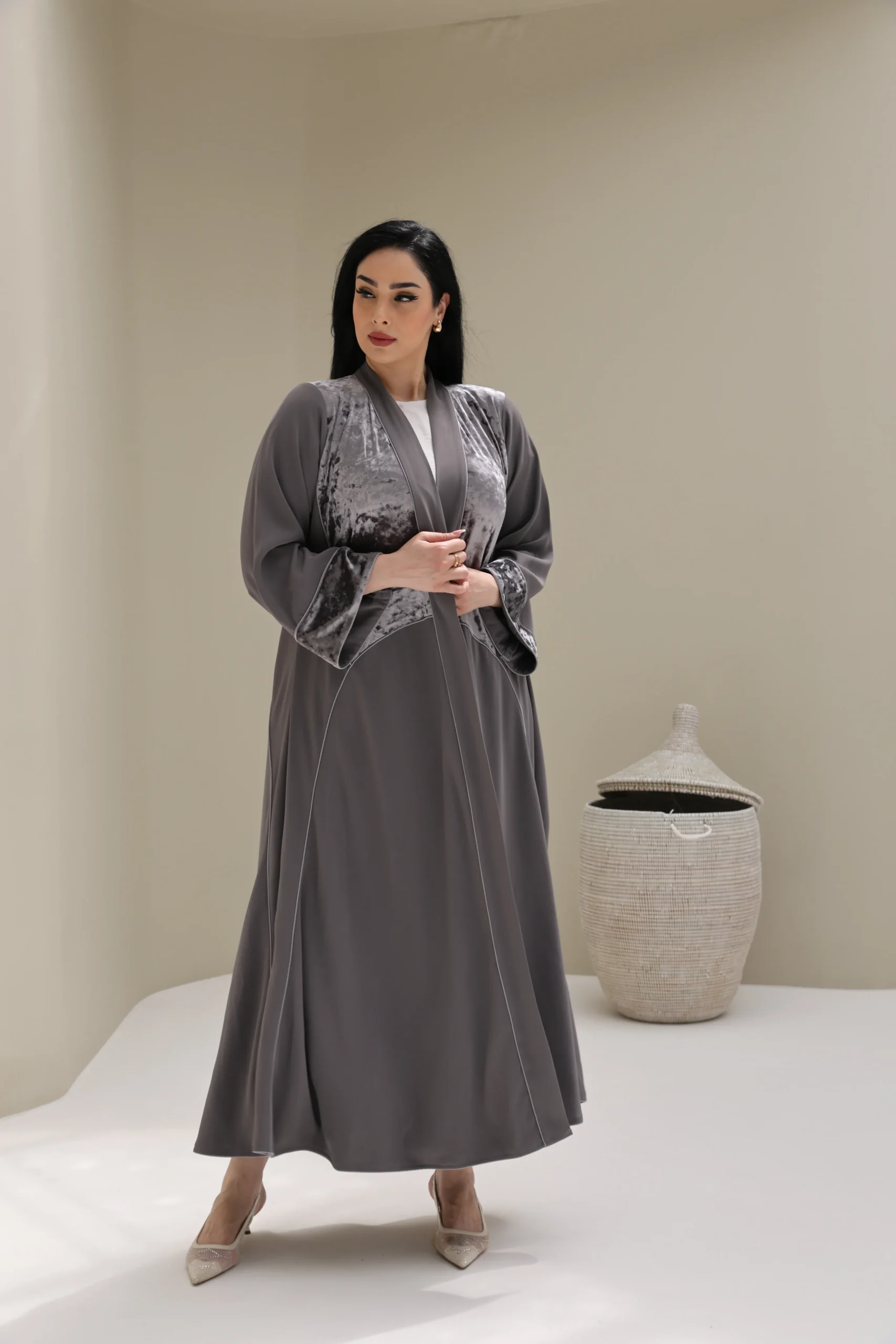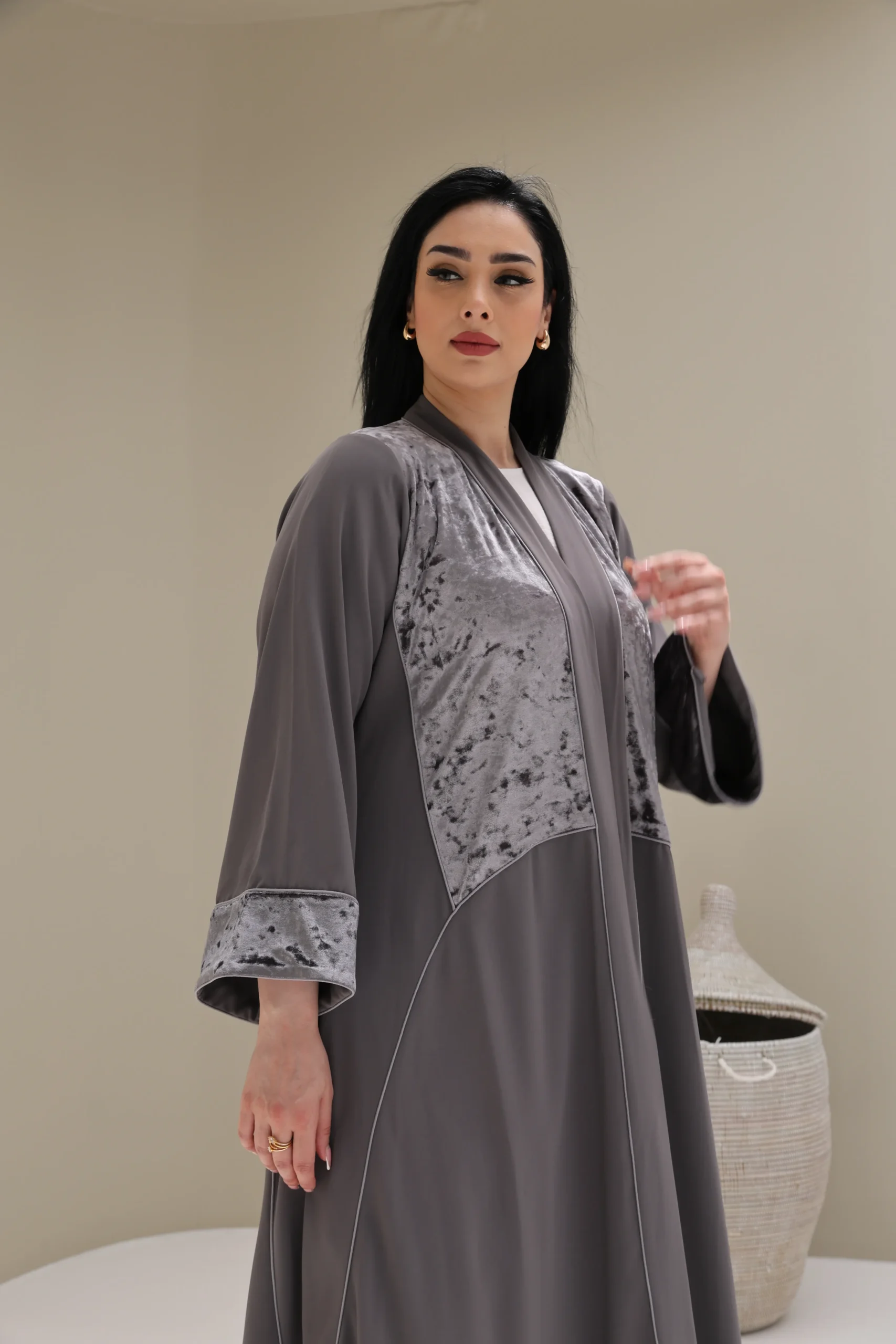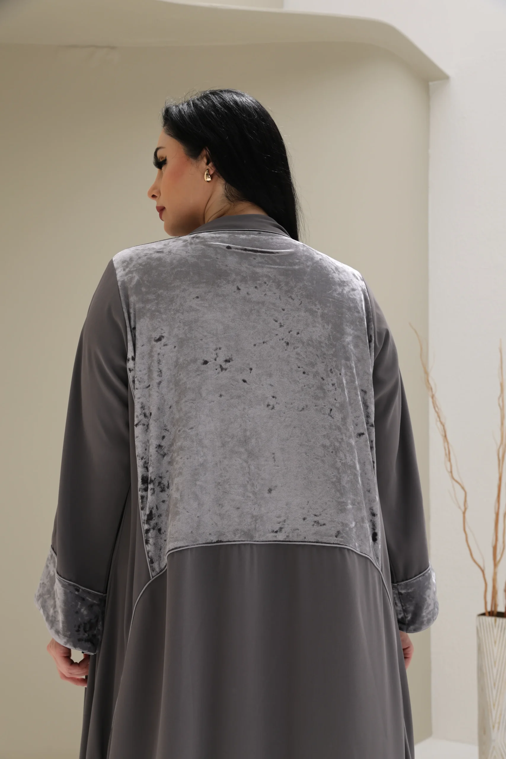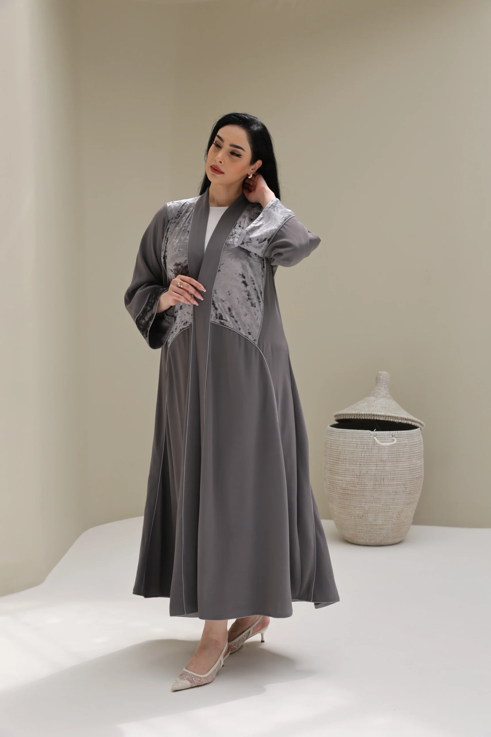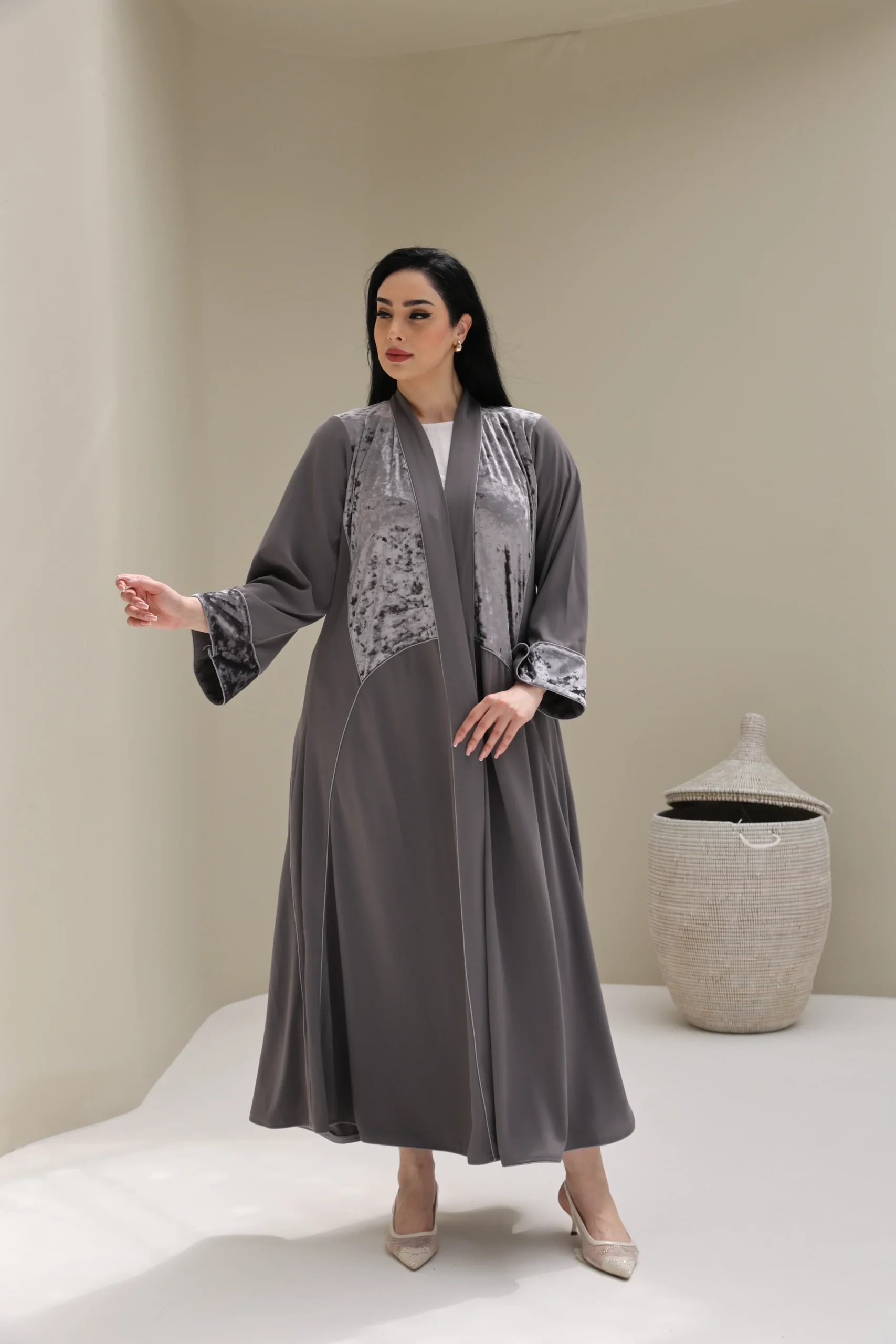 Grey & Beige Cashmere Abaya with Triangular Breastplate Panel – Luxe Edition