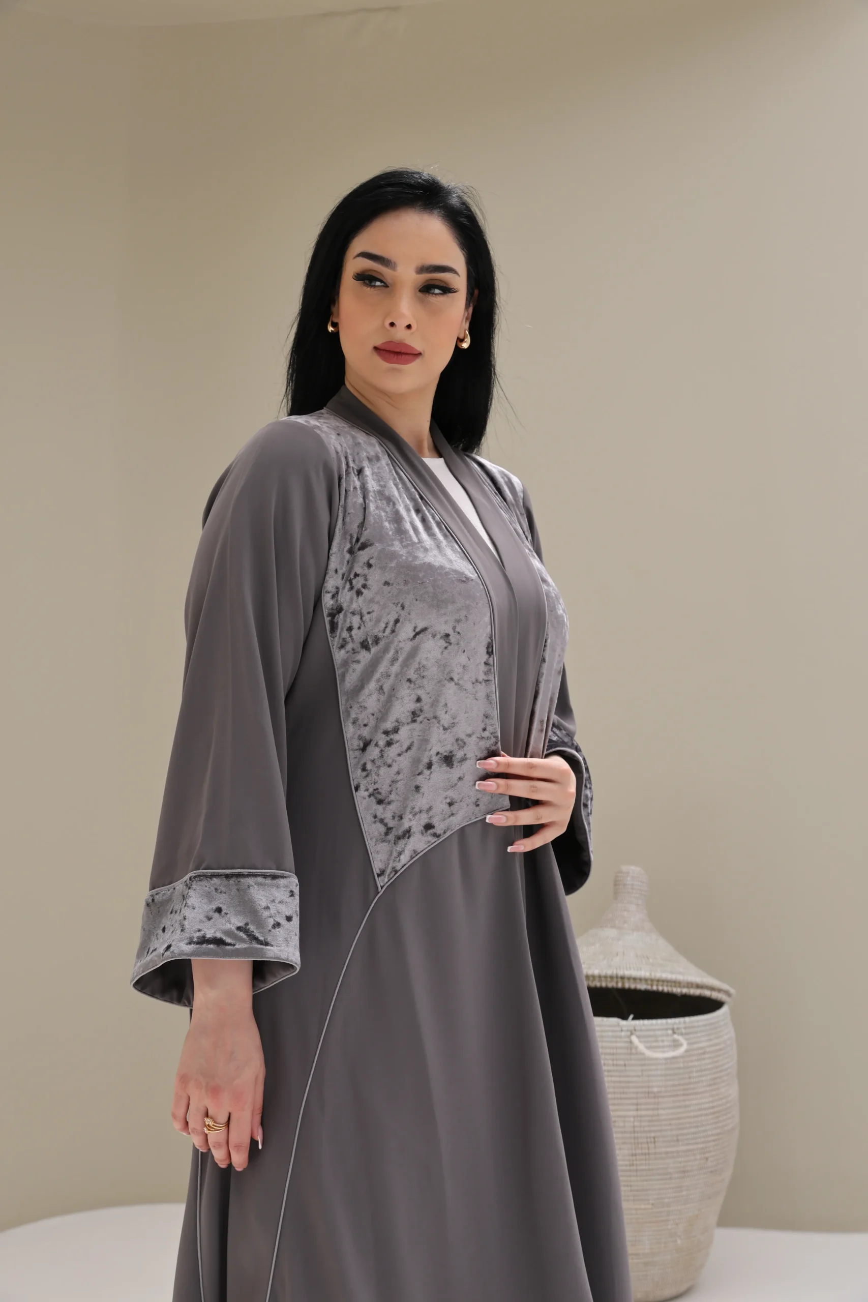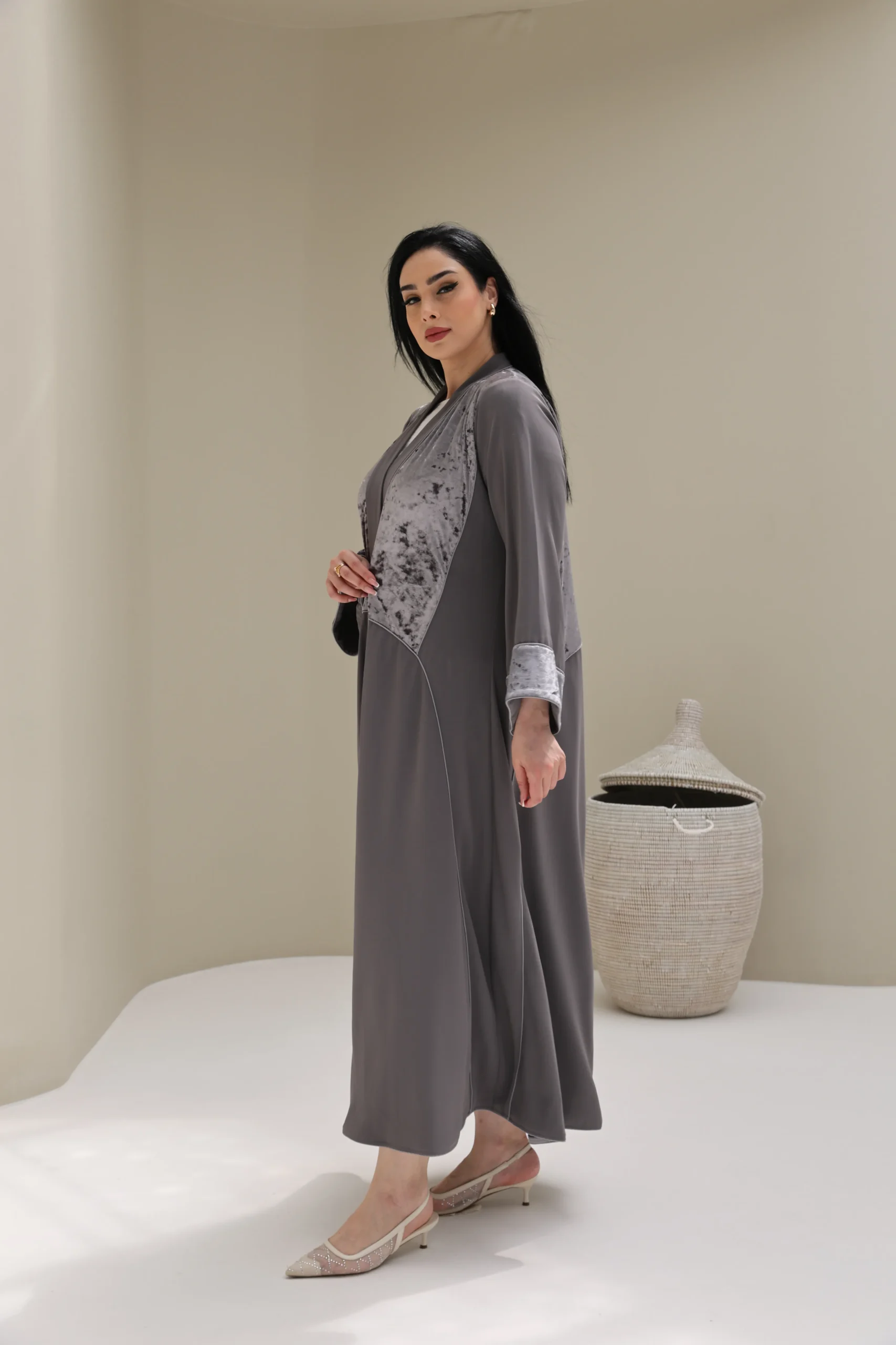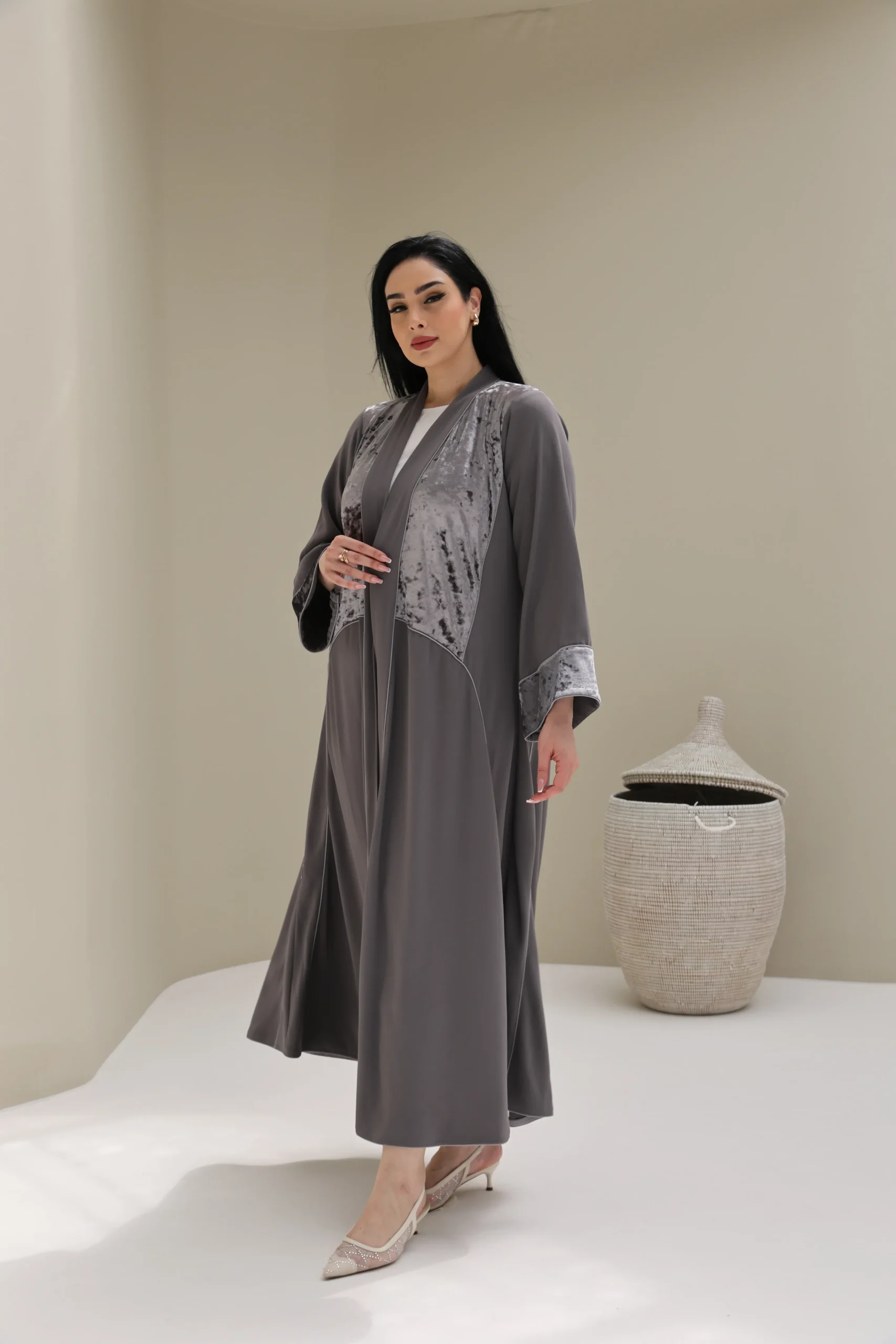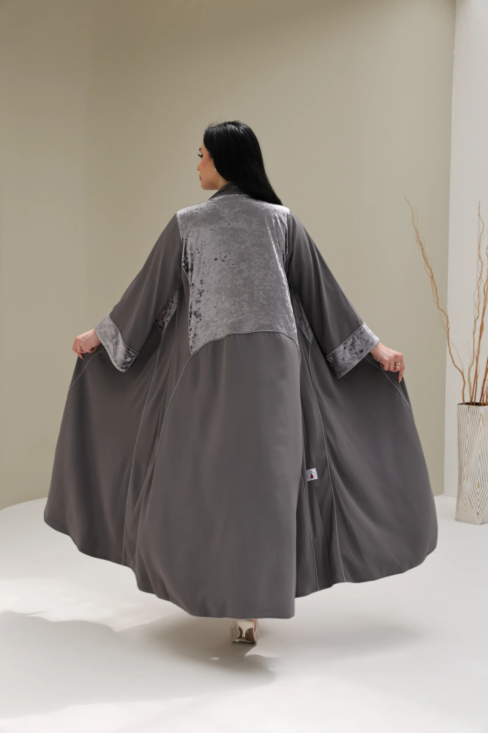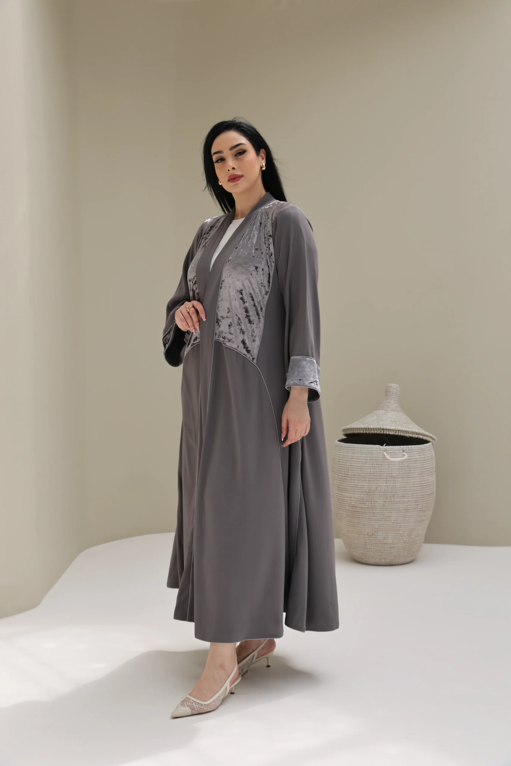 Grey & Beige Cashmere Abaya with Triangular Breastplate Panel – Luxe Edition