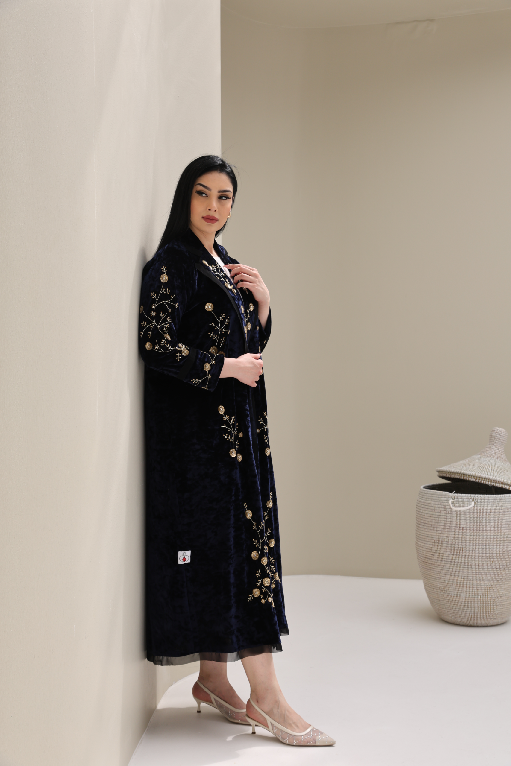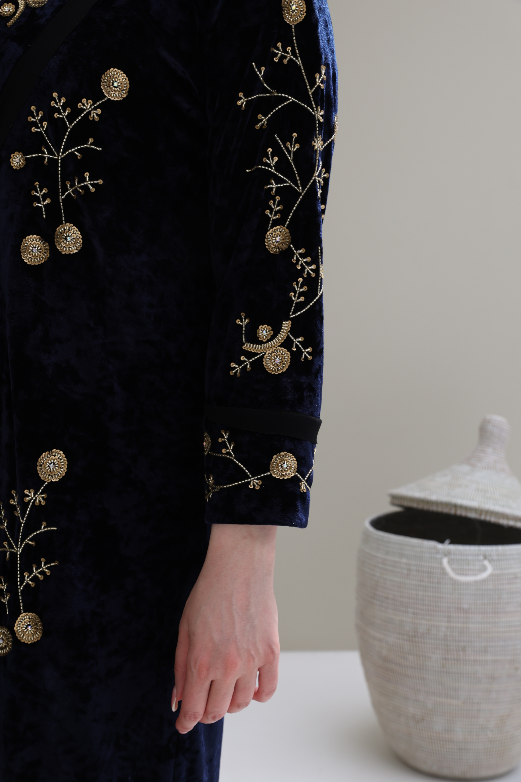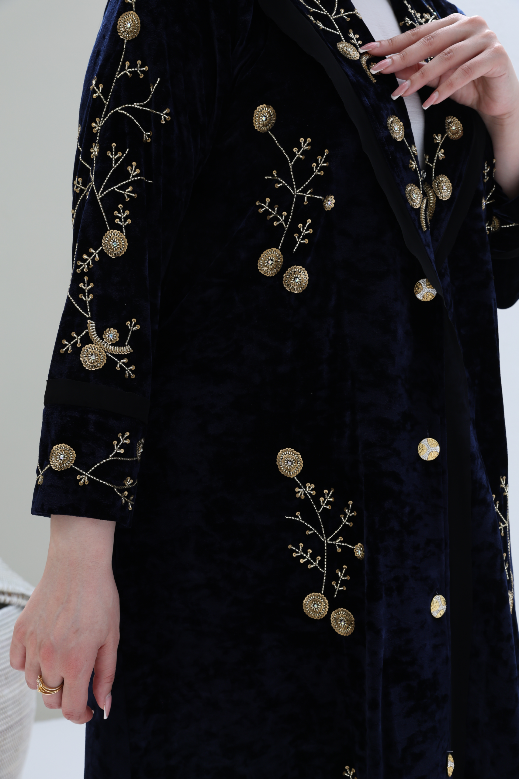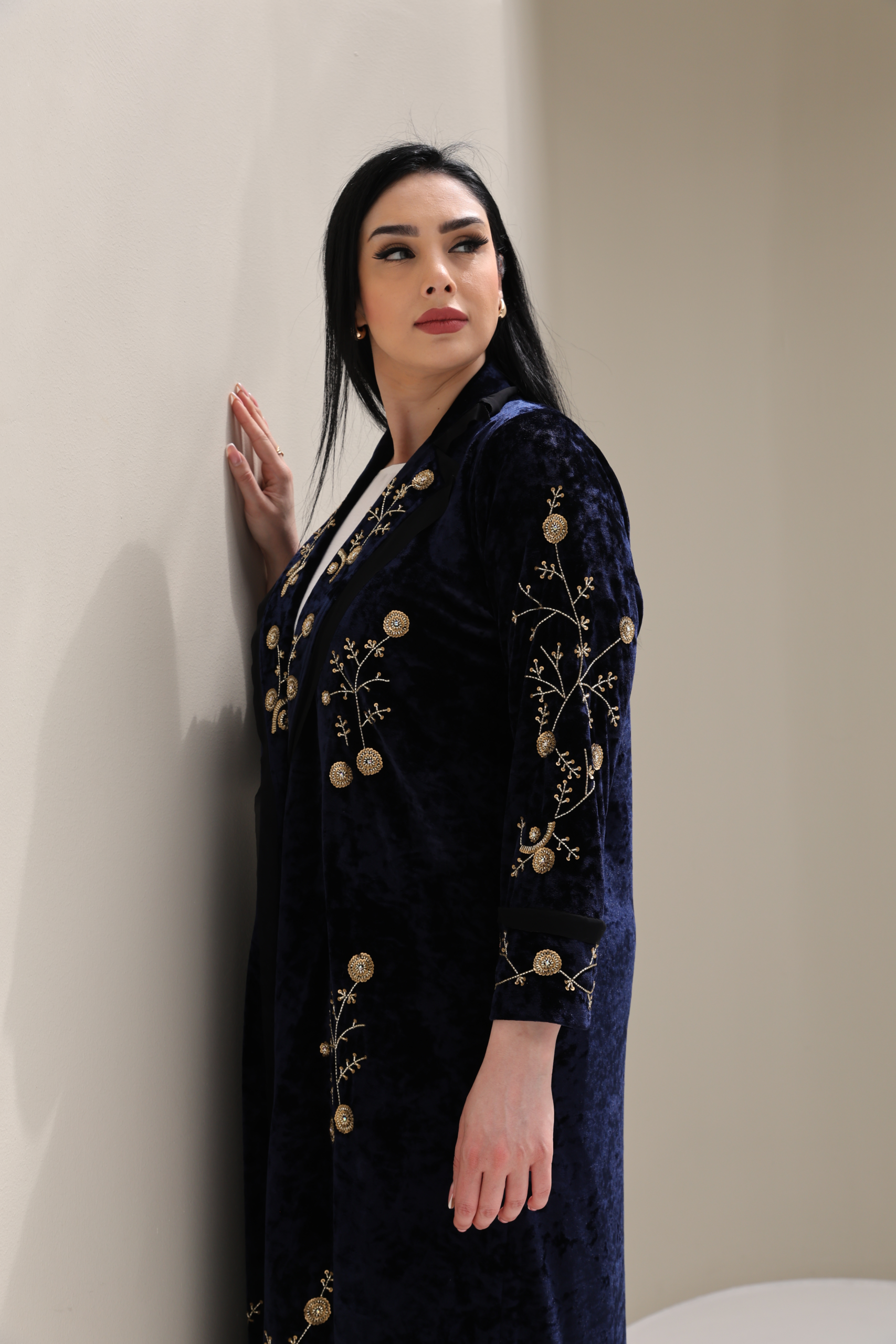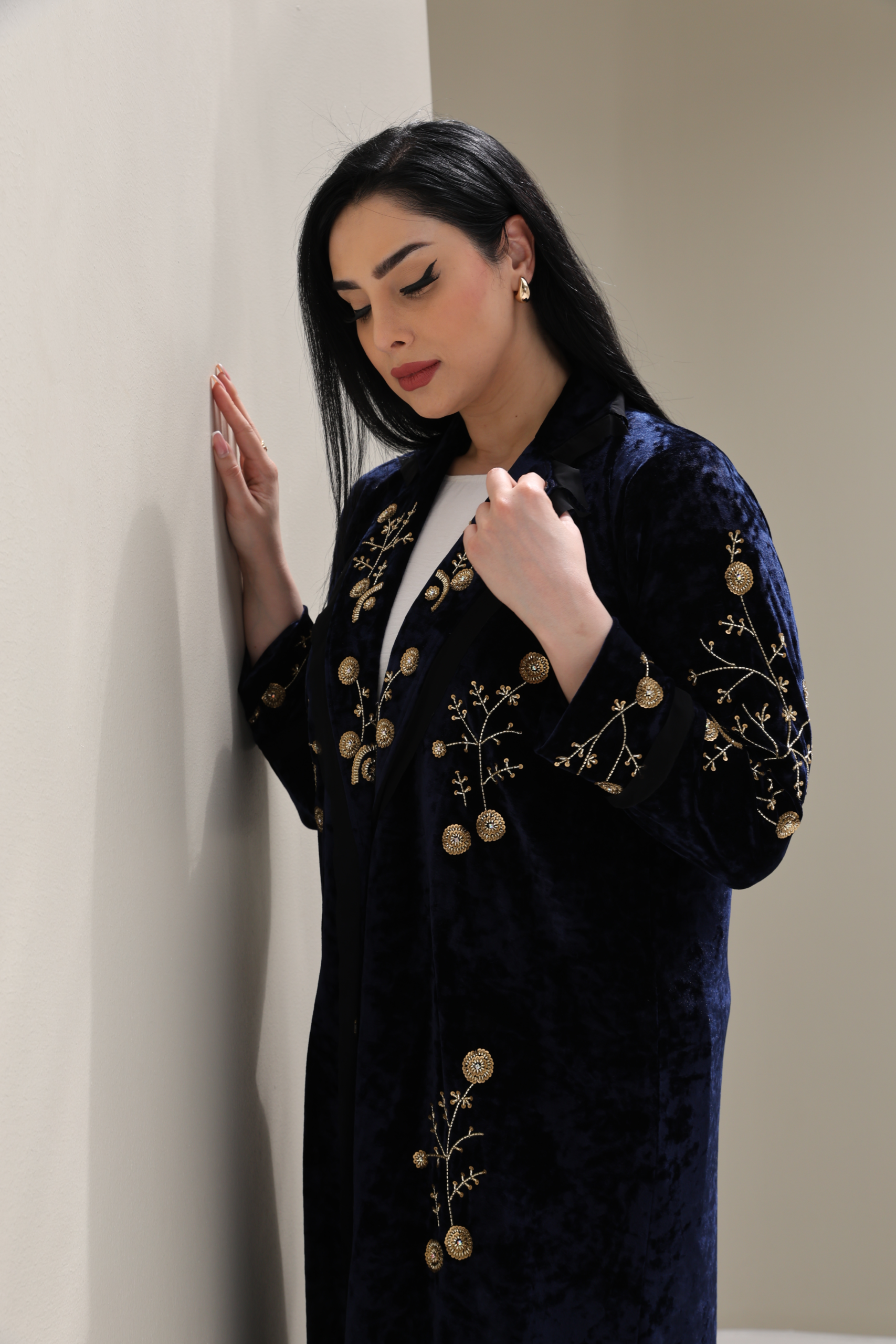 Navy Velvet Abaya with Golden Embroidery – Luxe Edition