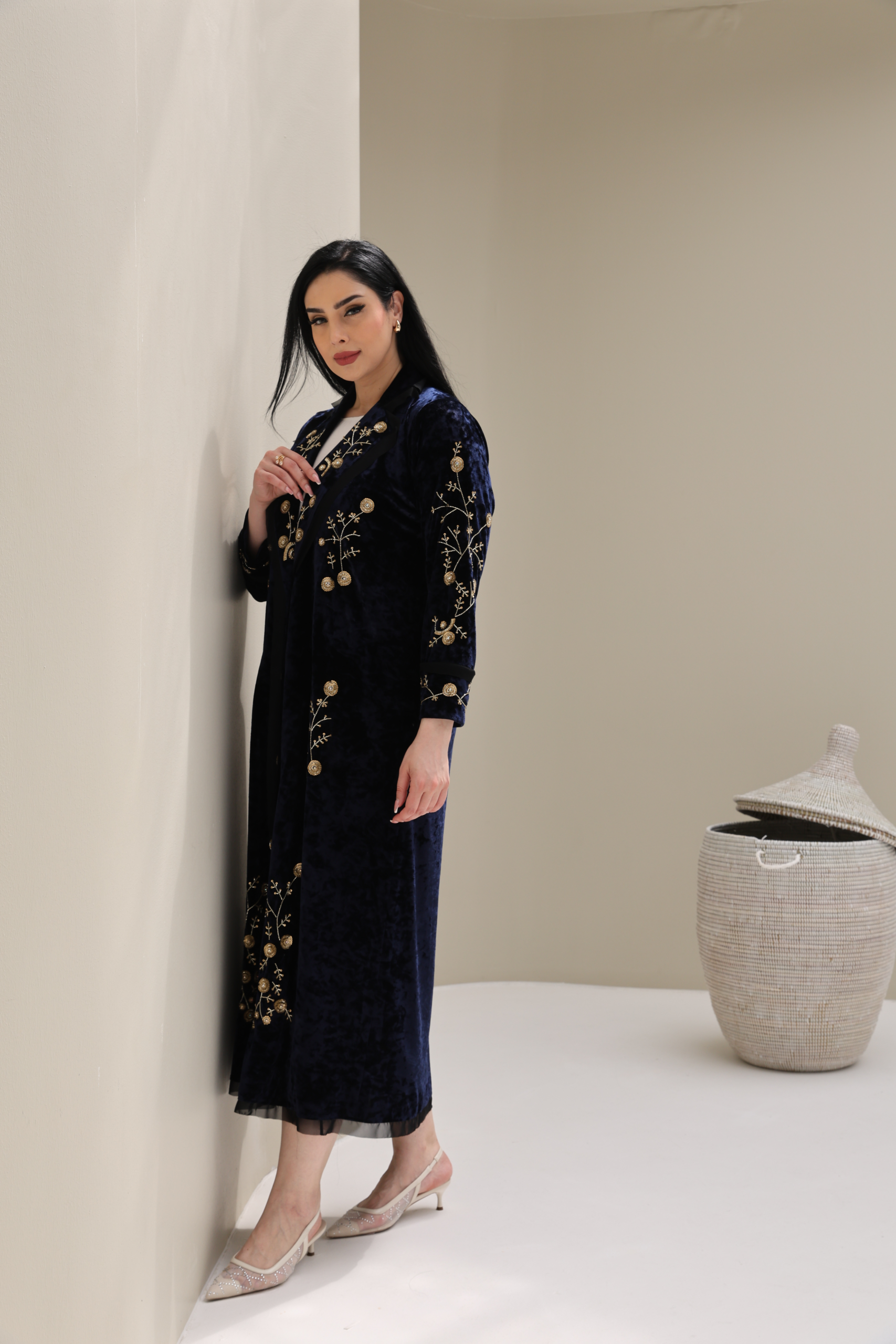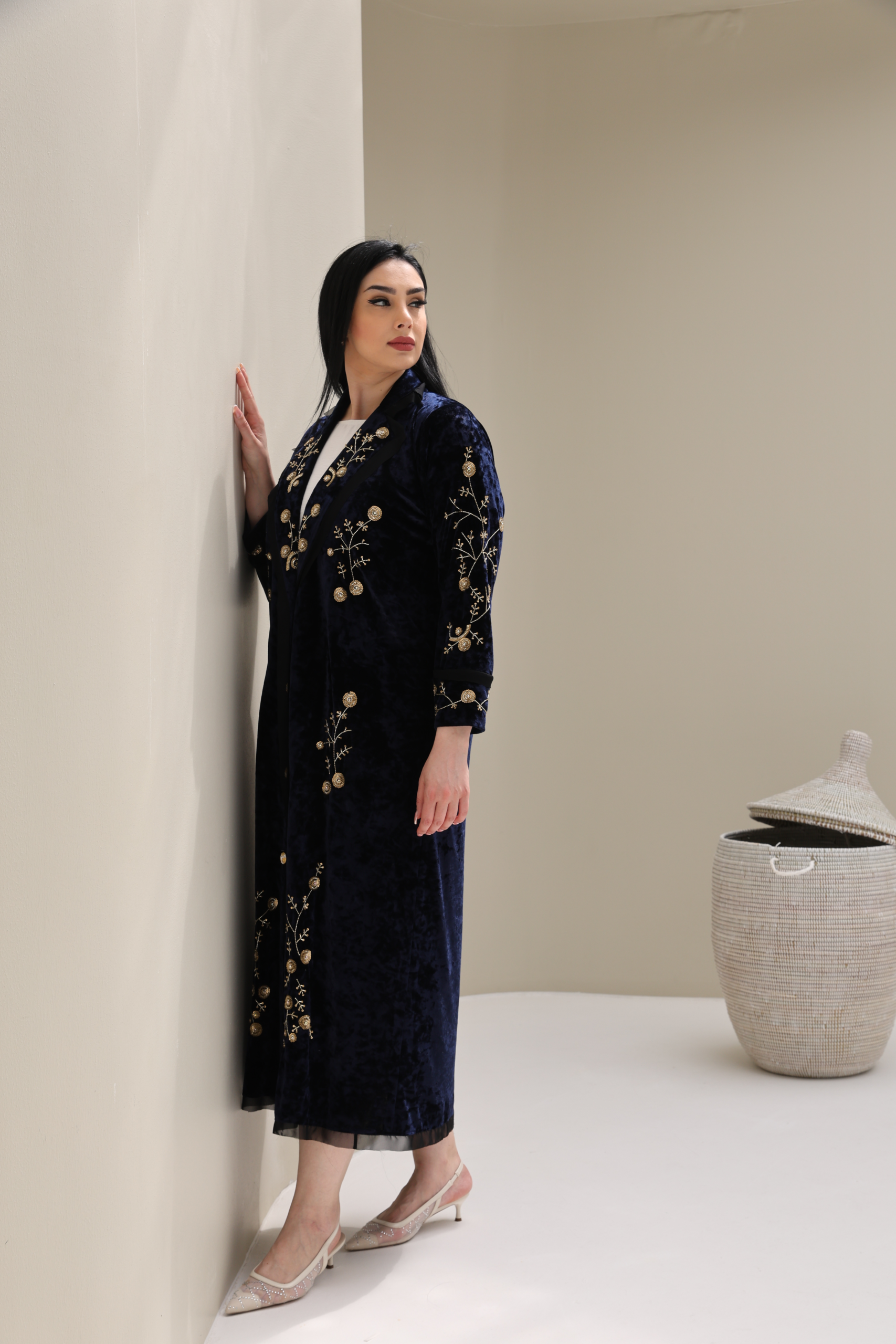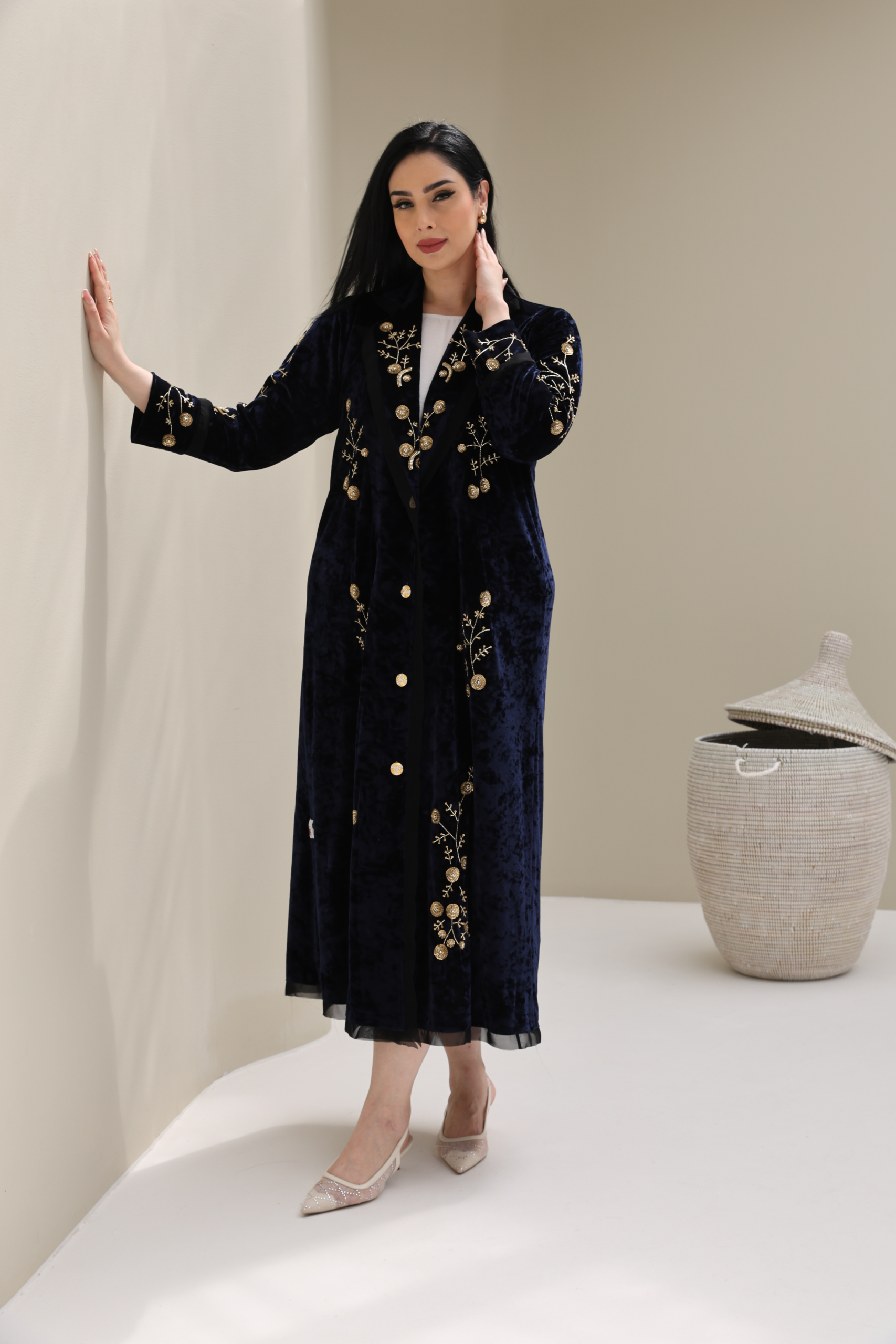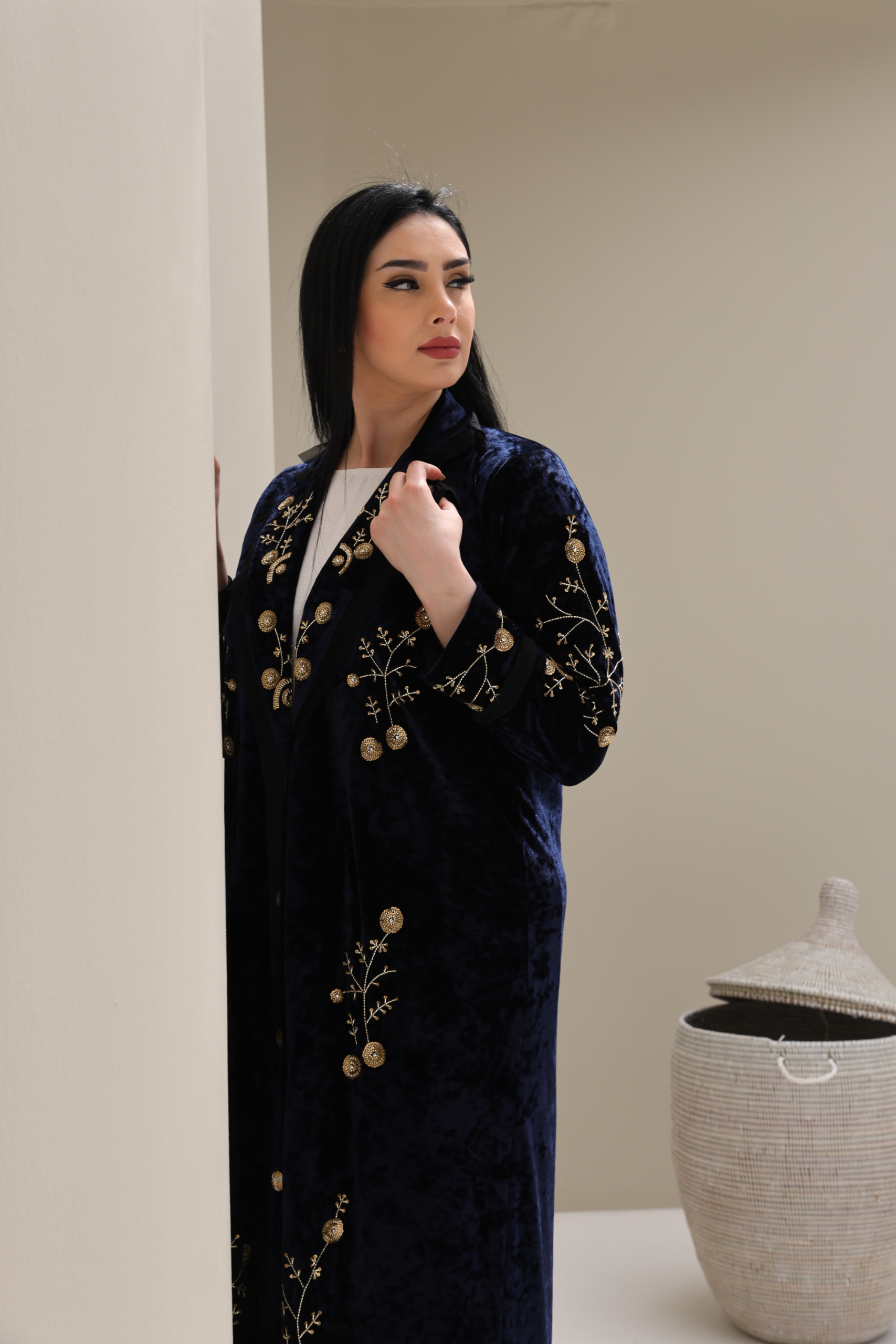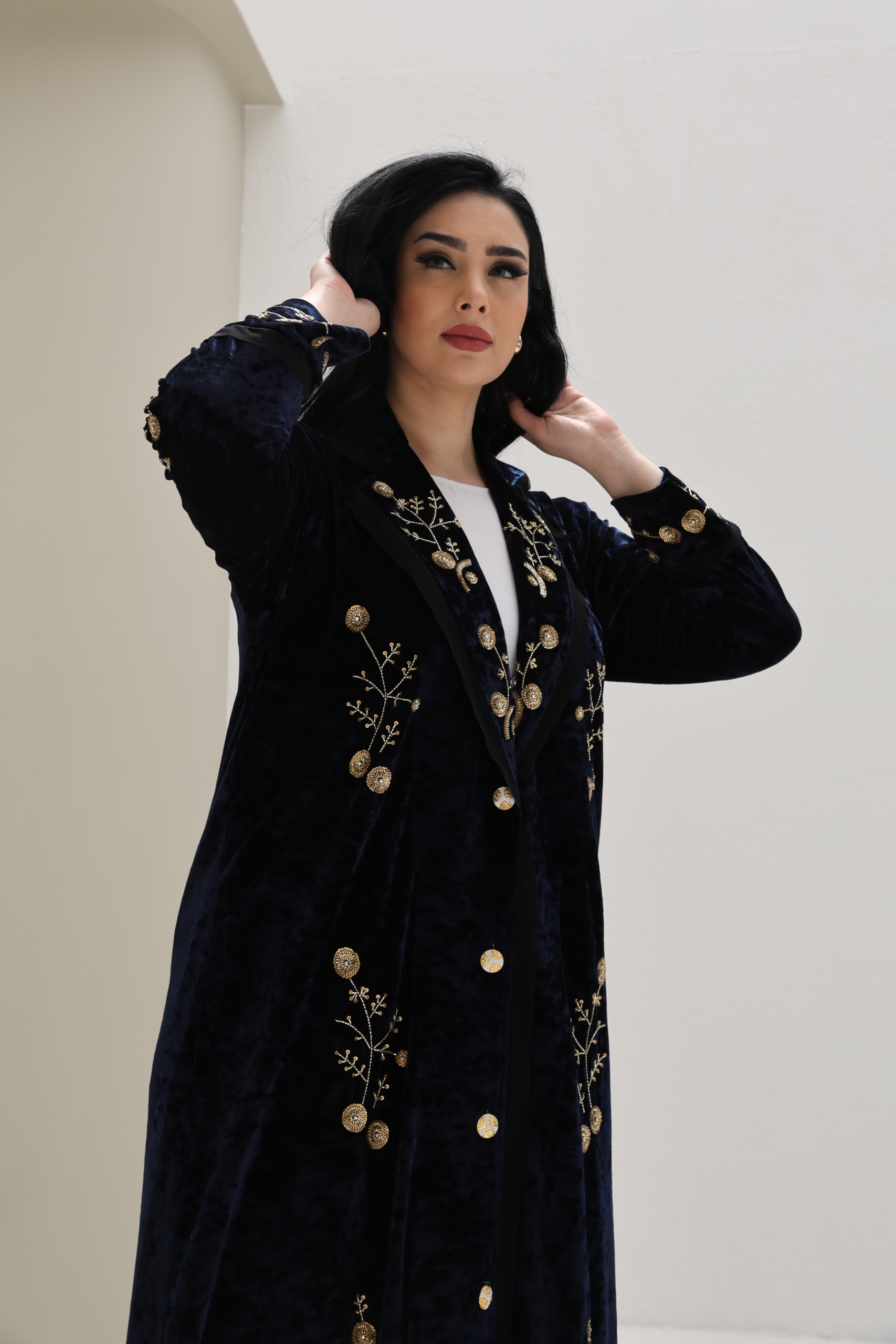 Navy Velvet Abaya with Golden Embroidery – Luxe Edition