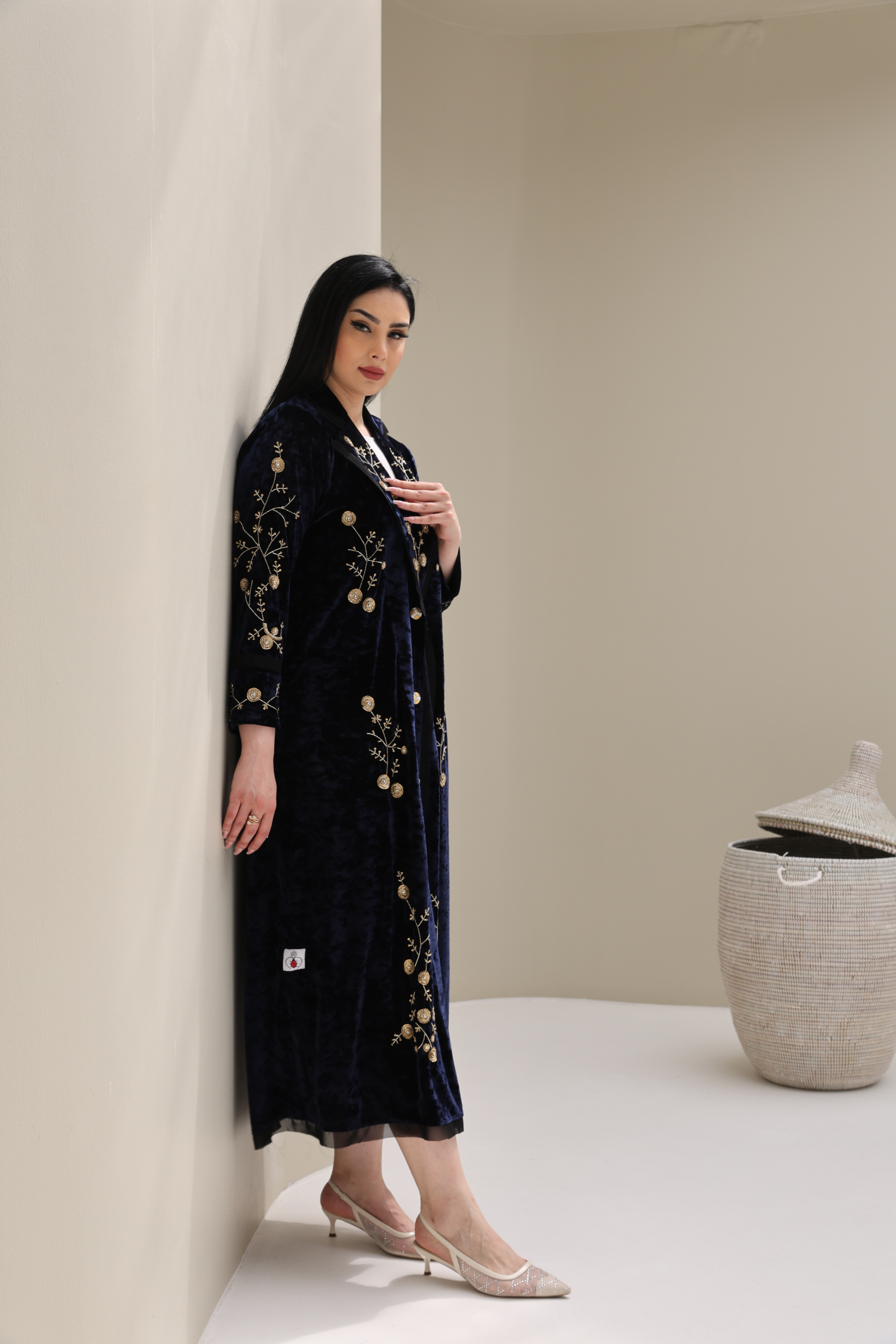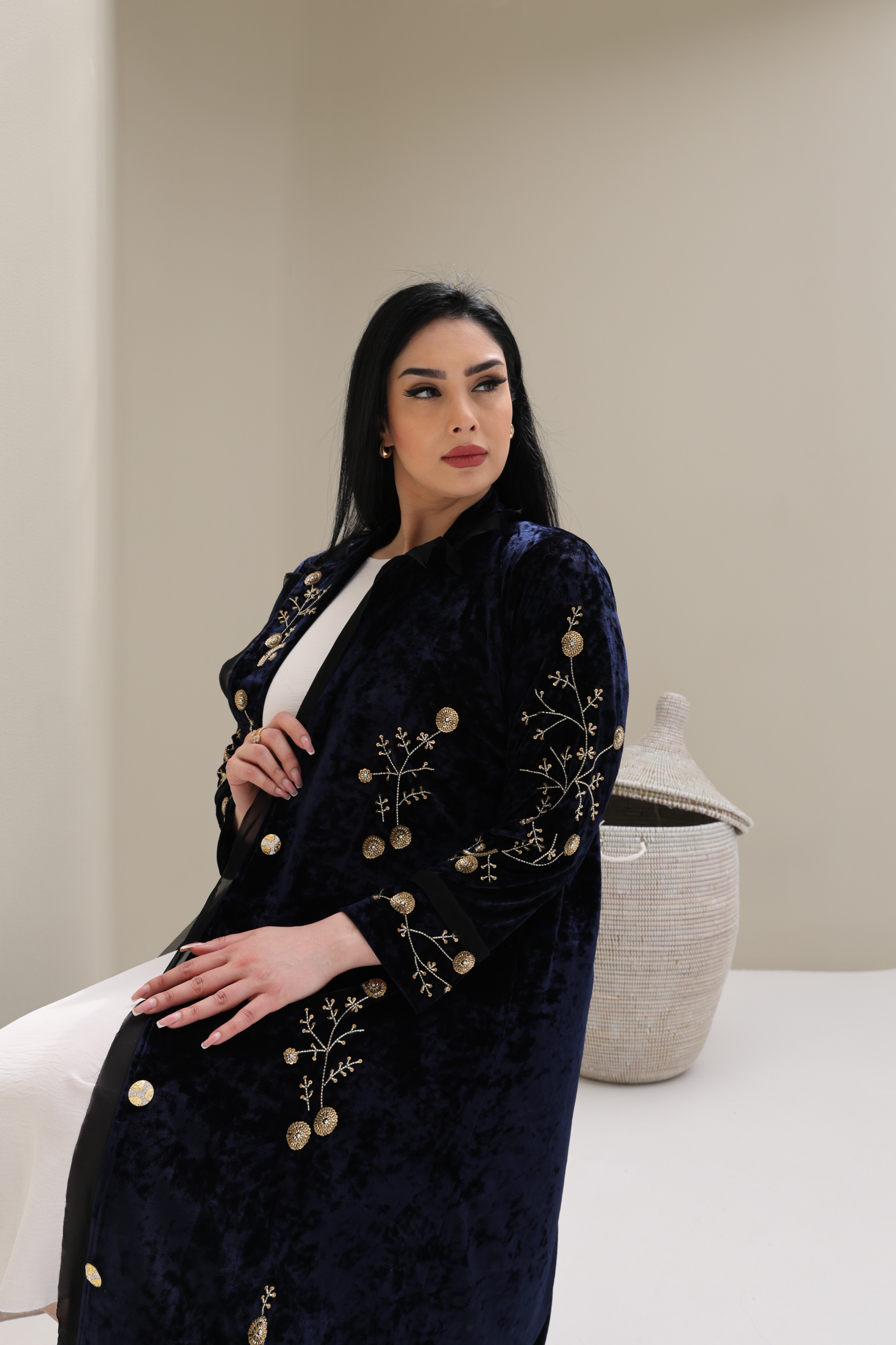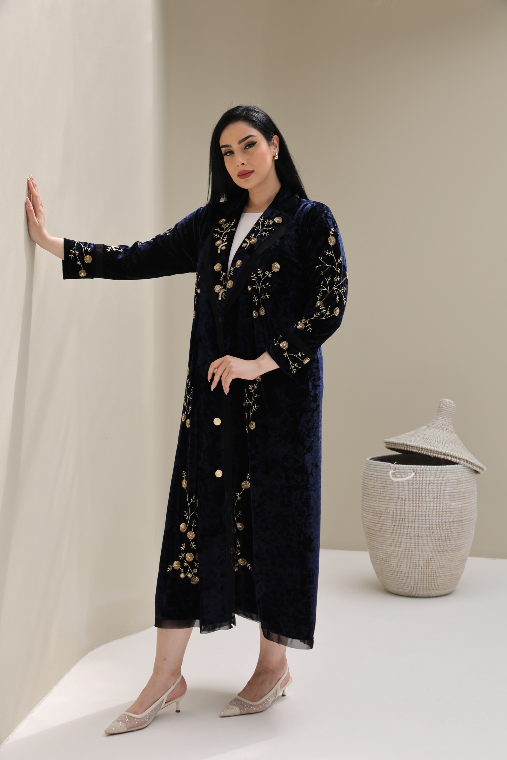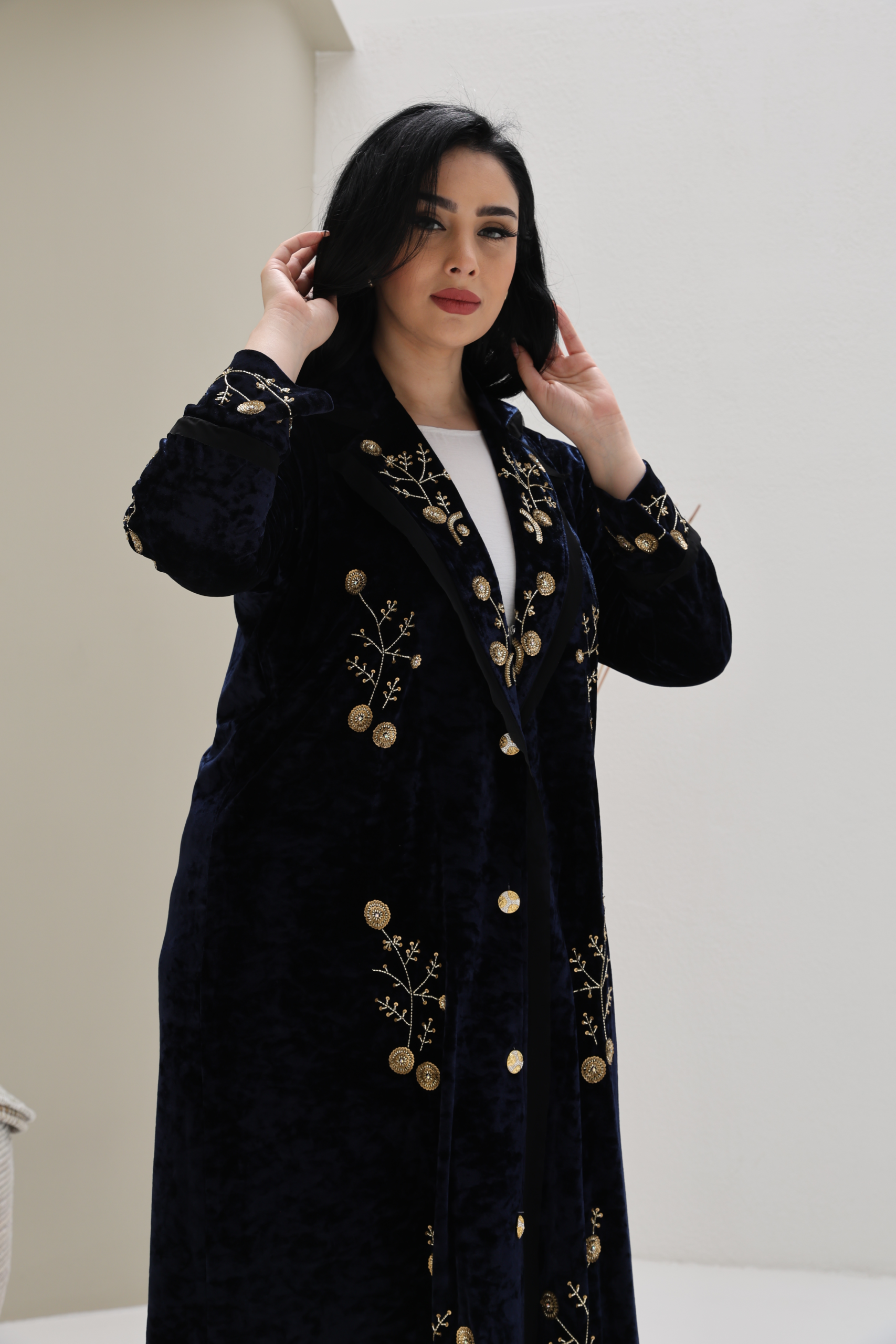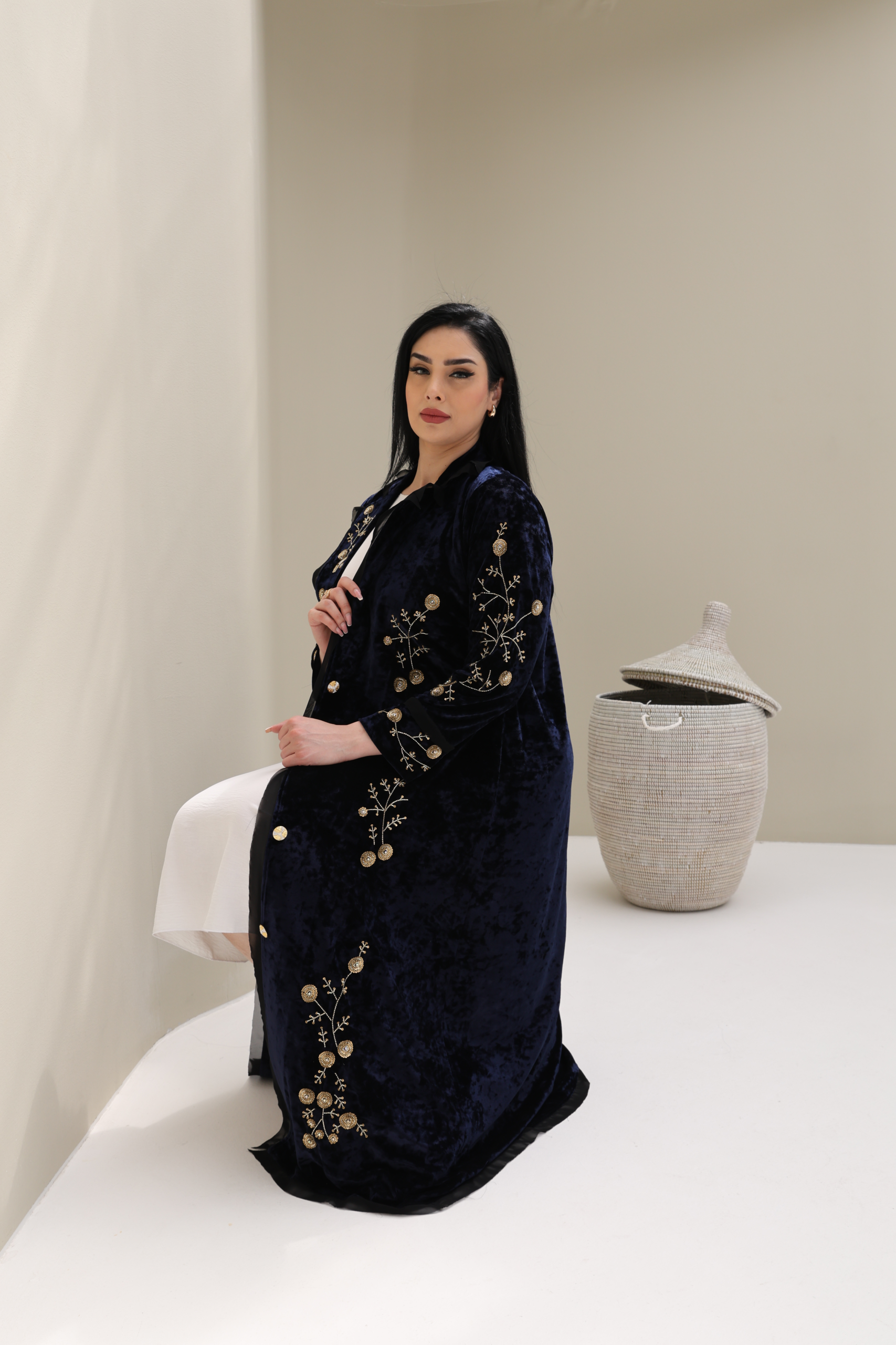 Navy Velvet Abaya with Golden Embroidery – Luxe Edition