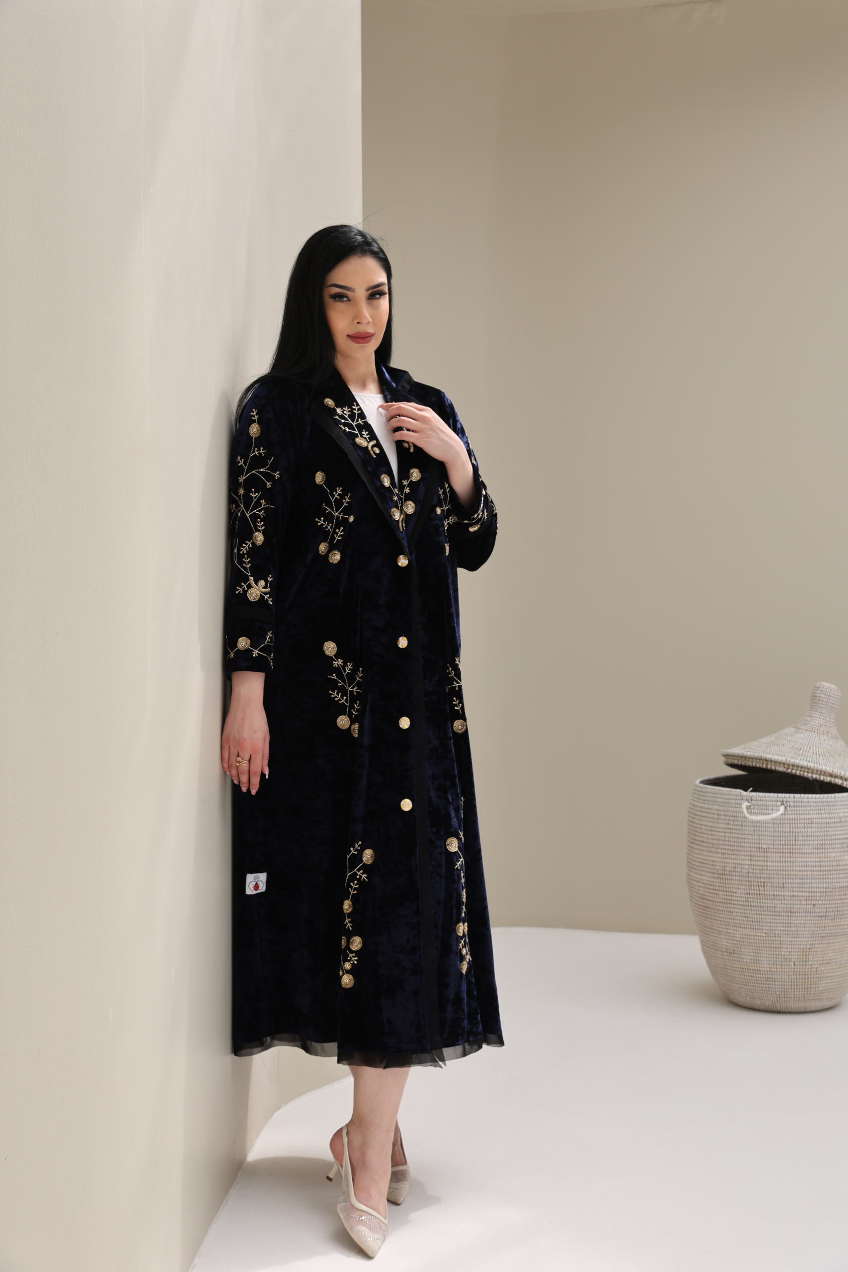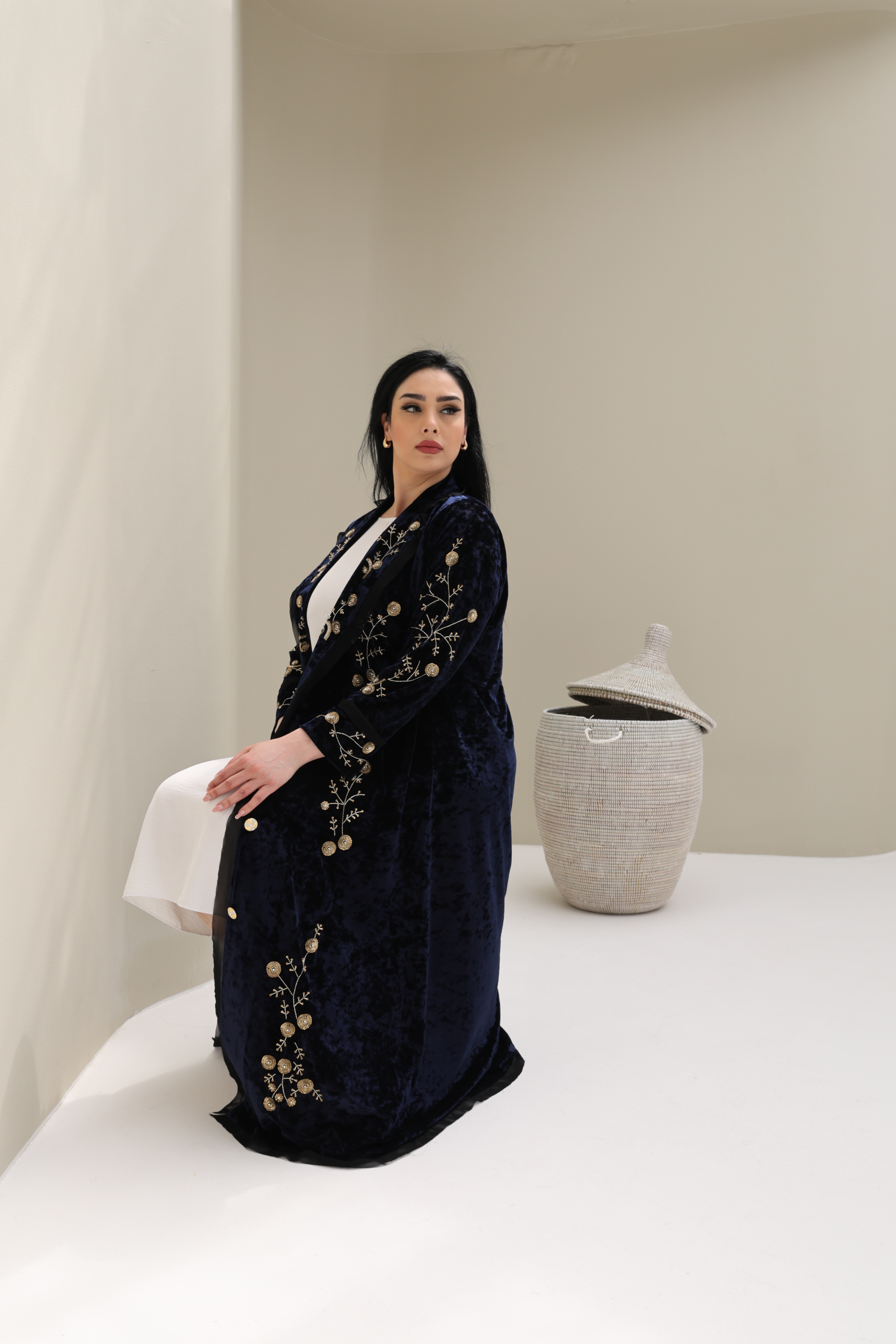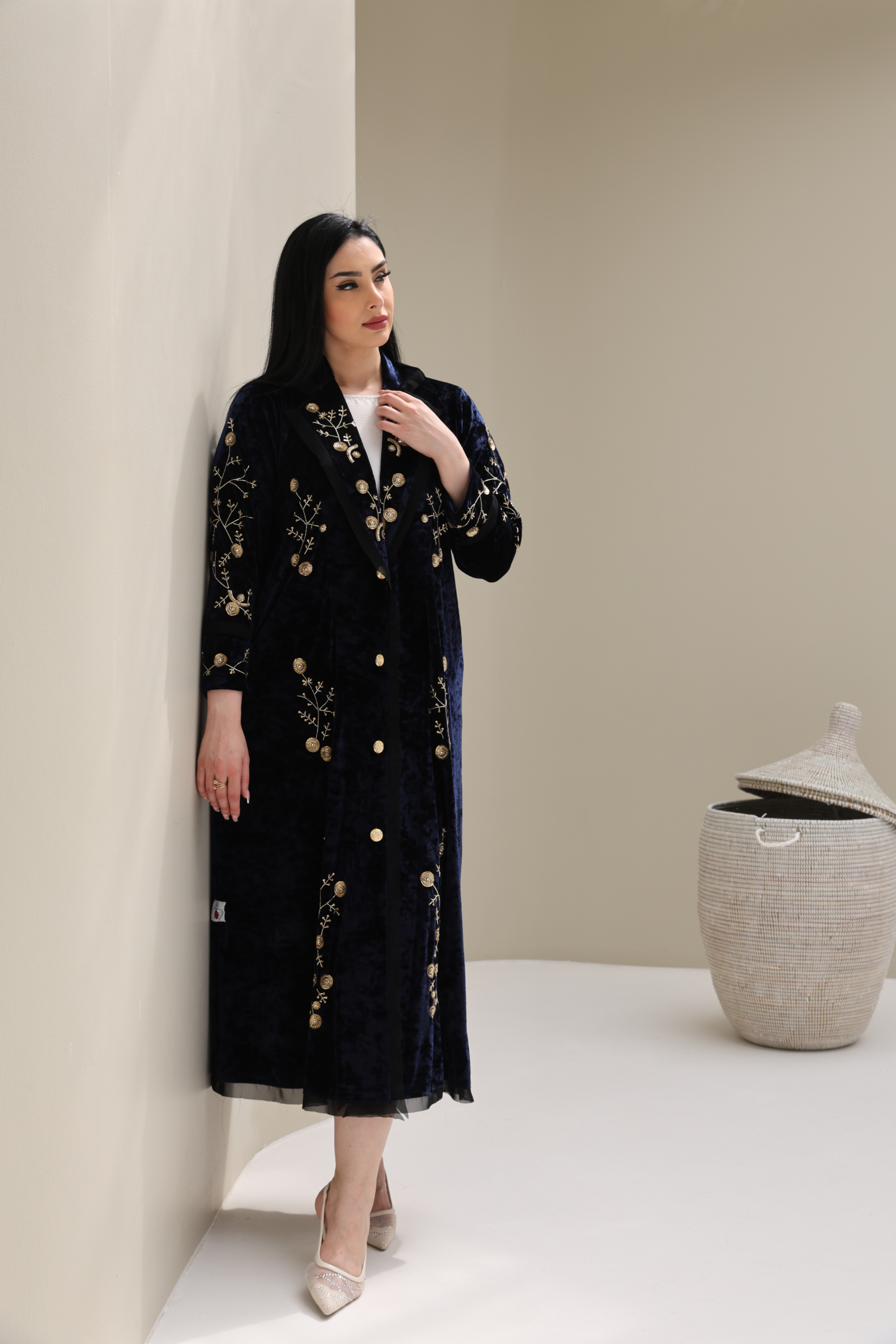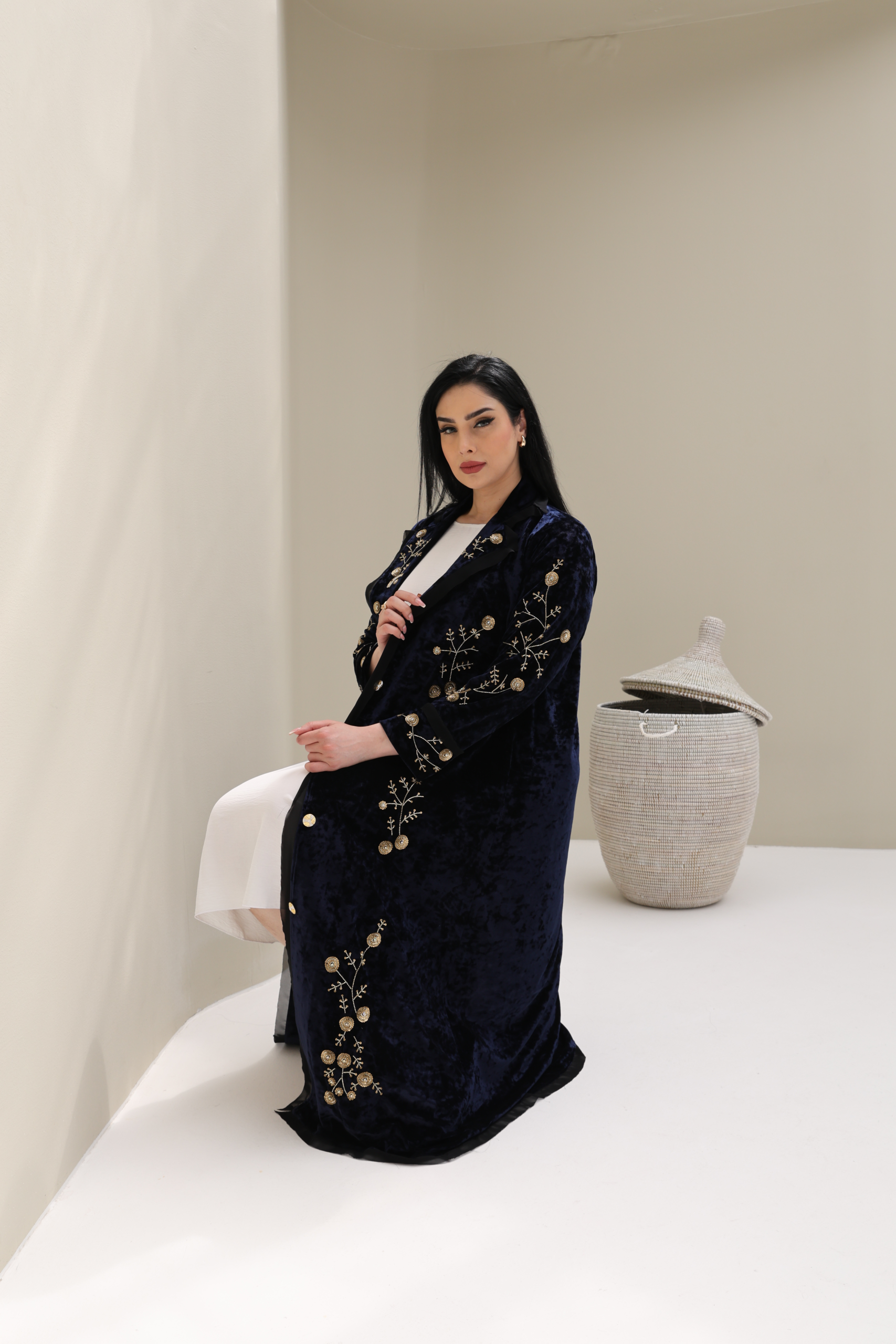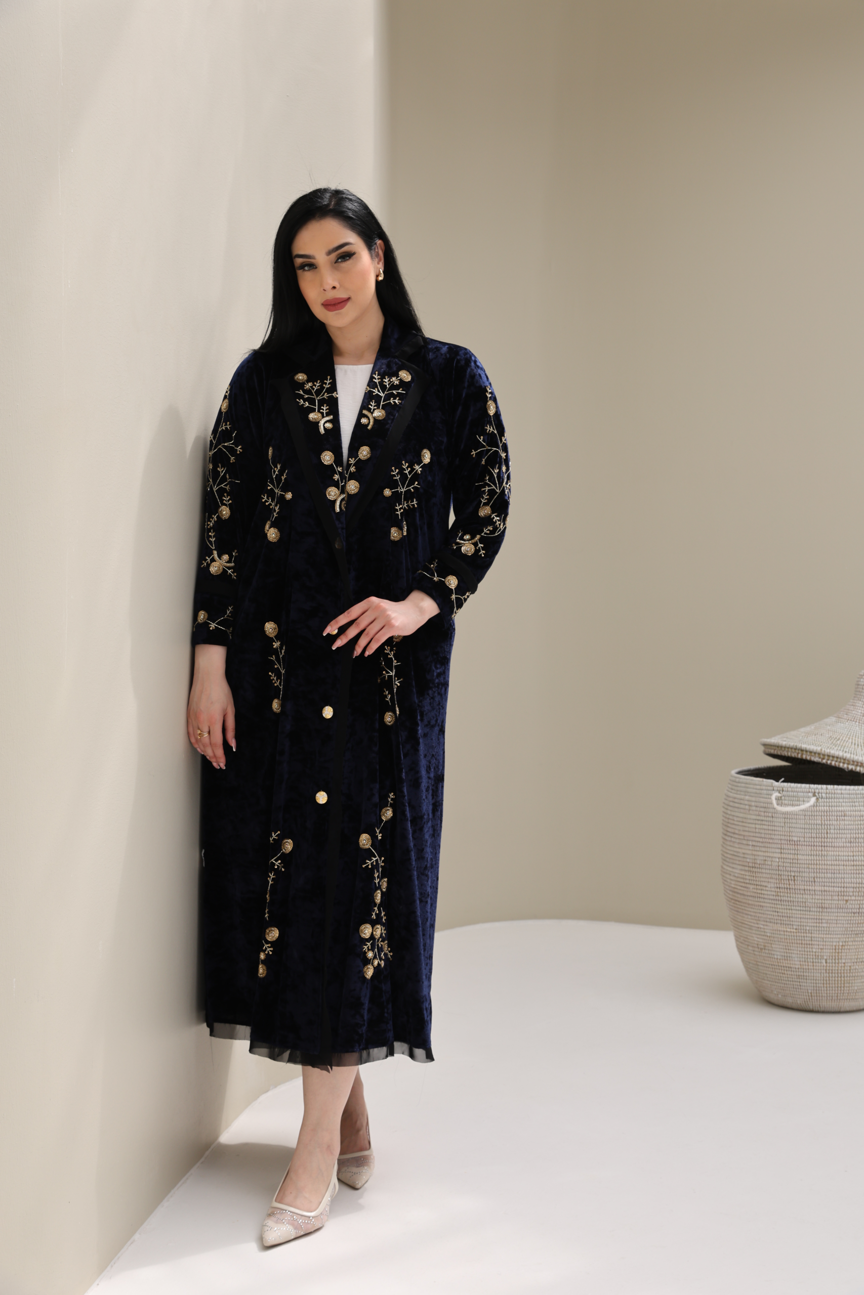 Navy Velvet Abaya with Golden Embroidery – Luxe Edition
