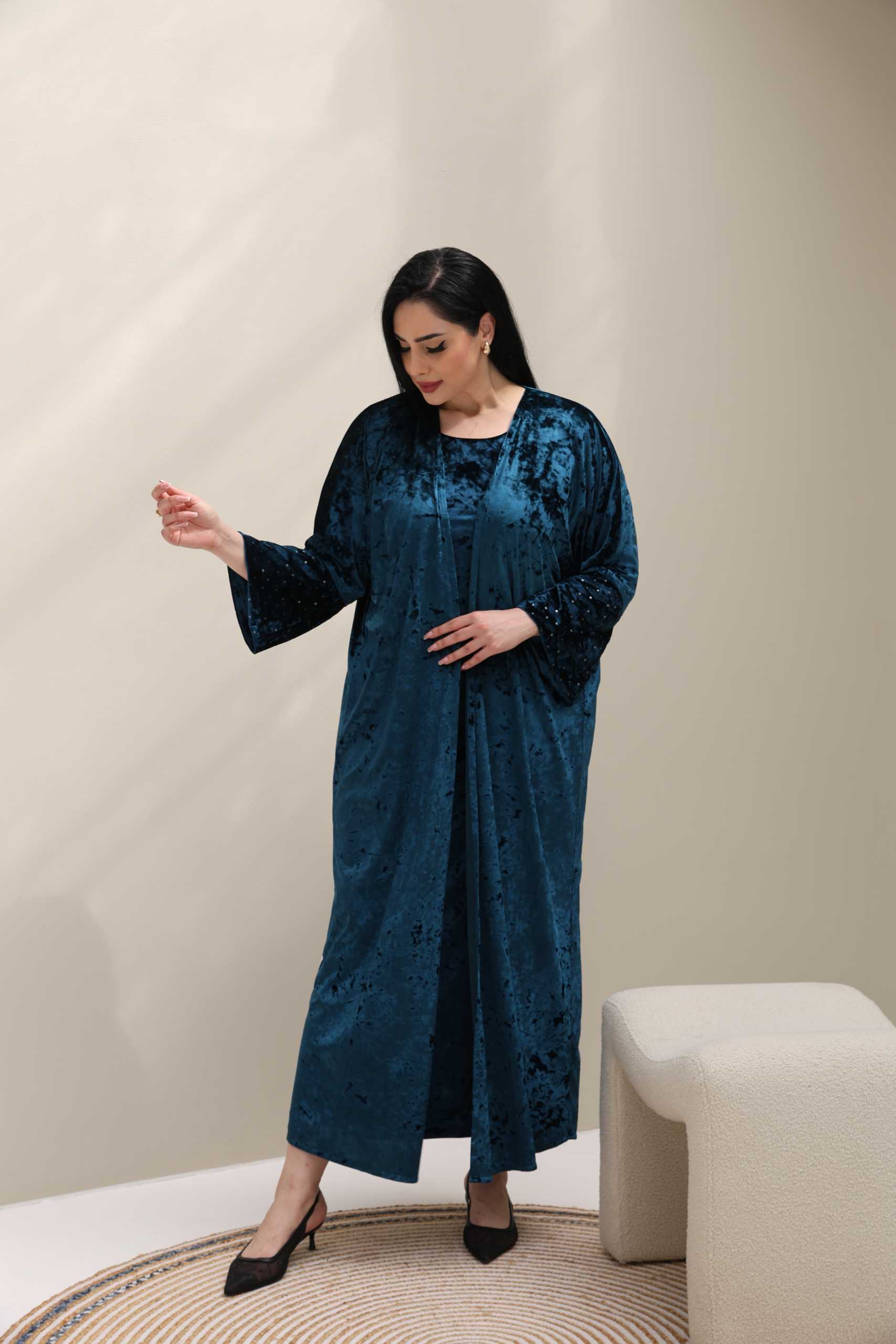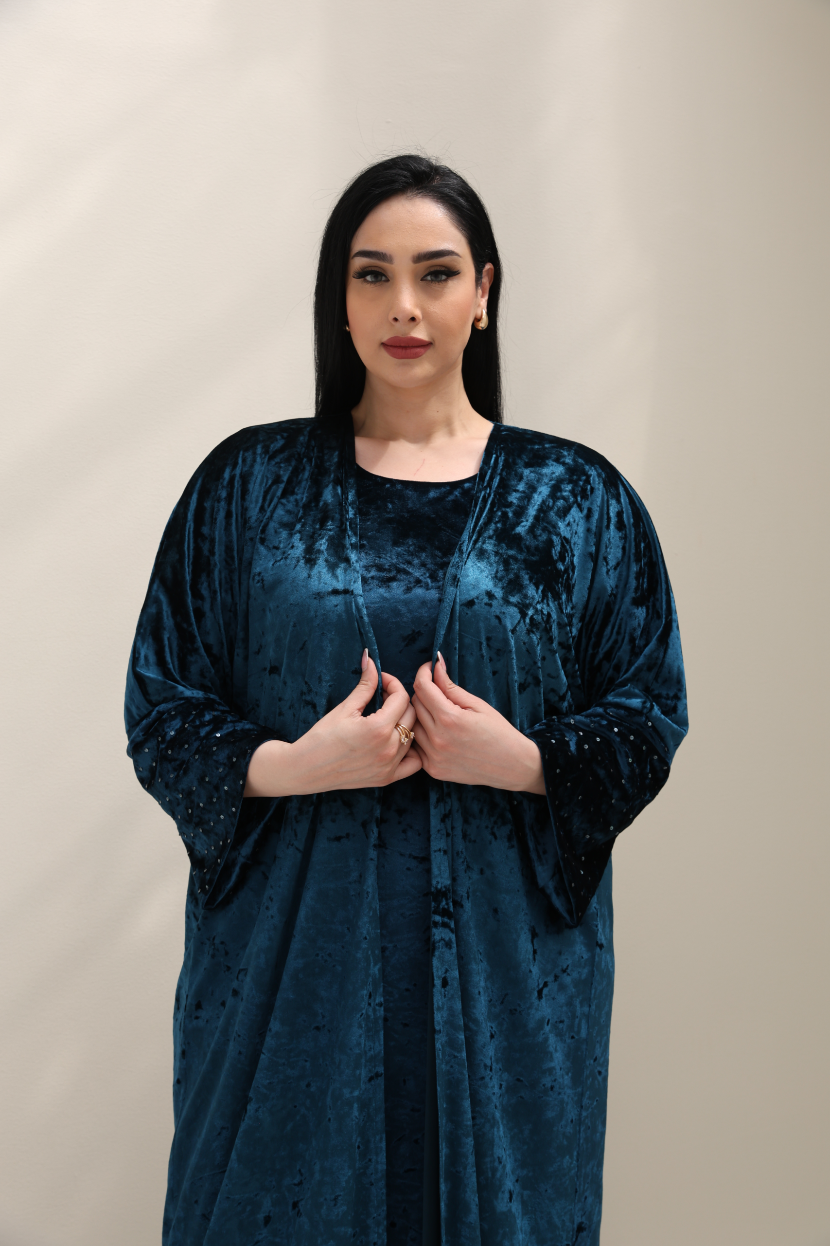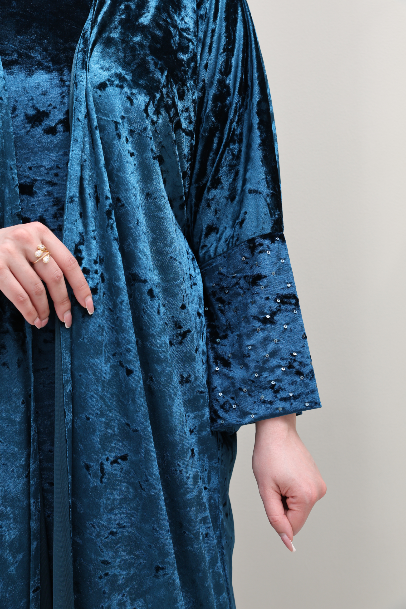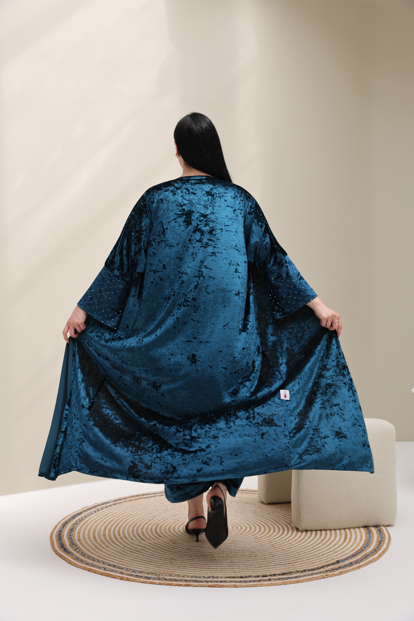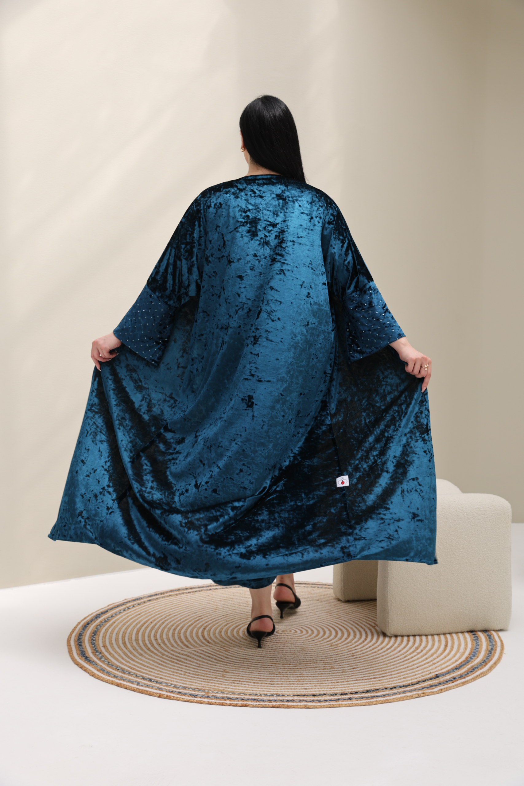 The Teal Blue Velvet Abaya is a celebration of modern femininity — quietly bold, infinitely elegant, and undeniably timeless.