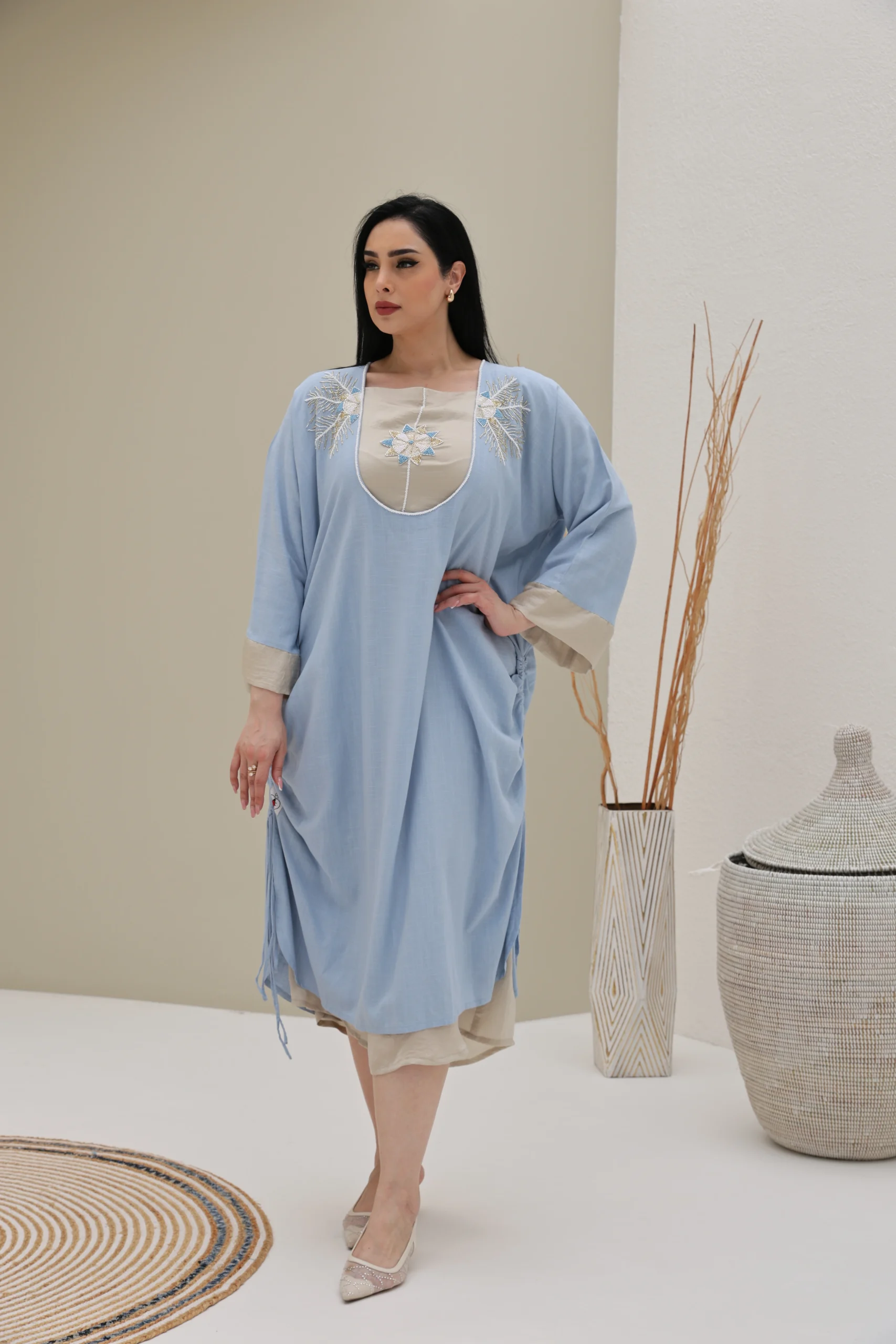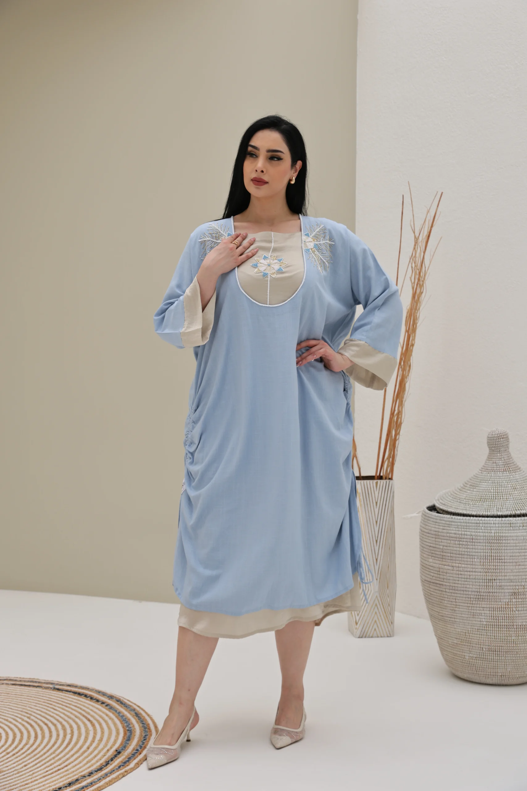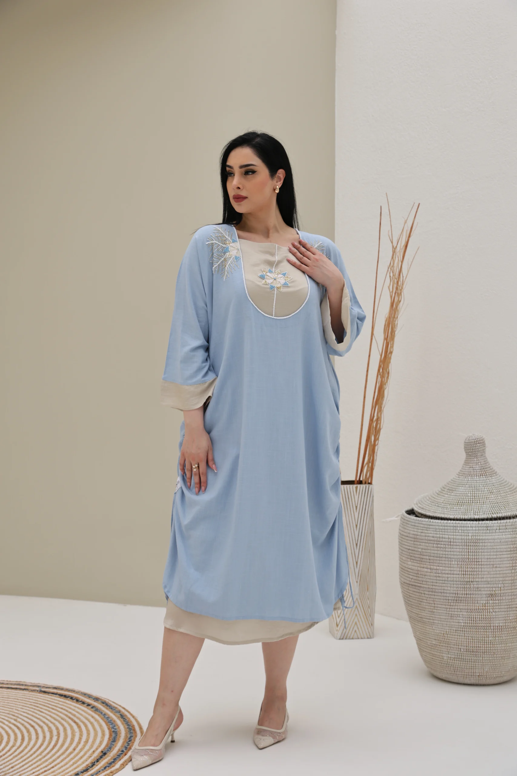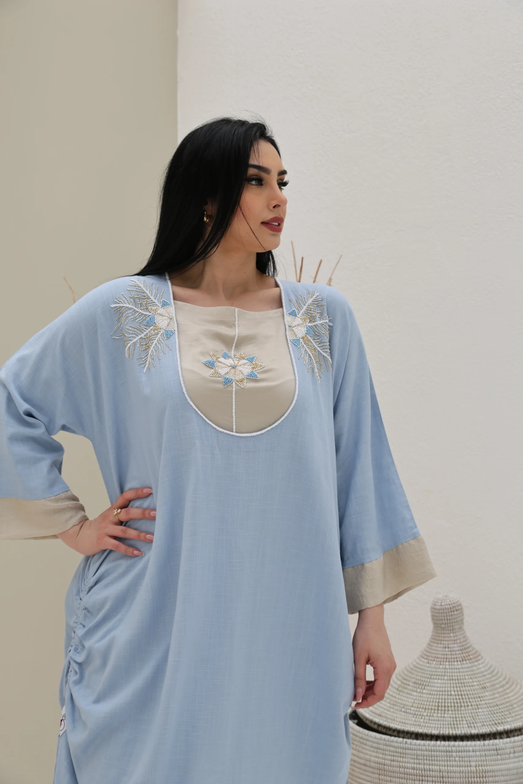 The Sky Breeze Jalabiya is crafted in a soft powder-blue fabric layered over a neutral beige lining, striking the perfect balance between modesty and contemporary charm. The neckline is beautifully detailed with floral-inspired embroidery in ivory, beige, and sky blue, adding a delicate touch of sophistication.