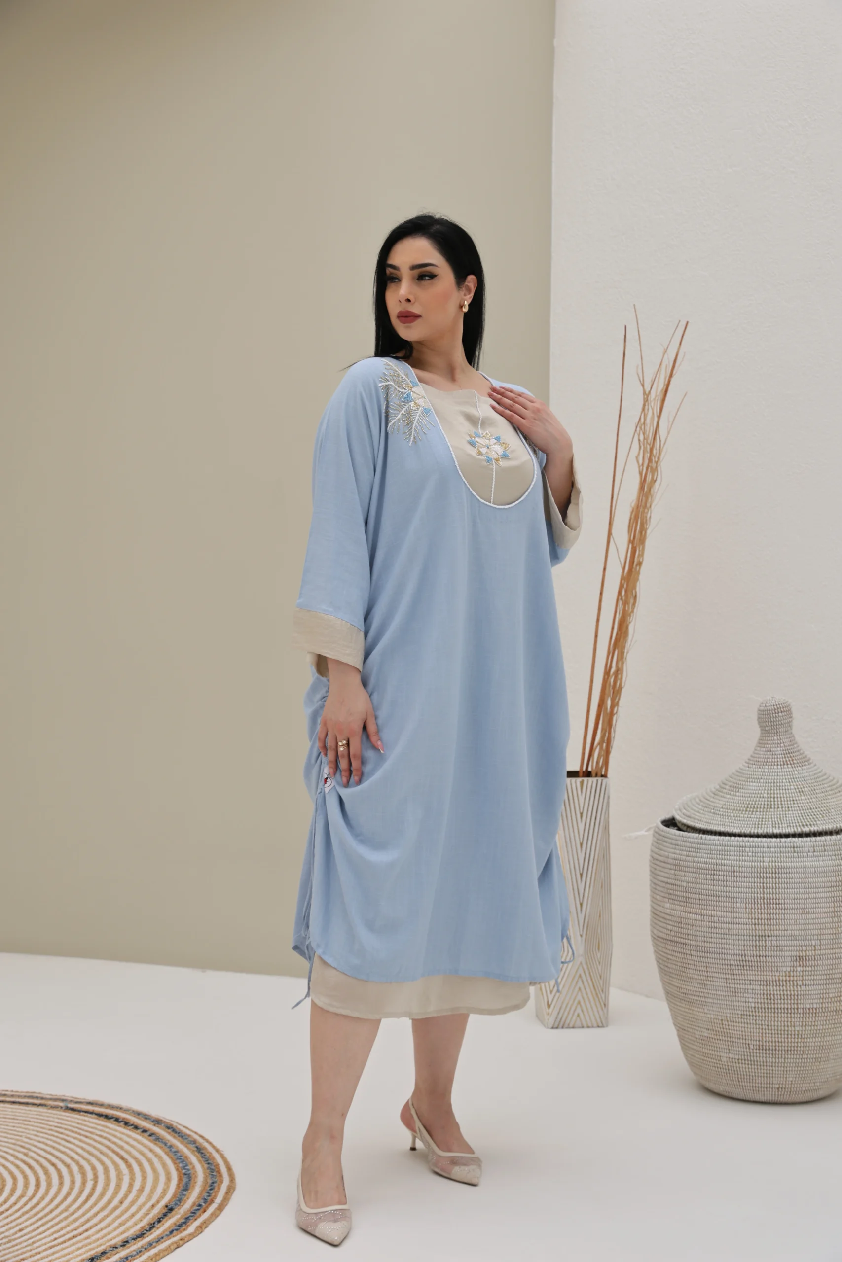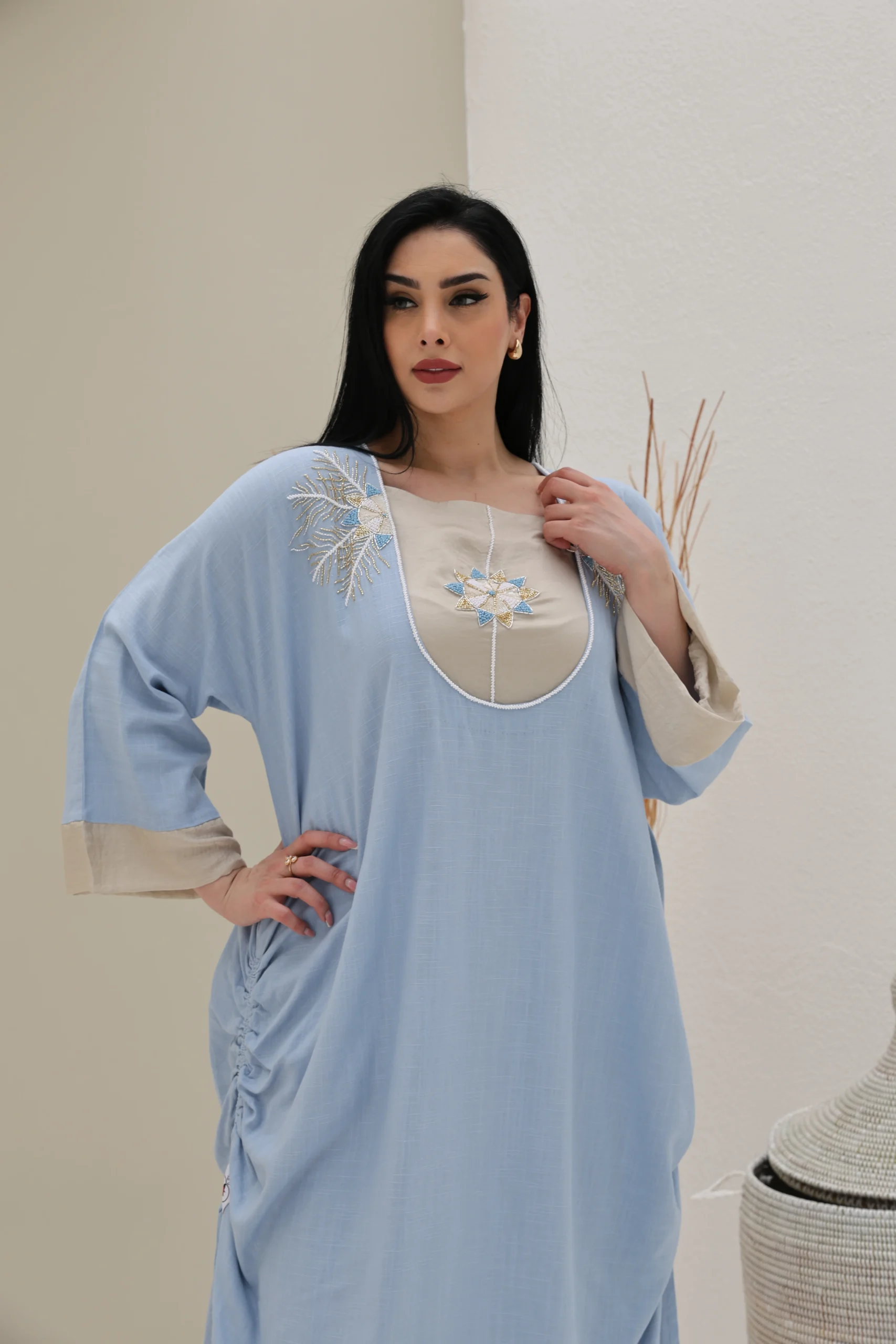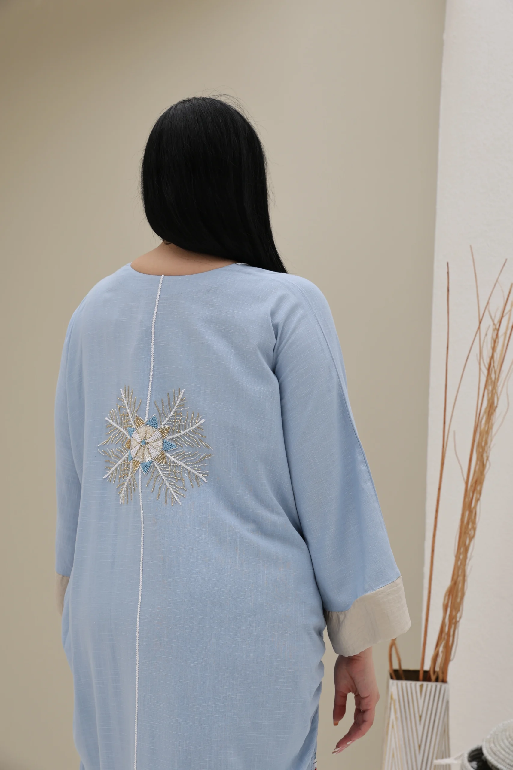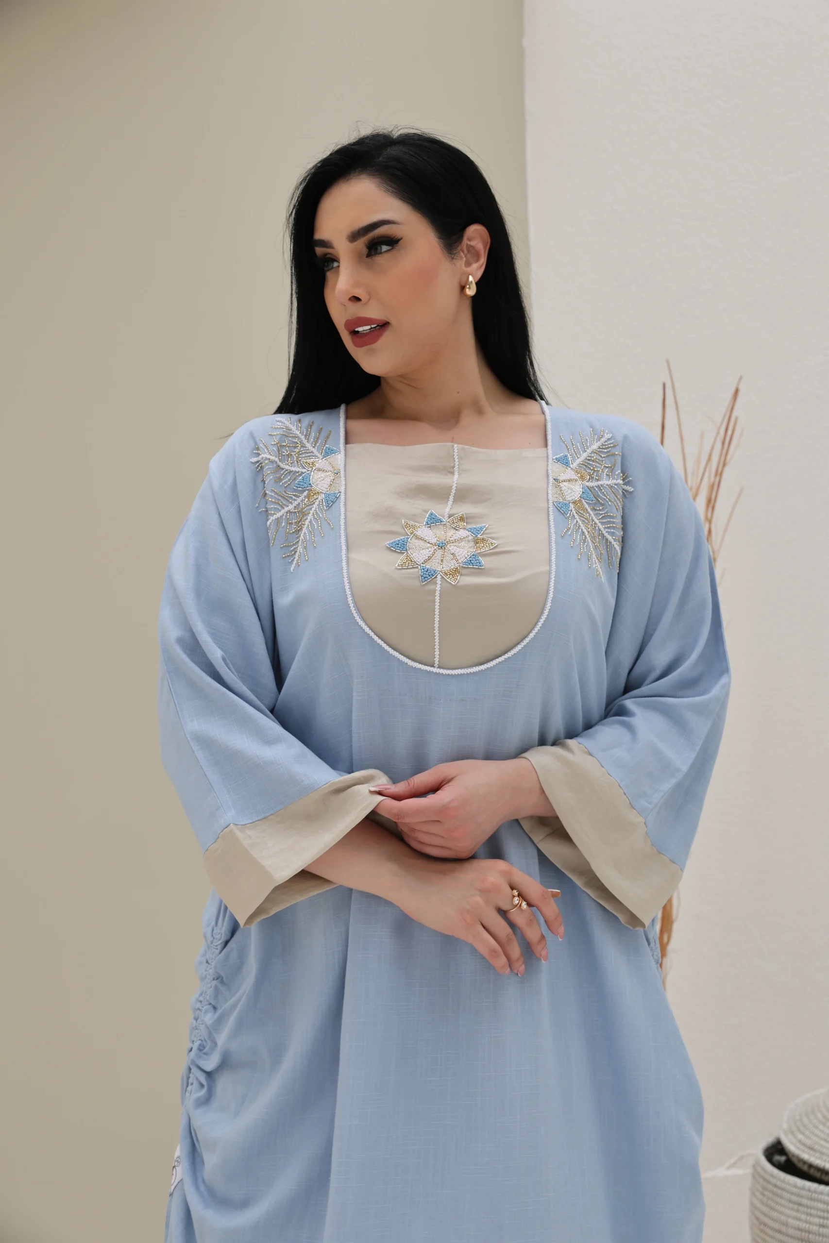 The Sky Breeze Jalabiya is crafted in a soft powder-blue fabric layered over a neutral beige lining, striking the perfect balance between modesty and contemporary charm. The neckline is beautifully detailed with floral-inspired embroidery in ivory, beige, and sky blue, adding a delicate touch of sophistication.