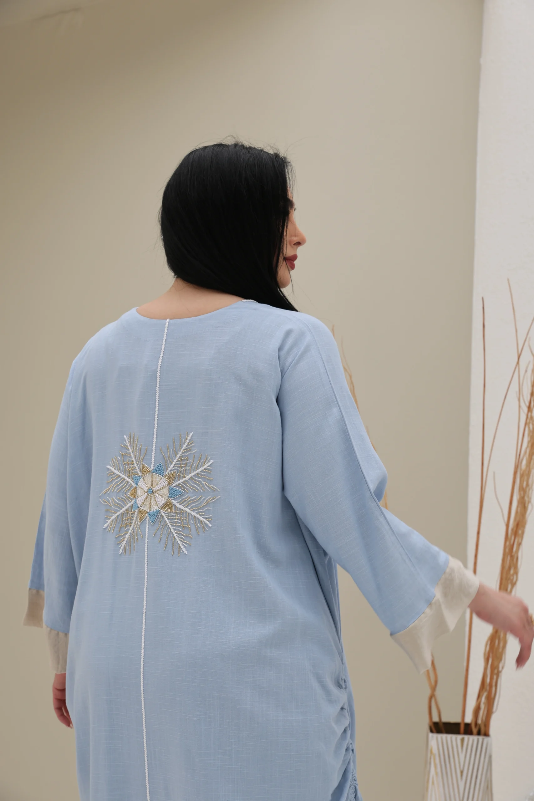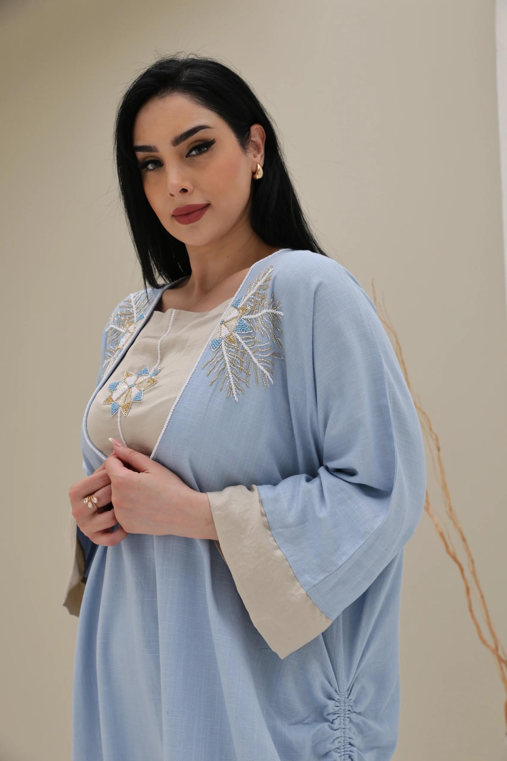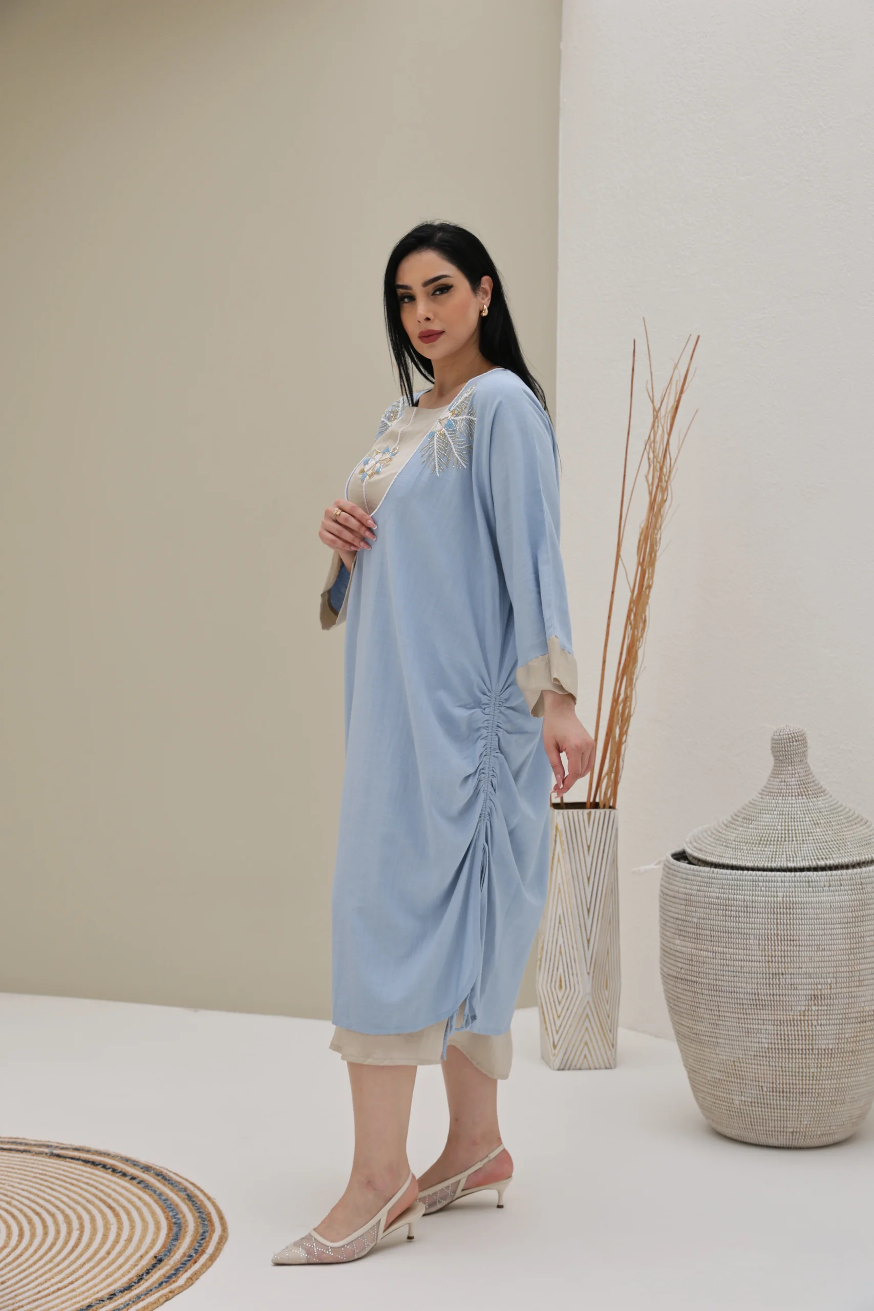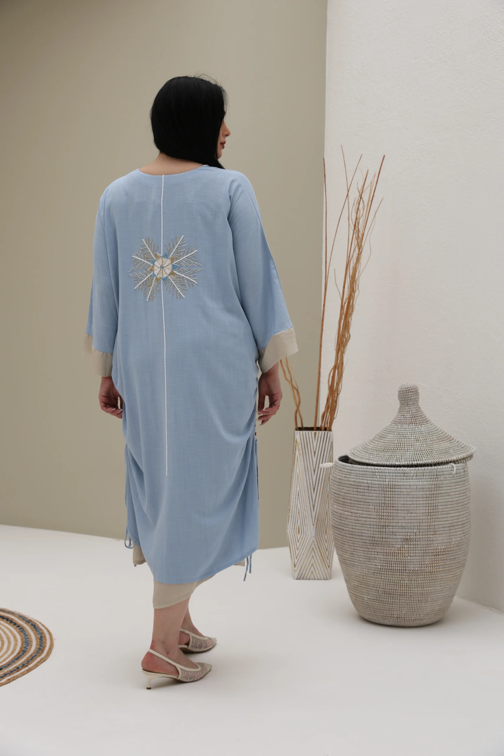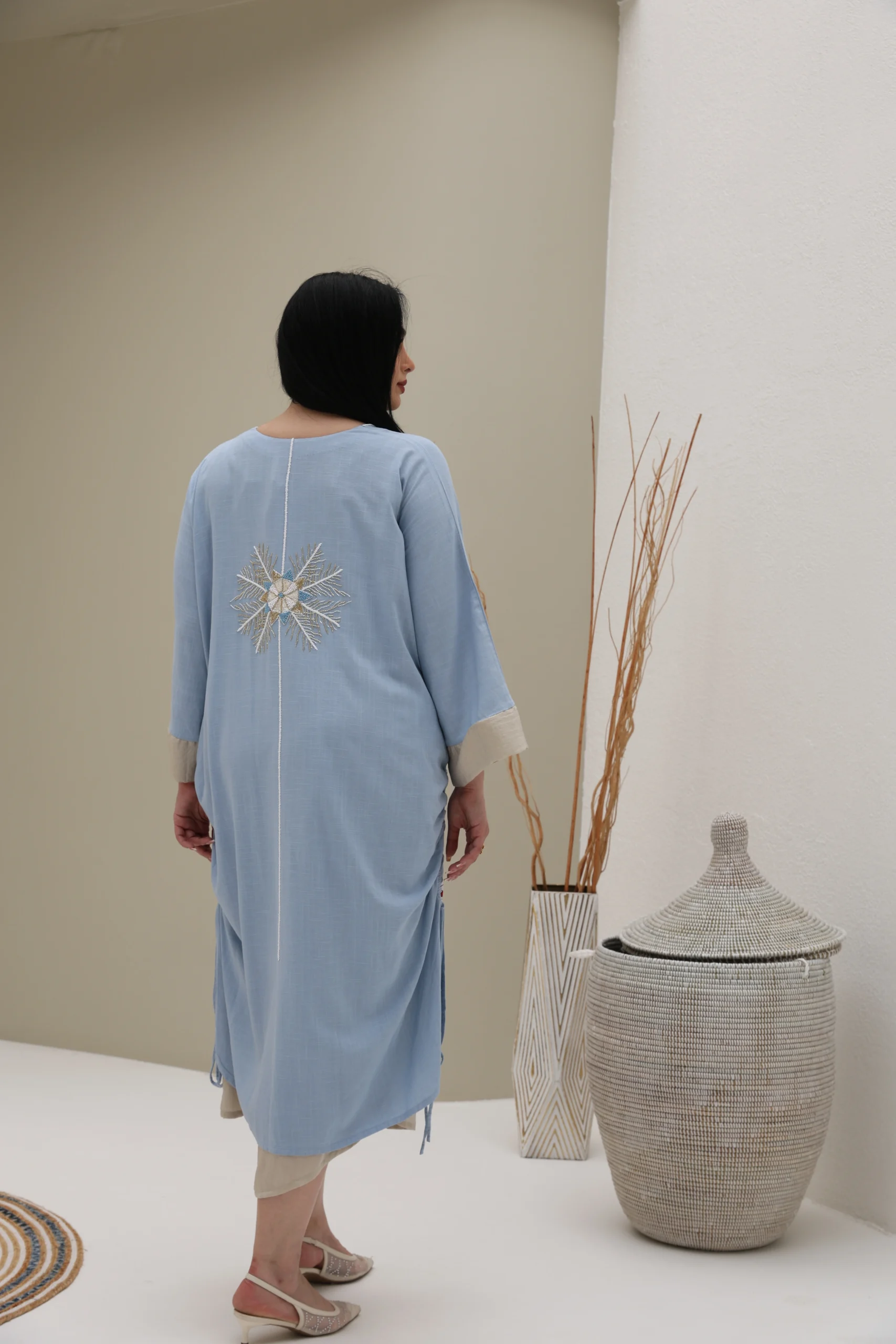 The Sky Breeze Jalabiya is crafted in a soft powder-blue fabric layered over a neutral beige lining, striking the perfect balance between modesty and contemporary charm. The neckline is beautifully detailed with floral-inspired embroidery in ivory, beige, and sky blue, adding a delicate touch of sophistication.