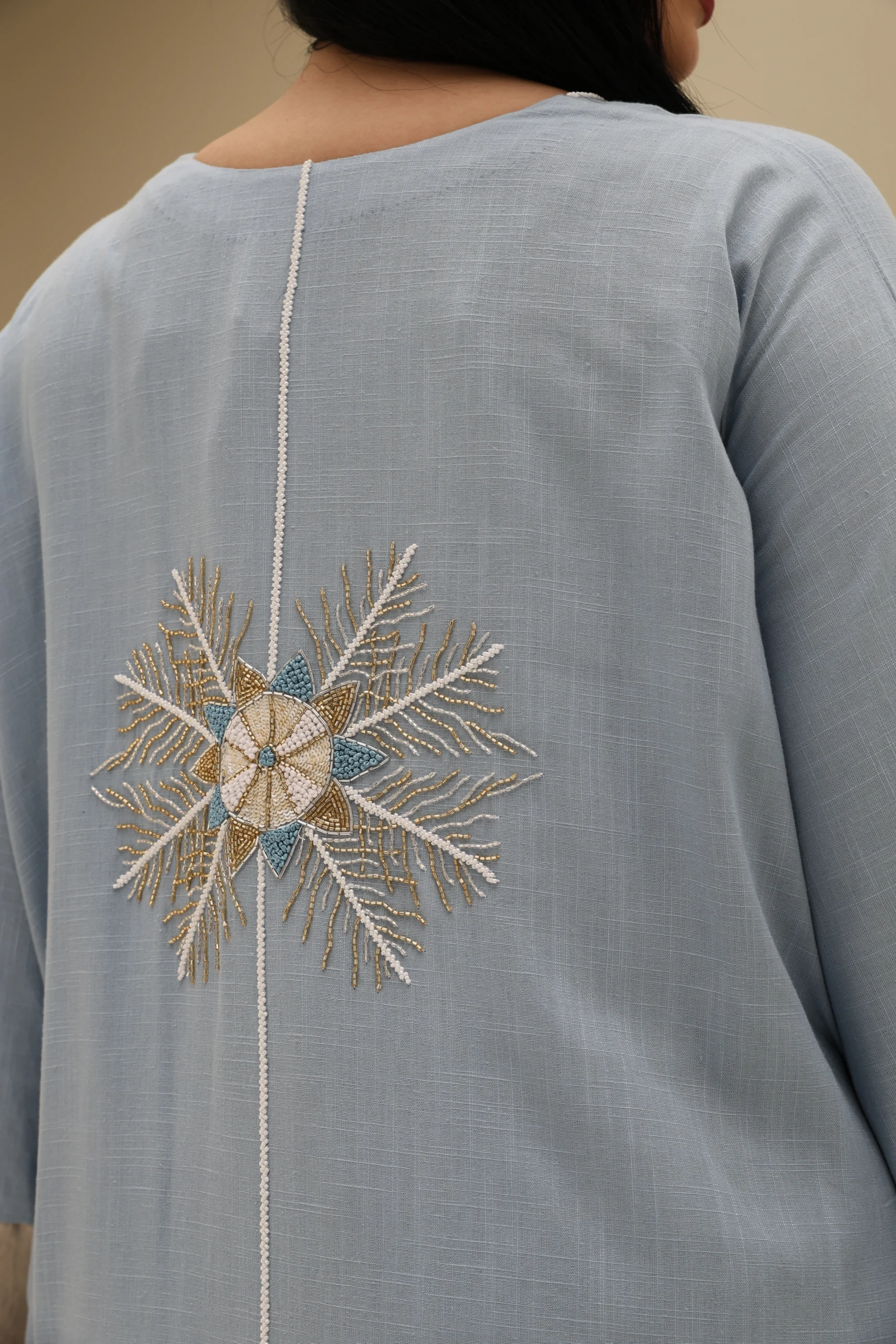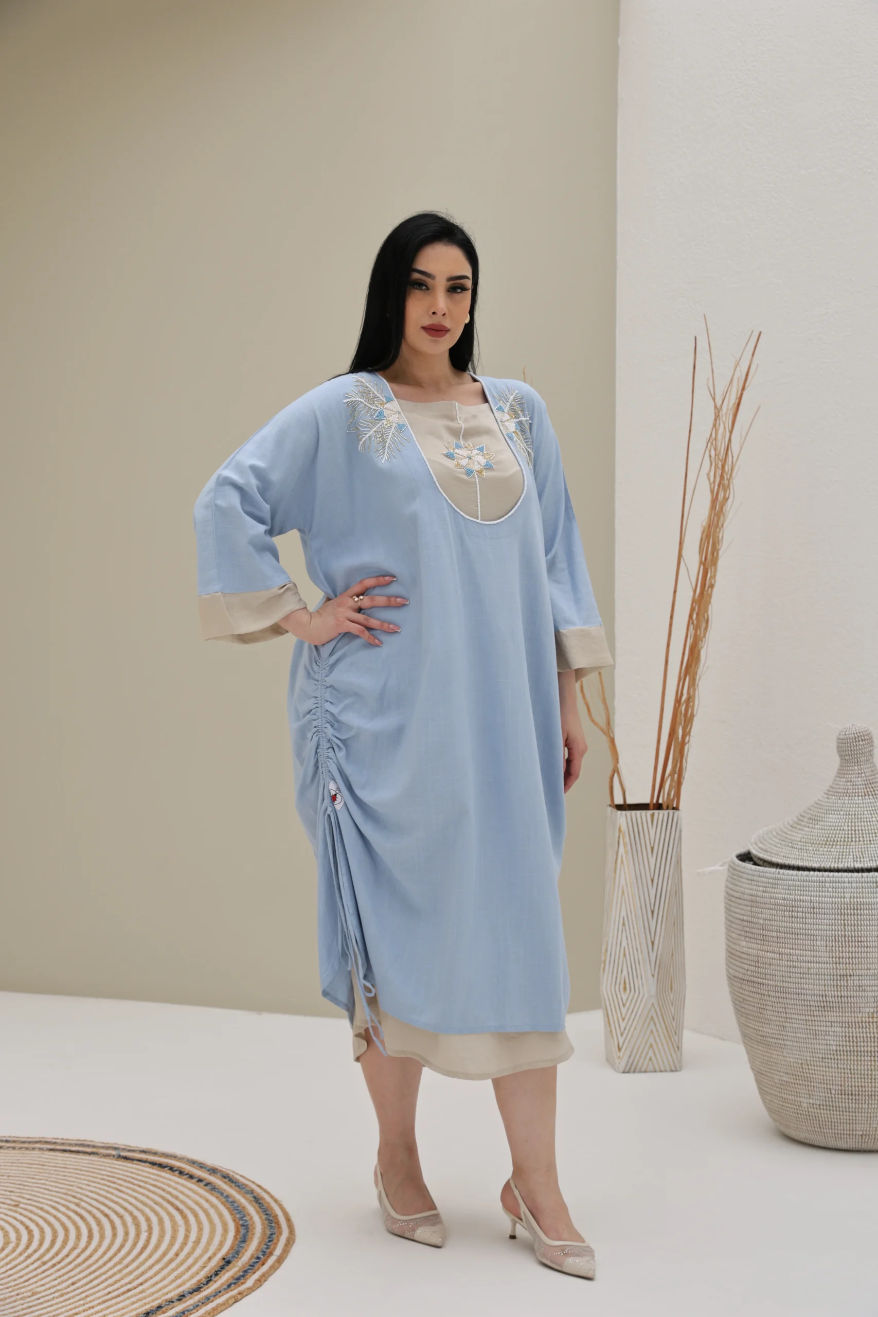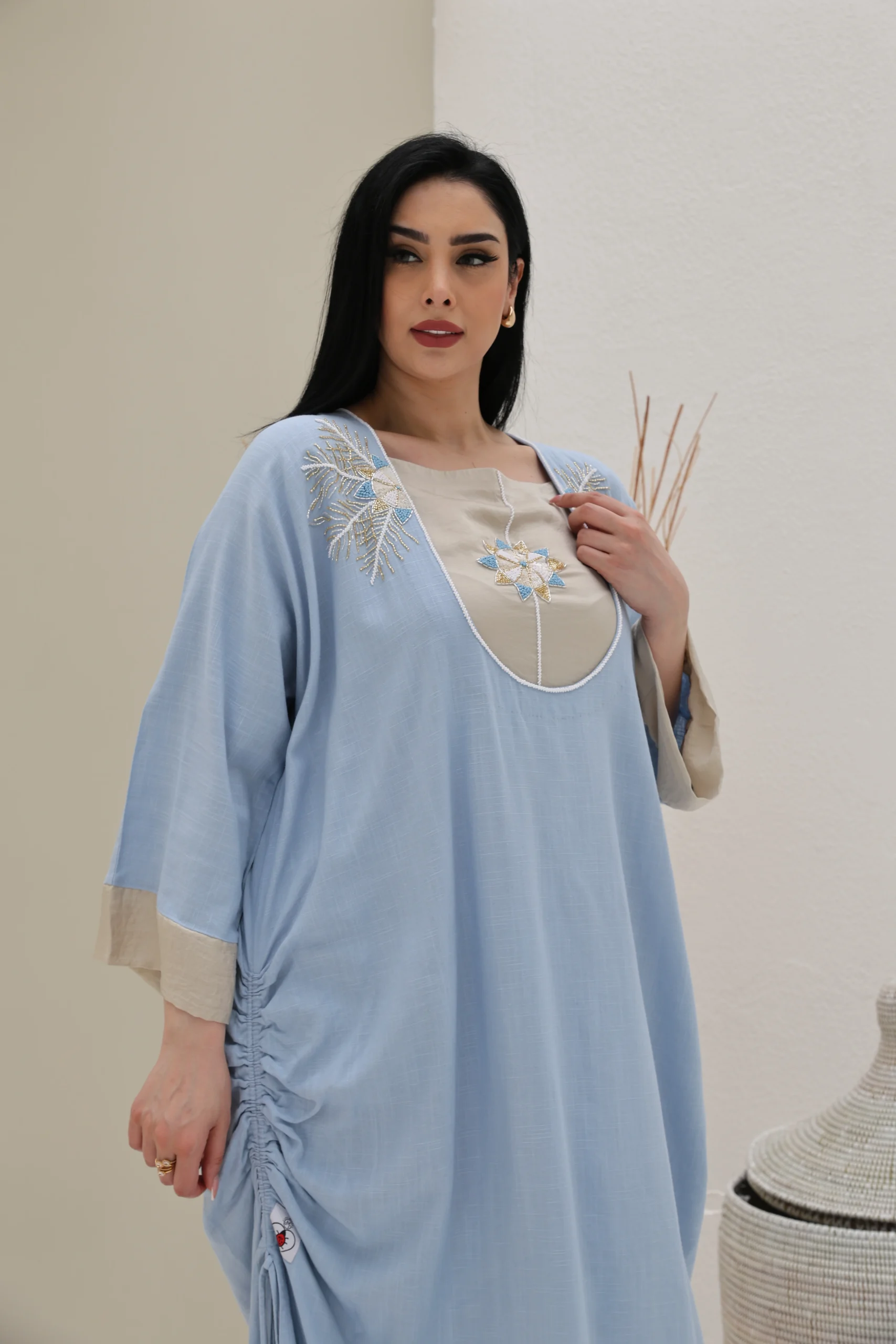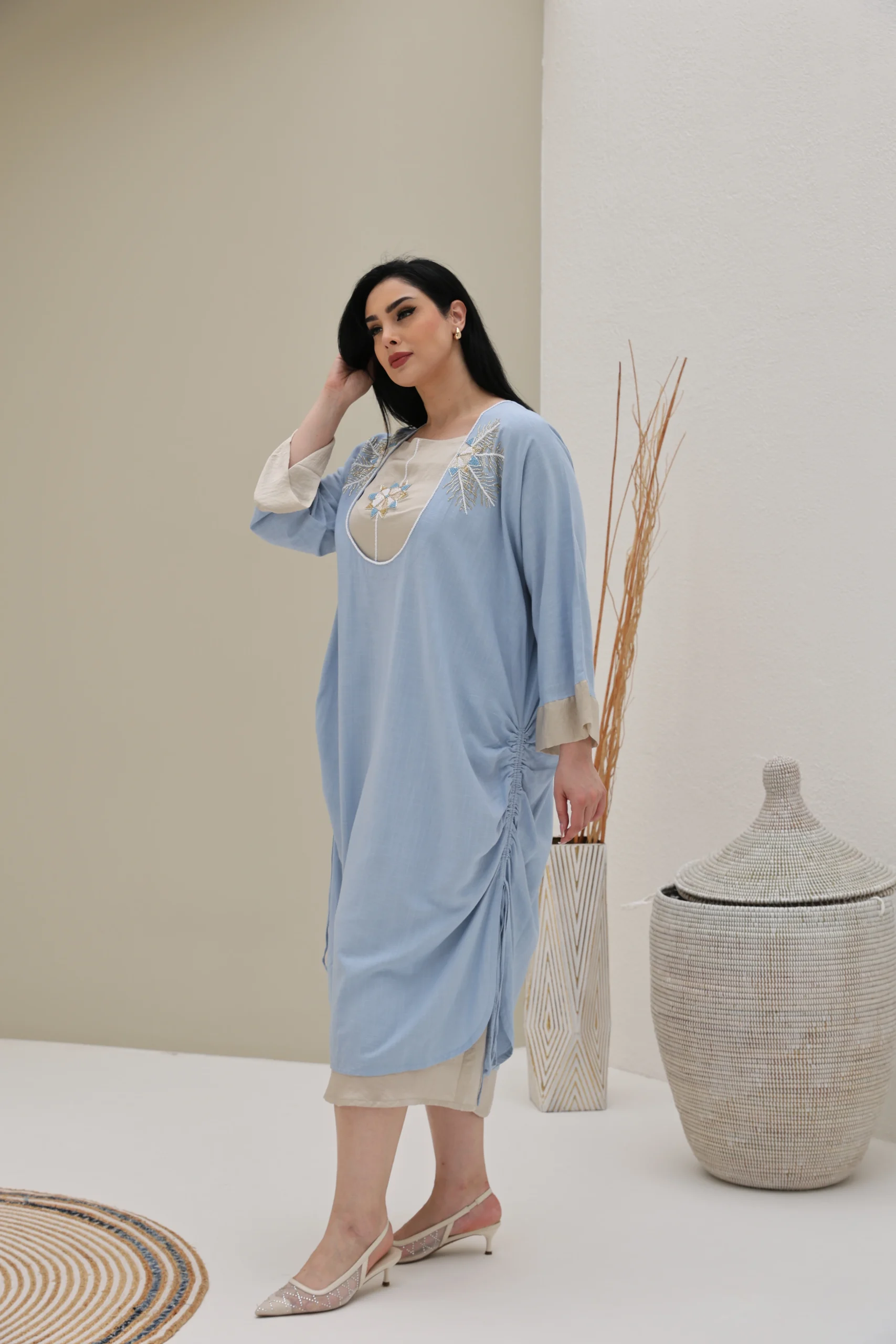 The Sky Breeze Jalabiya is crafted in a soft powder-blue fabric layered over a neutral beige lining, striking the perfect balance between modesty and contemporary charm. The neckline is beautifully detailed with floral-inspired embroidery in ivory, beige, and sky blue, adding a delicate touch of sophistication.