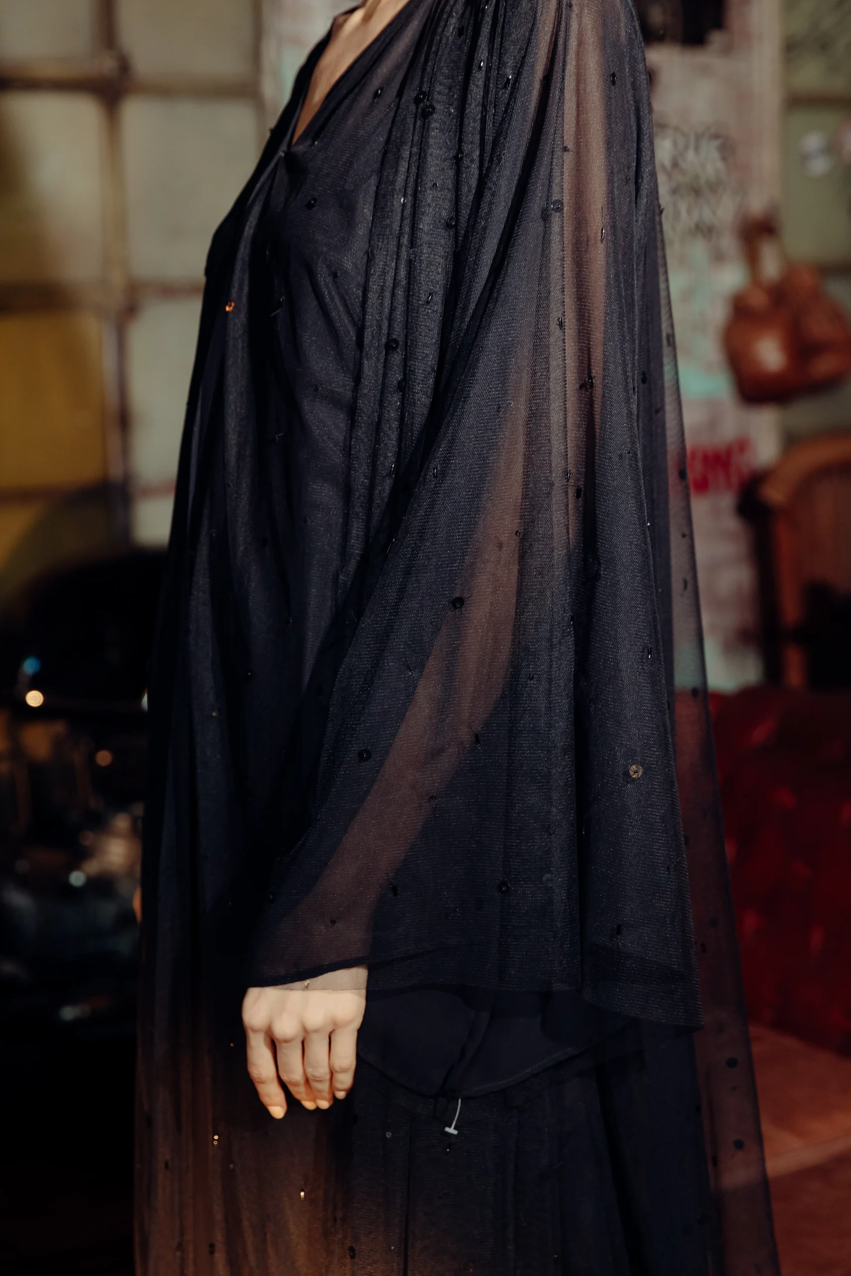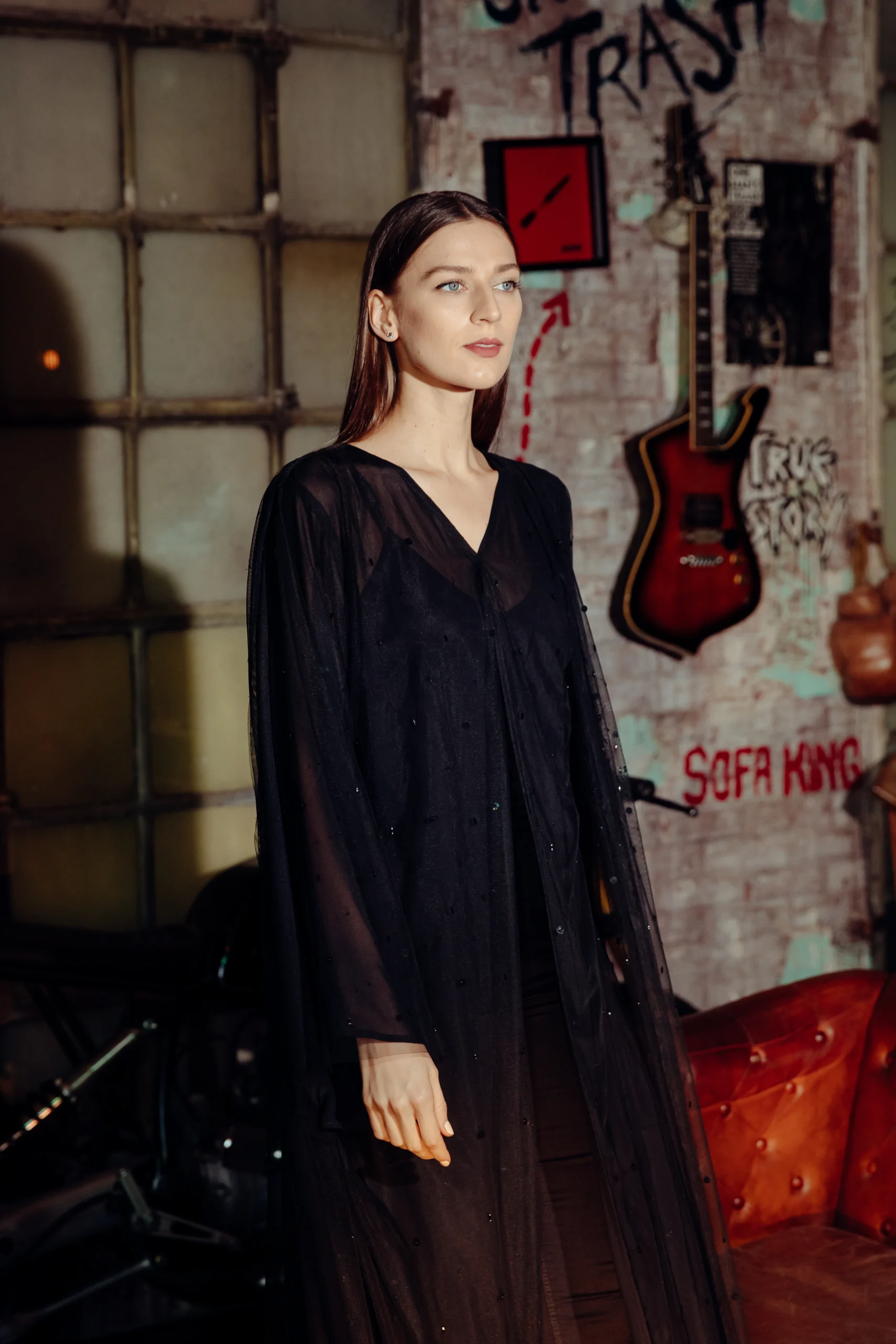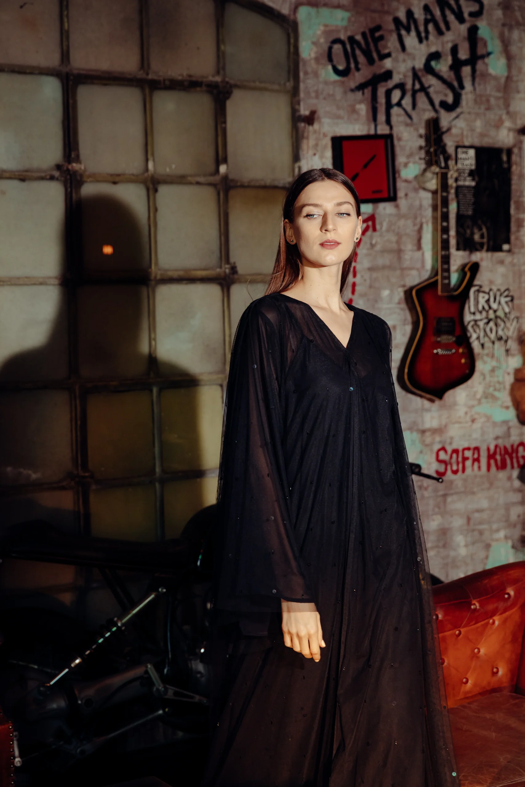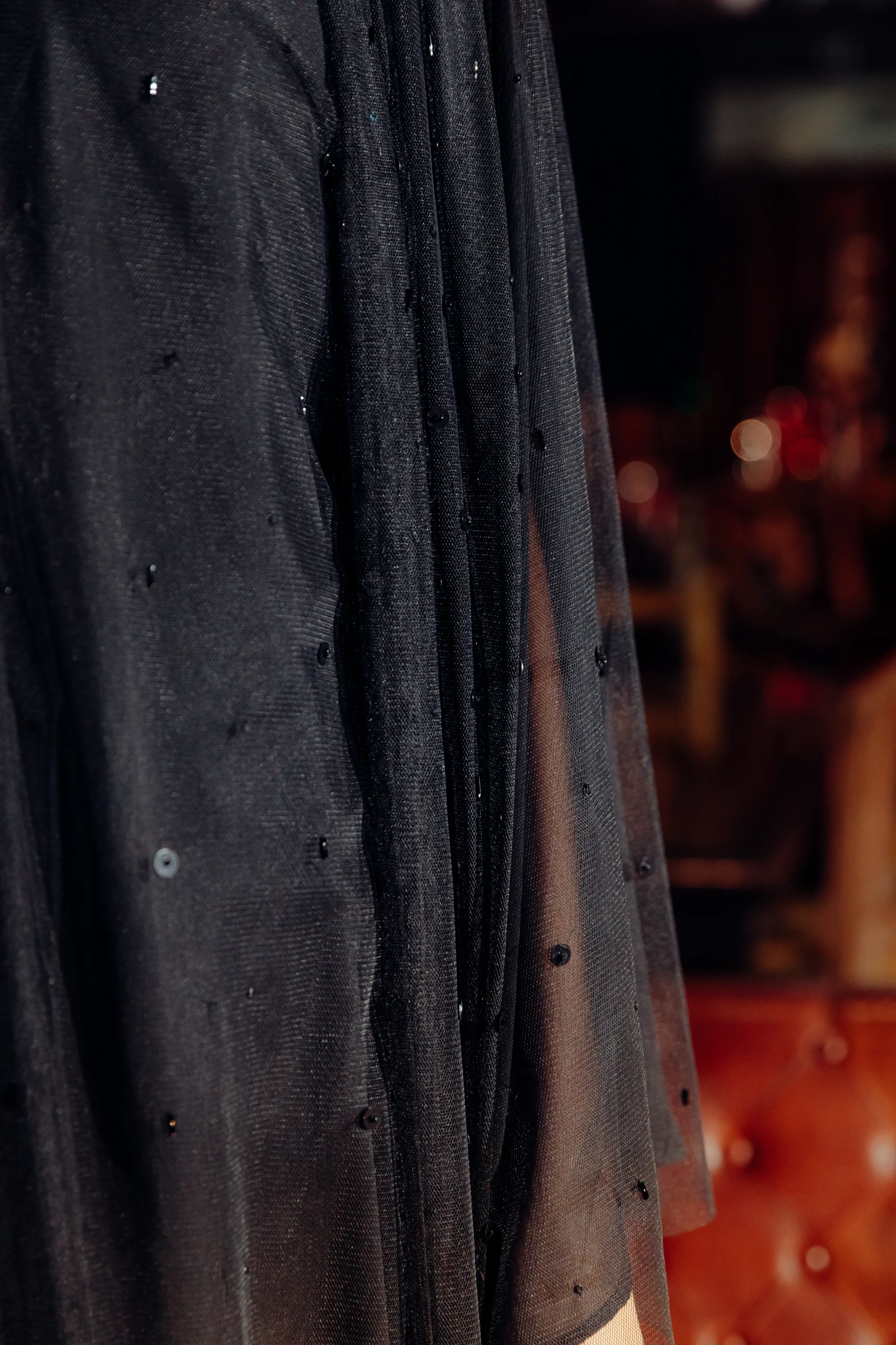 The Noir Starlet Kaftan is a piece of sheer elegance, crafted from a lightweight, black tulle fabric that is dotted with a subtle shimmer. The delicate fabric and long, flowing silhouette create a captivating and mysterious look. With its relaxed fit, this kaftan offers both comfort and a captivating presence, perfect for a night out.