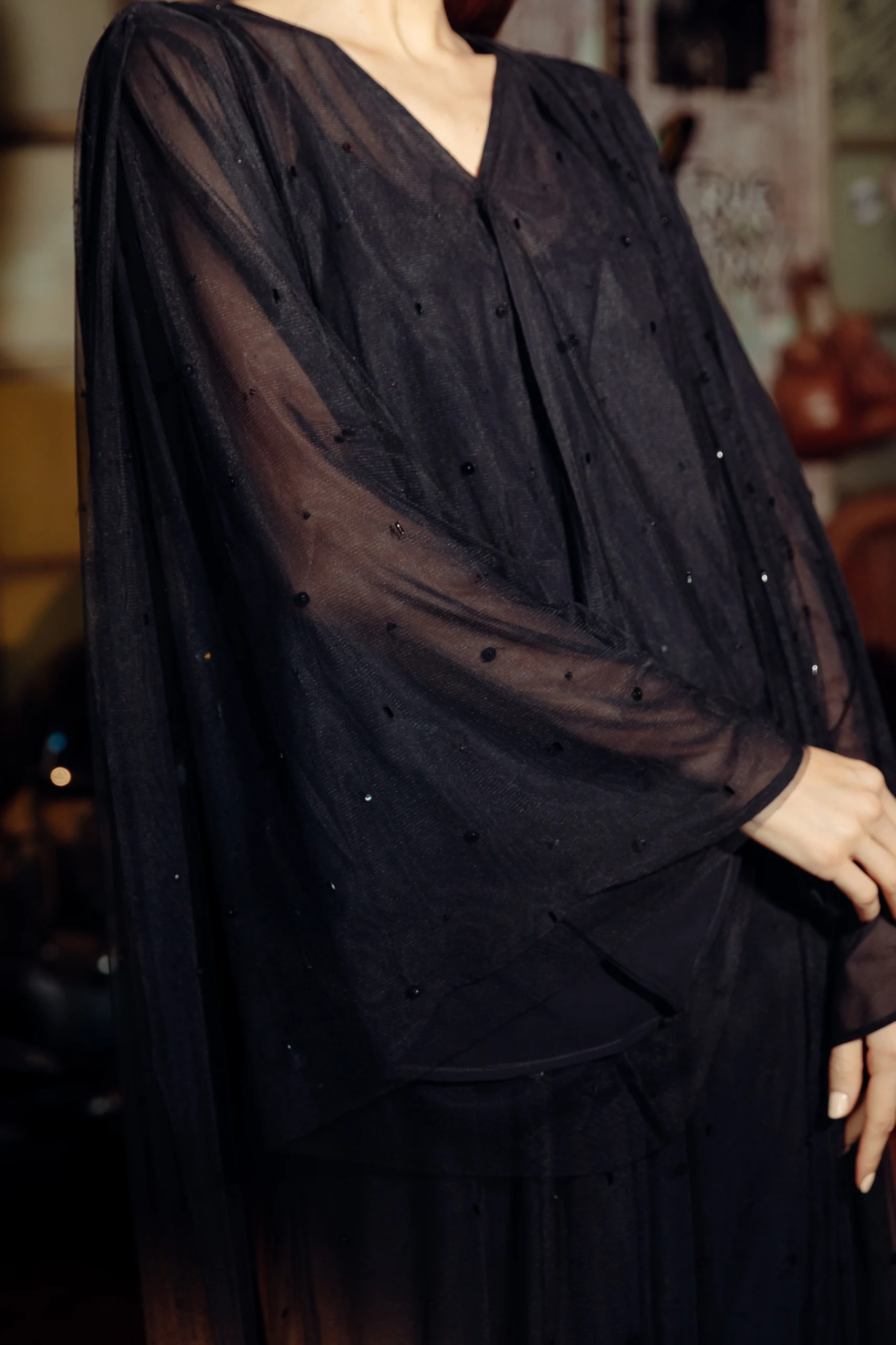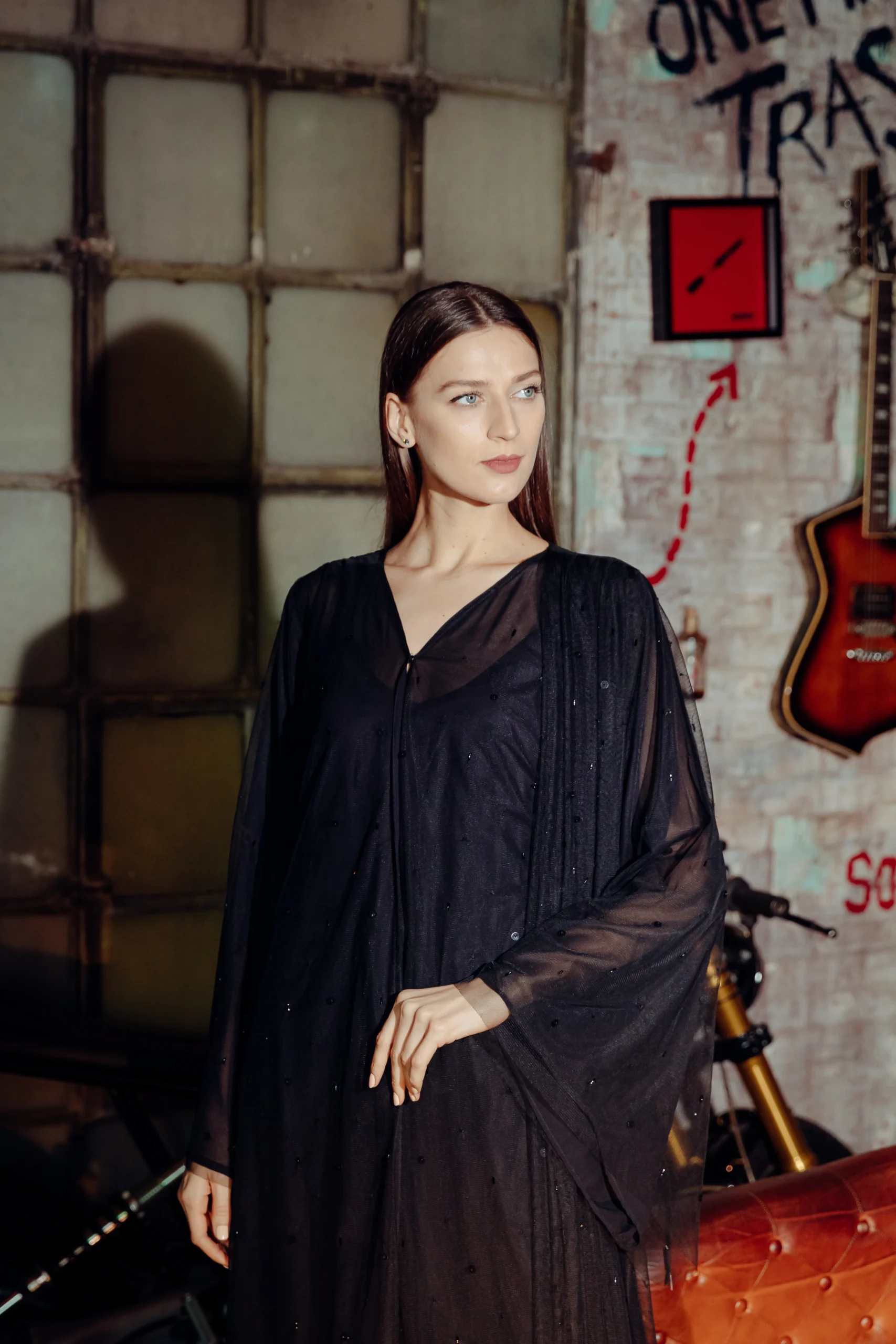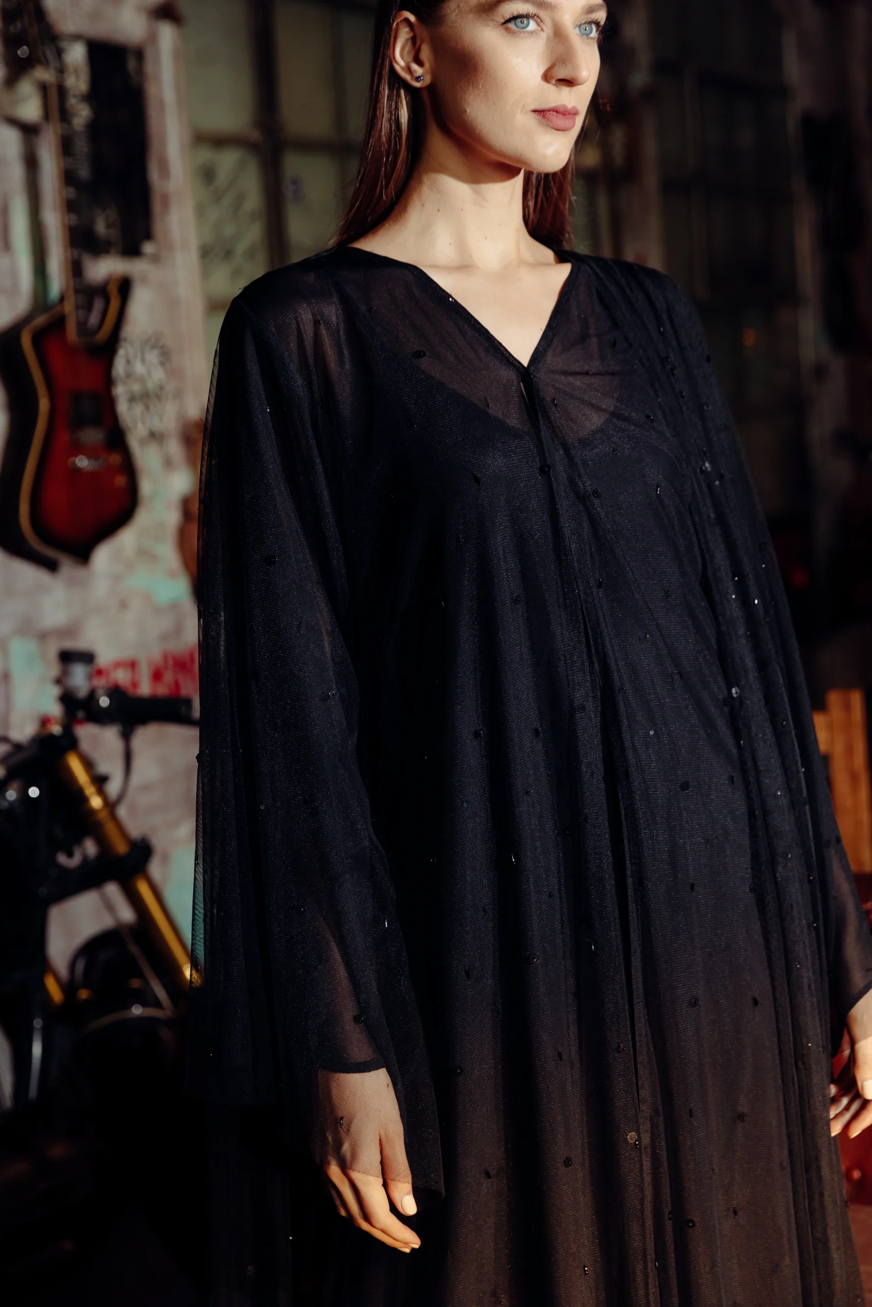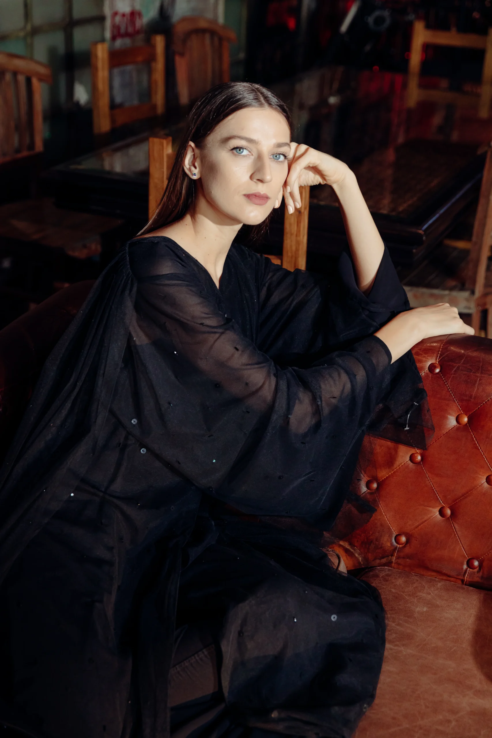 The Noir Starlet Kaftan is a piece of sheer elegance, crafted from a lightweight, black tulle fabric that is dotted with a subtle shimmer. The delicate fabric and long, flowing silhouette create a captivating and mysterious look. With its relaxed fit, this kaftan offers both comfort and a captivating presence, perfect for a night out.