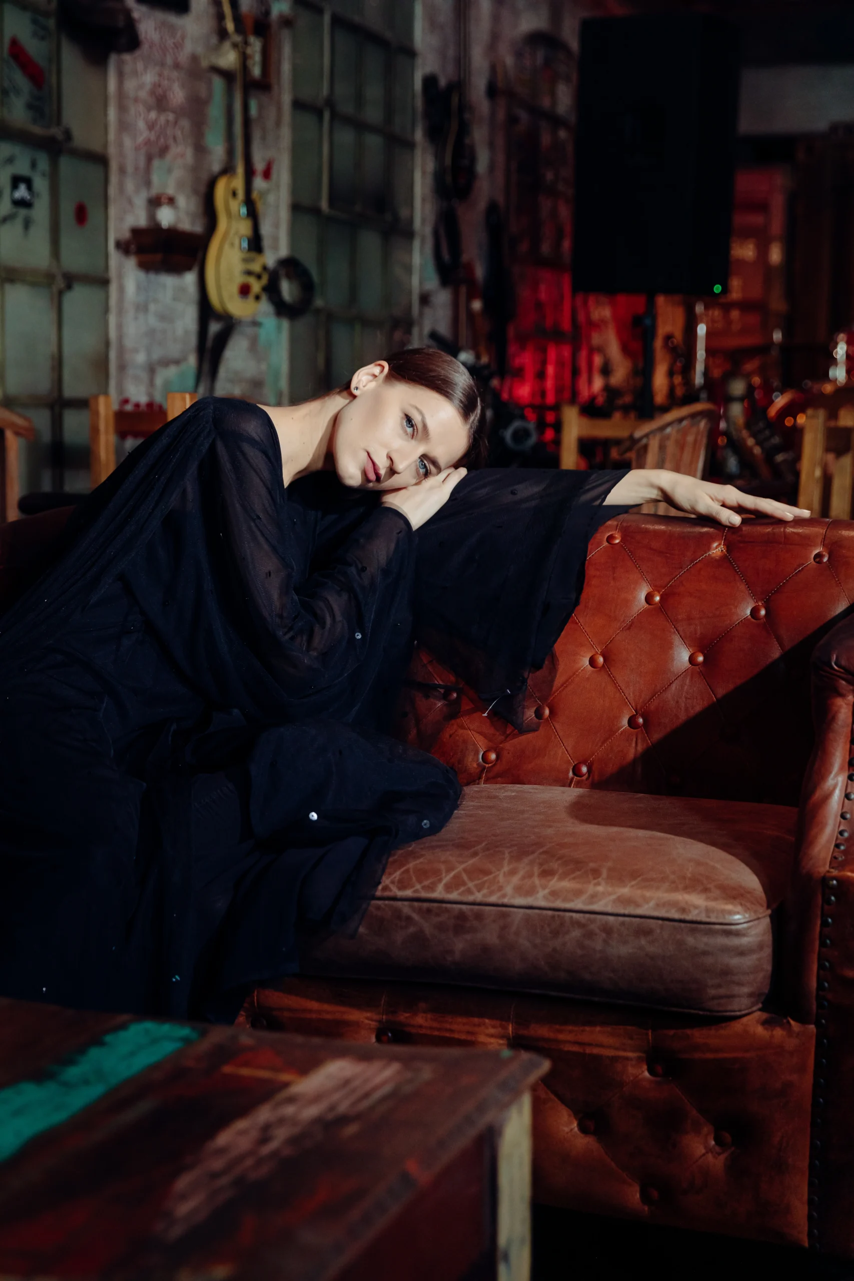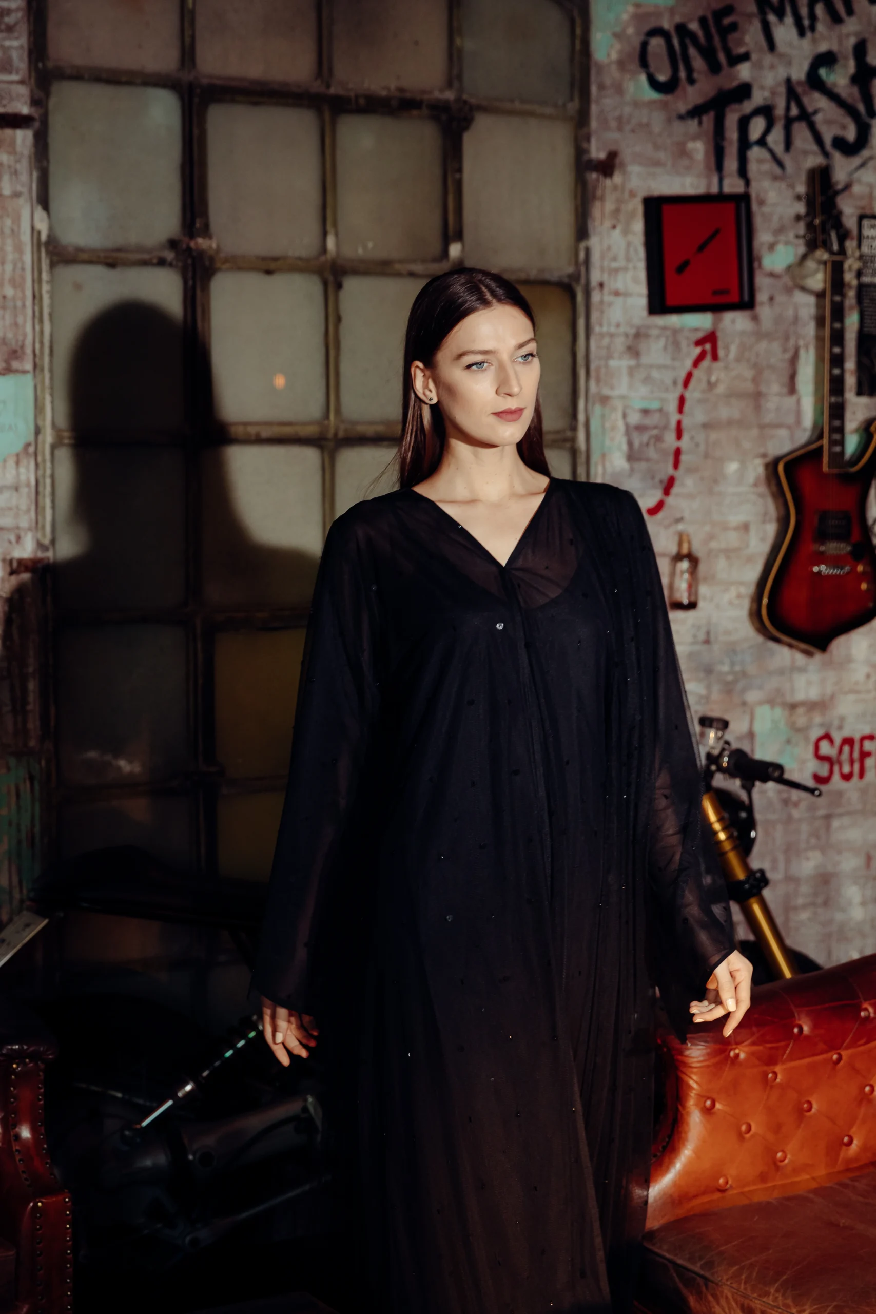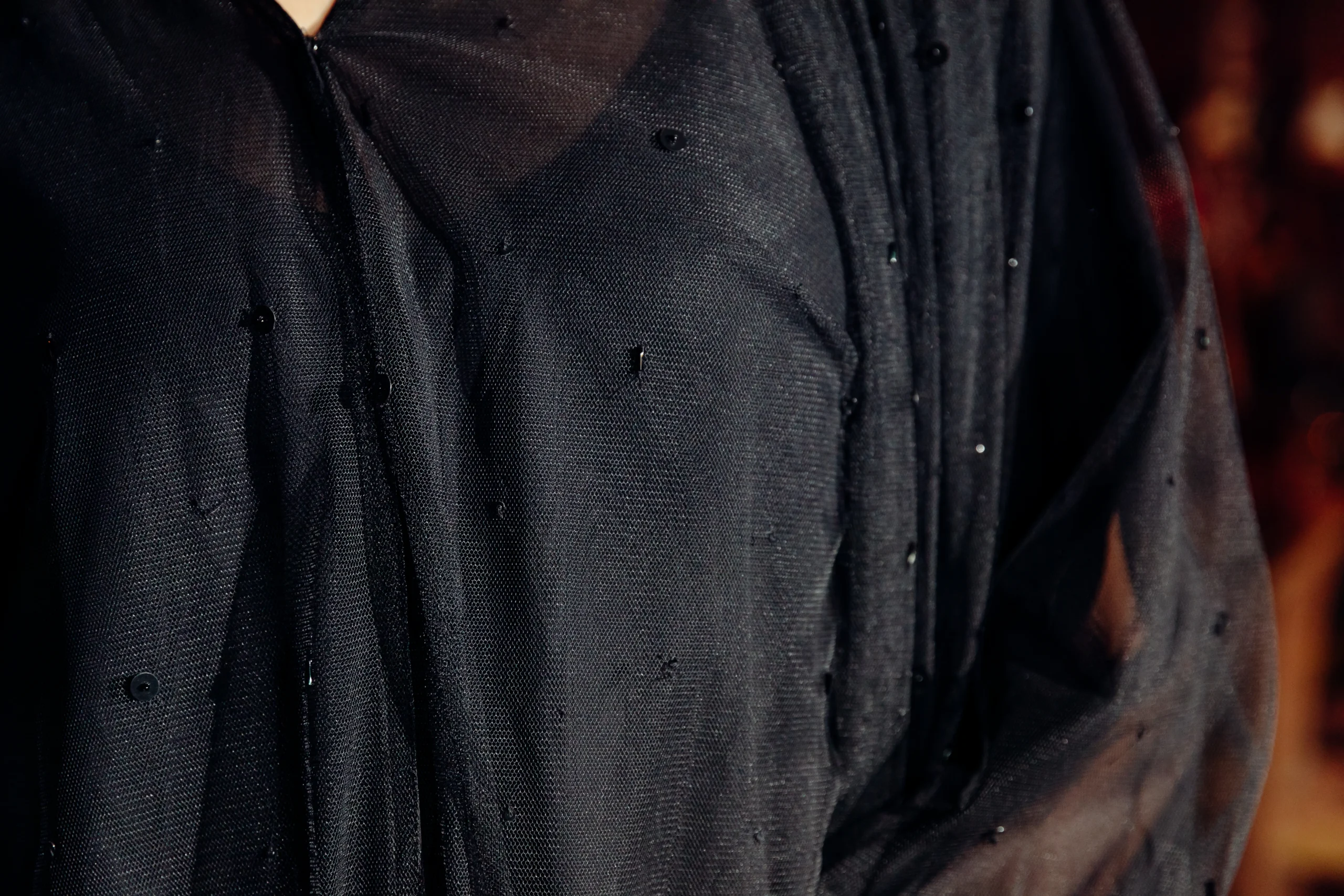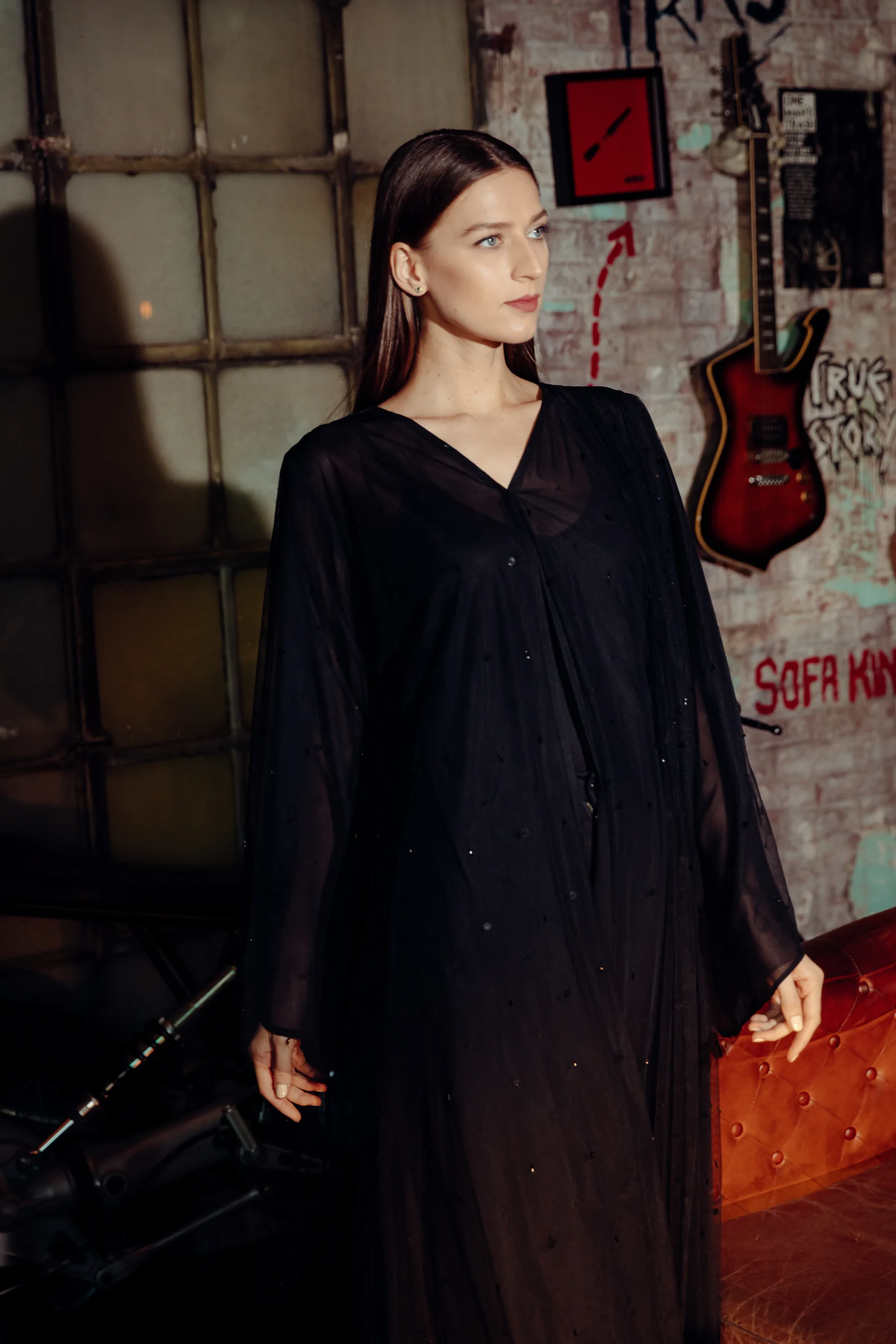 The Noir Starlet Kaftan is a piece of sheer elegance, crafted from a lightweight, black tulle fabric that is dotted with a subtle shimmer. The delicate fabric and long, flowing silhouette create a captivating and mysterious look. With its relaxed fit, this kaftan offers both comfort and a captivating presence, perfect for a night out.
