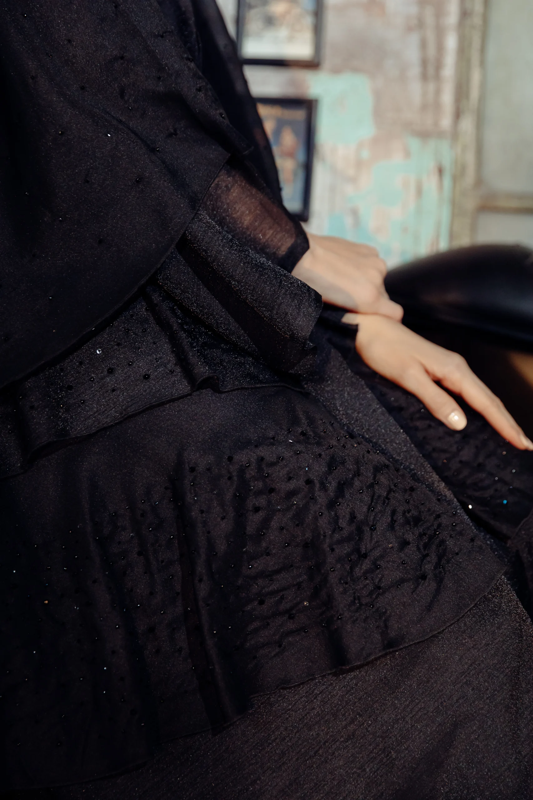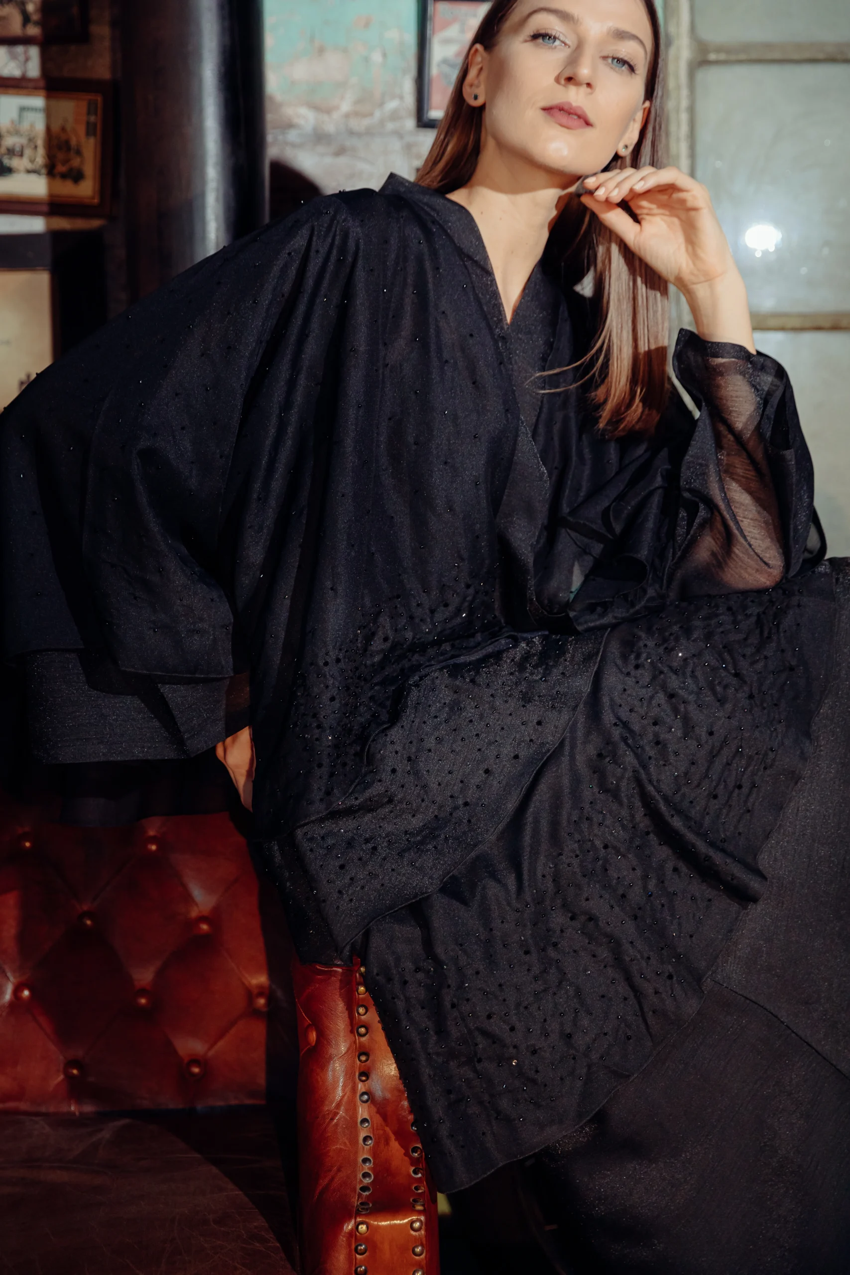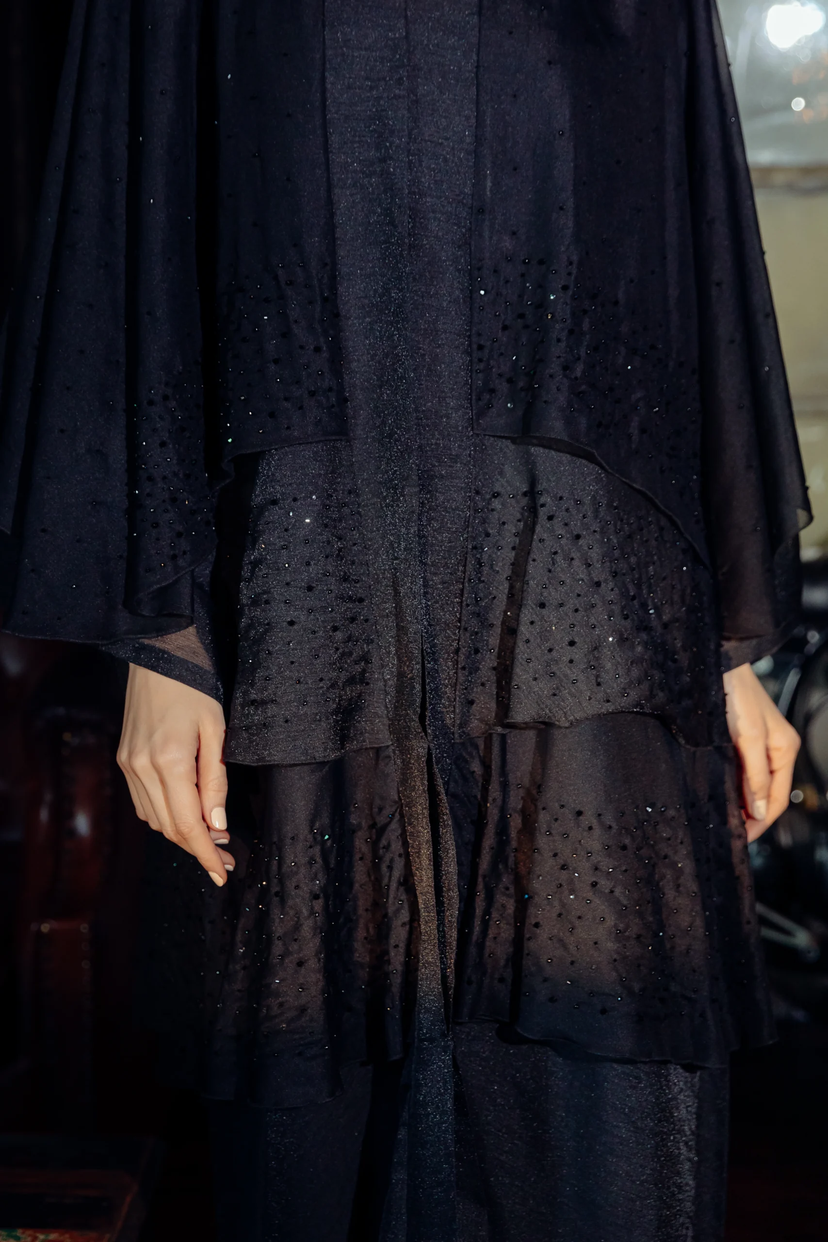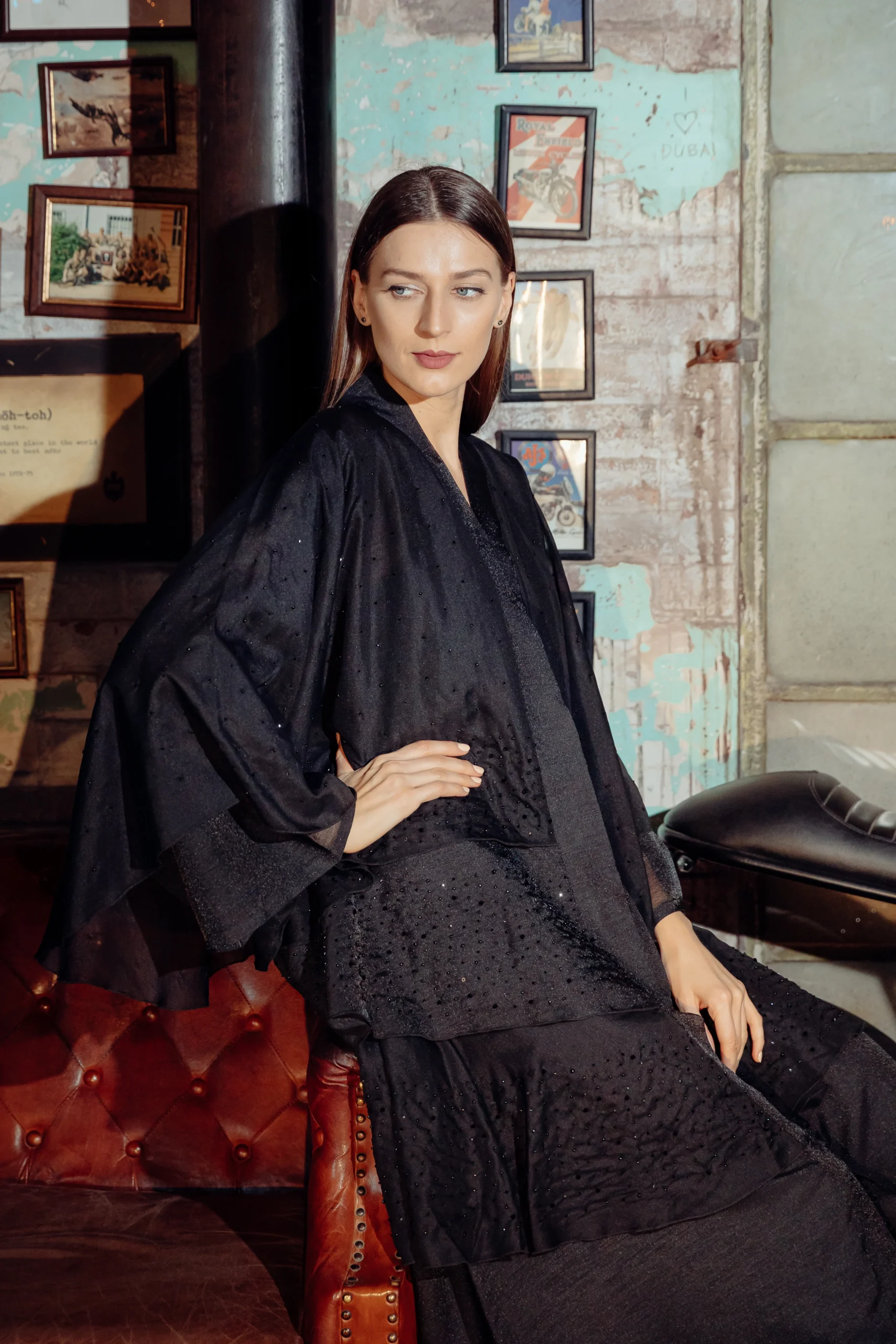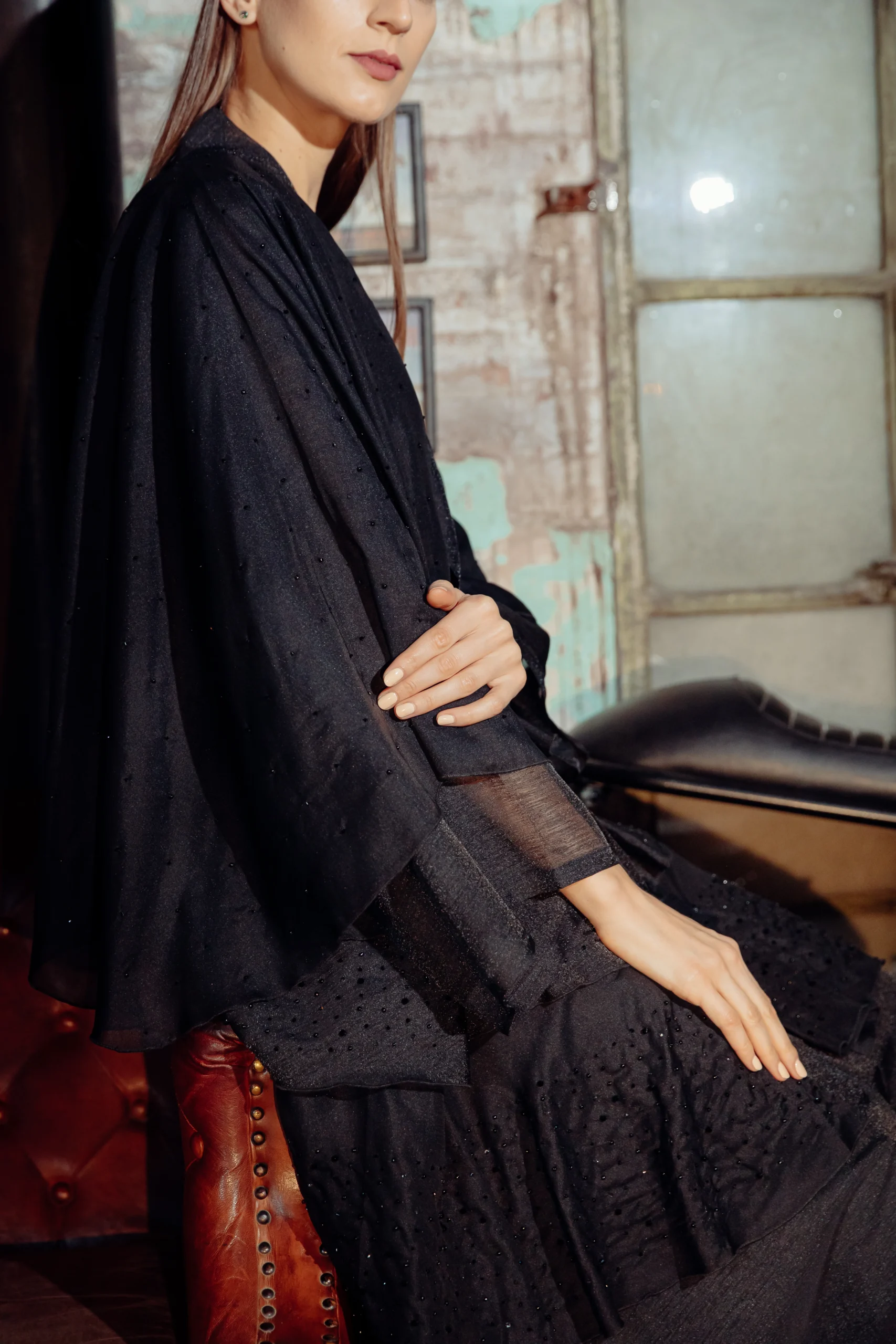The Jet-Set Abaya is a sleek and modern take on a classic silhouette, designed for the contemporary woman. Crafted from a soft, black wool-like fabric, its minimalist look is elevated by delicate, sheer sleeves. These sleeves are adorned with a subtle dotted shimmer, adding a touch of sophisticated glamour. The simple yet striking design makes it a versatile piece for both day and night.