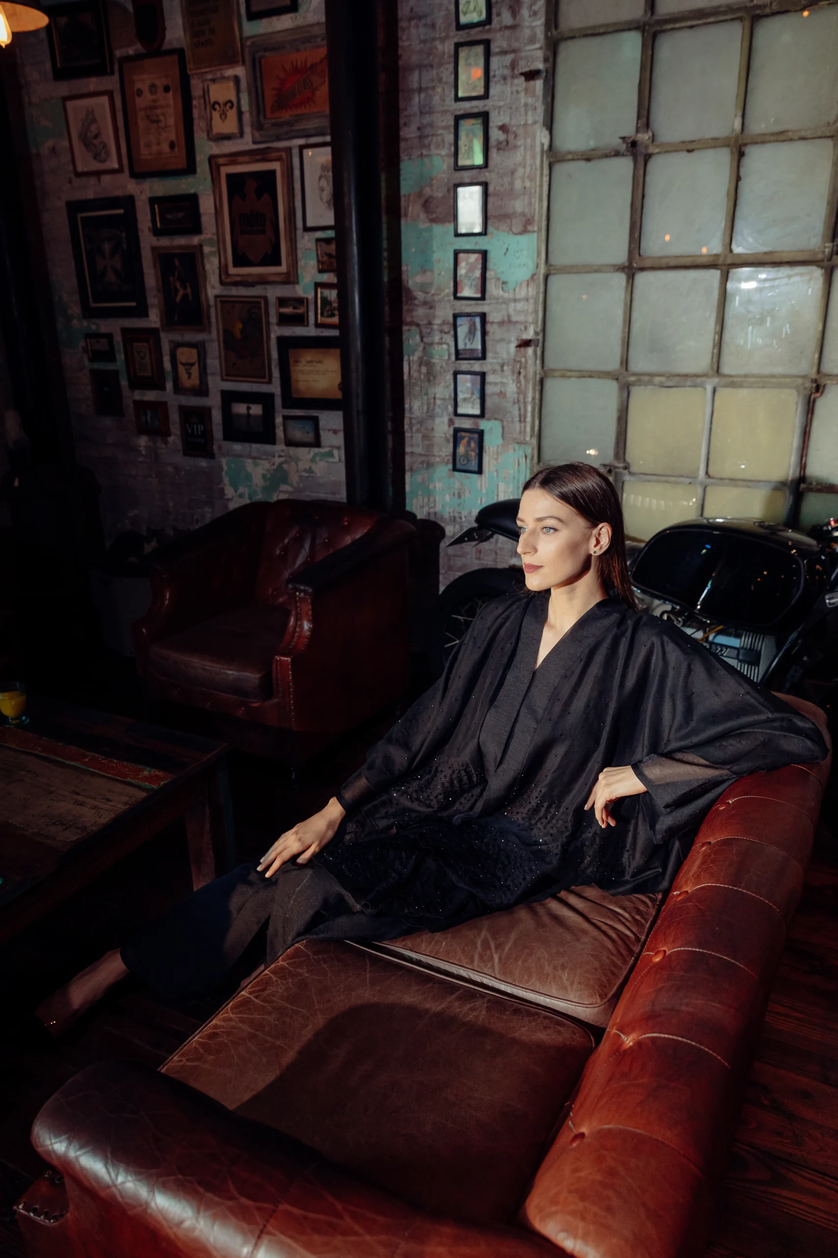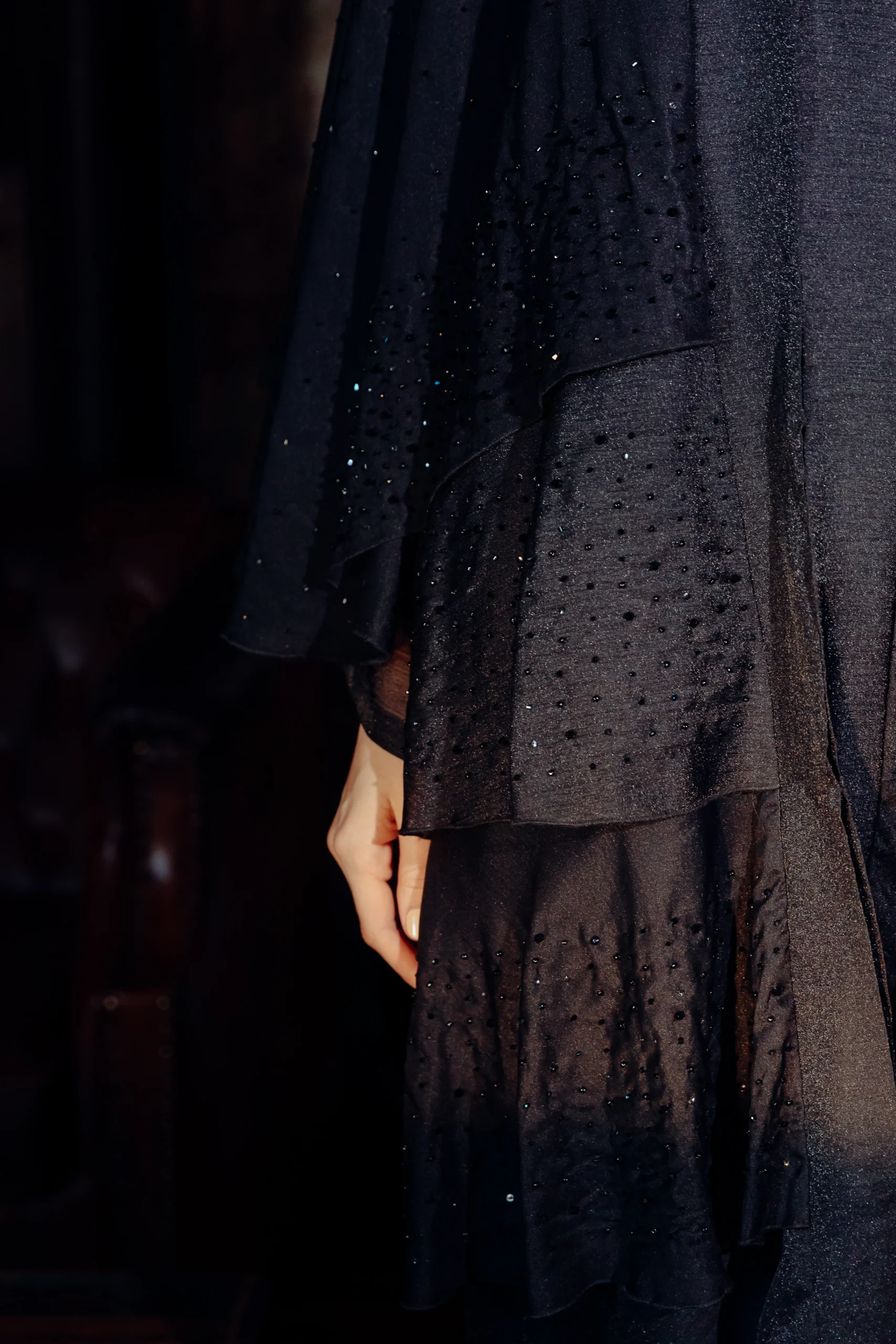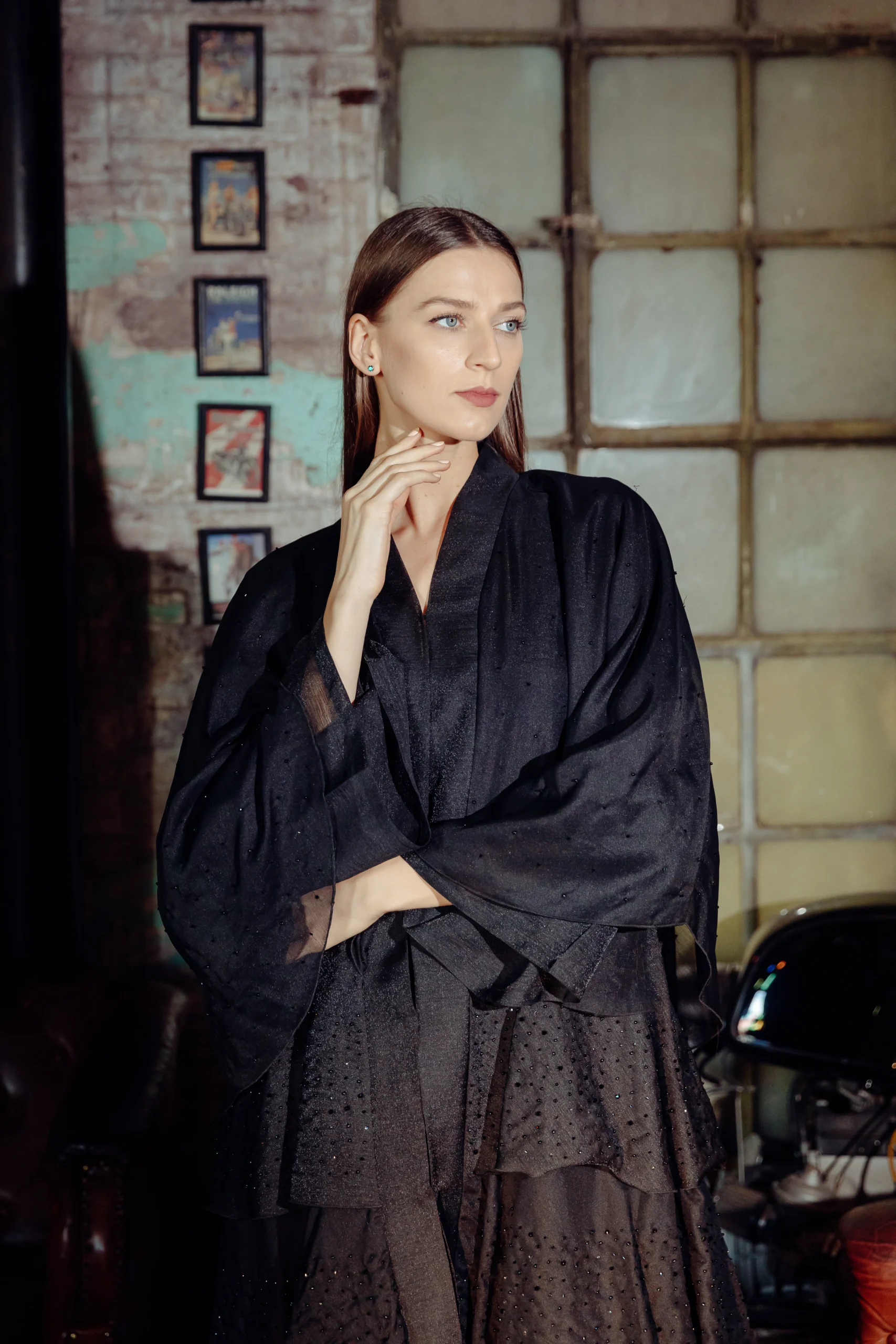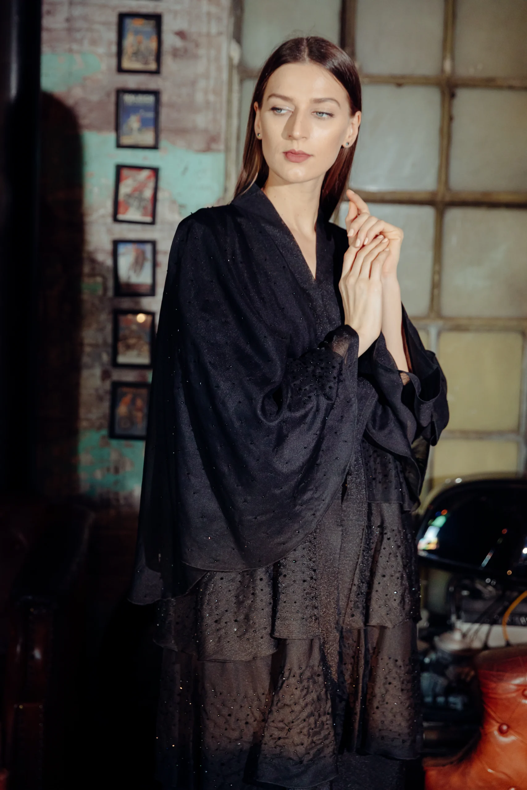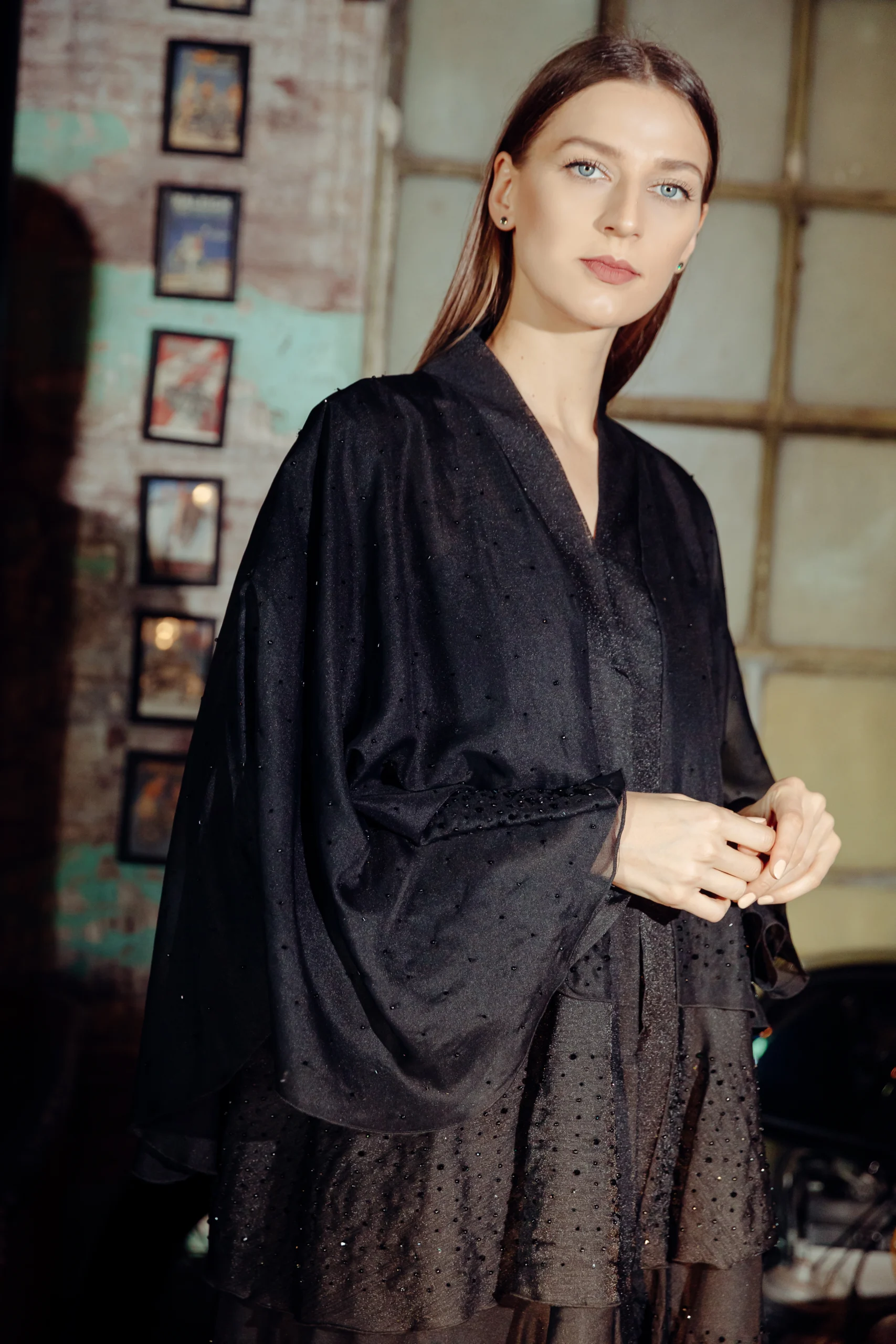 The Jet-Set Abaya is a sleek and modern take on a classic silhouette, designed for the contemporary woman. Crafted from a soft, black wool-like fabric, its minimalist look is elevated by delicate, sheer sleeves. These sleeves are adorned with a subtle dotted shimmer, adding a touch of sophisticated glamour. The simple yet striking design makes it a versatile piece for both day and night.